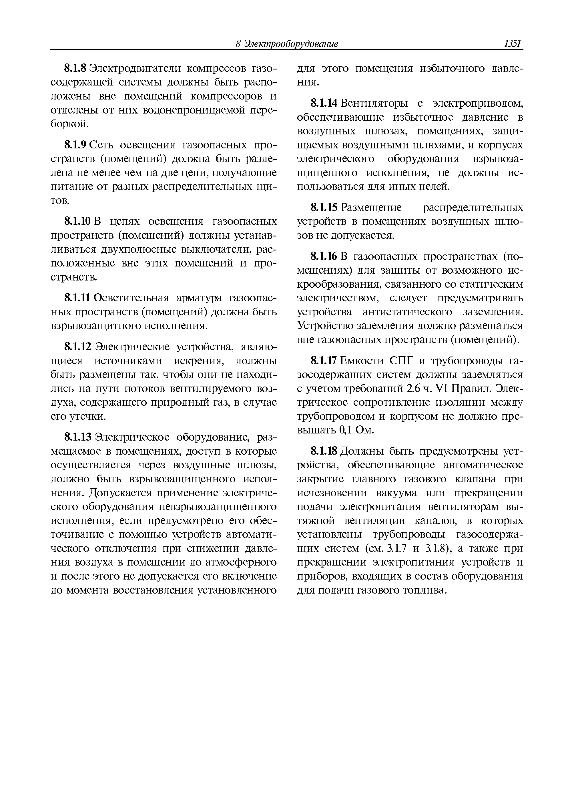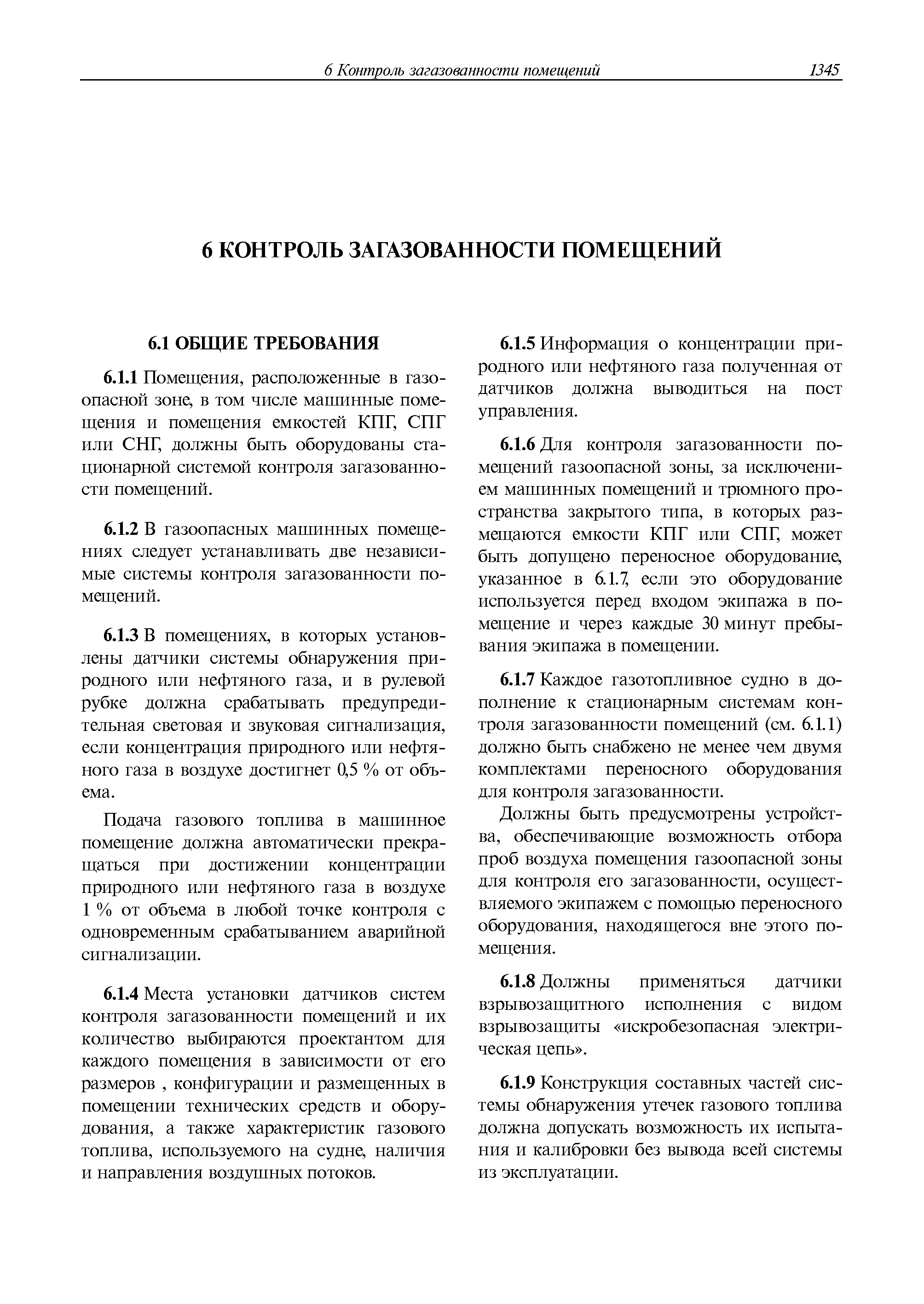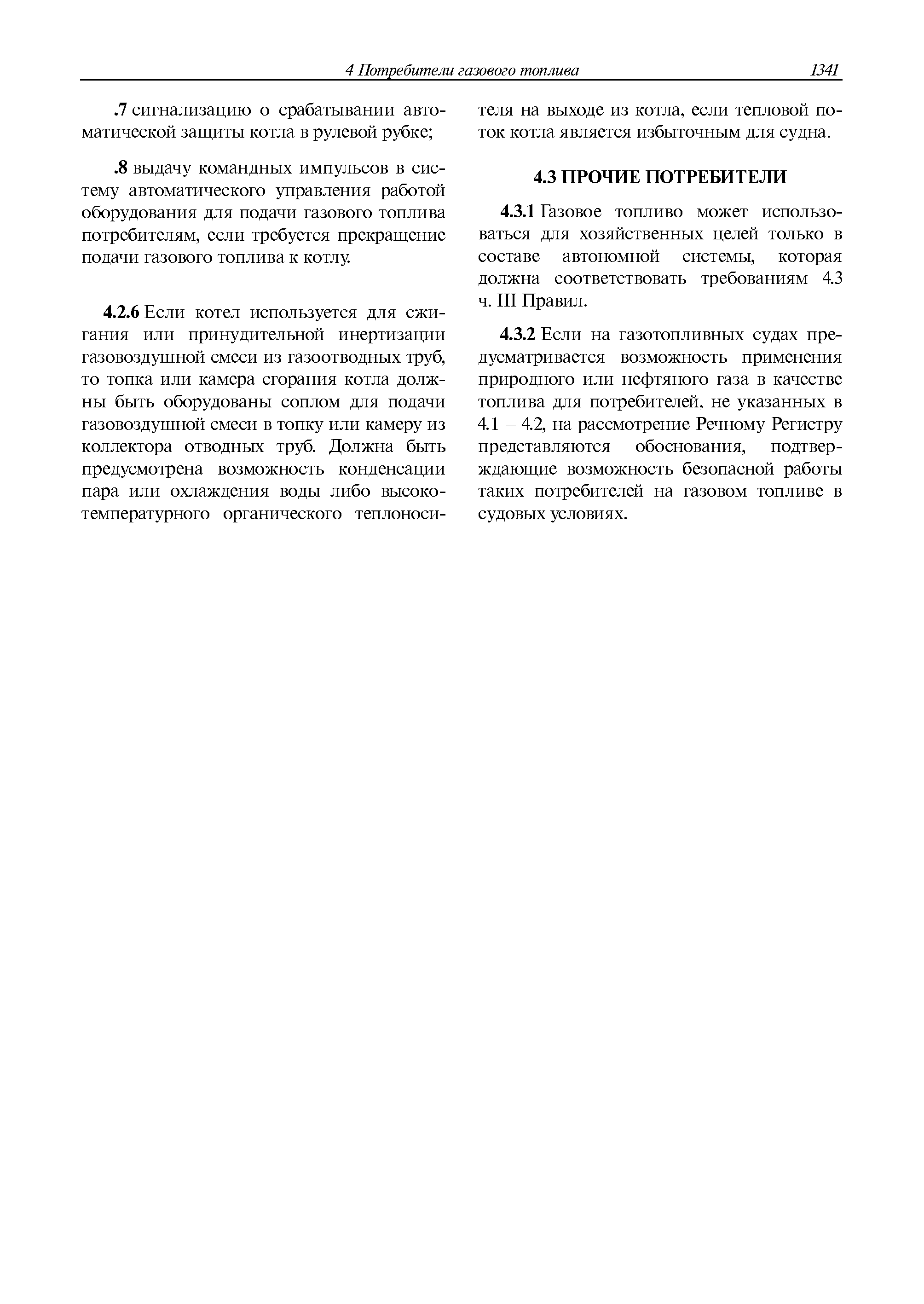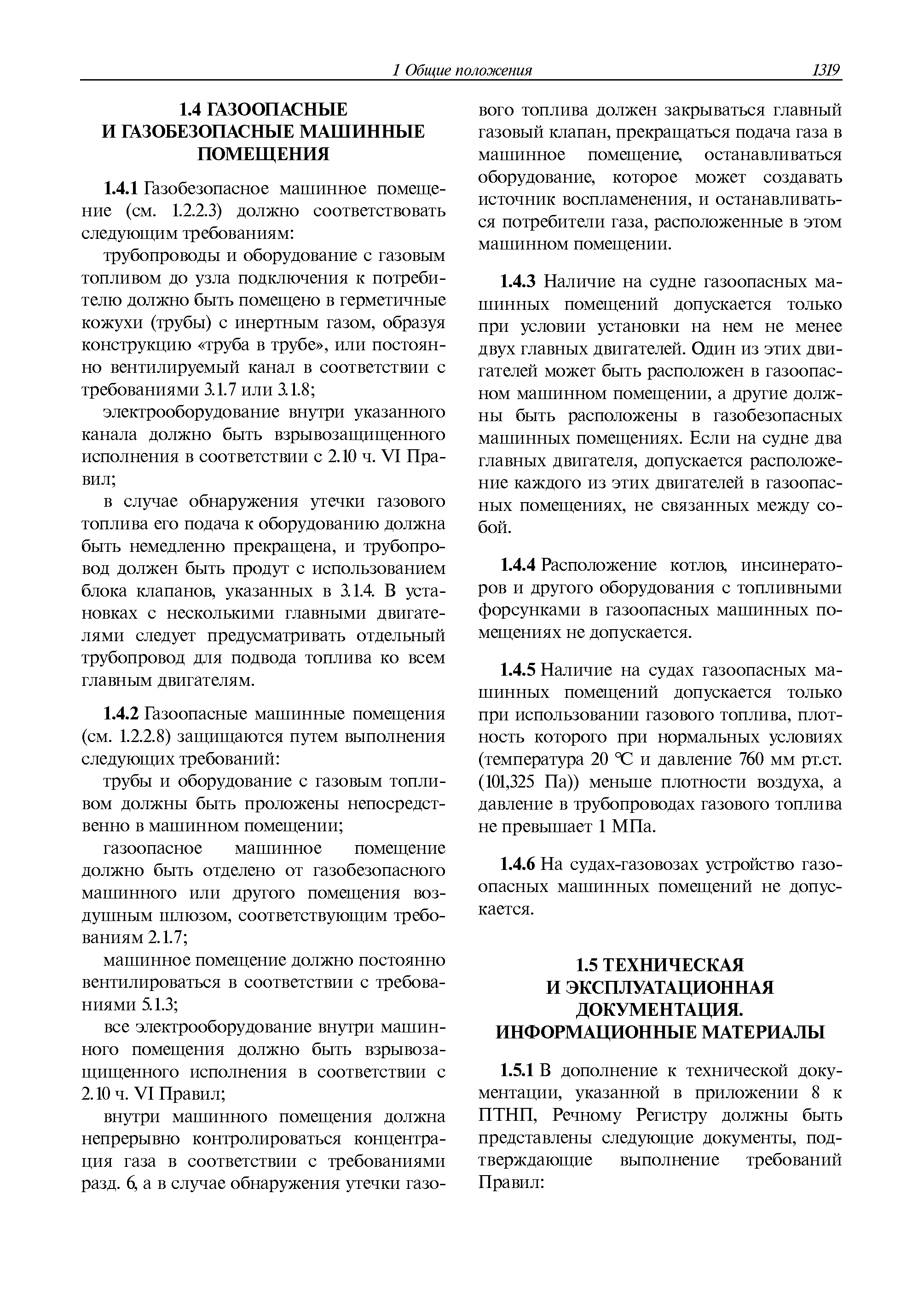 Часть XII. Требования к судам, на которых в качестве топлива используется природный или нефтяной газ| Статус: | продлен срок действия | | Название рус.: | Часть XII. Требования к судам, на которых в качестве топлива используется природный или нефтяной газ | | Дата добавления в базу: | 01.02.2017 | | Дата актуализации: | 01.01.2021 | | Дата введения: | 09.09.2015 | | Область применения: | Часть Правил устанавливает требования к судам, использующим компримированный природный газ в качестве топлива для судовых потребителей, при условии их соответствия требованиям частей 0 - ХI Правил. Требования настоящей части Правил распространяются на суда, кроме нефтеналивных, на которых в качестве топлива для главных, вспомогательных двигателей и автономных котлов используется КПГ с объемной долей метана более 85 процентов. Требования настоящей части Правил предназначены для применения при проектировании, постройке и эксплуатации судов, указанных в 1.1.2, а также при переоборудовании судов иных типов, находящихся в эксплуатации, в газотопливные суда. | | Оглавление: | 1 Общие положения 1.1 Область применения 1.2 Термины и их определения 1.3 Общие требования обеспечения безопасности 1.4 Газоопасные и газобезопасные машинные помещения 1.5 Техническая и эксплуатационная документация. Информационные материалы 2 Емкости для хранения запасов газового топлива 2.1 Размещение и крепление емкостей для газового топлива 2.2 Емкости КПГ 2.3 Емкости СПГ 2.4 Емкости СНГ 2.5 Предохранительные клапаны 3 Оборудование и системы для подготовки газового топлива и подачи его потребителям 3.1 Общие требования 3.2 Оборудование и трубопроводы, содержащие КПГ 3.3 Оборудование и трубопроводы, содержащие СПГ 3.4 Оборудование и трубопроводы, содержащие СНГ 3.5 Компрессорные помещения и станции приема (выдачи) запасов СНГ 4 Потребители газового топлива 4.1 Главные и вспомогательные двигатели 4.2 Котлы 4.3 Прочие потребители 5 Вентиляция помещений 5.1 Помещения, обслуживаемые экипажем 5.2 Редко посещаемые и другие помещения 6 Контроль загазованности помещении 6.1 Общие требования 7 Противопожарная защита 7.1 Конструктивная противопожарная защита 7.2 Противопожарное оборудование и системы пожаротушения 8 Электрооборудование 8.1 Общие требования 9 Автоматизация 9.1 Объем функций системы автоматизации 10 Защита экипажа 10.1 Общие требования | | Разработан: | Российский Речной Регистр