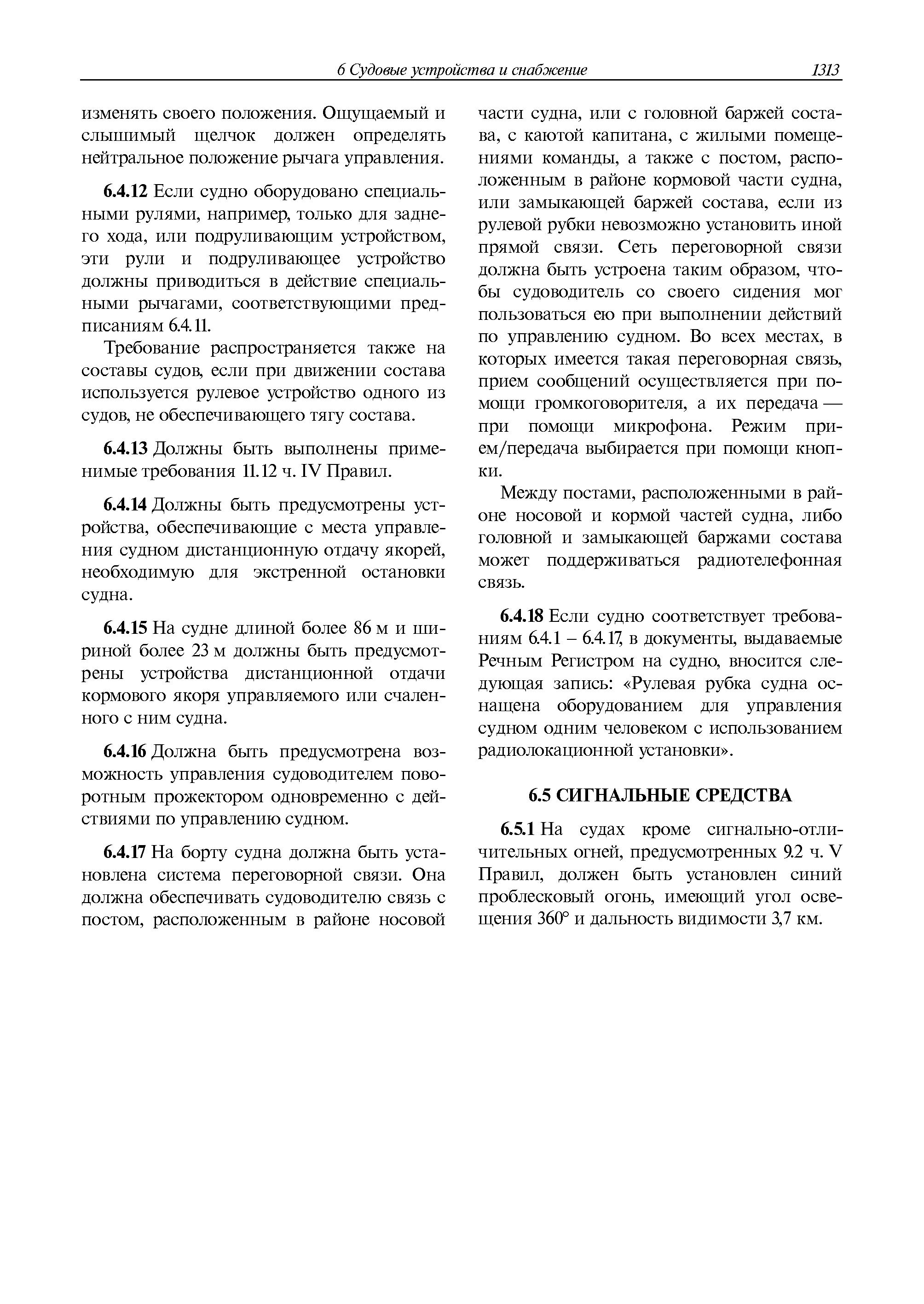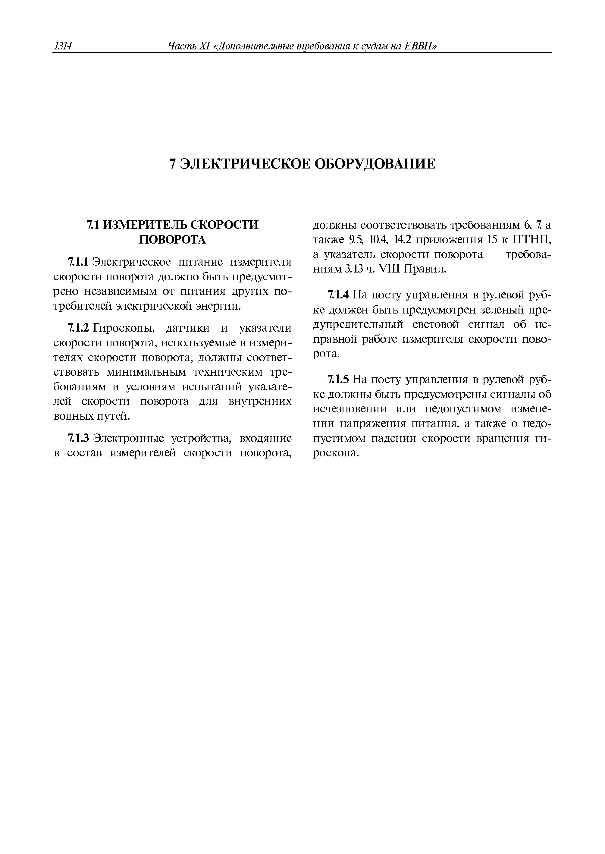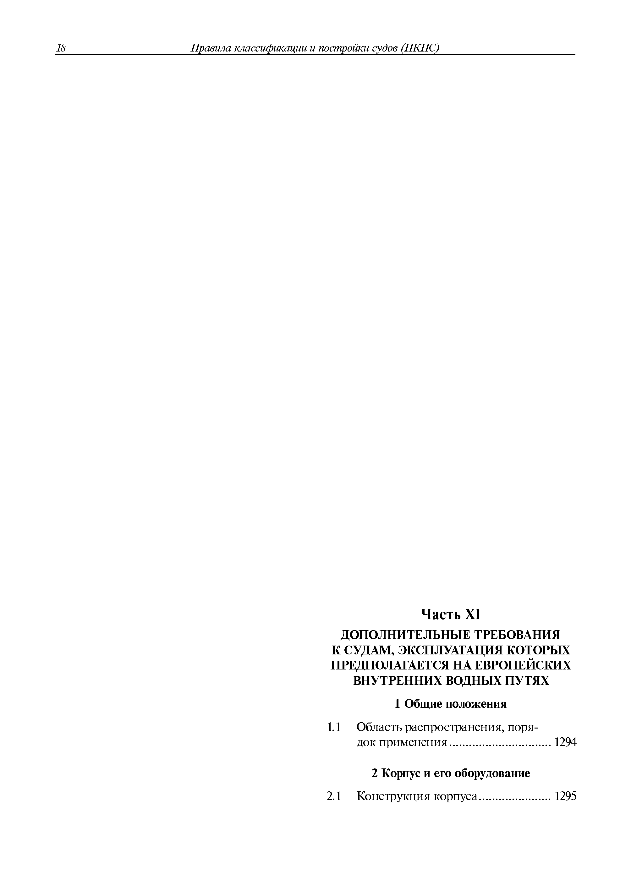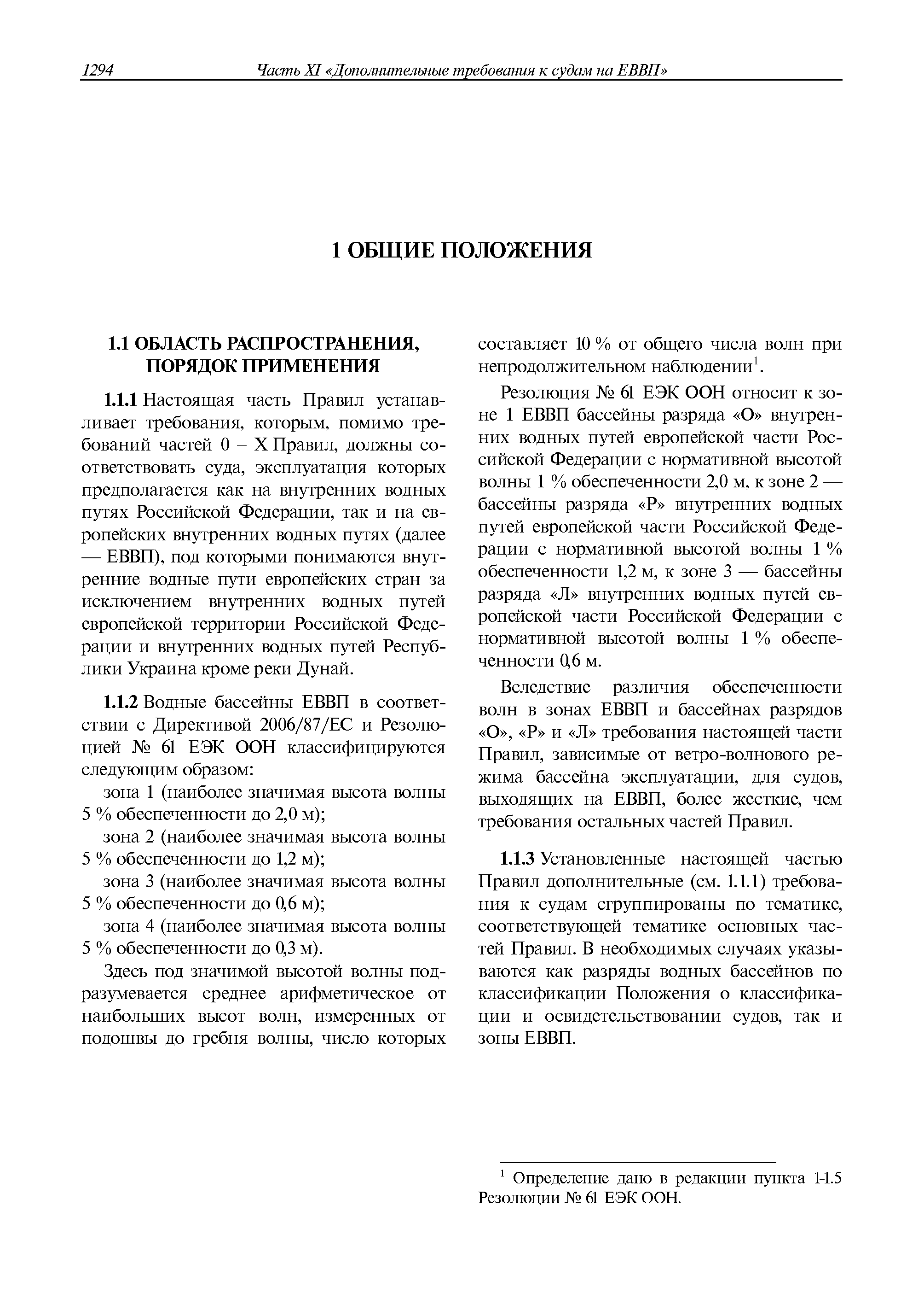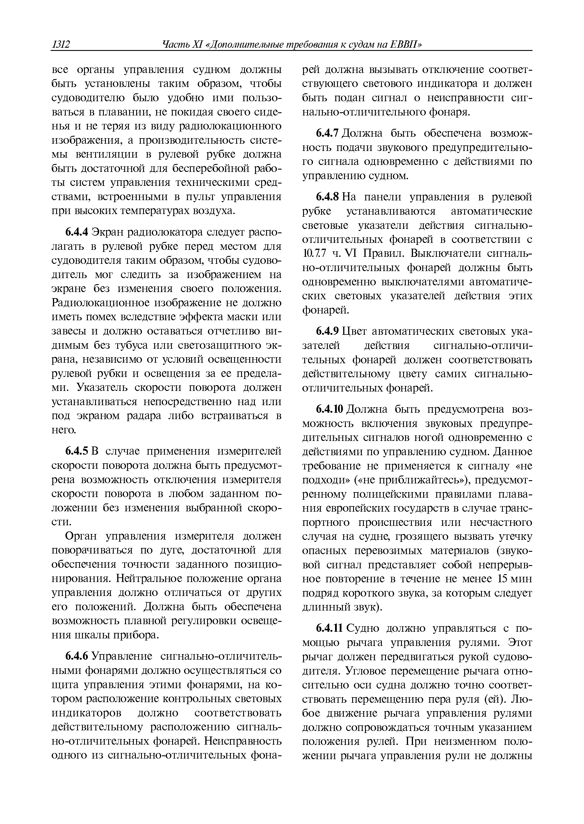 Часть XI. Дополнительные требования к судам, эксплуатация которых предполагается на европейских внутренних водных путях| Статус: | продлен срок действия | | Название рус.: | Часть XI. Дополнительные требования к судам, эксплуатация которых предполагается на европейских внутренних водных путях | | Дата добавления в базу: | 01.02.2017 | | Дата актуализации: | 01.01.2021 | | Дата введения: | 09.09.2015 | | Область применения: | Часть Правил устанавливает требования, которым, помимо требований частей 0 - Х Правил, должны соответствовать суда, эксплуатация которых предполагается как на внутренних водных путях Российской Федерации, так и на европейских внутренних водных путях, под которыми понимаются внутренние водные пути европейских стран за исключением внутренних водных путей европейской территории Российской Федерации и внутренних водных путей Республики Украина кроме реки Дунай. | | Оглавление: | 1 Общие положения 1.1 Область распространения, порядок применения 2 Корпус и его оборудование 2.1 Конструкция корпуса 3 Остойчивость. Непотопляемость. Надводный борт. Маневренность 3.1 Остойчивость пассажирских судов 3.2 Остойчивость судов-контейнеровозов 3.3 Требования к аварийной посадке и остойчивости пассажирских судов при затоплении отсеков 3.4 Грузовая марка 3.5 Надводный борт и расстояние безопасности 3.6 Маневренность судов 4 Противопожарная защита 4.1 Нормы противопожарного снабжения 5 Энергетическая установка и системы 5.1 Энергетическая установка 5.2 Системы 6 Судовые устройства и снабжение 6.1 Рулевое устройство 6.2 Якорное устройство 6.3 Спасательные средства 6.4 Специальное оборудование рулевой рубки для управления судном одним человеком с использованием радиолокационной установки 6.5 Сигнальные средства 7 Электрическое оборудование 7.1 Измеритель скорости поворота | | Разработан: | Российский Речной Регистр