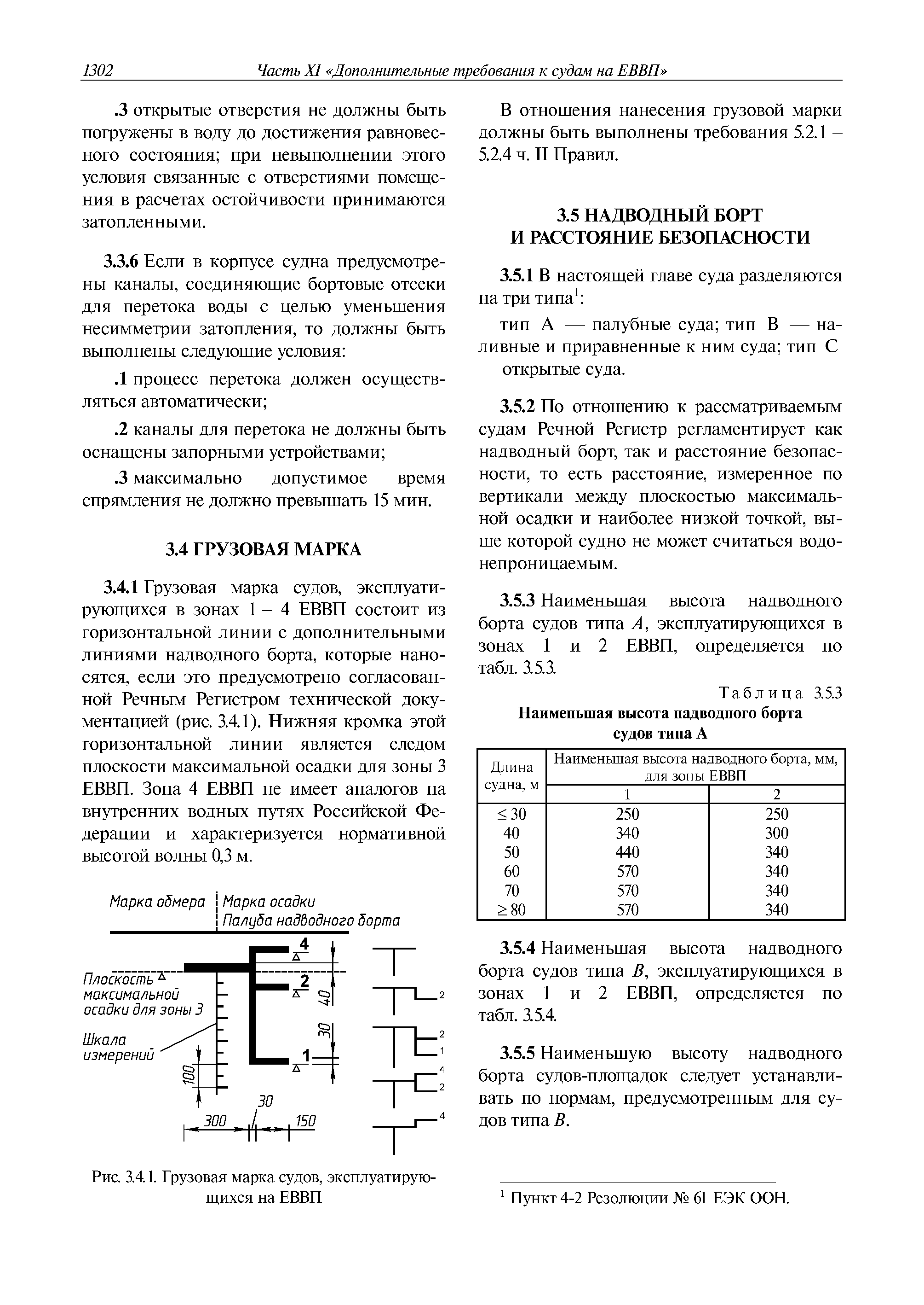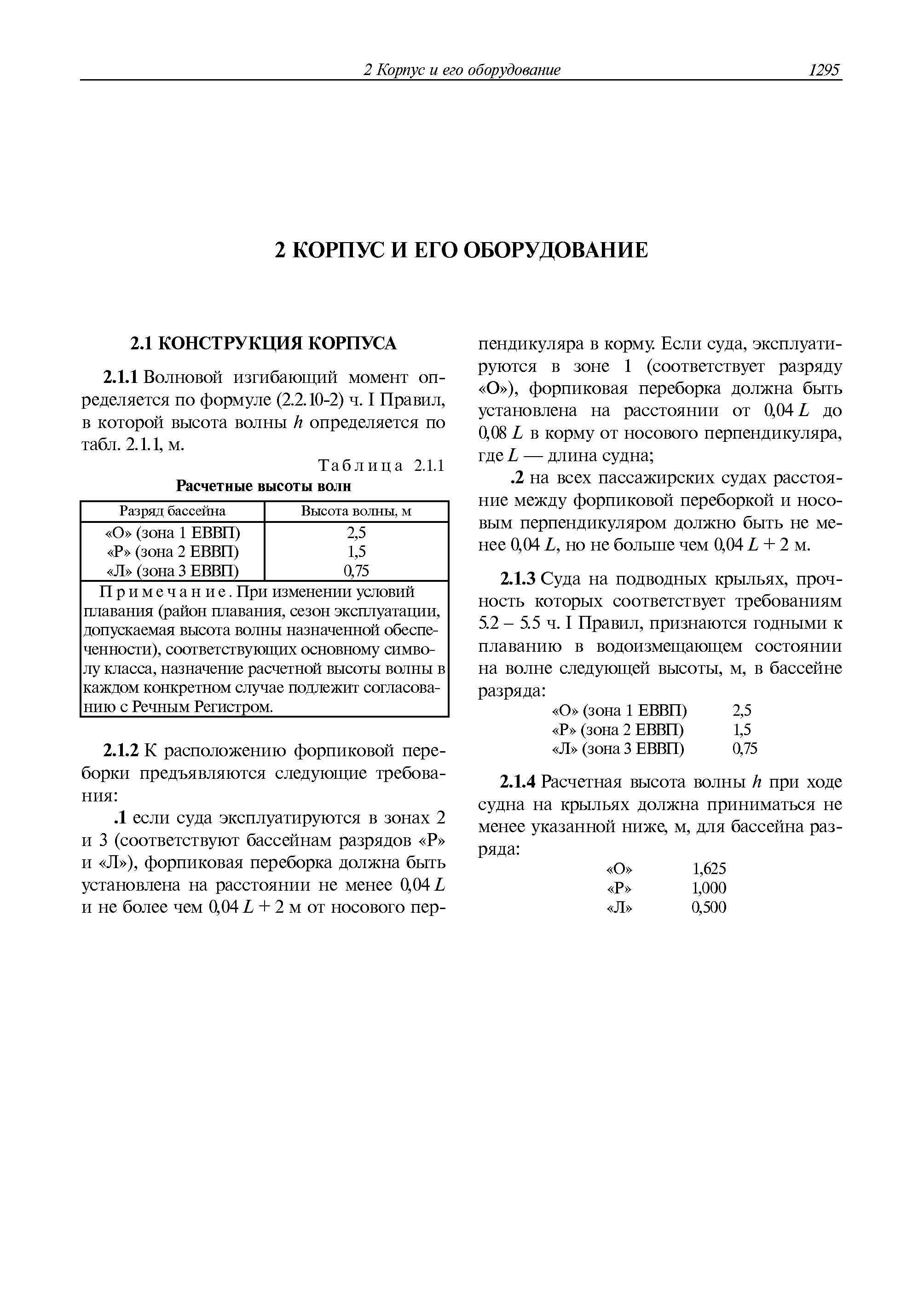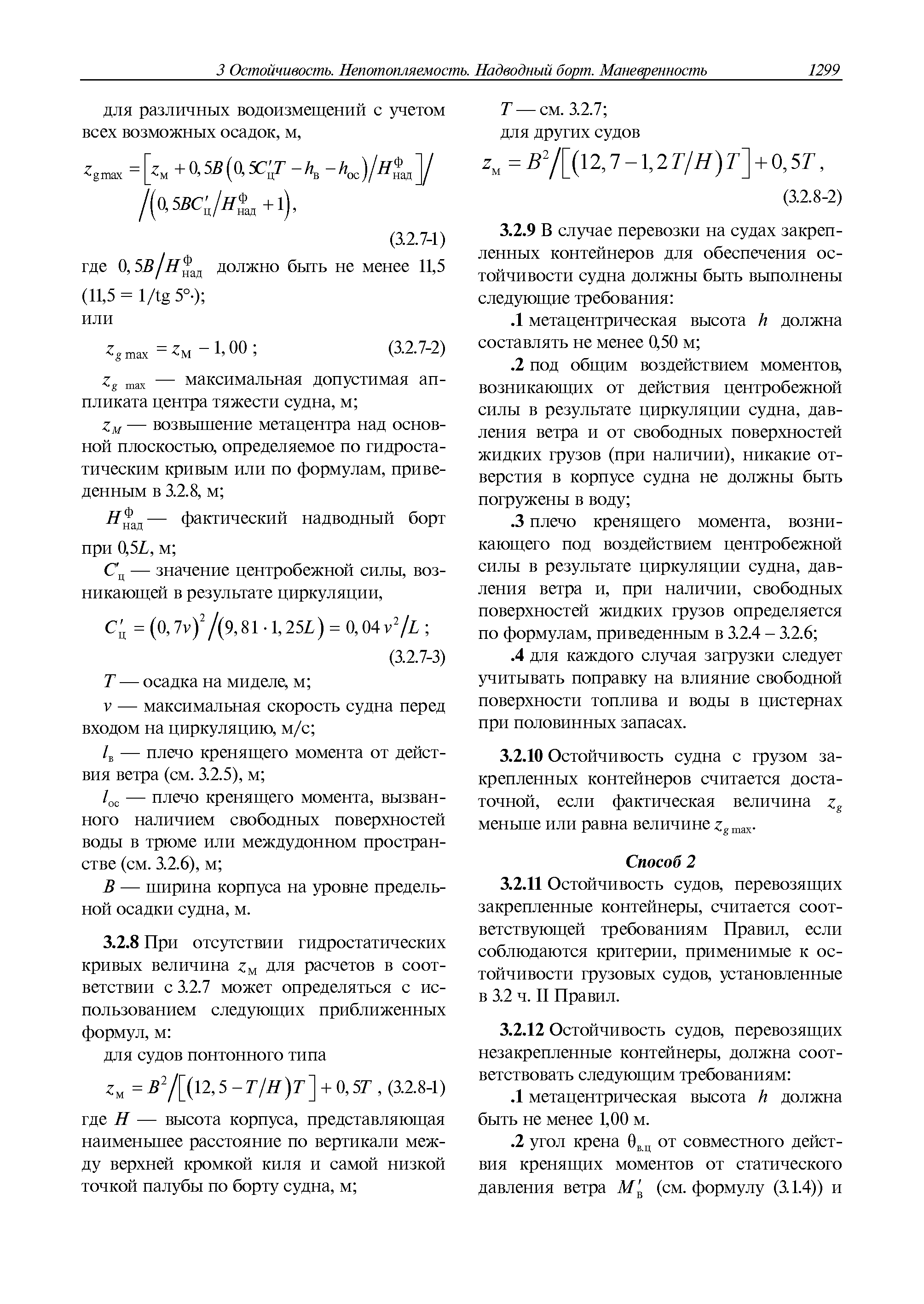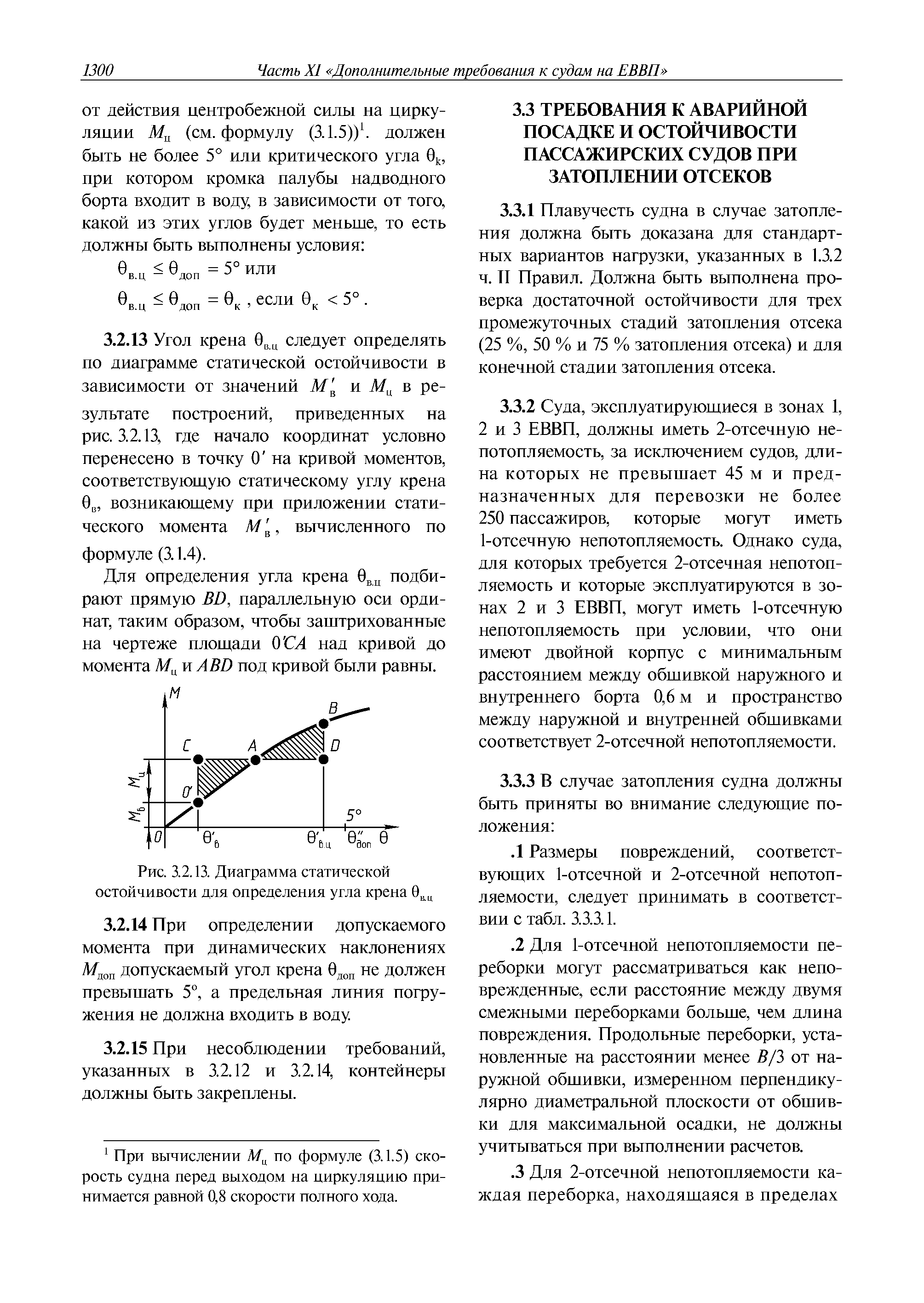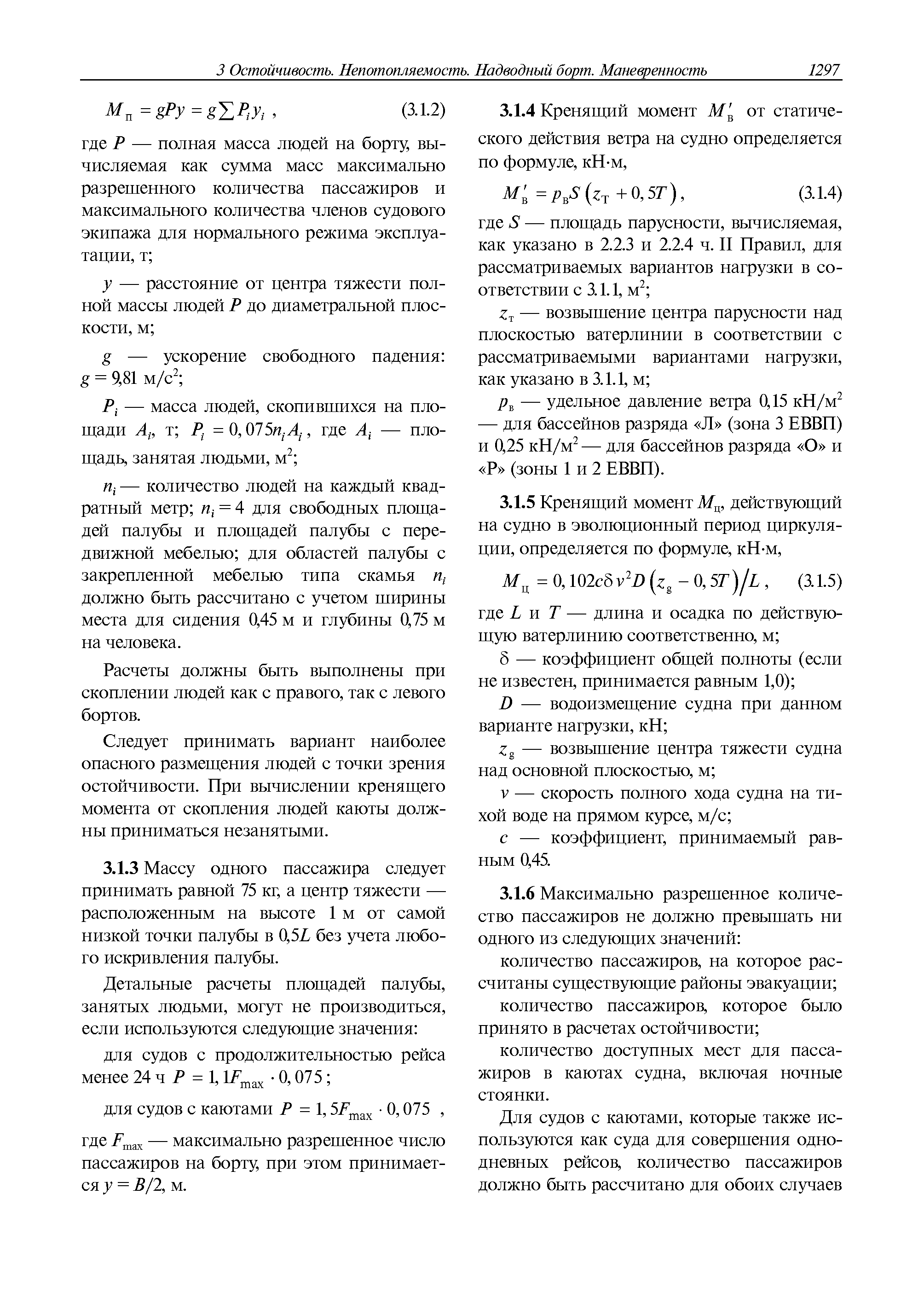Часть XI. Дополнительные требования к судам, эксплуатация которых предполагается на европейских внутренних водных путях| Статус: | продлен срок действия | | Название рус.: | Часть XI. Дополнительные требования к судам, эксплуатация которых предполагается на европейских внутренних водных путях | | Дата добавления в базу: | 01.02.2017 | | Дата актуализации: | 01.01.2021 | | Дата введения: | 09.09.2015 | | Область применения: | Часть Правил устанавливает требования, которым, помимо требований частей 0 - Х Правил, должны соответствовать суда, эксплуатация которых предполагается как на внутренних водных путях Российской Федерации, так и на европейских внутренних водных путях, под которыми понимаются внутренние водные пути европейских стран за исключением внутренних водных путей европейской территории Российской Федерации и внутренних водных путей Республики Украина кроме реки Дунай. | | Оглавление: | 1 Общие положения 1.1 Область распространения, порядок применения 2 Корпус и его оборудование 2.1 Конструкция корпуса 3 Остойчивость. Непотопляемость. Надводный борт. Маневренность 3.1 Остойчивость пассажирских судов 3.2 Остойчивость судов-контейнеровозов 3.3 Требования к аварийной посадке и остойчивости пассажирских судов при затоплении отсеков 3.4 Грузовая марка 3.5 Надводный борт и расстояние безопасности 3.6 Маневренность судов 4 Противопожарная защита 4.1 Нормы противопожарного снабжения 5 Энергетическая установка и системы 5.1 Энергетическая установка 5.2 Системы 6 Судовые устройства и снабжение 6.1 Рулевое устройство 6.2 Якорное устройство 6.3 Спасательные средства 6.4 Специальное оборудование рулевой рубки для управления судном одним человеком с использованием радиолокационной установки 6.5 Сигнальные средства 7 Электрическое оборудование 7.1 Измеритель скорости поворота | | Разработан: | Российский Речной Регистр