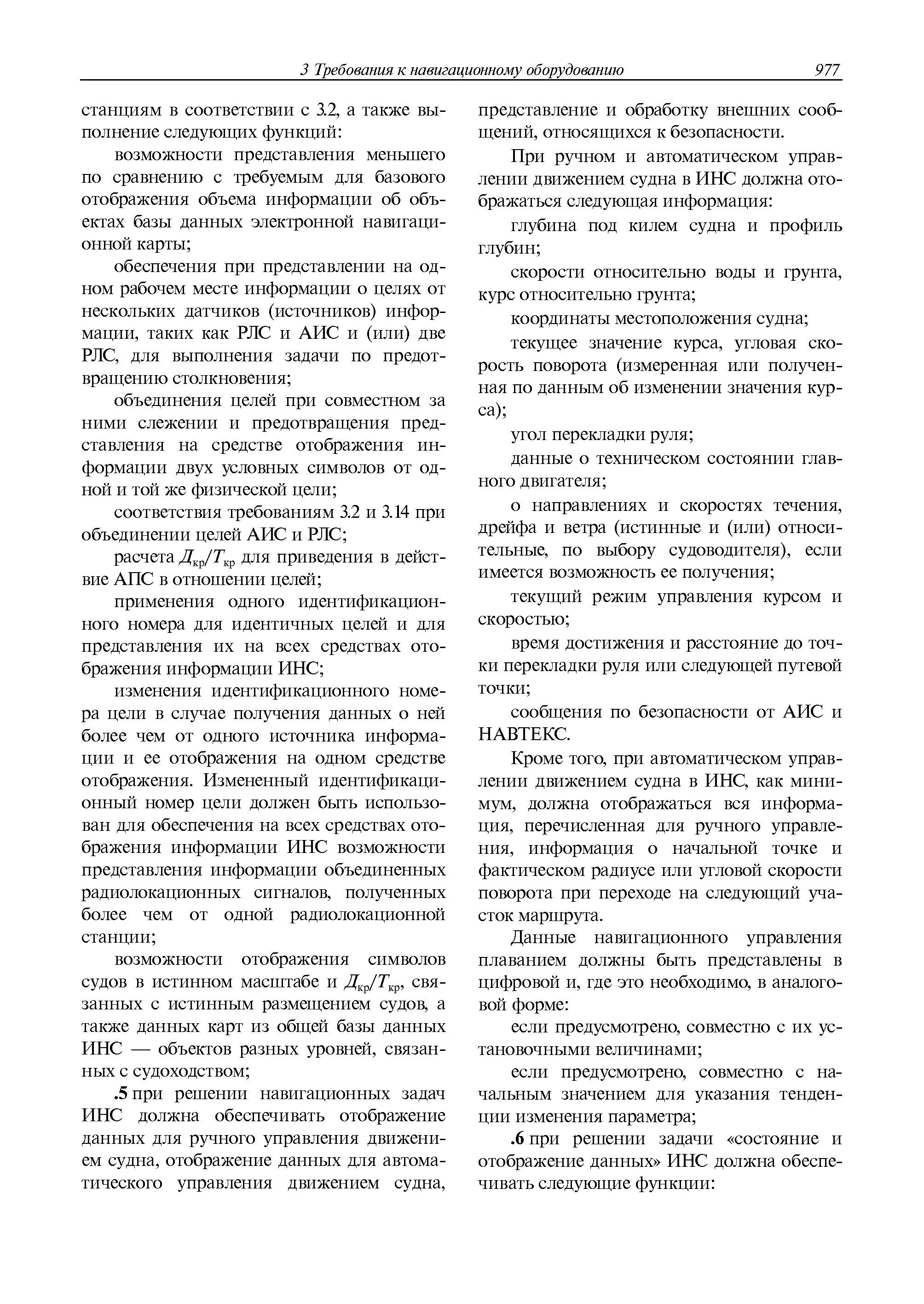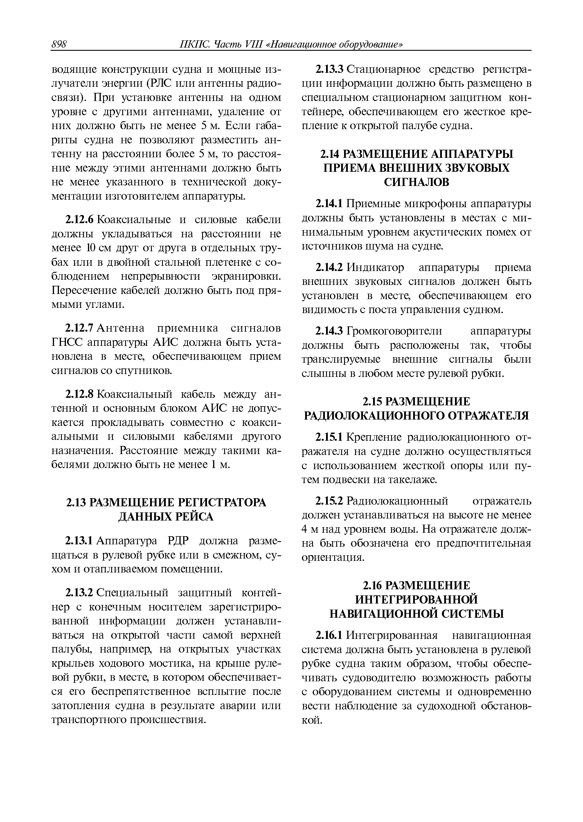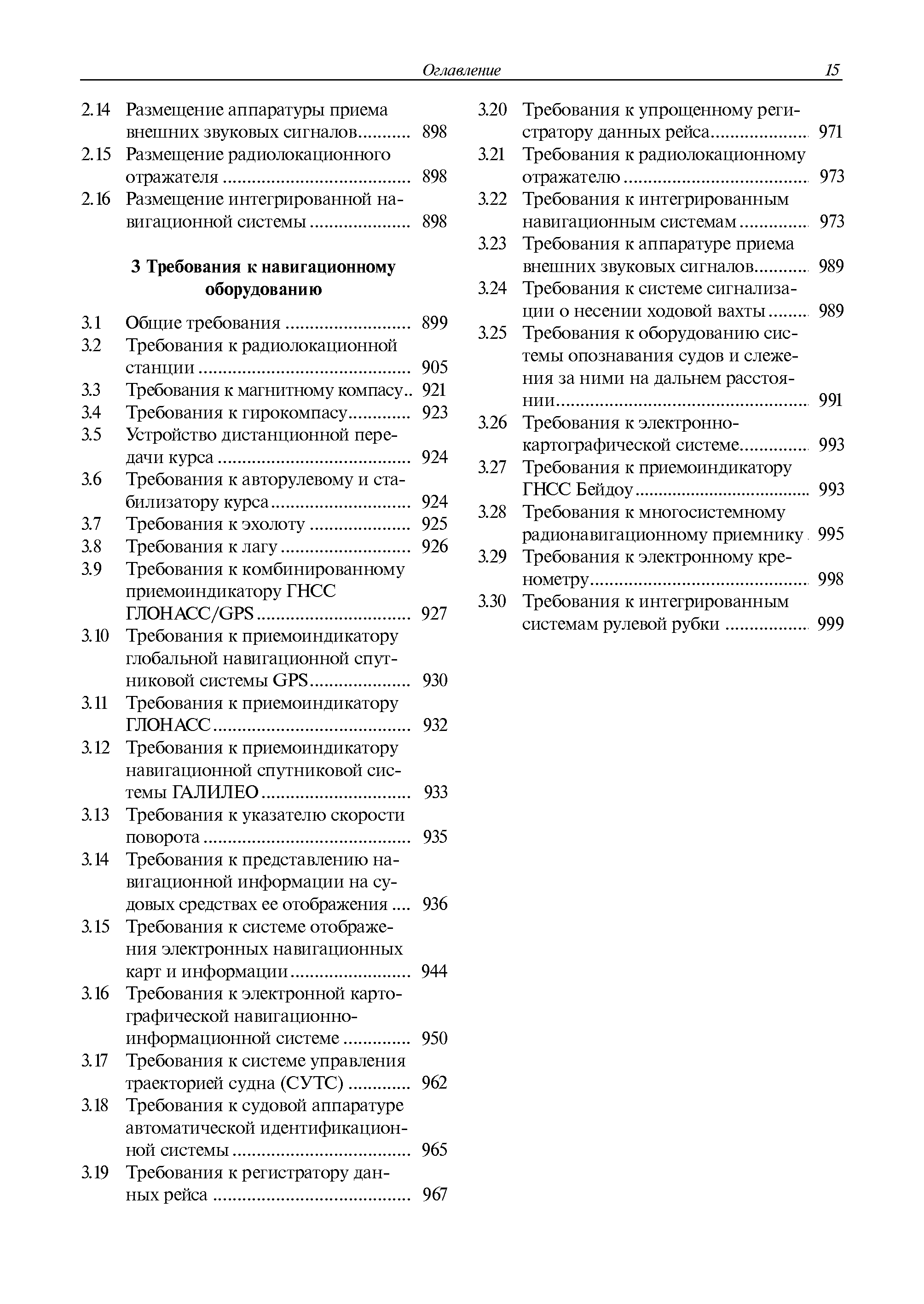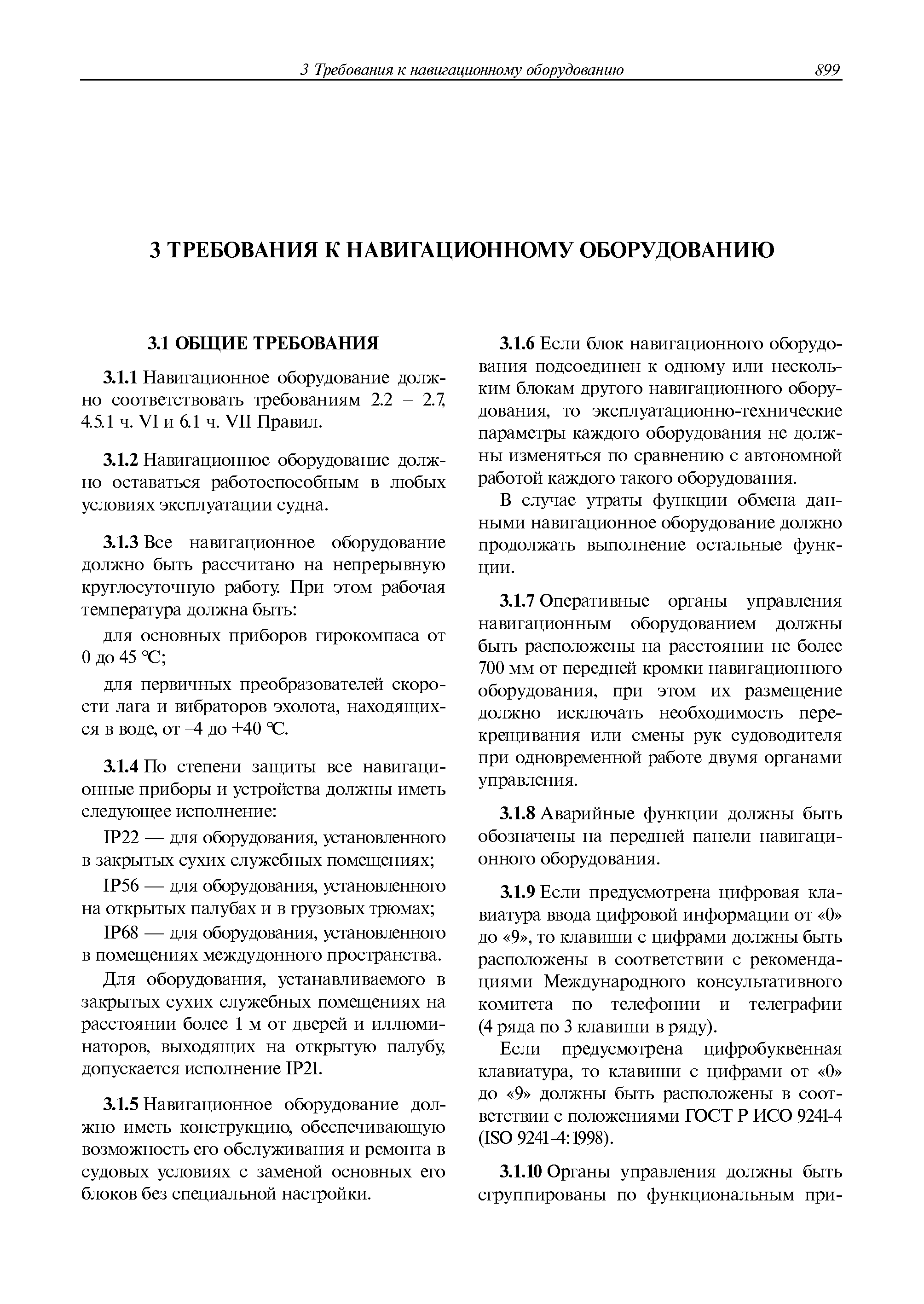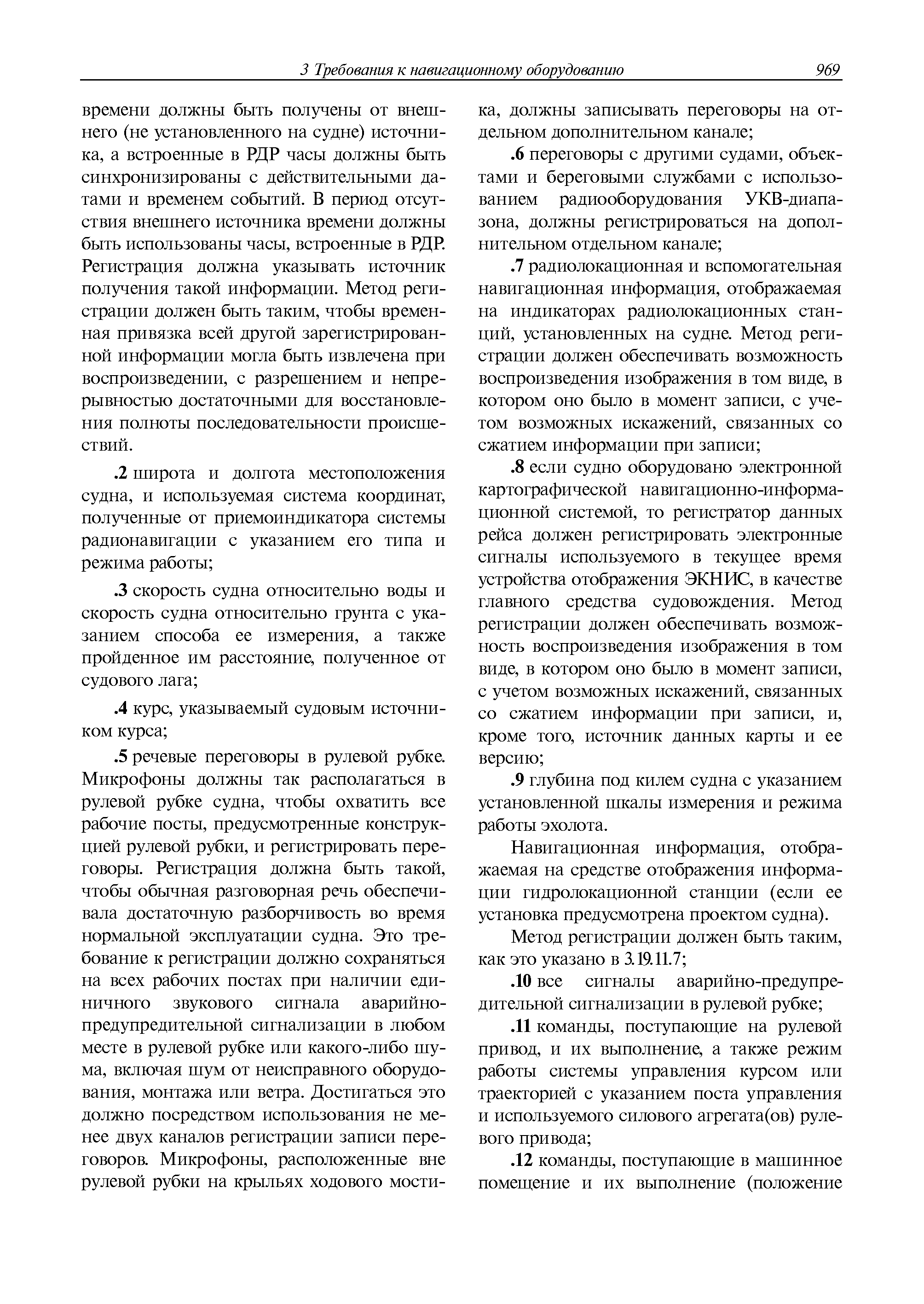 | Оглавление: | 1 Общие требования 1.1 Область распространения 1.2 Термины и их определения 1.3 Состав навигационного оборудования 2 Размещение навигационного оборудования 2.1 Общие требования 2.2 Размещение радиолокационной станции 2.3 Размещение магнитного компаса 2.4 Размещение гирокомпаса 2.5 Размещение авторулевого и стабилизатора курса 2.6 Размещение эхолота 2.7 Размещение лага 2.8 Размещение антенн и приемоиндикаторов систем радионавигации и ГНСС ГЛОНАСС, GРC, ГЛОНАСС/GРC, ГАЛИЛЕО 2.9 Размещение указателя скорости поворота 2.10 Размещение системы отображения электронных навигационных карт и информации (СОЭНКИ) 2.11 Размещение системы управления траекторией судна 2.12 Размещение автоматической идентификационной системы 2.13 Размещение регистратора данных рейса 2.14 Размещение аппаратуры приема внешних звуковых сигналов 2.15 Размещение радиолокационного отражателя 2.16 Размещение интегрированной навигационной системы 3 Требования к навигационному оборудованию 3.1 Общие требования 3.2 Требования к радиолокационной станции 3.3 Требования к магнитному компасу 3.4 Требования к гирокомпасу 3.5 Устройство дистанционной передачи курса 3.6 Требования к авторулевому и стабилизатору курса 3.7 Требования к эхолоту 3.8 Требования к лагу 3.9 Требования к комбинированному приемоиндикатору ГНСС, ГЛОНАСС/GPS 3.10 Требования к приемоиндикатору глобальной навигационной спутниковой системы GPS 3.11 Требования к приемоиндикатору ГЛОНАСС 3.12 Требования к приемоиндикатору навигационной спутниковой системы ГАЛИЛЕО 3.13 Требования к указателю скорости поворота 3.14 Требования к представлению навигационной информации на судовых средствах ее отображения 3.15 Требования к системе отображения электронных навигационных карт и информации 3.16 Требования к электронной картографической навигационно-информационной системе 3.17 Требования к системе управления траекторией судна (СУТС) 3.18 Требования к судовой аппаратуре автоматической идентификационной системы 3.19 Требования к регистратору данных рейса 3.20 Требования к упрощенному регистратору данных рейса 3.21 Требования к радиолокационному отражателю 3.22 Требования к интегрированным навигационным системам 3.23 Требования к аппаратуре приема внешних звуковых сигналов 3.24 Требования к системе сигнализации о несении ходовой вахты 3.25 Требования к оборудованию системы опознавания судов и слежения за ними на дальнем расстоянии 3.26 Требования к электронно-картографической системе 3.27 Требования к приемоиндикатору ГНСС Бейдоу 3.28 Требования к многосистемному радионавигационному приемнику 3.29 Требования к электронному кренометру 3.30 Требования к интегрированным системам рулевой рубки |