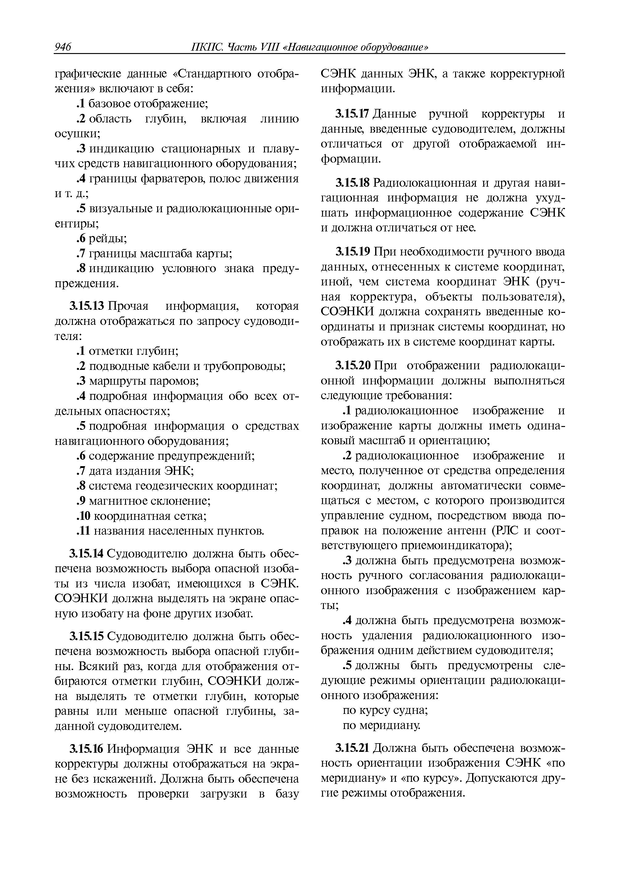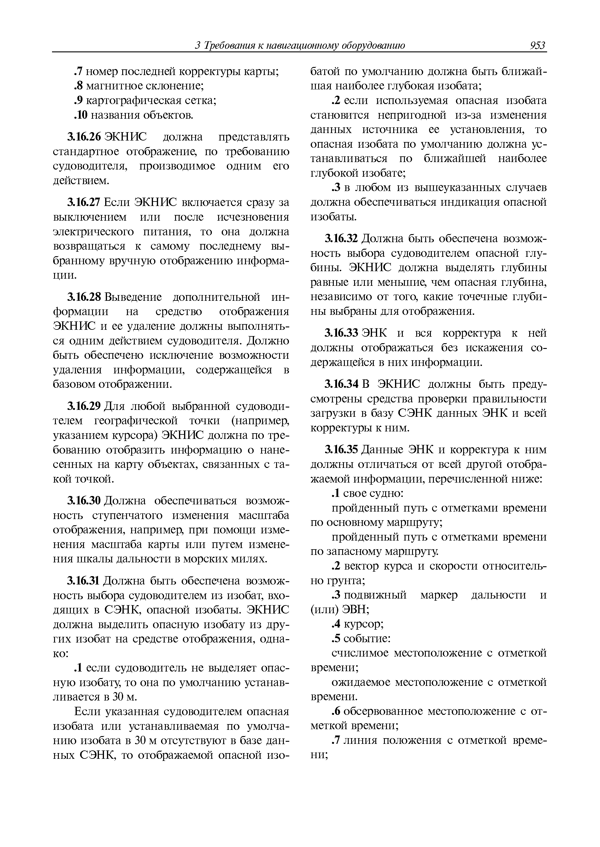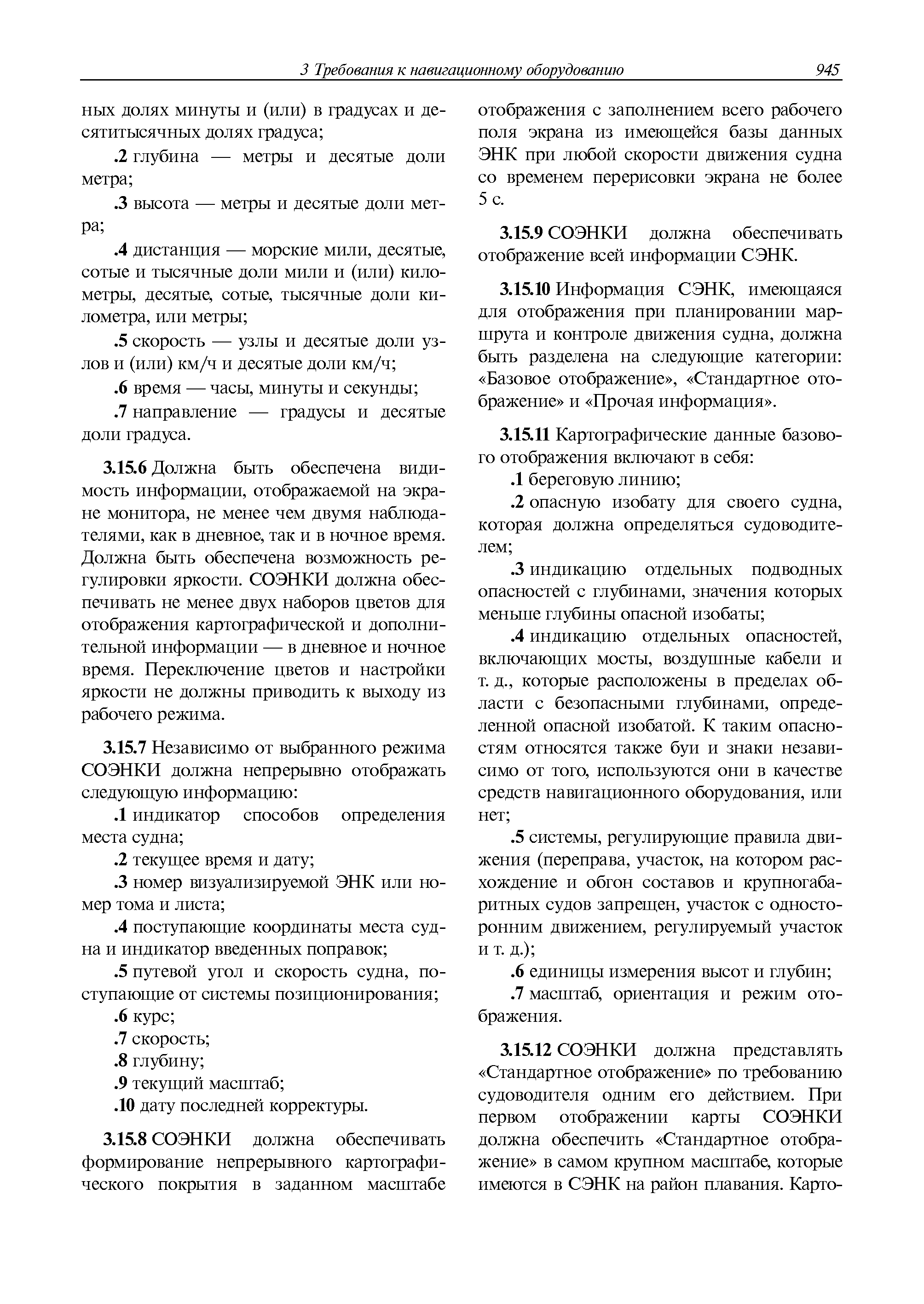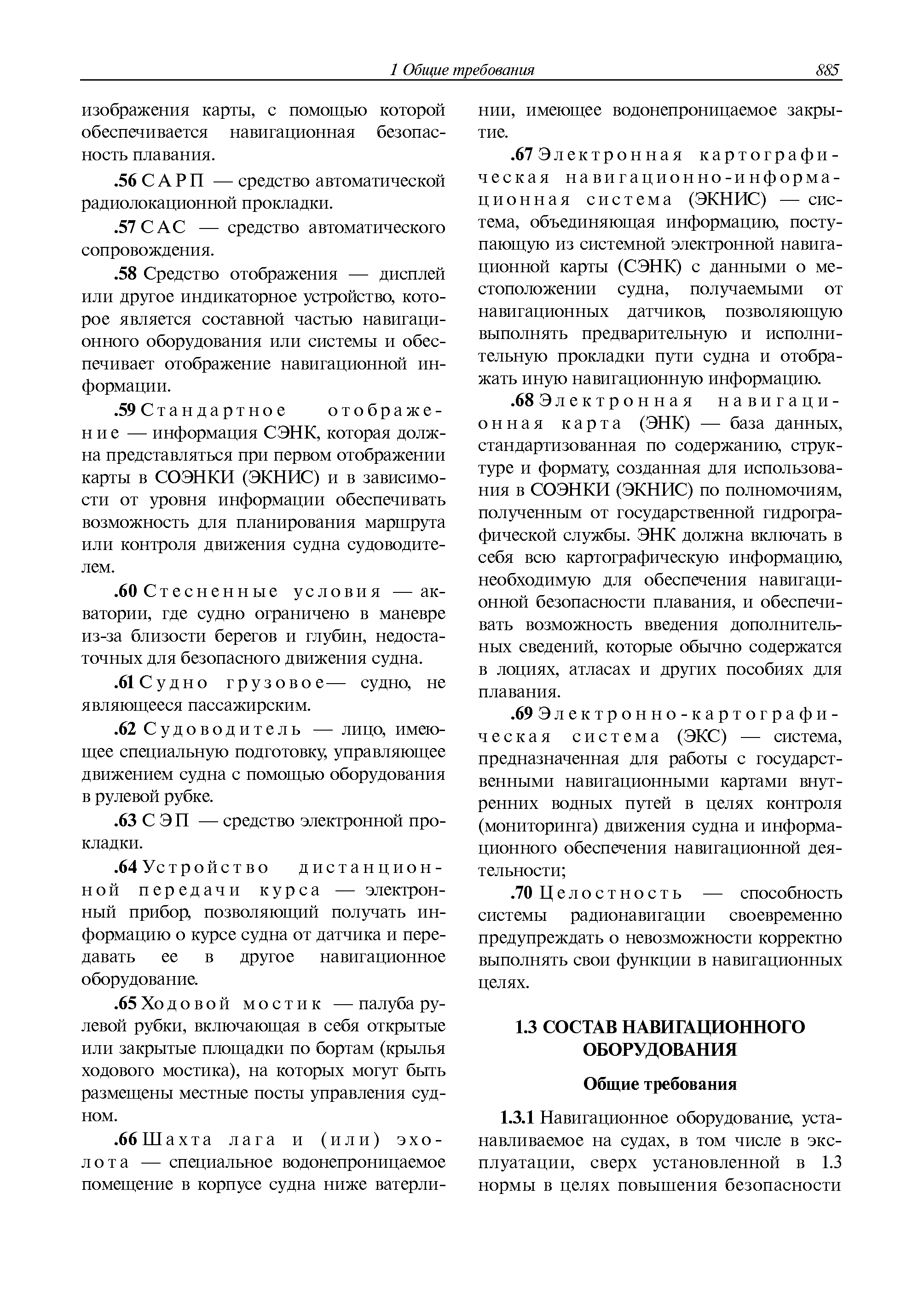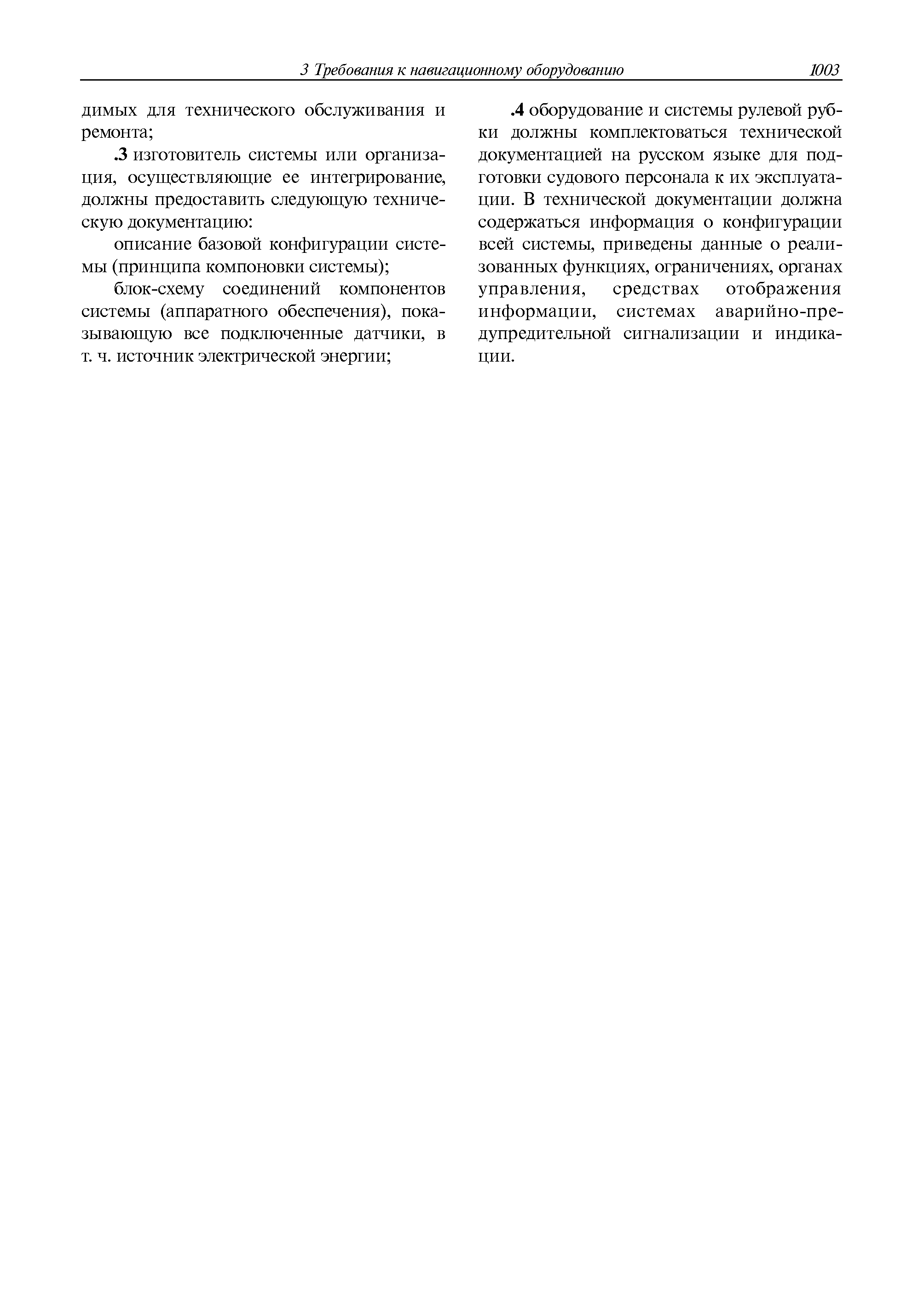 | Оглавление: | 1 Общие требования 1.1 Область распространения 1.2 Термины и их определения 1.3 Состав навигационного оборудования 2 Размещение навигационного оборудования 2.1 Общие требования 2.2 Размещение радиолокационной станции 2.3 Размещение магнитного компаса 2.4 Размещение гирокомпаса 2.5 Размещение авторулевого и стабилизатора курса 2.6 Размещение эхолота 2.7 Размещение лага 2.8 Размещение антенн и приемоиндикаторов систем радионавигации и ГНСС ГЛОНАСС, GРC, ГЛОНАСС/GРC, ГАЛИЛЕО 2.9 Размещение указателя скорости поворота 2.10 Размещение системы отображения электронных навигационных карт и информации (СОЭНКИ) 2.11 Размещение системы управления траекторией судна 2.12 Размещение автоматической идентификационной системы 2.13 Размещение регистратора данных рейса 2.14 Размещение аппаратуры приема внешних звуковых сигналов 2.15 Размещение радиолокационного отражателя 2.16 Размещение интегрированной навигационной системы 3 Требования к навигационному оборудованию 3.1 Общие требования 3.2 Требования к радиолокационной станции 3.3 Требования к магнитному компасу 3.4 Требования к гирокомпасу 3.5 Устройство дистанционной передачи курса 3.6 Требования к авторулевому и стабилизатору курса 3.7 Требования к эхолоту 3.8 Требования к лагу 3.9 Требования к комбинированному приемоиндикатору ГНСС, ГЛОНАСС/GPS 3.10 Требования к приемоиндикатору глобальной навигационной спутниковой системы GPS 3.11 Требования к приемоиндикатору ГЛОНАСС 3.12 Требования к приемоиндикатору навигационной спутниковой системы ГАЛИЛЕО 3.13 Требования к указателю скорости поворота 3.14 Требования к представлению навигационной информации на судовых средствах ее отображения 3.15 Требования к системе отображения электронных навигационных карт и информации 3.16 Требования к электронной картографической навигационно-информационной системе 3.17 Требования к системе управления траекторией судна (СУТС) 3.18 Требования к судовой аппаратуре автоматической идентификационной системы 3.19 Требования к регистратору данных рейса 3.20 Требования к упрощенному регистратору данных рейса 3.21 Требования к радиолокационному отражателю 3.22 Требования к интегрированным навигационным системам 3.23 Требования к аппаратуре приема внешних звуковых сигналов 3.24 Требования к системе сигнализации о несении ходовой вахты 3.25 Требования к оборудованию системы опознавания судов и слежения за ними на дальнем расстоянии 3.26 Требования к электронно-картографической системе 3.27 Требования к приемоиндикатору ГНСС Бейдоу 3.28 Требования к многосистемному радионавигационному приемнику 3.29 Требования к электронному кренометру 3.30 Требования к интегрированным системам рулевой рубки |