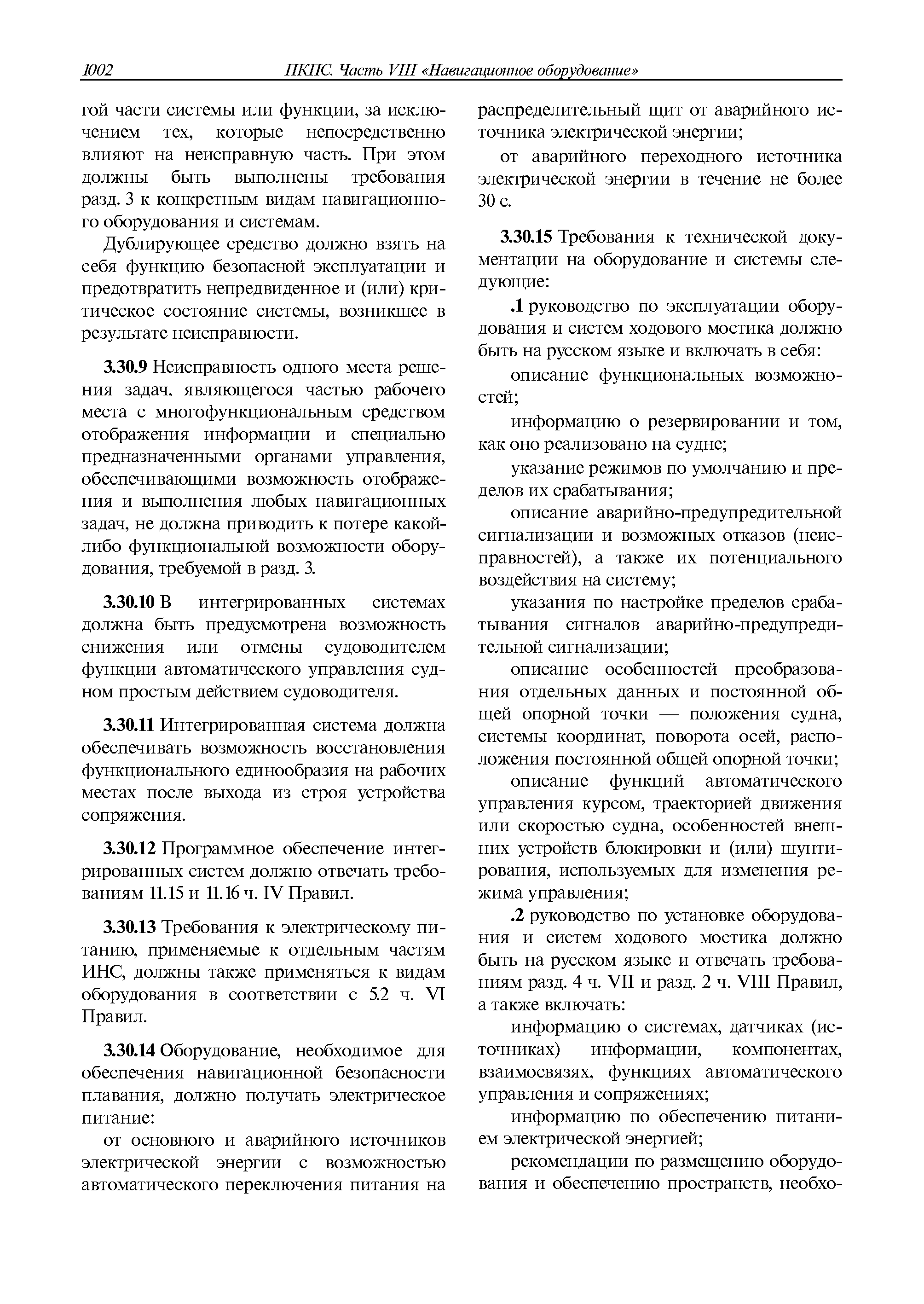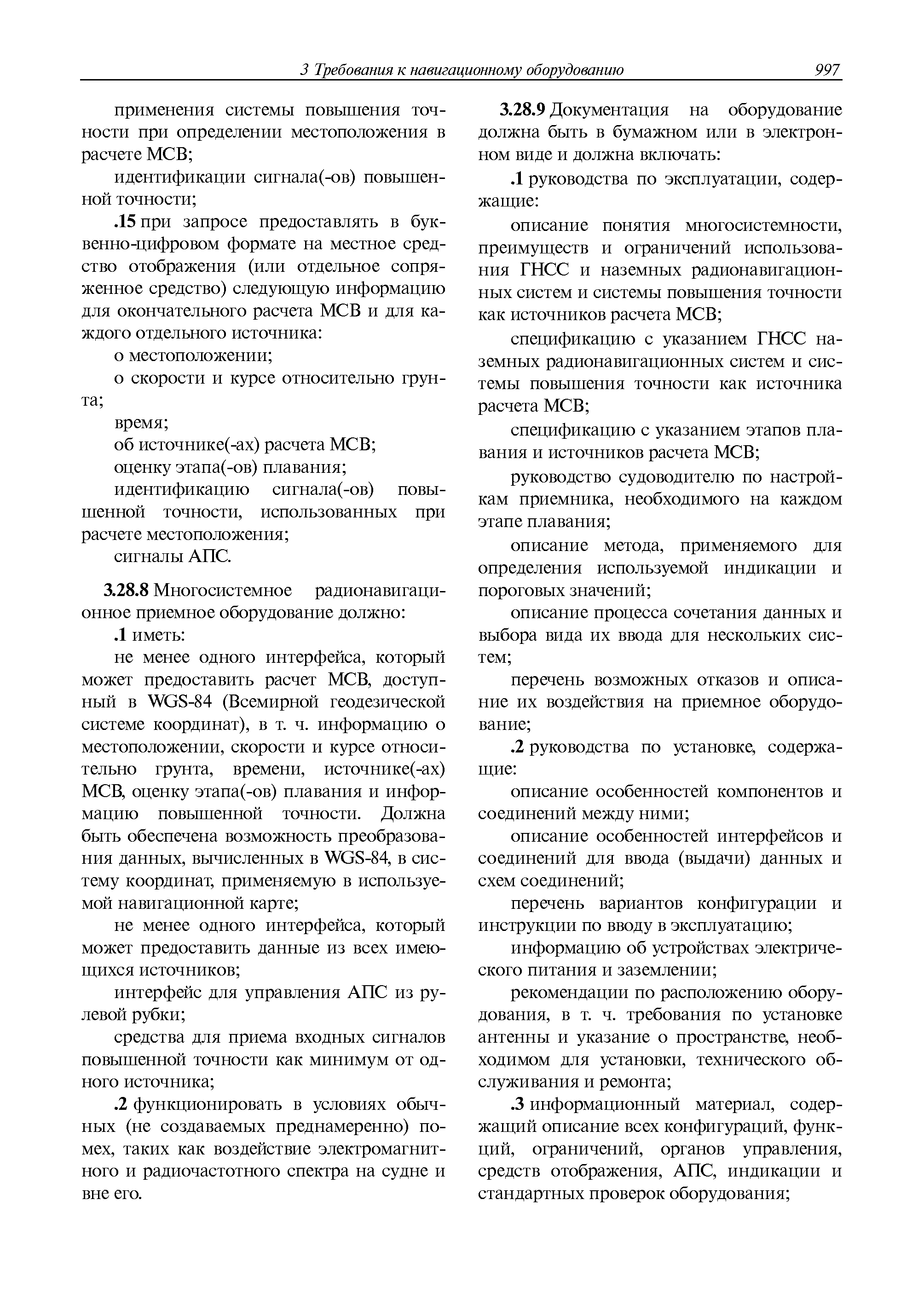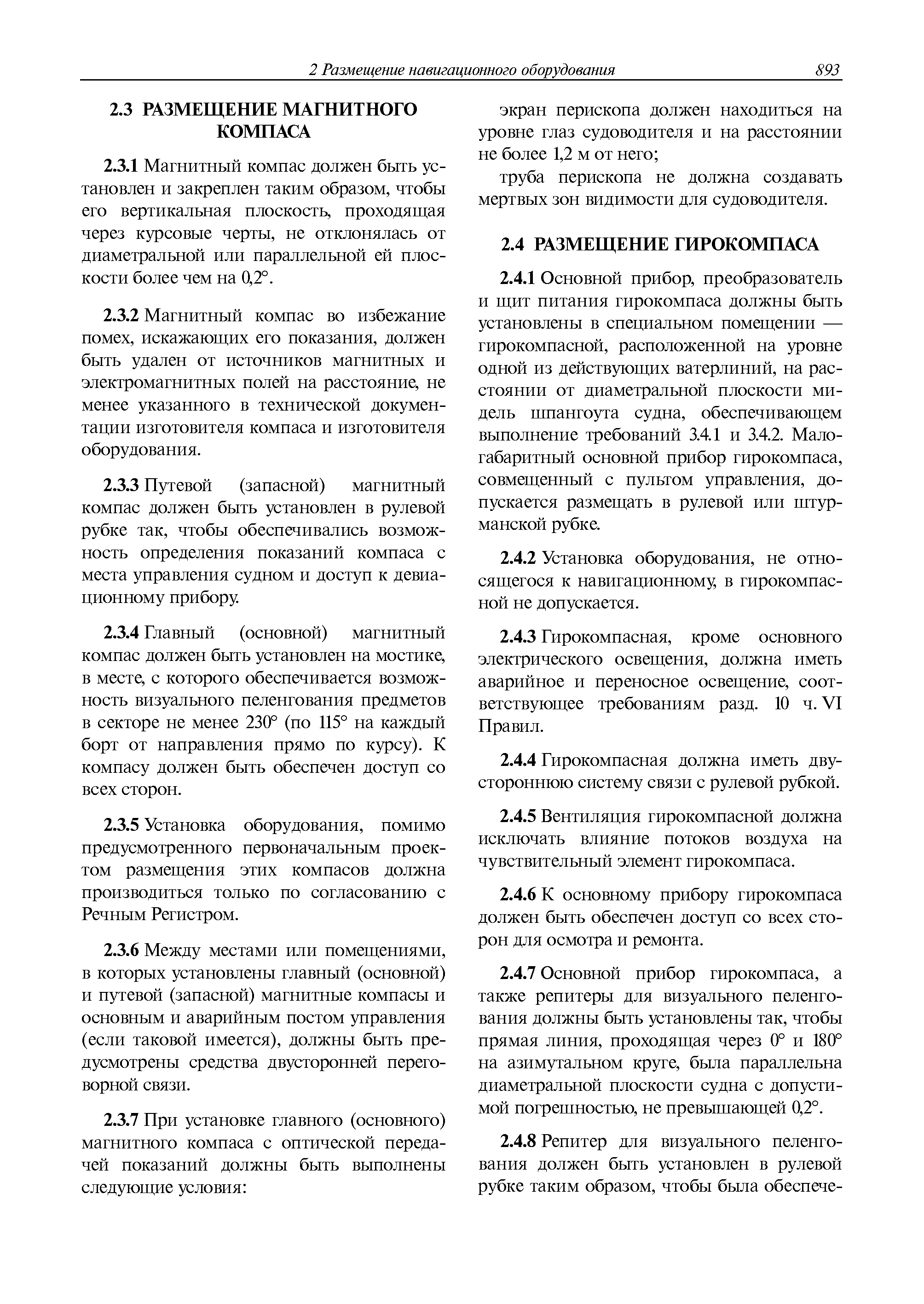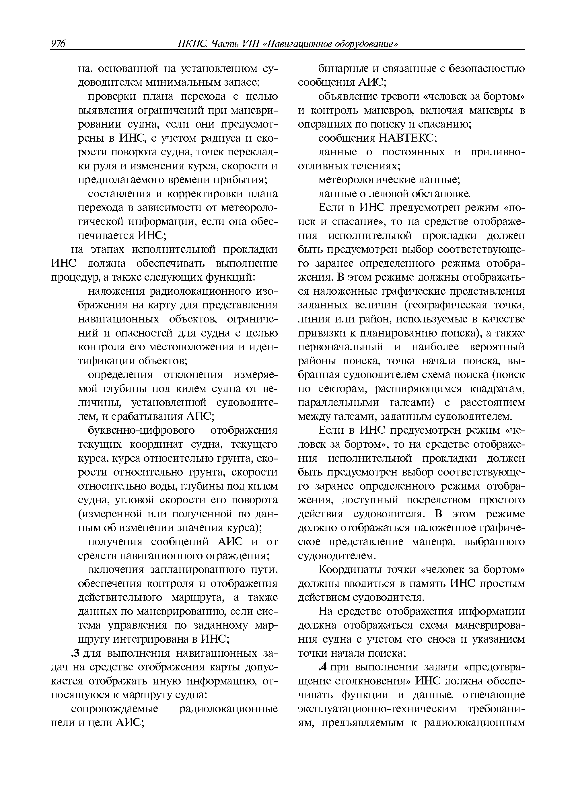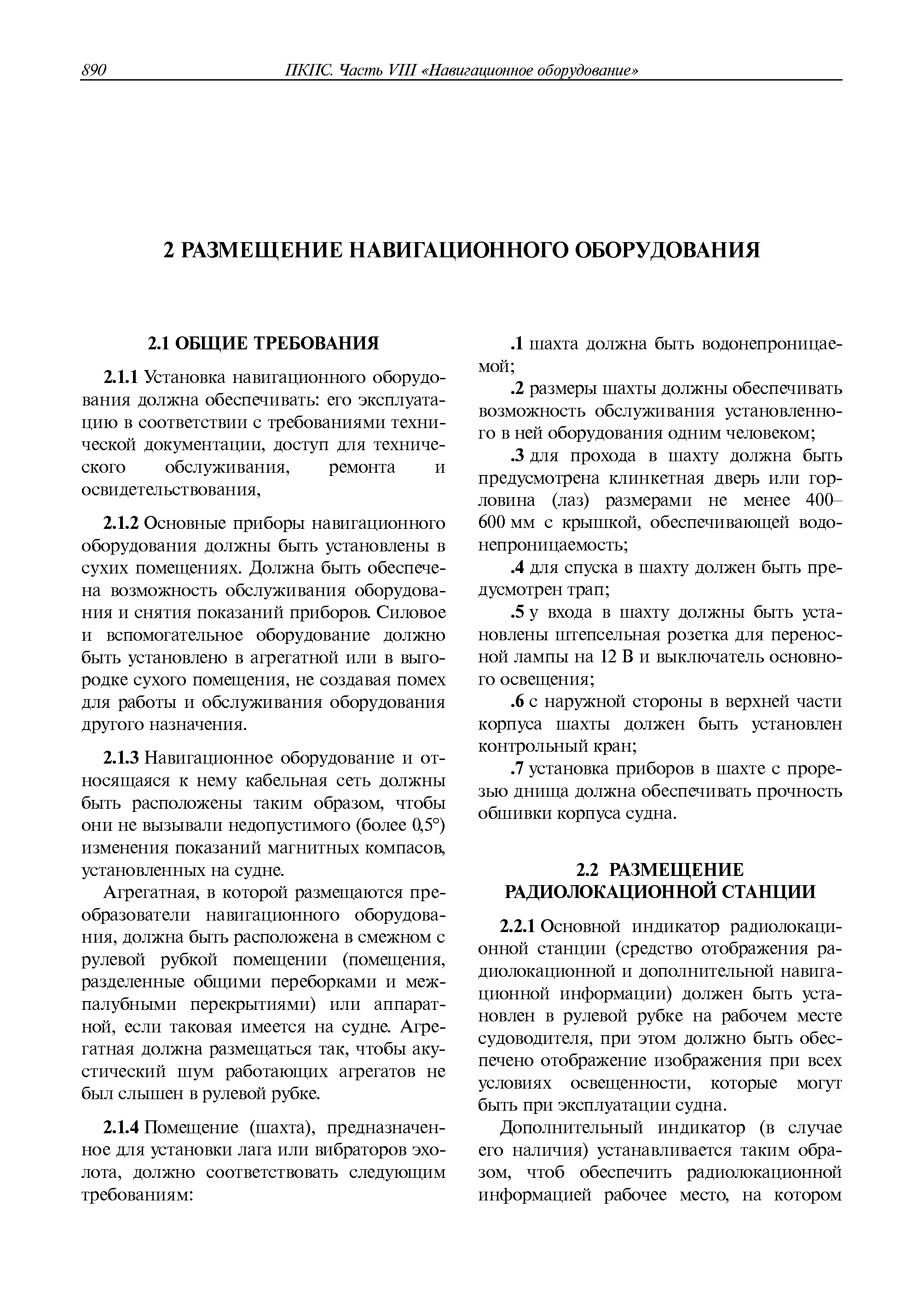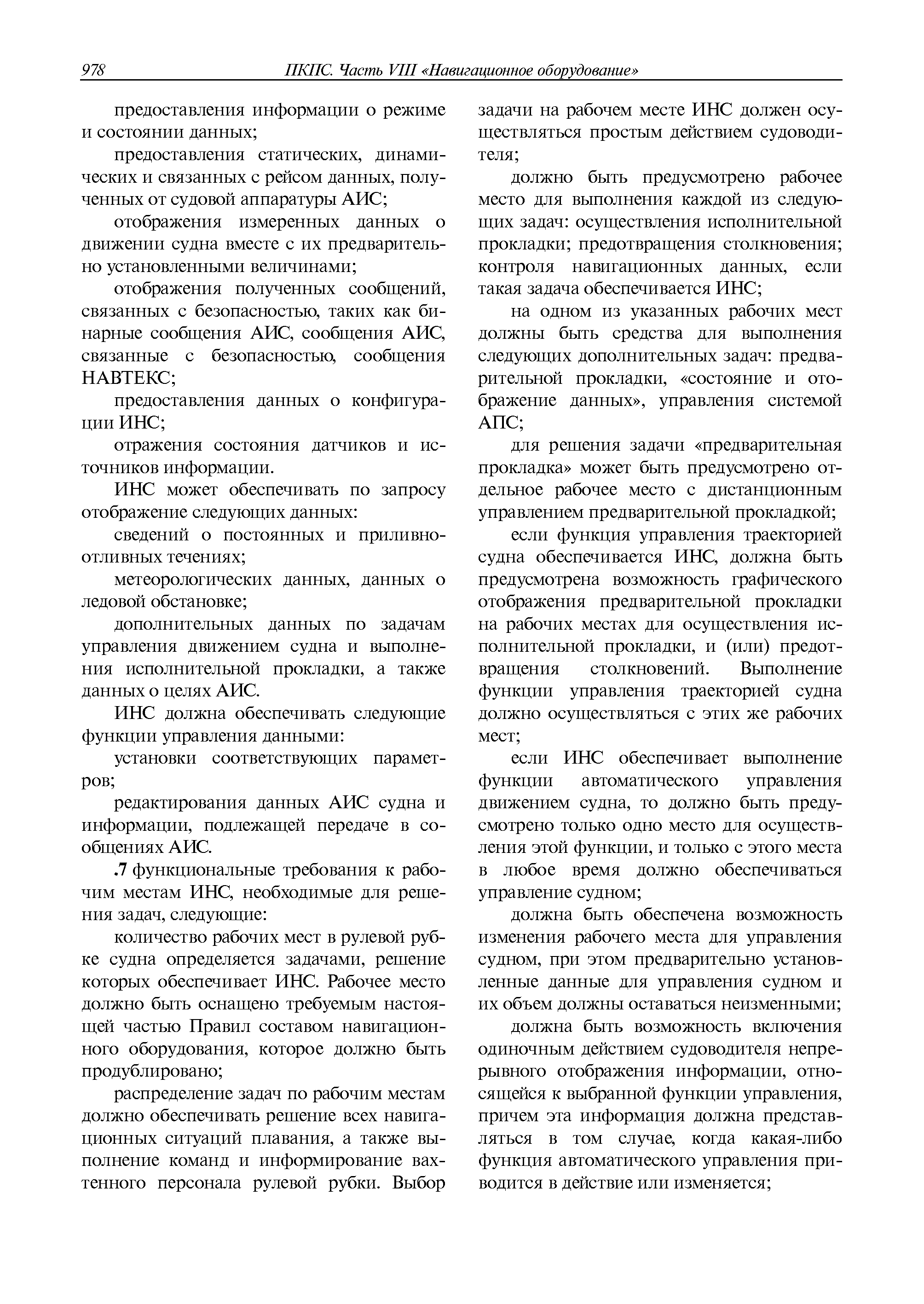 | Оглавление: | 1 Общие требования 1.1 Область распространения 1.2 Термины и их определения 1.3 Состав навигационного оборудования 2 Размещение навигационного оборудования 2.1 Общие требования 2.2 Размещение радиолокационной станции 2.3 Размещение магнитного компаса 2.4 Размещение гирокомпаса 2.5 Размещение авторулевого и стабилизатора курса 2.6 Размещение эхолота 2.7 Размещение лага 2.8 Размещение антенн и приемоиндикаторов систем радионавигации и ГНСС ГЛОНАСС, GРC, ГЛОНАСС/GРC, ГАЛИЛЕО 2.9 Размещение указателя скорости поворота 2.10 Размещение системы отображения электронных навигационных карт и информации (СОЭНКИ) 2.11 Размещение системы управления траекторией судна 2.12 Размещение автоматической идентификационной системы 2.13 Размещение регистратора данных рейса 2.14 Размещение аппаратуры приема внешних звуковых сигналов 2.15 Размещение радиолокационного отражателя 2.16 Размещение интегрированной навигационной системы 3 Требования к навигационному оборудованию 3.1 Общие требования 3.2 Требования к радиолокационной станции 3.3 Требования к магнитному компасу 3.4 Требования к гирокомпасу 3.5 Устройство дистанционной передачи курса 3.6 Требования к авторулевому и стабилизатору курса 3.7 Требования к эхолоту 3.8 Требования к лагу 3.9 Требования к комбинированному приемоиндикатору ГНСС, ГЛОНАСС/GPS 3.10 Требования к приемоиндикатору глобальной навигационной спутниковой системы GPS 3.11 Требования к приемоиндикатору ГЛОНАСС 3.12 Требования к приемоиндикатору навигационной спутниковой системы ГАЛИЛЕО 3.13 Требования к указателю скорости поворота 3.14 Требования к представлению навигационной информации на судовых средствах ее отображения 3.15 Требования к системе отображения электронных навигационных карт и информации 3.16 Требования к электронной картографической навигационно-информационной системе 3.17 Требования к системе управления траекторией судна (СУТС) 3.18 Требования к судовой аппаратуре автоматической идентификационной системы 3.19 Требования к регистратору данных рейса 3.20 Требования к упрощенному регистратору данных рейса 3.21 Требования к радиолокационному отражателю 3.22 Требования к интегрированным навигационным системам 3.23 Требования к аппаратуре приема внешних звуковых сигналов 3.24 Требования к системе сигнализации о несении ходовой вахты 3.25 Требования к оборудованию системы опознавания судов и слежения за ними на дальнем расстоянии 3.26 Требования к электронно-картографической системе 3.27 Требования к приемоиндикатору ГНСС Бейдоу 3.28 Требования к многосистемному радионавигационному приемнику 3.29 Требования к электронному кренометру 3.30 Требования к интегрированным системам рулевой рубки |