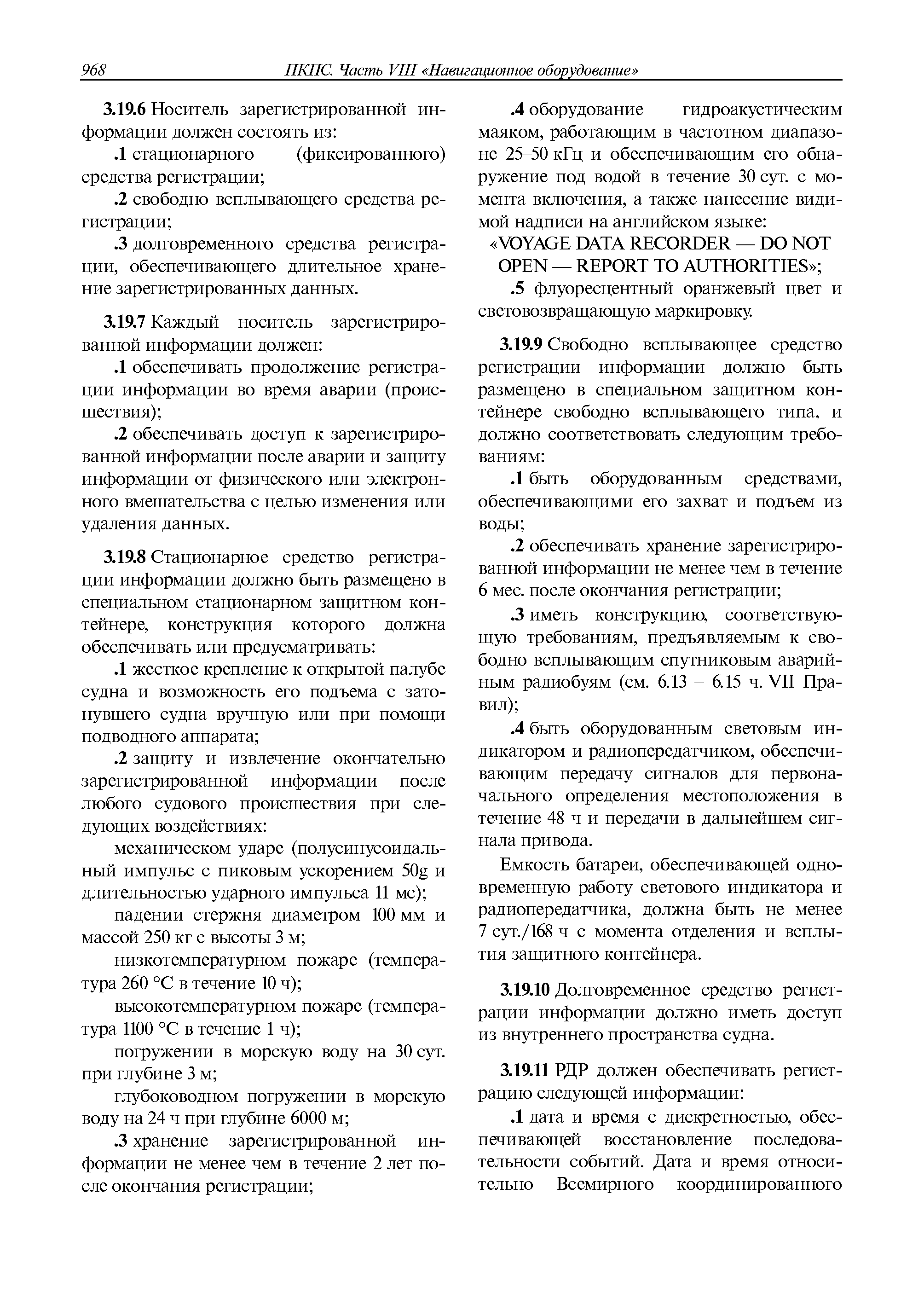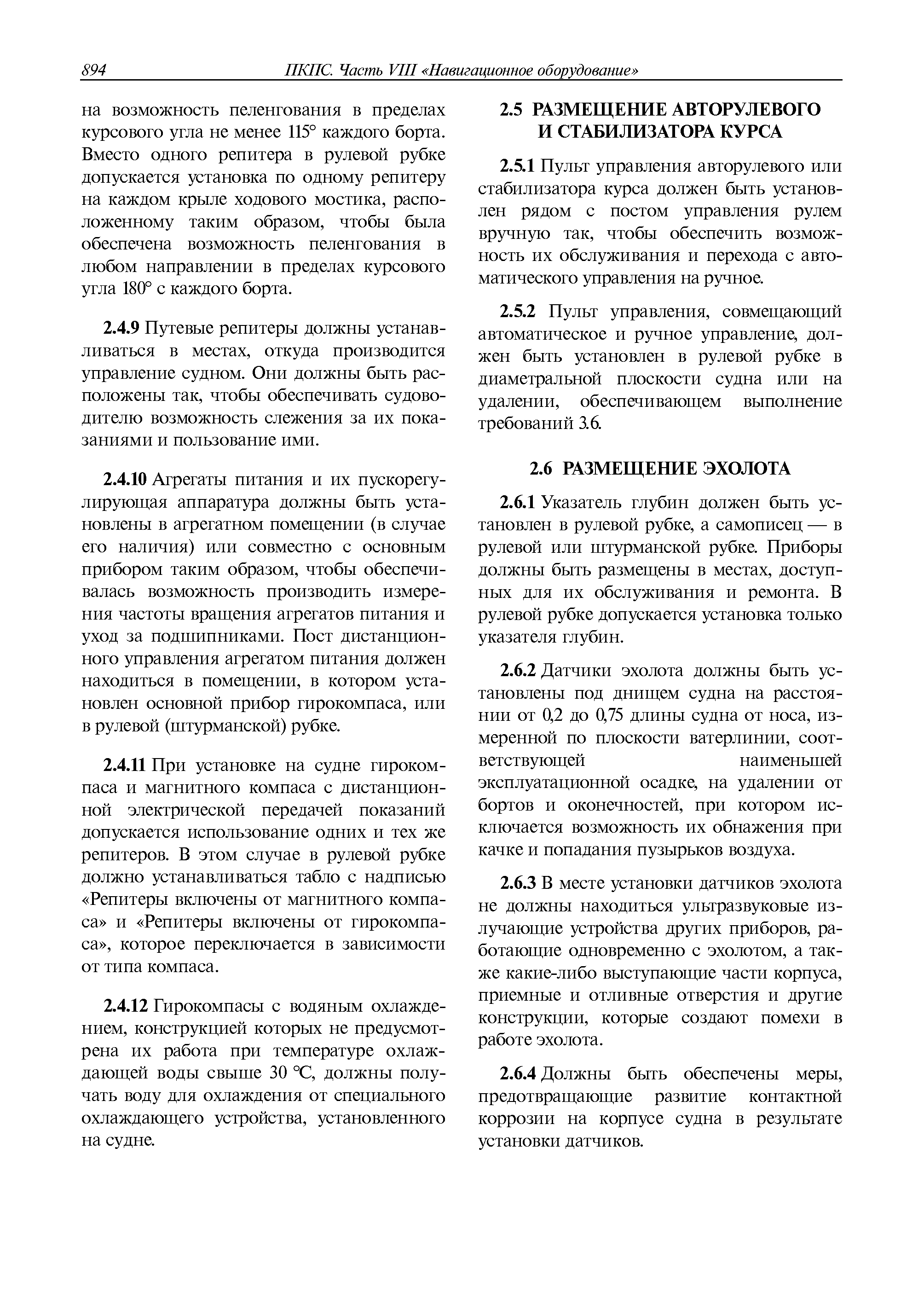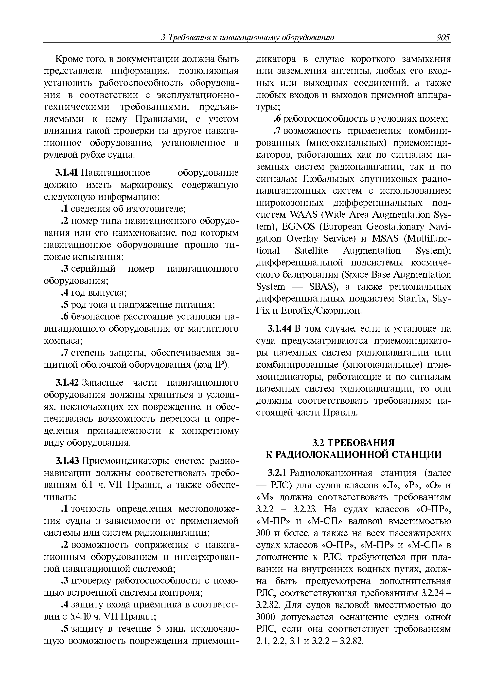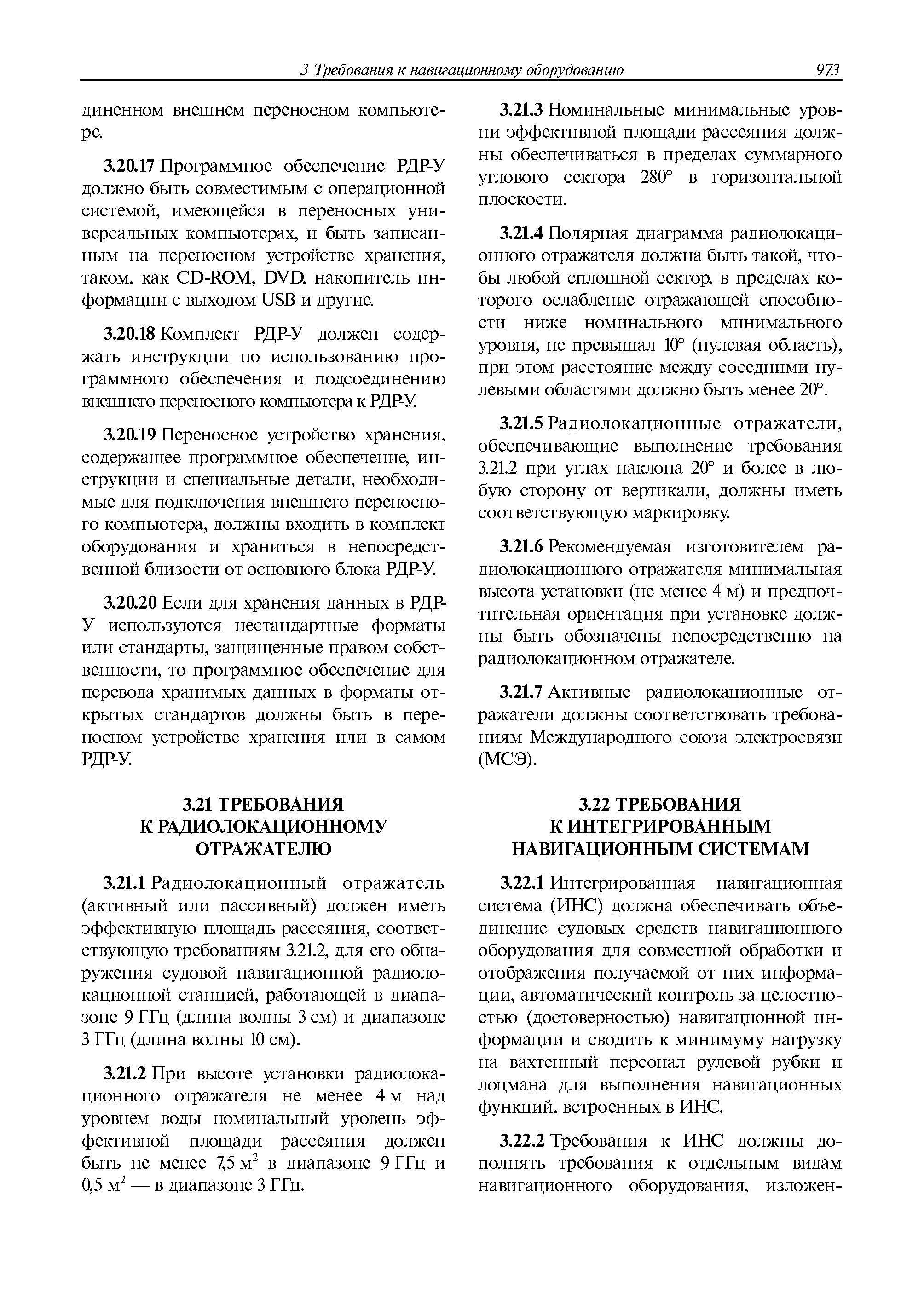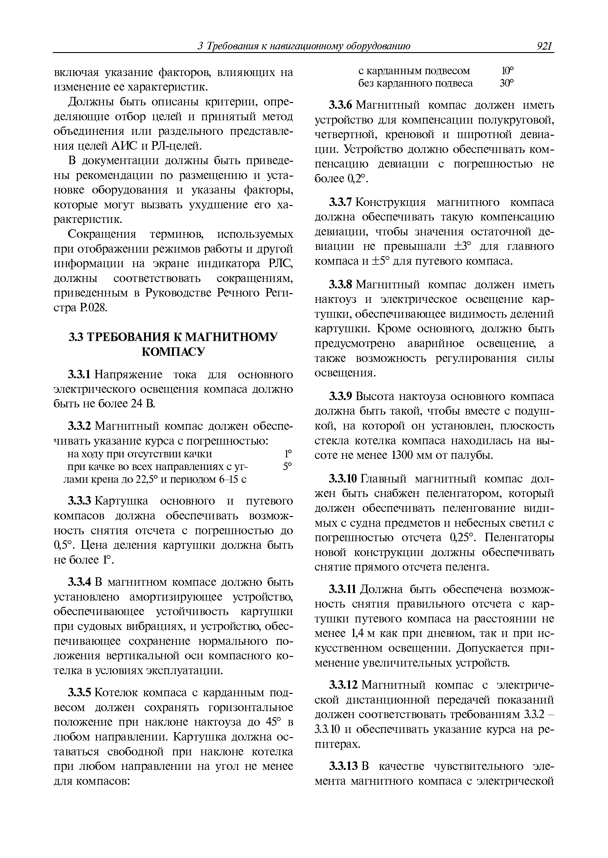 | Оглавление: | 1 Общие требования 1.1 Область распространения 1.2 Термины и их определения 1.3 Состав навигационного оборудования 2 Размещение навигационного оборудования 2.1 Общие требования 2.2 Размещение радиолокационной станции 2.3 Размещение магнитного компаса 2.4 Размещение гирокомпаса 2.5 Размещение авторулевого и стабилизатора курса 2.6 Размещение эхолота 2.7 Размещение лага 2.8 Размещение антенн и приемоиндикаторов систем радионавигации и ГНСС ГЛОНАСС, GРC, ГЛОНАСС/GРC, ГАЛИЛЕО 2.9 Размещение указателя скорости поворота 2.10 Размещение системы отображения электронных навигационных карт и информации (СОЭНКИ) 2.11 Размещение системы управления траекторией судна 2.12 Размещение автоматической идентификационной системы 2.13 Размещение регистратора данных рейса 2.14 Размещение аппаратуры приема внешних звуковых сигналов 2.15 Размещение радиолокационного отражателя 2.16 Размещение интегрированной навигационной системы 3 Требования к навигационному оборудованию 3.1 Общие требования 3.2 Требования к радиолокационной станции 3.3 Требования к магнитному компасу 3.4 Требования к гирокомпасу 3.5 Устройство дистанционной передачи курса 3.6 Требования к авторулевому и стабилизатору курса 3.7 Требования к эхолоту 3.8 Требования к лагу 3.9 Требования к комбинированному приемоиндикатору ГНСС, ГЛОНАСС/GPS 3.10 Требования к приемоиндикатору глобальной навигационной спутниковой системы GPS 3.11 Требования к приемоиндикатору ГЛОНАСС 3.12 Требования к приемоиндикатору навигационной спутниковой системы ГАЛИЛЕО 3.13 Требования к указателю скорости поворота 3.14 Требования к представлению навигационной информации на судовых средствах ее отображения 3.15 Требования к системе отображения электронных навигационных карт и информации 3.16 Требования к электронной картографической навигационно-информационной системе 3.17 Требования к системе управления траекторией судна (СУТС) 3.18 Требования к судовой аппаратуре автоматической идентификационной системы 3.19 Требования к регистратору данных рейса 3.20 Требования к упрощенному регистратору данных рейса 3.21 Требования к радиолокационному отражателю 3.22 Требования к интегрированным навигационным системам 3.23 Требования к аппаратуре приема внешних звуковых сигналов 3.24 Требования к системе сигнализации о несении ходовой вахты 3.25 Требования к оборудованию системы опознавания судов и слежения за ними на дальнем расстоянии 3.26 Требования к электронно-картографической системе 3.27 Требования к приемоиндикатору ГНСС Бейдоу 3.28 Требования к многосистемному радионавигационному приемнику 3.29 Требования к электронному кренометру 3.30 Требования к интегрированным системам рулевой рубки |