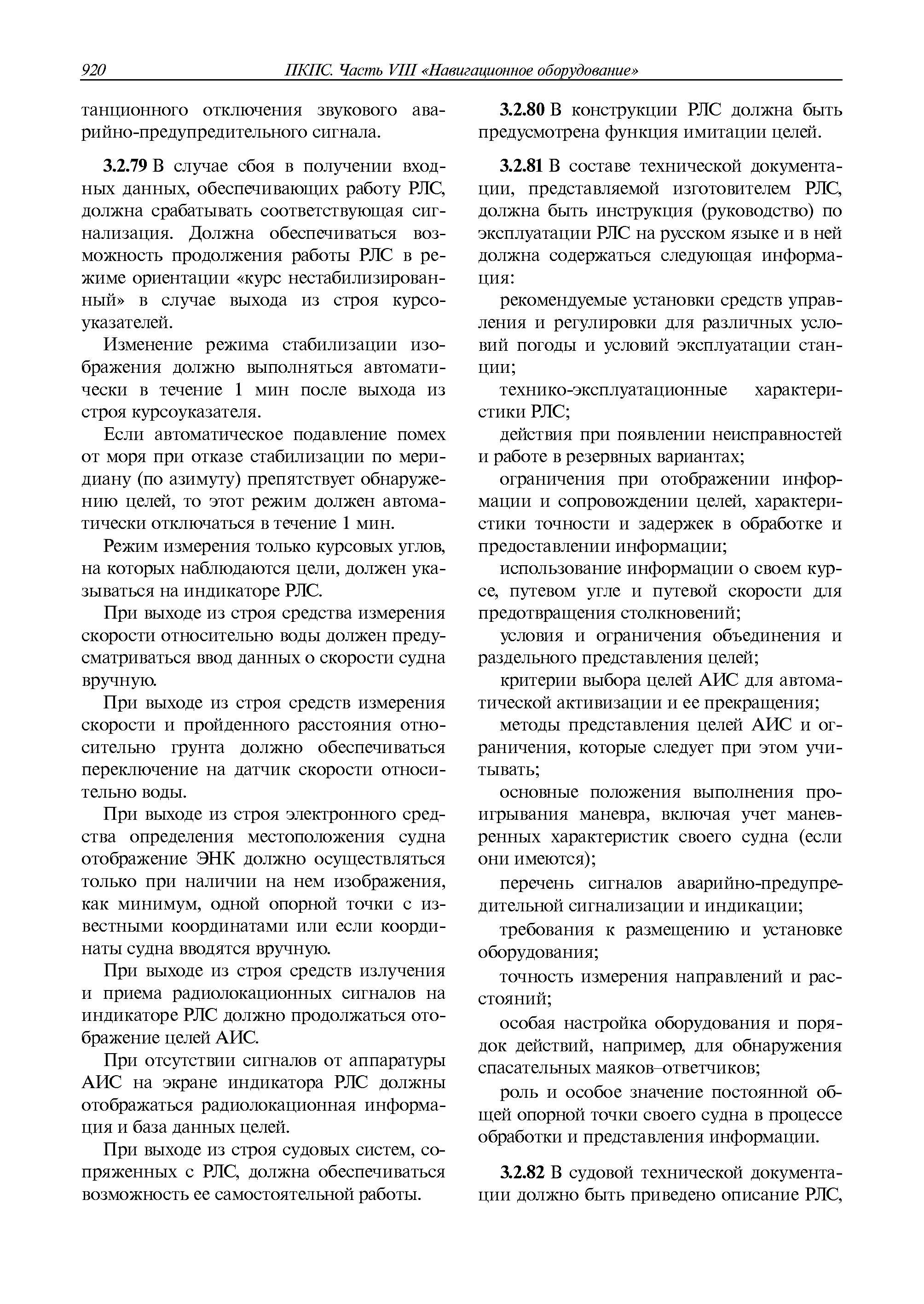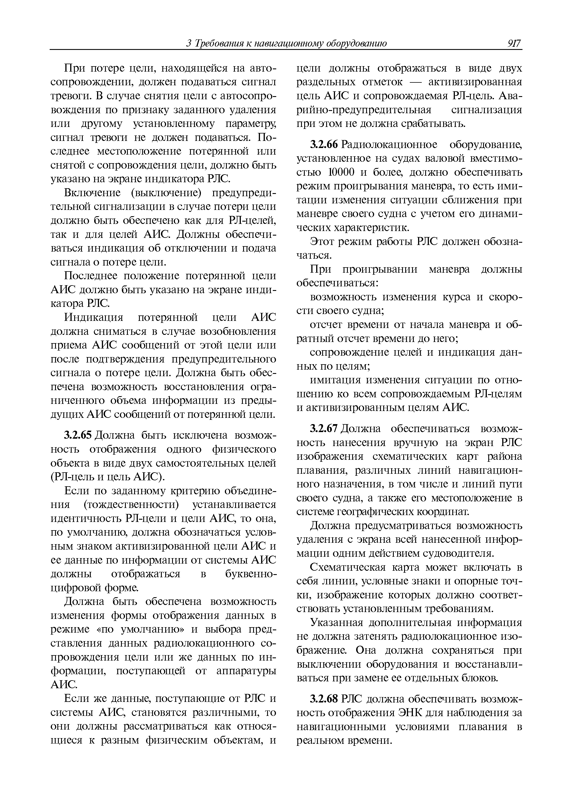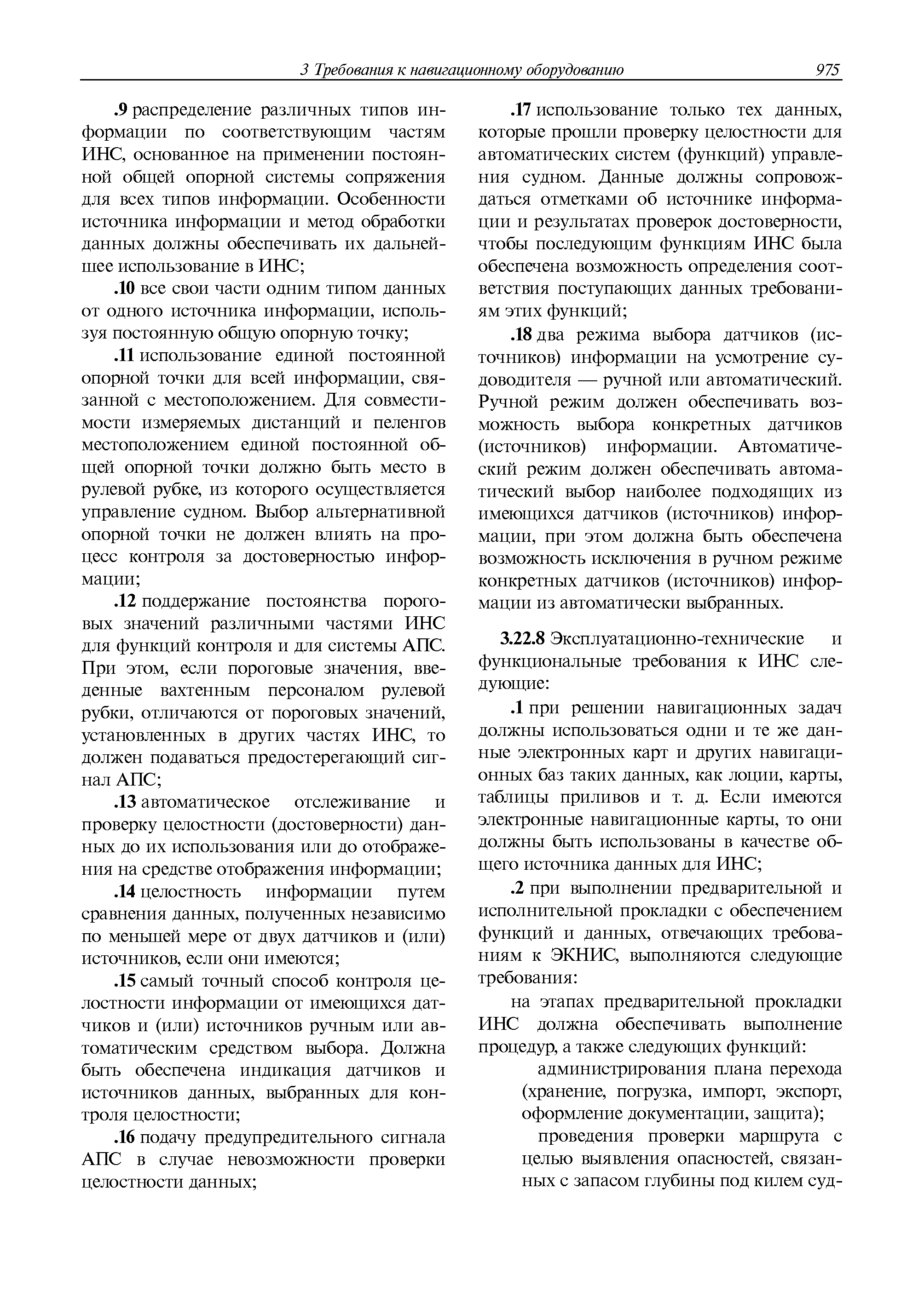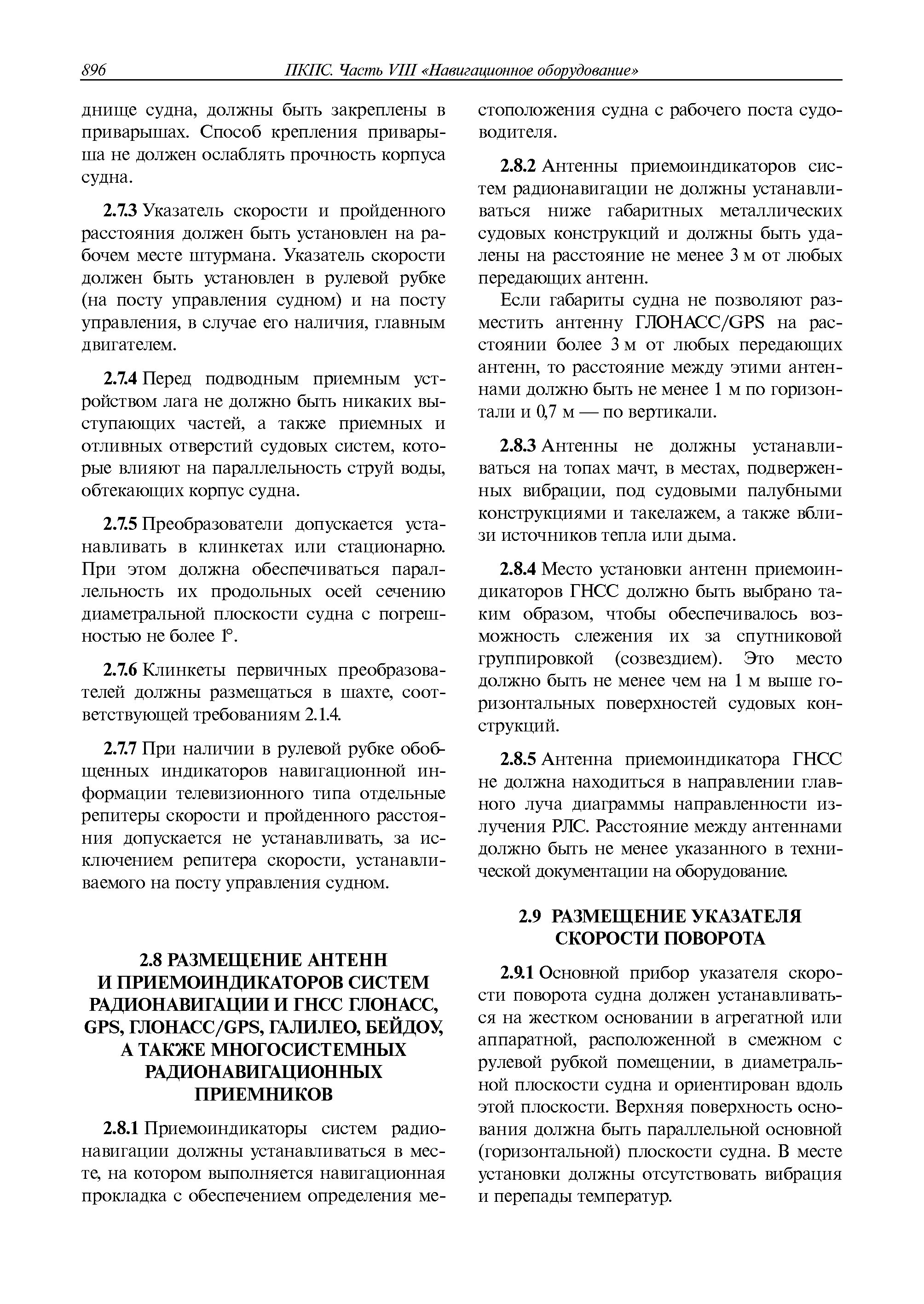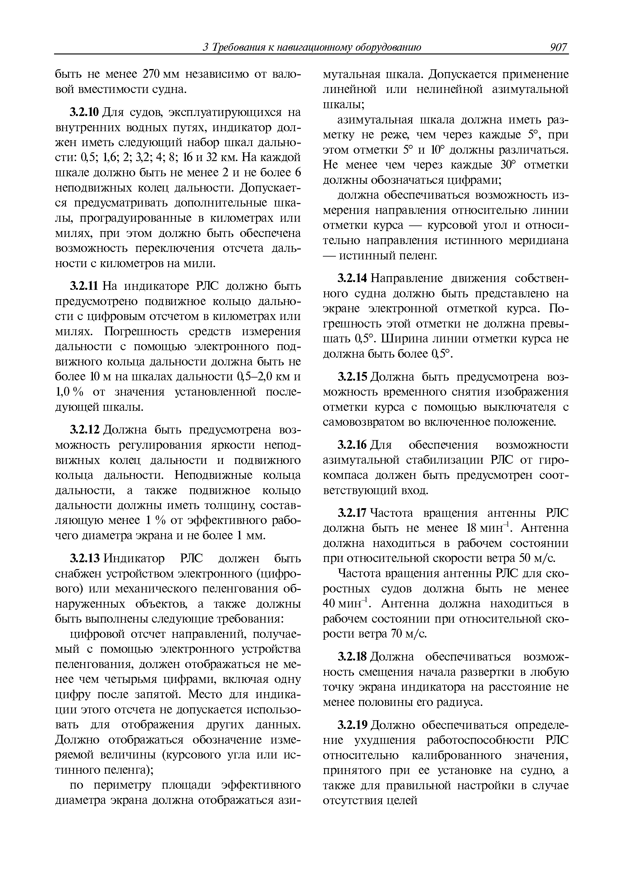 | Оглавление: | 1 Общие требования 1.1 Область распространения 1.2 Термины и их определения 1.3 Состав навигационного оборудования 2 Размещение навигационного оборудования 2.1 Общие требования 2.2 Размещение радиолокационной станции 2.3 Размещение магнитного компаса 2.4 Размещение гирокомпаса 2.5 Размещение авторулевого и стабилизатора курса 2.6 Размещение эхолота 2.7 Размещение лага 2.8 Размещение антенн и приемоиндикаторов систем радионавигации и ГНСС ГЛОНАСС, GРC, ГЛОНАСС/GРC, ГАЛИЛЕО 2.9 Размещение указателя скорости поворота 2.10 Размещение системы отображения электронных навигационных карт и информации (СОЭНКИ) 2.11 Размещение системы управления траекторией судна 2.12 Размещение автоматической идентификационной системы 2.13 Размещение регистратора данных рейса 2.14 Размещение аппаратуры приема внешних звуковых сигналов 2.15 Размещение радиолокационного отражателя 2.16 Размещение интегрированной навигационной системы 3 Требования к навигационному оборудованию 3.1 Общие требования 3.2 Требования к радиолокационной станции 3.3 Требования к магнитному компасу 3.4 Требования к гирокомпасу 3.5 Устройство дистанционной передачи курса 3.6 Требования к авторулевому и стабилизатору курса 3.7 Требования к эхолоту 3.8 Требования к лагу 3.9 Требования к комбинированному приемоиндикатору ГНСС, ГЛОНАСС/GPS 3.10 Требования к приемоиндикатору глобальной навигационной спутниковой системы GPS 3.11 Требования к приемоиндикатору ГЛОНАСС 3.12 Требования к приемоиндикатору навигационной спутниковой системы ГАЛИЛЕО 3.13 Требования к указателю скорости поворота 3.14 Требования к представлению навигационной информации на судовых средствах ее отображения 3.15 Требования к системе отображения электронных навигационных карт и информации 3.16 Требования к электронной картографической навигационно-информационной системе 3.17 Требования к системе управления траекторией судна (СУТС) 3.18 Требования к судовой аппаратуре автоматической идентификационной системы 3.19 Требования к регистратору данных рейса 3.20 Требования к упрощенному регистратору данных рейса 3.21 Требования к радиолокационному отражателю 3.22 Требования к интегрированным навигационным системам 3.23 Требования к аппаратуре приема внешних звуковых сигналов 3.24 Требования к системе сигнализации о несении ходовой вахты 3.25 Требования к оборудованию системы опознавания судов и слежения за ними на дальнем расстоянии 3.26 Требования к электронно-картографической системе 3.27 Требования к приемоиндикатору ГНСС Бейдоу 3.28 Требования к многосистемному радионавигационному приемнику 3.29 Требования к электронному кренометру 3.30 Требования к интегрированным системам рулевой рубки |