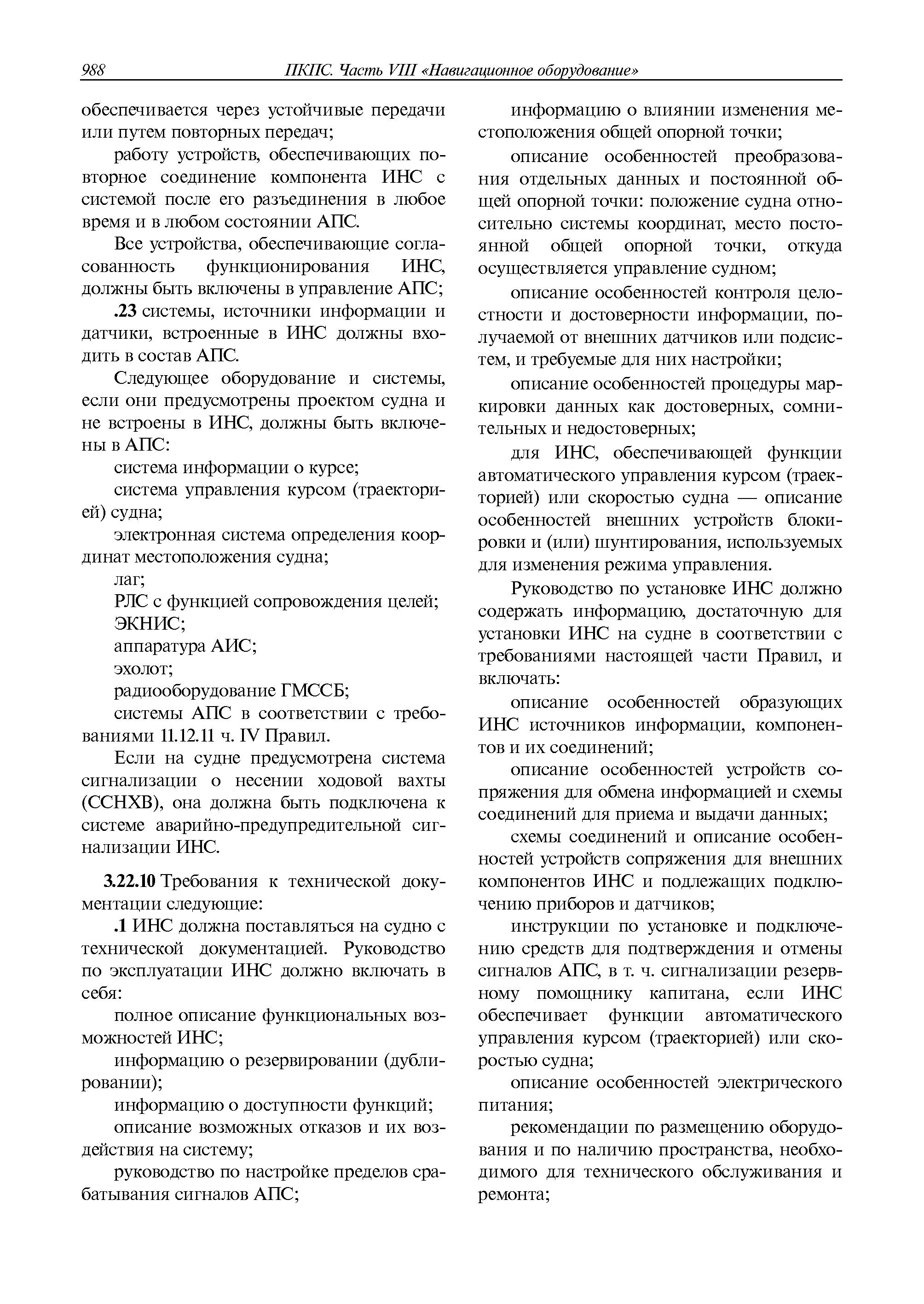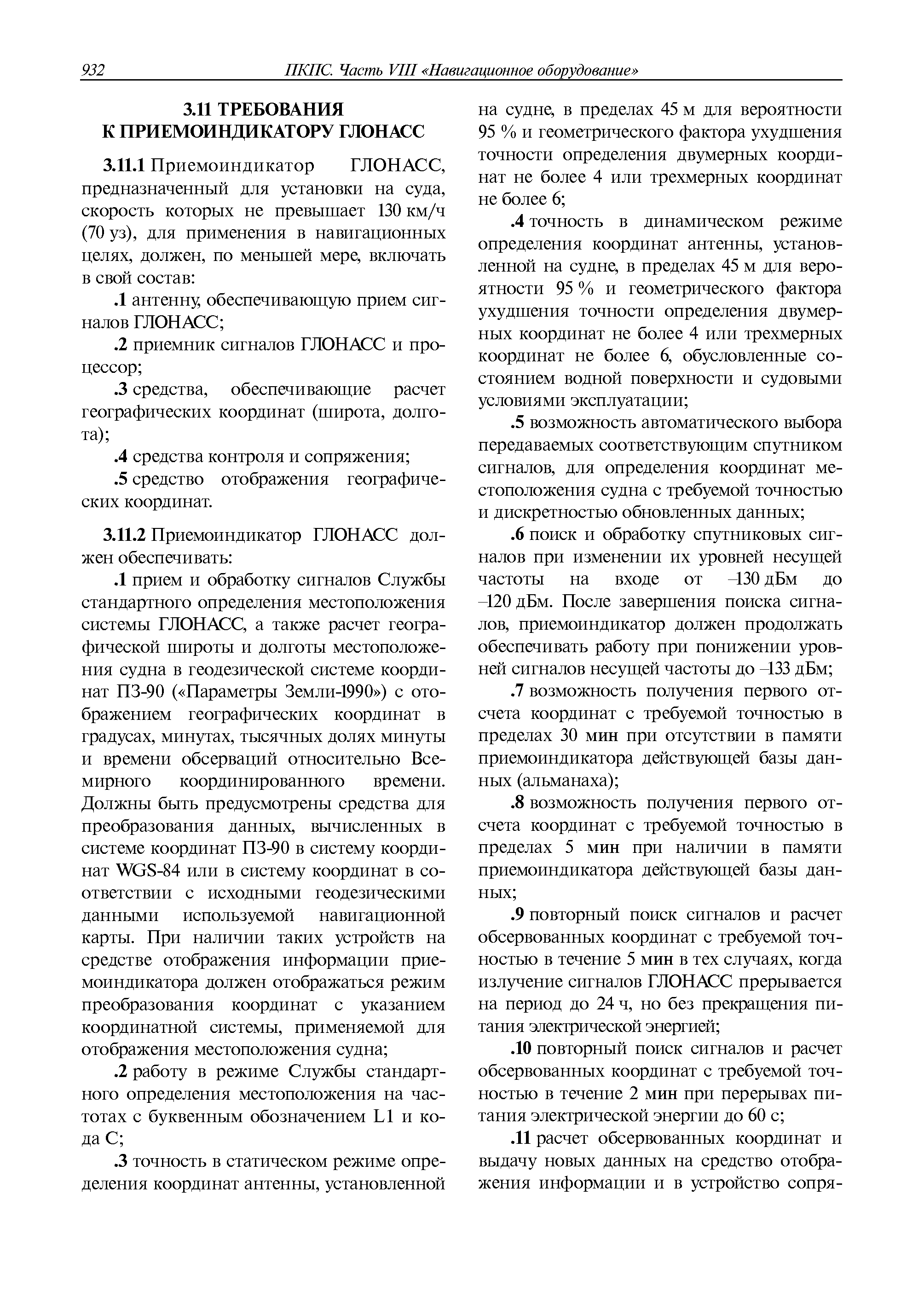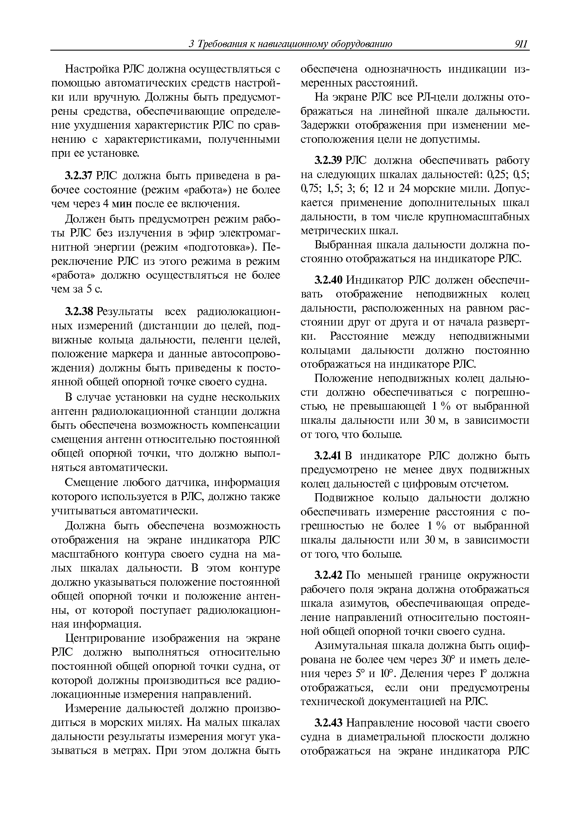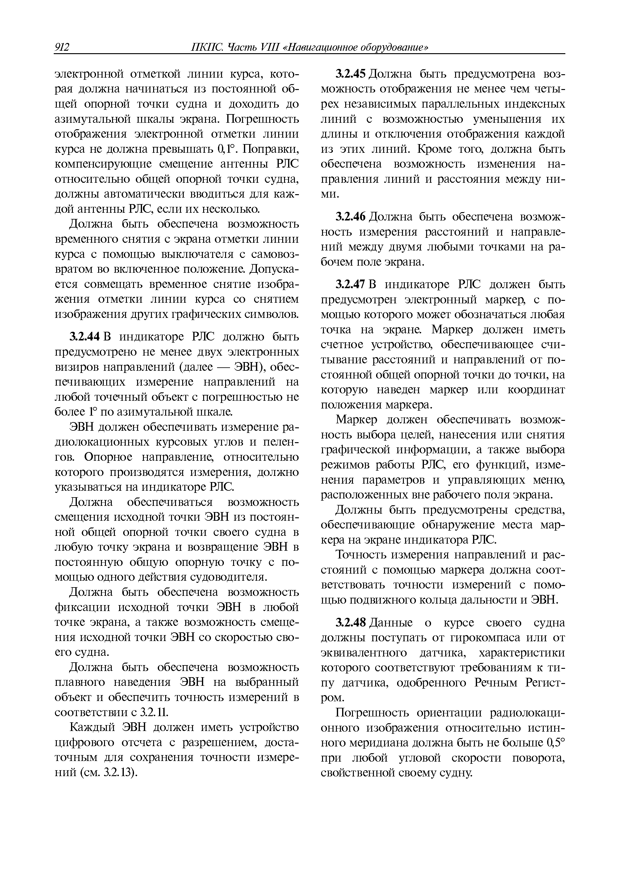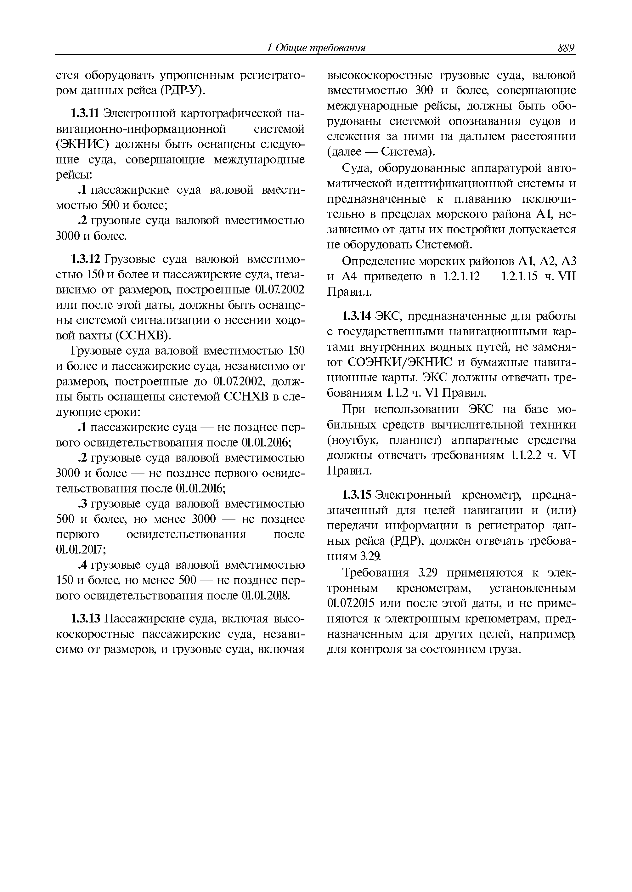 | Оглавление: | 1 Общие требования 1.1 Область распространения 1.2 Термины и их определения 1.3 Состав навигационного оборудования 2 Размещение навигационного оборудования 2.1 Общие требования 2.2 Размещение радиолокационной станции 2.3 Размещение магнитного компаса 2.4 Размещение гирокомпаса 2.5 Размещение авторулевого и стабилизатора курса 2.6 Размещение эхолота 2.7 Размещение лага 2.8 Размещение антенн и приемоиндикаторов систем радионавигации и ГНСС ГЛОНАСС, GРC, ГЛОНАСС/GРC, ГАЛИЛЕО 2.9 Размещение указателя скорости поворота 2.10 Размещение системы отображения электронных навигационных карт и информации (СОЭНКИ) 2.11 Размещение системы управления траекторией судна 2.12 Размещение автоматической идентификационной системы 2.13 Размещение регистратора данных рейса 2.14 Размещение аппаратуры приема внешних звуковых сигналов 2.15 Размещение радиолокационного отражателя 2.16 Размещение интегрированной навигационной системы 3 Требования к навигационному оборудованию 3.1 Общие требования 3.2 Требования к радиолокационной станции 3.3 Требования к магнитному компасу 3.4 Требования к гирокомпасу 3.5 Устройство дистанционной передачи курса 3.6 Требования к авторулевому и стабилизатору курса 3.7 Требования к эхолоту 3.8 Требования к лагу 3.9 Требования к комбинированному приемоиндикатору ГНСС, ГЛОНАСС/GPS 3.10 Требования к приемоиндикатору глобальной навигационной спутниковой системы GPS 3.11 Требования к приемоиндикатору ГЛОНАСС 3.12 Требования к приемоиндикатору навигационной спутниковой системы ГАЛИЛЕО 3.13 Требования к указателю скорости поворота 3.14 Требования к представлению навигационной информации на судовых средствах ее отображения 3.15 Требования к системе отображения электронных навигационных карт и информации 3.16 Требования к электронной картографической навигационно-информационной системе 3.17 Требования к системе управления траекторией судна (СУТС) 3.18 Требования к судовой аппаратуре автоматической идентификационной системы 3.19 Требования к регистратору данных рейса 3.20 Требования к упрощенному регистратору данных рейса 3.21 Требования к радиолокационному отражателю 3.22 Требования к интегрированным навигационным системам 3.23 Требования к аппаратуре приема внешних звуковых сигналов 3.24 Требования к системе сигнализации о несении ходовой вахты 3.25 Требования к оборудованию системы опознавания судов и слежения за ними на дальнем расстоянии 3.26 Требования к электронно-картографической системе 3.27 Требования к приемоиндикатору ГНСС Бейдоу 3.28 Требования к многосистемному радионавигационному приемнику 3.29 Требования к электронному кренометру 3.30 Требования к интегрированным системам рулевой рубки |