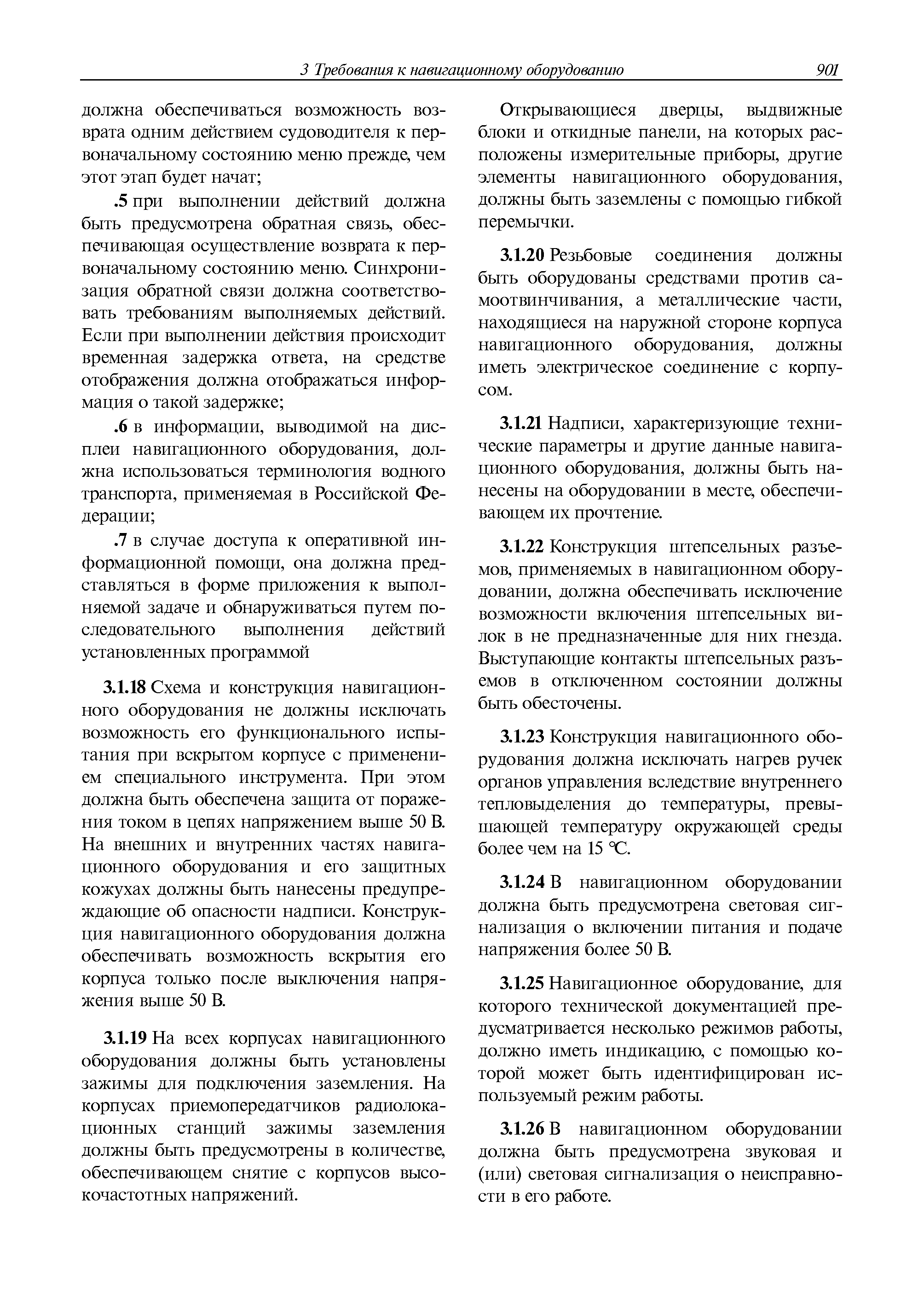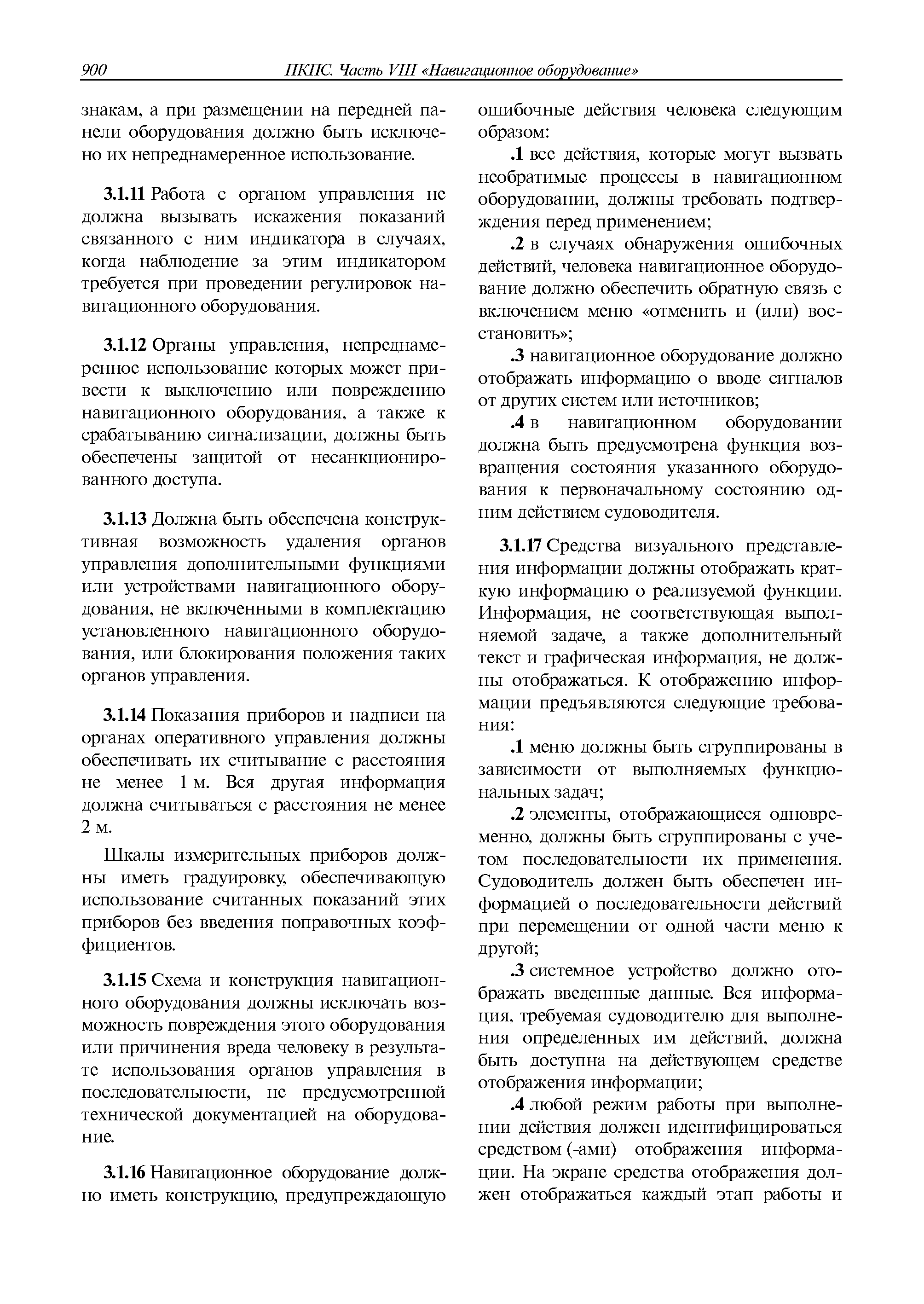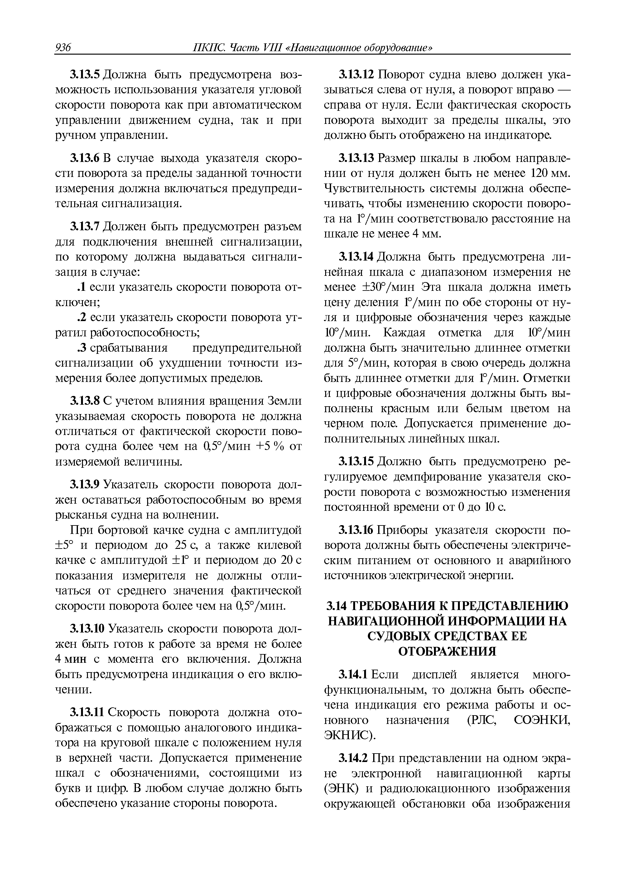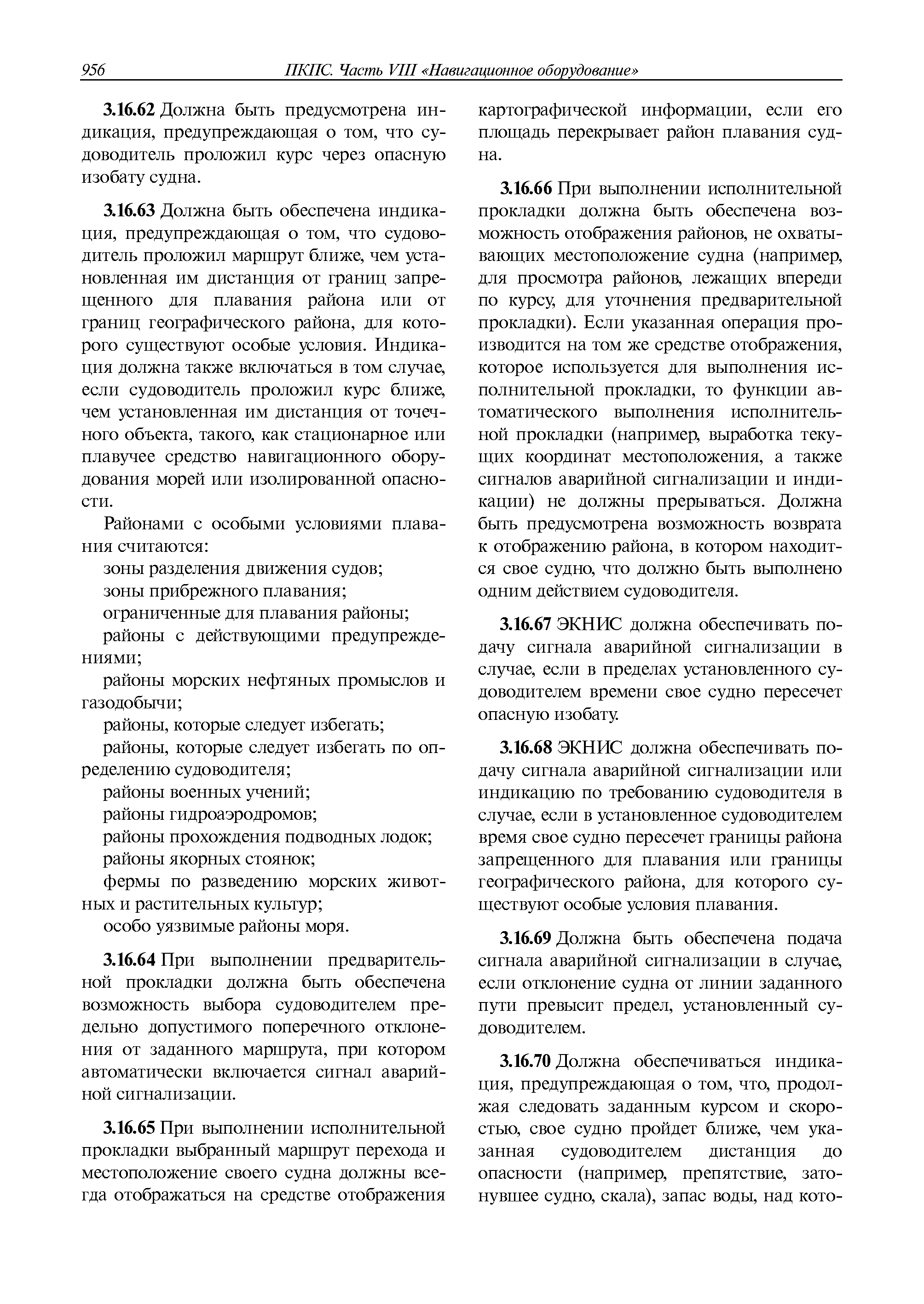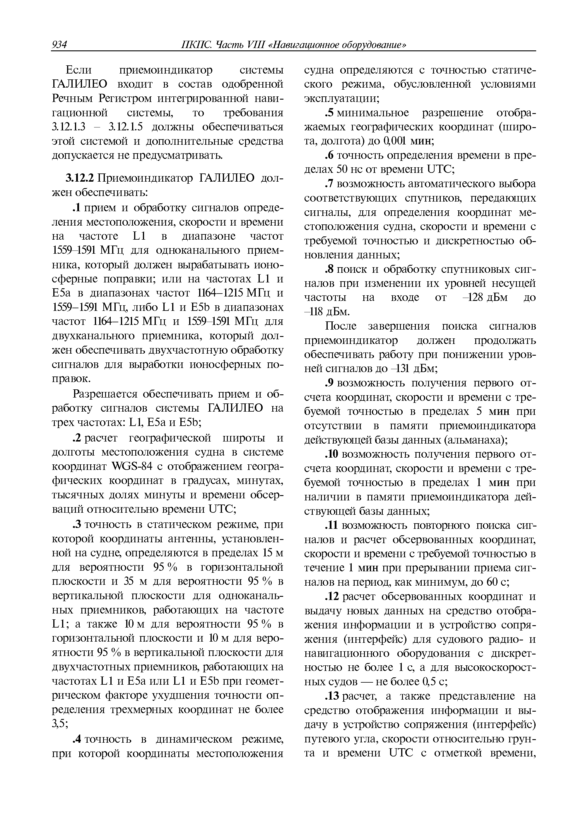 | Оглавление: | 1 Общие требования 1.1 Область распространения 1.2 Термины и их определения 1.3 Состав навигационного оборудования 2 Размещение навигационного оборудования 2.1 Общие требования 2.2 Размещение радиолокационной станции 2.3 Размещение магнитного компаса 2.4 Размещение гирокомпаса 2.5 Размещение авторулевого и стабилизатора курса 2.6 Размещение эхолота 2.7 Размещение лага 2.8 Размещение антенн и приемоиндикаторов систем радионавигации и ГНСС ГЛОНАСС, GРC, ГЛОНАСС/GРC, ГАЛИЛЕО 2.9 Размещение указателя скорости поворота 2.10 Размещение системы отображения электронных навигационных карт и информации (СОЭНКИ) 2.11 Размещение системы управления траекторией судна 2.12 Размещение автоматической идентификационной системы 2.13 Размещение регистратора данных рейса 2.14 Размещение аппаратуры приема внешних звуковых сигналов 2.15 Размещение радиолокационного отражателя 2.16 Размещение интегрированной навигационной системы 3 Требования к навигационному оборудованию 3.1 Общие требования 3.2 Требования к радиолокационной станции 3.3 Требования к магнитному компасу 3.4 Требования к гирокомпасу 3.5 Устройство дистанционной передачи курса 3.6 Требования к авторулевому и стабилизатору курса 3.7 Требования к эхолоту 3.8 Требования к лагу 3.9 Требования к комбинированному приемоиндикатору ГНСС, ГЛОНАСС/GPS 3.10 Требования к приемоиндикатору глобальной навигационной спутниковой системы GPS 3.11 Требования к приемоиндикатору ГЛОНАСС 3.12 Требования к приемоиндикатору навигационной спутниковой системы ГАЛИЛЕО 3.13 Требования к указателю скорости поворота 3.14 Требования к представлению навигационной информации на судовых средствах ее отображения 3.15 Требования к системе отображения электронных навигационных карт и информации 3.16 Требования к электронной картографической навигационно-информационной системе 3.17 Требования к системе управления траекторией судна (СУТС) 3.18 Требования к судовой аппаратуре автоматической идентификационной системы 3.19 Требования к регистратору данных рейса 3.20 Требования к упрощенному регистратору данных рейса 3.21 Требования к радиолокационному отражателю 3.22 Требования к интегрированным навигационным системам 3.23 Требования к аппаратуре приема внешних звуковых сигналов 3.24 Требования к системе сигнализации о несении ходовой вахты 3.25 Требования к оборудованию системы опознавания судов и слежения за ними на дальнем расстоянии 3.26 Требования к электронно-картографической системе 3.27 Требования к приемоиндикатору ГНСС Бейдоу 3.28 Требования к многосистемному радионавигационному приемнику 3.29 Требования к электронному кренометру 3.30 Требования к интегрированным системам рулевой рубки |