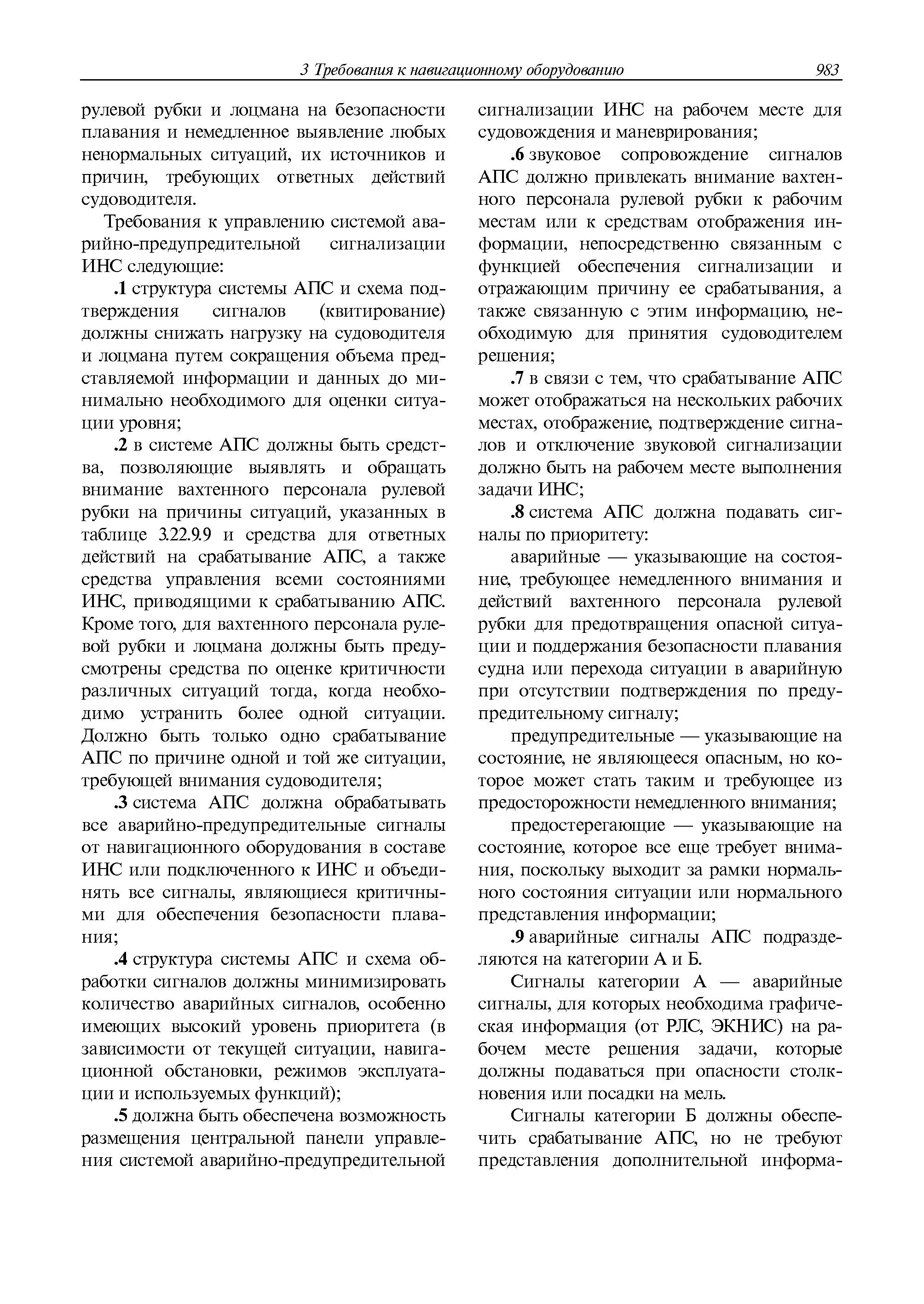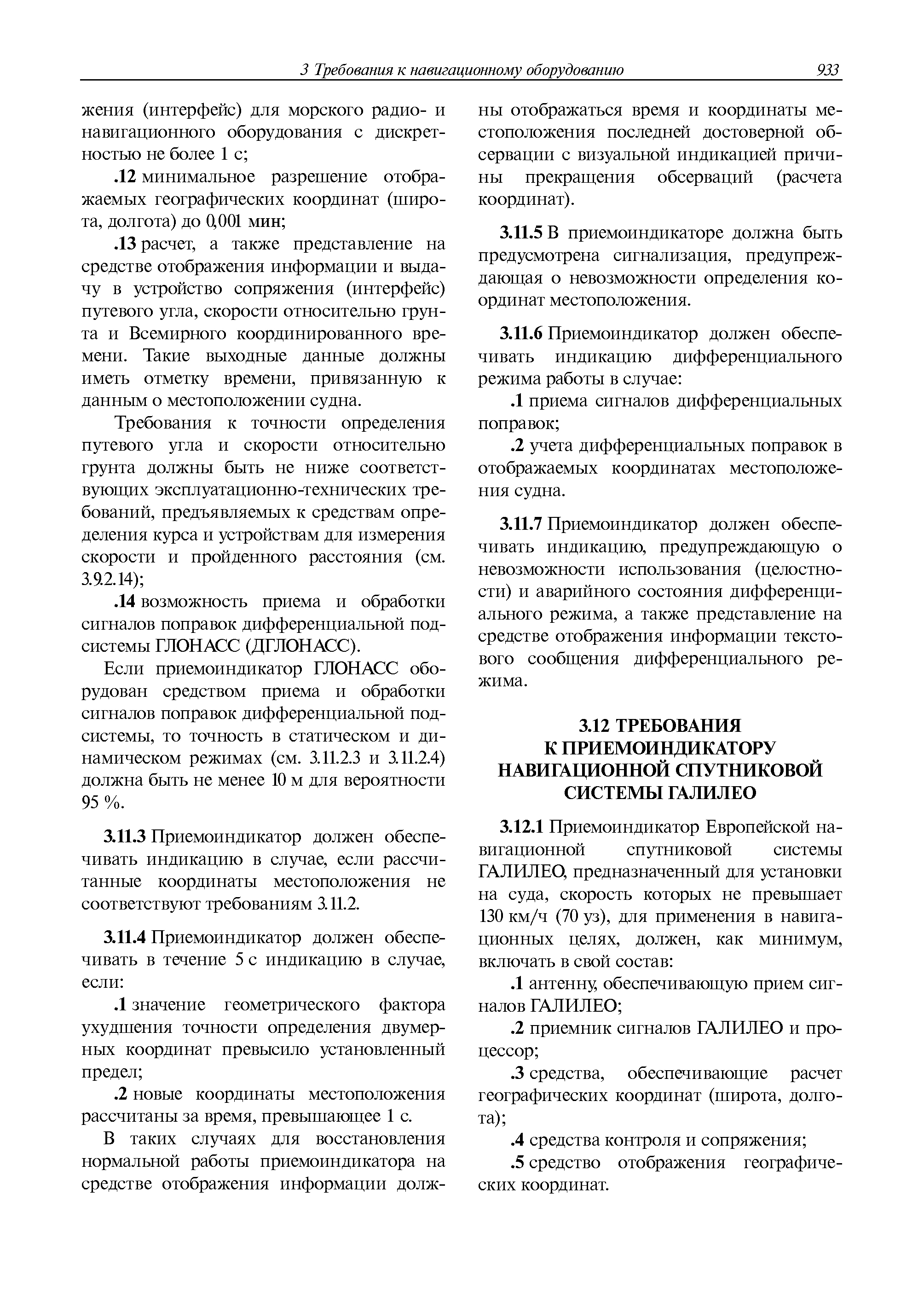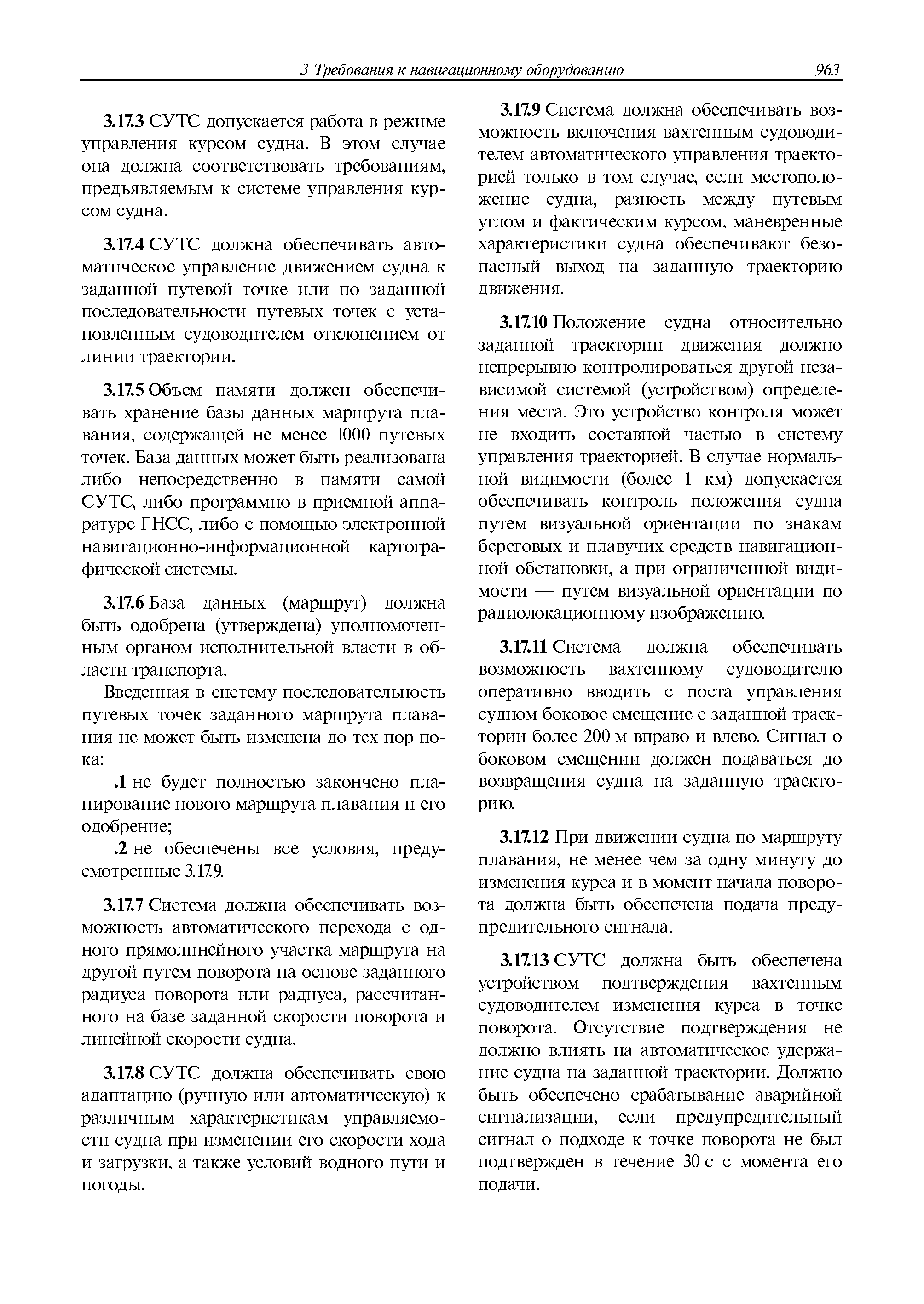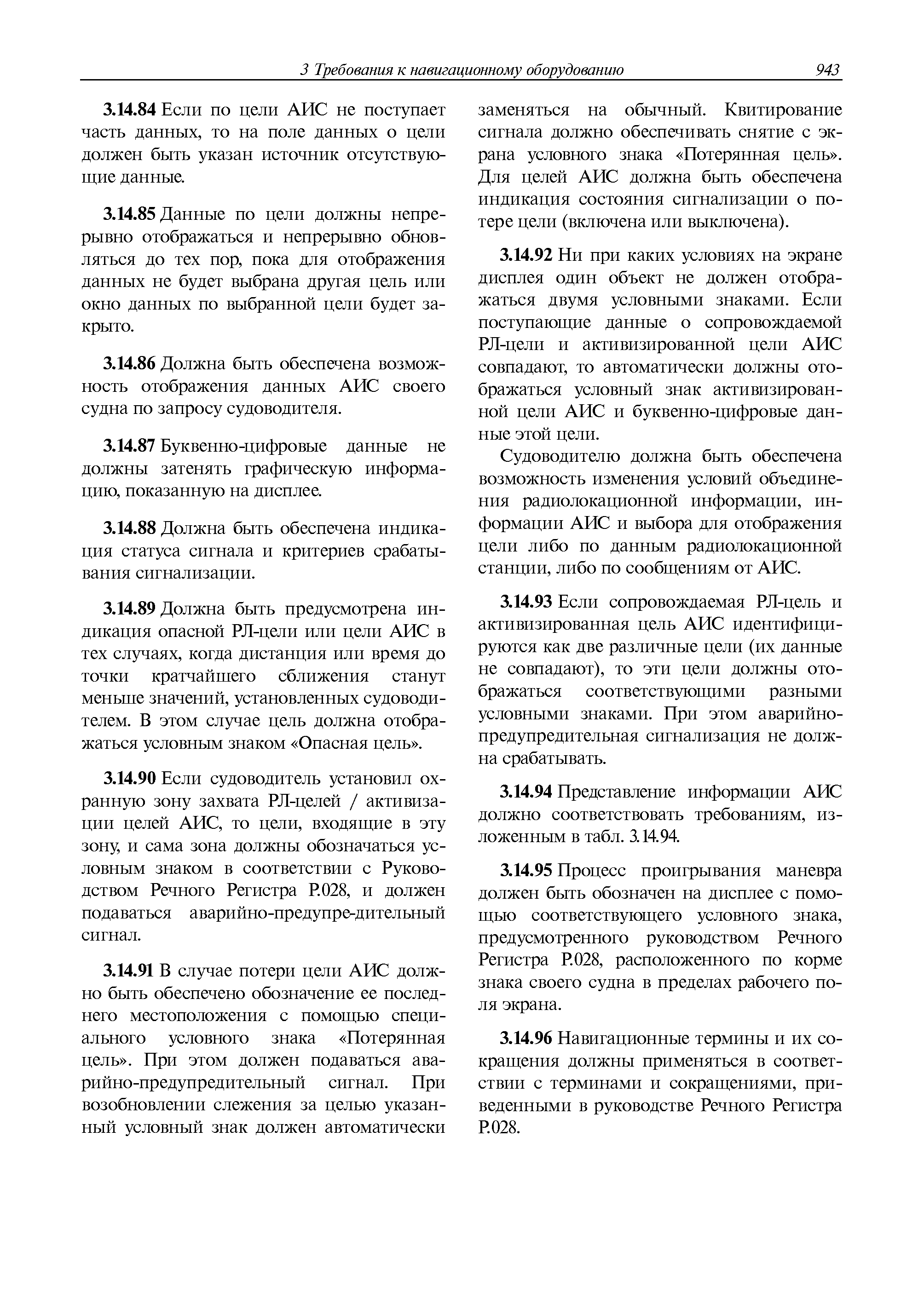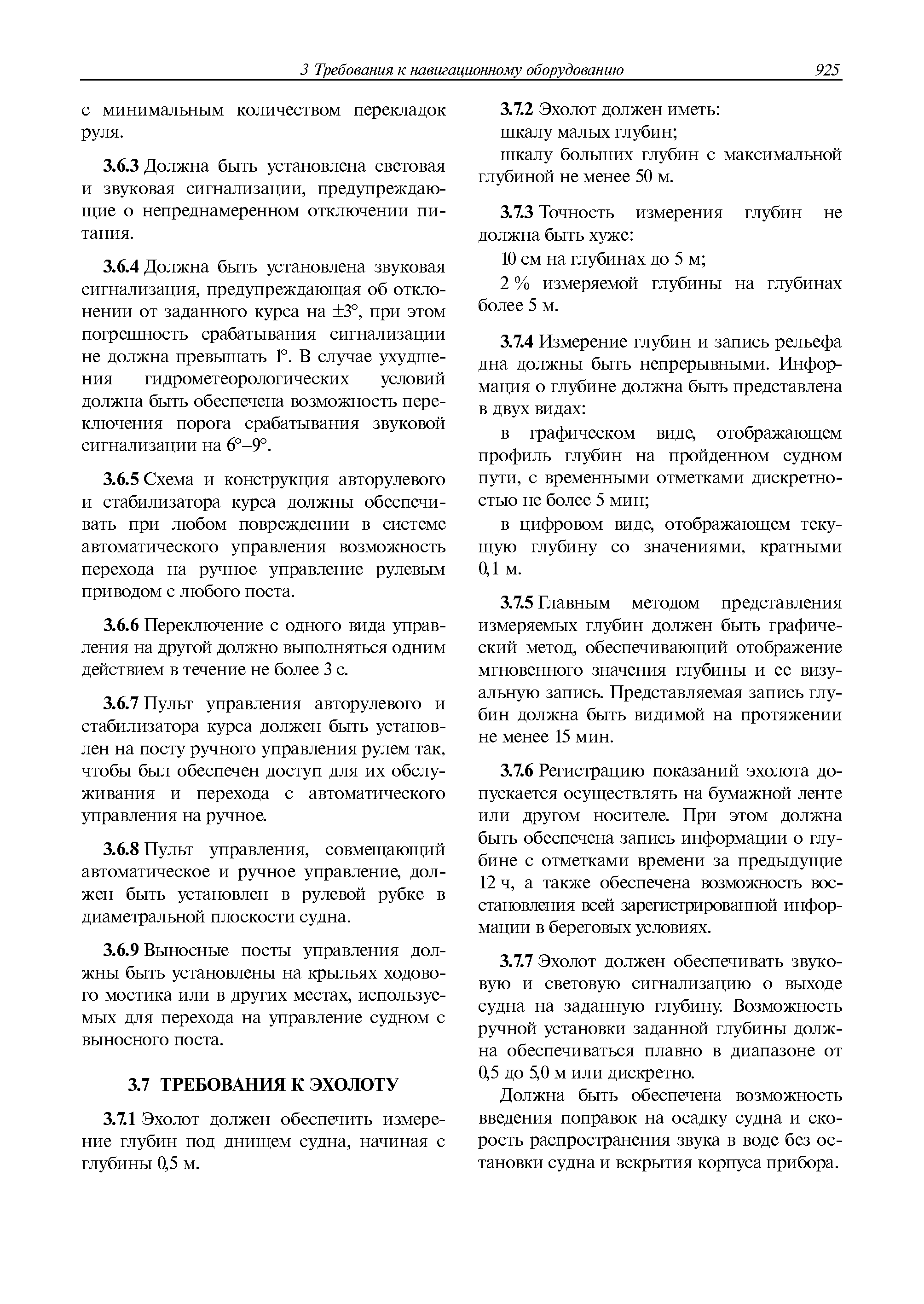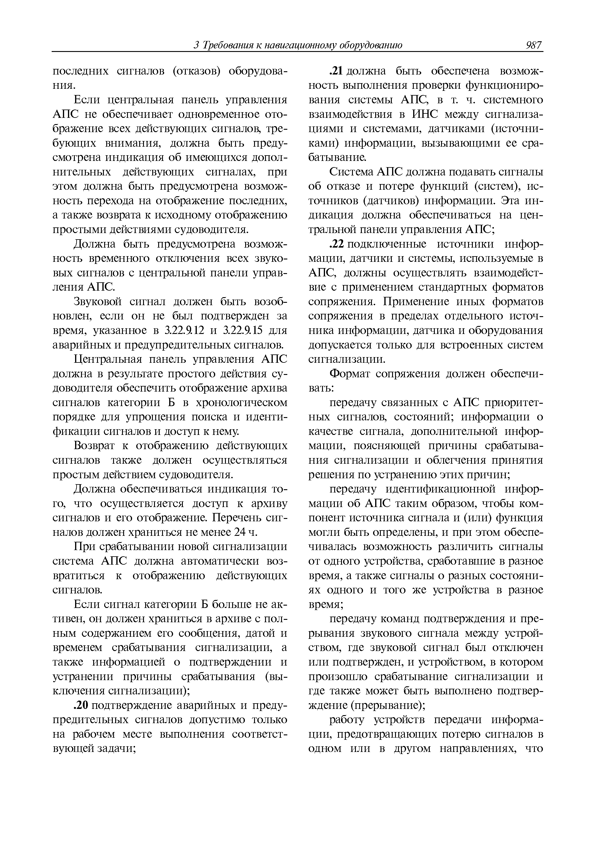 | Оглавление: | 1 Общие требования 1.1 Область распространения 1.2 Термины и их определения 1.3 Состав навигационного оборудования 2 Размещение навигационного оборудования 2.1 Общие требования 2.2 Размещение радиолокационной станции 2.3 Размещение магнитного компаса 2.4 Размещение гирокомпаса 2.5 Размещение авторулевого и стабилизатора курса 2.6 Размещение эхолота 2.7 Размещение лага 2.8 Размещение антенн и приемоиндикаторов систем радионавигации и ГНСС ГЛОНАСС, GРC, ГЛОНАСС/GРC, ГАЛИЛЕО 2.9 Размещение указателя скорости поворота 2.10 Размещение системы отображения электронных навигационных карт и информации (СОЭНКИ) 2.11 Размещение системы управления траекторией судна 2.12 Размещение автоматической идентификационной системы 2.13 Размещение регистратора данных рейса 2.14 Размещение аппаратуры приема внешних звуковых сигналов 2.15 Размещение радиолокационного отражателя 2.16 Размещение интегрированной навигационной системы 3 Требования к навигационному оборудованию 3.1 Общие требования 3.2 Требования к радиолокационной станции 3.3 Требования к магнитному компасу 3.4 Требования к гирокомпасу 3.5 Устройство дистанционной передачи курса 3.6 Требования к авторулевому и стабилизатору курса 3.7 Требования к эхолоту 3.8 Требования к лагу 3.9 Требования к комбинированному приемоиндикатору ГНСС, ГЛОНАСС/GPS 3.10 Требования к приемоиндикатору глобальной навигационной спутниковой системы GPS 3.11 Требования к приемоиндикатору ГЛОНАСС 3.12 Требования к приемоиндикатору навигационной спутниковой системы ГАЛИЛЕО 3.13 Требования к указателю скорости поворота 3.14 Требования к представлению навигационной информации на судовых средствах ее отображения 3.15 Требования к системе отображения электронных навигационных карт и информации 3.16 Требования к электронной картографической навигационно-информационной системе 3.17 Требования к системе управления траекторией судна (СУТС) 3.18 Требования к судовой аппаратуре автоматической идентификационной системы 3.19 Требования к регистратору данных рейса 3.20 Требования к упрощенному регистратору данных рейса 3.21 Требования к радиолокационному отражателю 3.22 Требования к интегрированным навигационным системам 3.23 Требования к аппаратуре приема внешних звуковых сигналов 3.24 Требования к системе сигнализации о несении ходовой вахты 3.25 Требования к оборудованию системы опознавания судов и слежения за ними на дальнем расстоянии 3.26 Требования к электронно-картографической системе 3.27 Требования к приемоиндикатору ГНСС Бейдоу 3.28 Требования к многосистемному радионавигационному приемнику 3.29 Требования к электронному кренометру 3.30 Требования к интегрированным системам рулевой рубки |