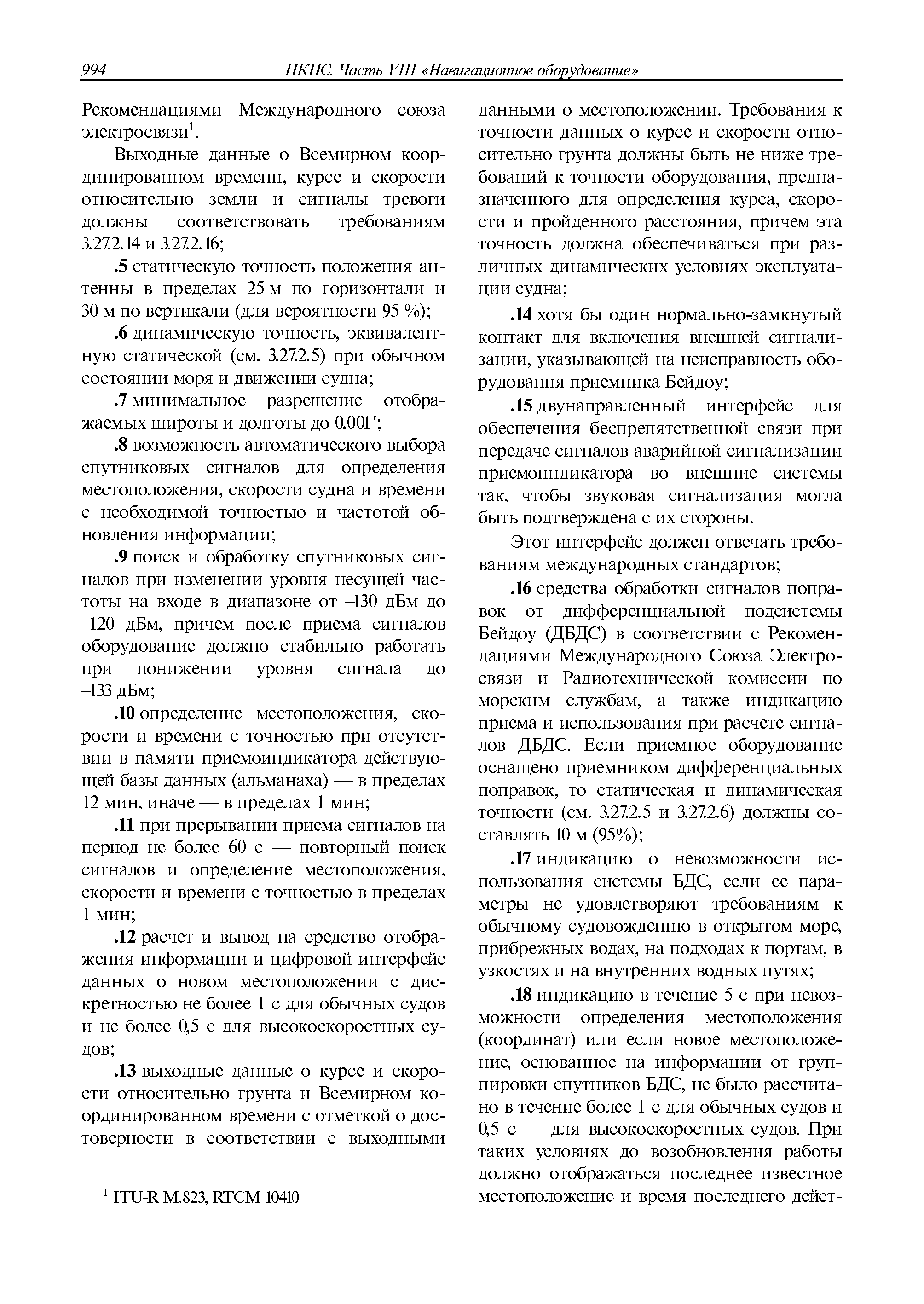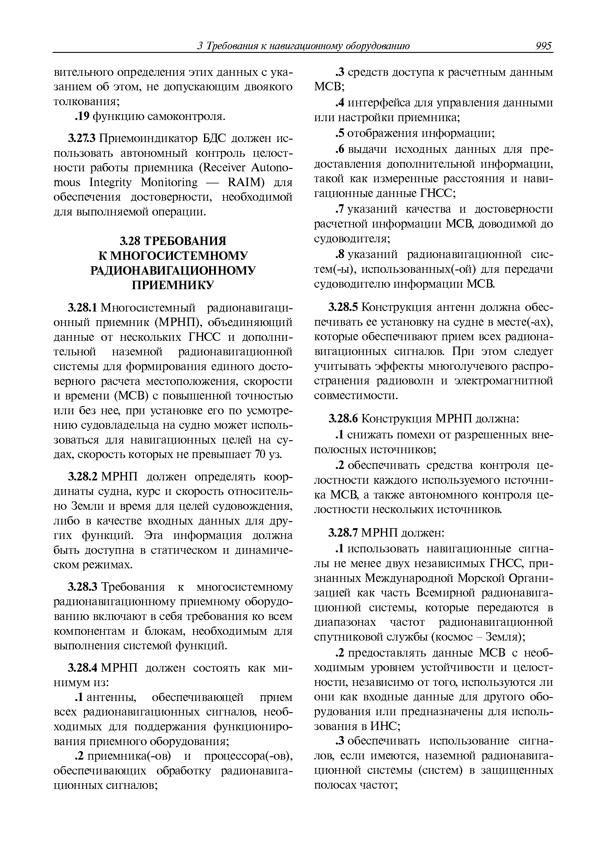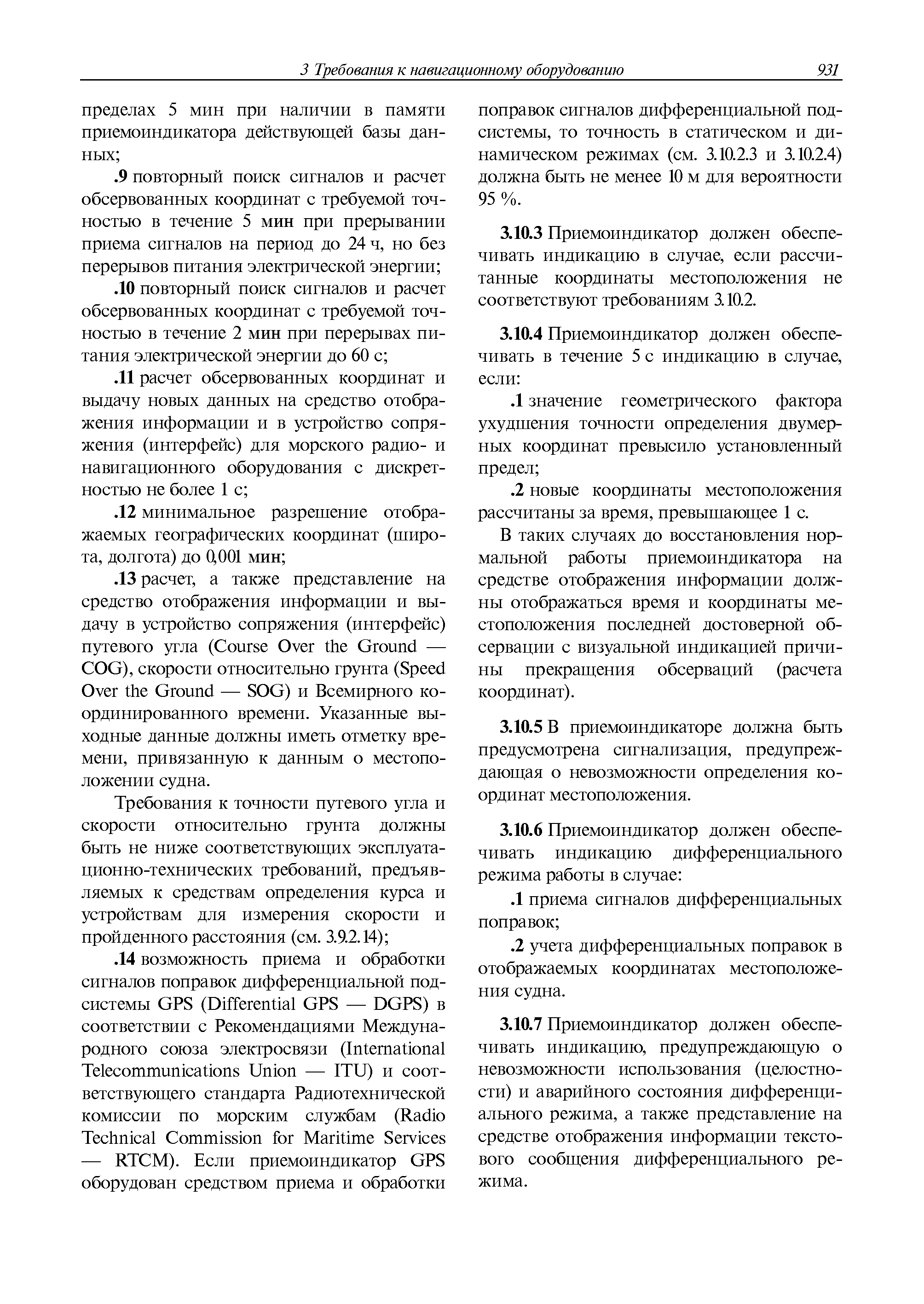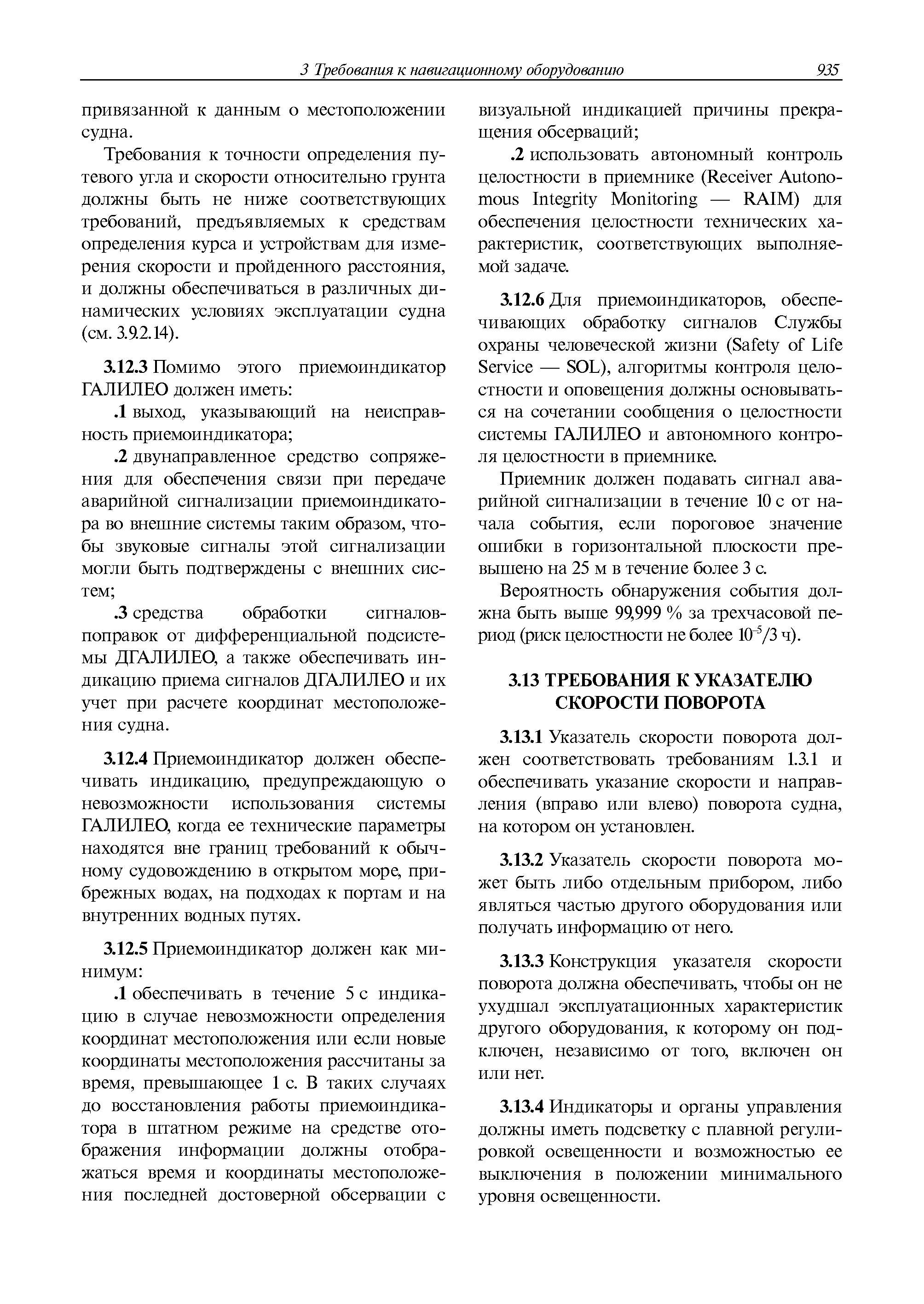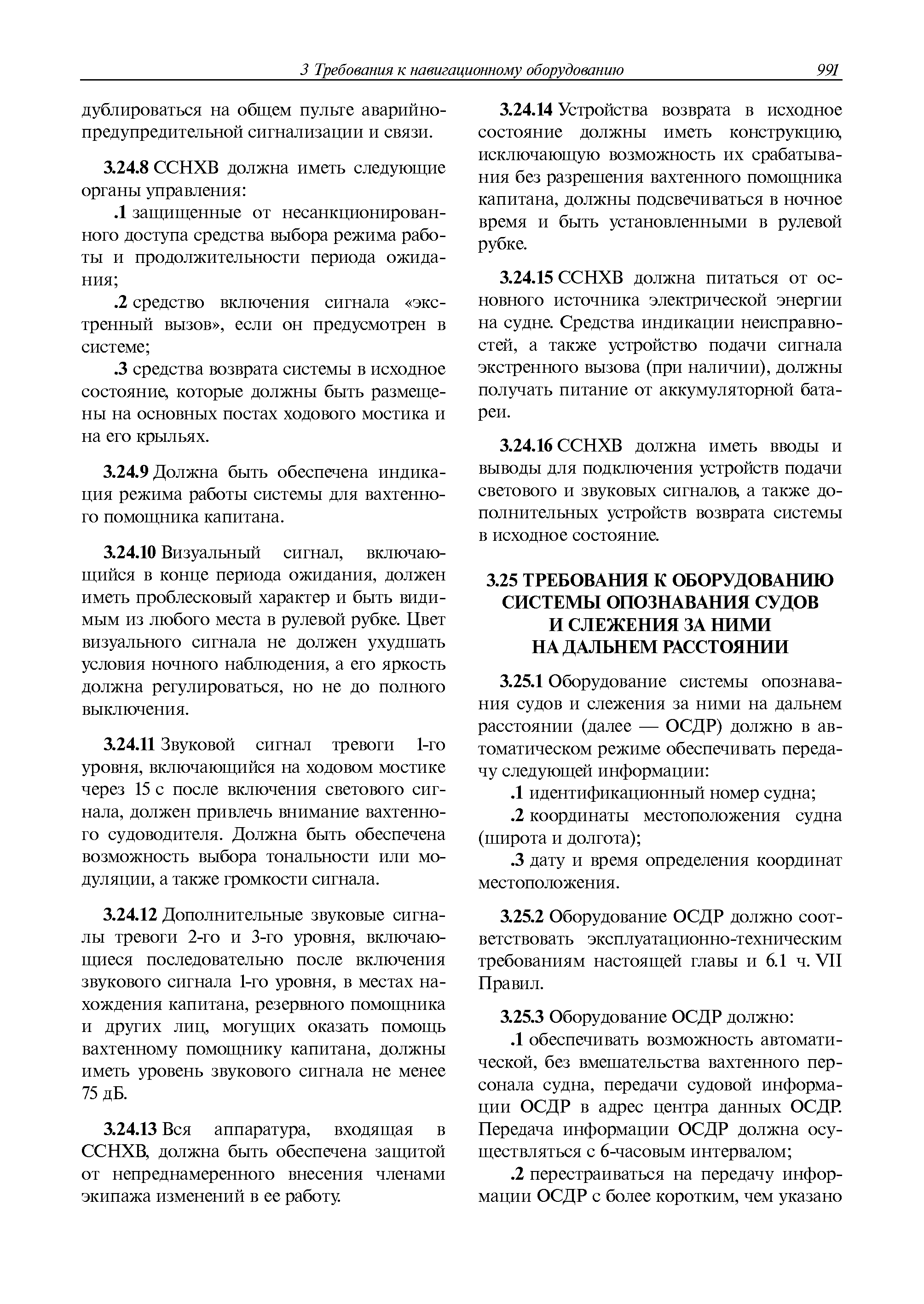 | Оглавление: | 1 Общие требования 1.1 Область распространения 1.2 Термины и их определения 1.3 Состав навигационного оборудования 2 Размещение навигационного оборудования 2.1 Общие требования 2.2 Размещение радиолокационной станции 2.3 Размещение магнитного компаса 2.4 Размещение гирокомпаса 2.5 Размещение авторулевого и стабилизатора курса 2.6 Размещение эхолота 2.7 Размещение лага 2.8 Размещение антенн и приемоиндикаторов систем радионавигации и ГНСС ГЛОНАСС, GРC, ГЛОНАСС/GРC, ГАЛИЛЕО 2.9 Размещение указателя скорости поворота 2.10 Размещение системы отображения электронных навигационных карт и информации (СОЭНКИ) 2.11 Размещение системы управления траекторией судна 2.12 Размещение автоматической идентификационной системы 2.13 Размещение регистратора данных рейса 2.14 Размещение аппаратуры приема внешних звуковых сигналов 2.15 Размещение радиолокационного отражателя 2.16 Размещение интегрированной навигационной системы 3 Требования к навигационному оборудованию 3.1 Общие требования 3.2 Требования к радиолокационной станции 3.3 Требования к магнитному компасу 3.4 Требования к гирокомпасу 3.5 Устройство дистанционной передачи курса 3.6 Требования к авторулевому и стабилизатору курса 3.7 Требования к эхолоту 3.8 Требования к лагу 3.9 Требования к комбинированному приемоиндикатору ГНСС, ГЛОНАСС/GPS 3.10 Требования к приемоиндикатору глобальной навигационной спутниковой системы GPS 3.11 Требования к приемоиндикатору ГЛОНАСС 3.12 Требования к приемоиндикатору навигационной спутниковой системы ГАЛИЛЕО 3.13 Требования к указателю скорости поворота 3.14 Требования к представлению навигационной информации на судовых средствах ее отображения 3.15 Требования к системе отображения электронных навигационных карт и информации 3.16 Требования к электронной картографической навигационно-информационной системе 3.17 Требования к системе управления траекторией судна (СУТС) 3.18 Требования к судовой аппаратуре автоматической идентификационной системы 3.19 Требования к регистратору данных рейса 3.20 Требования к упрощенному регистратору данных рейса 3.21 Требования к радиолокационному отражателю 3.22 Требования к интегрированным навигационным системам 3.23 Требования к аппаратуре приема внешних звуковых сигналов 3.24 Требования к системе сигнализации о несении ходовой вахты 3.25 Требования к оборудованию системы опознавания судов и слежения за ними на дальнем расстоянии 3.26 Требования к электронно-картографической системе 3.27 Требования к приемоиндикатору ГНСС Бейдоу 3.28 Требования к многосистемному радионавигационному приемнику 3.29 Требования к электронному кренометру 3.30 Требования к интегрированным системам рулевой рубки |