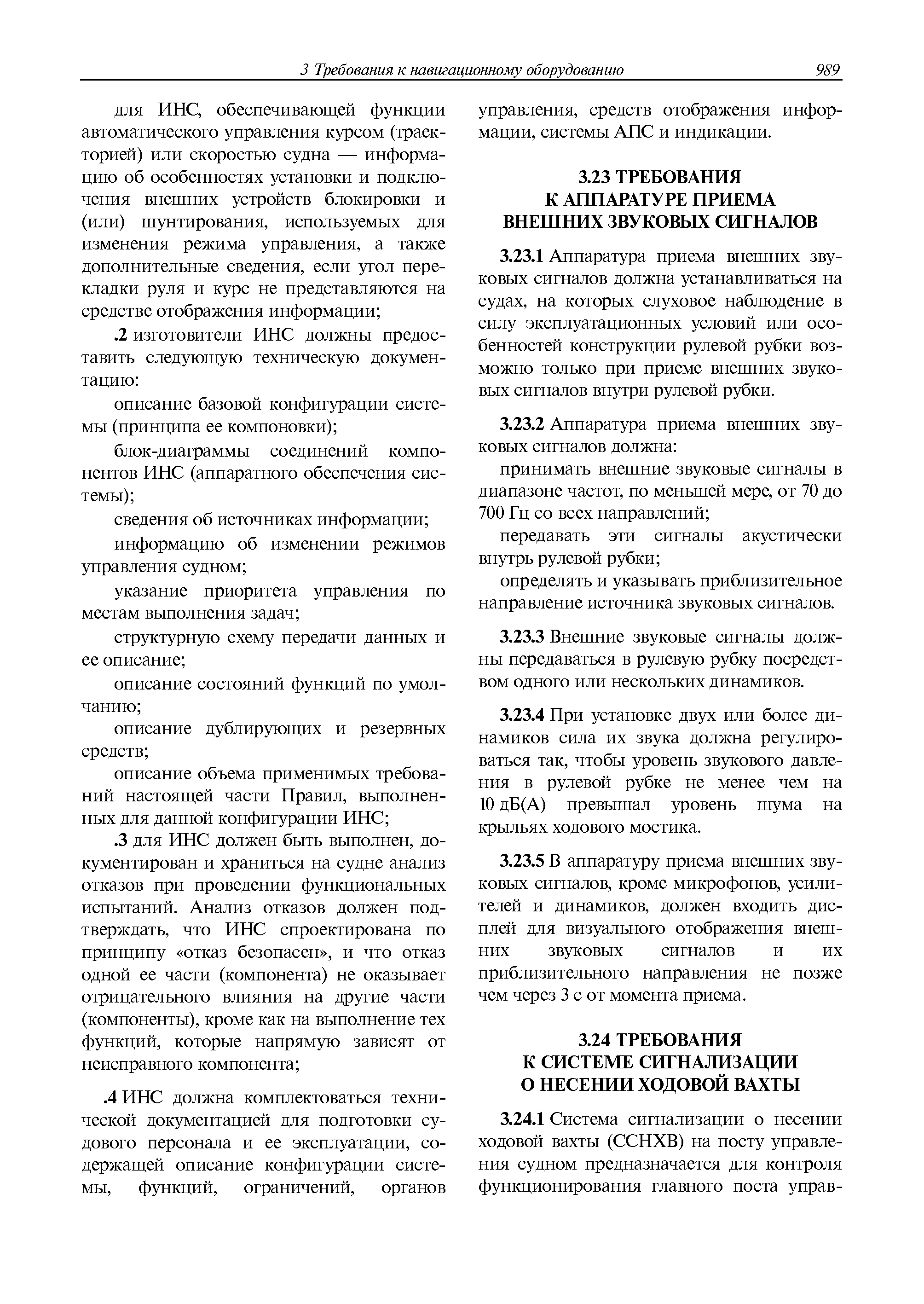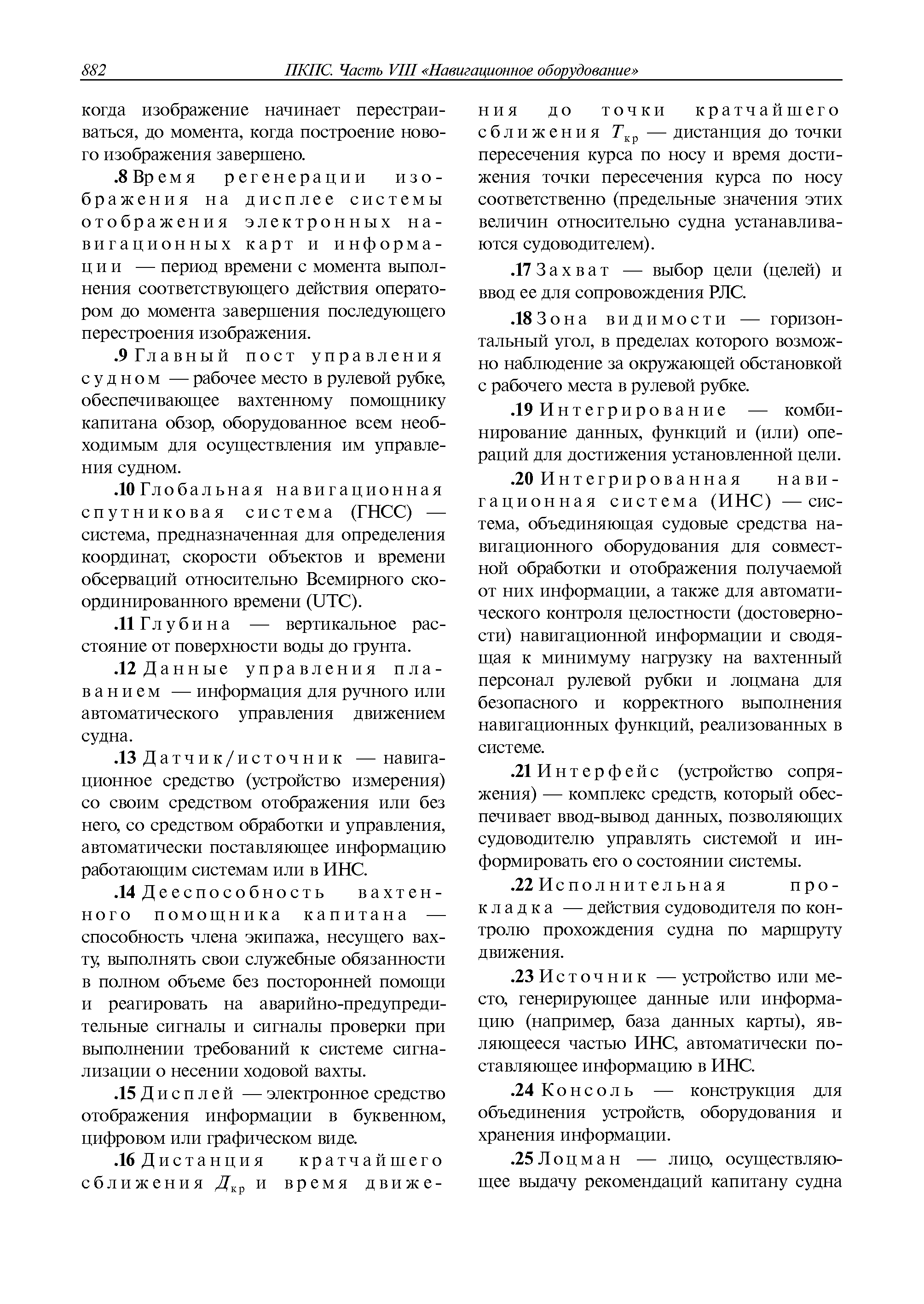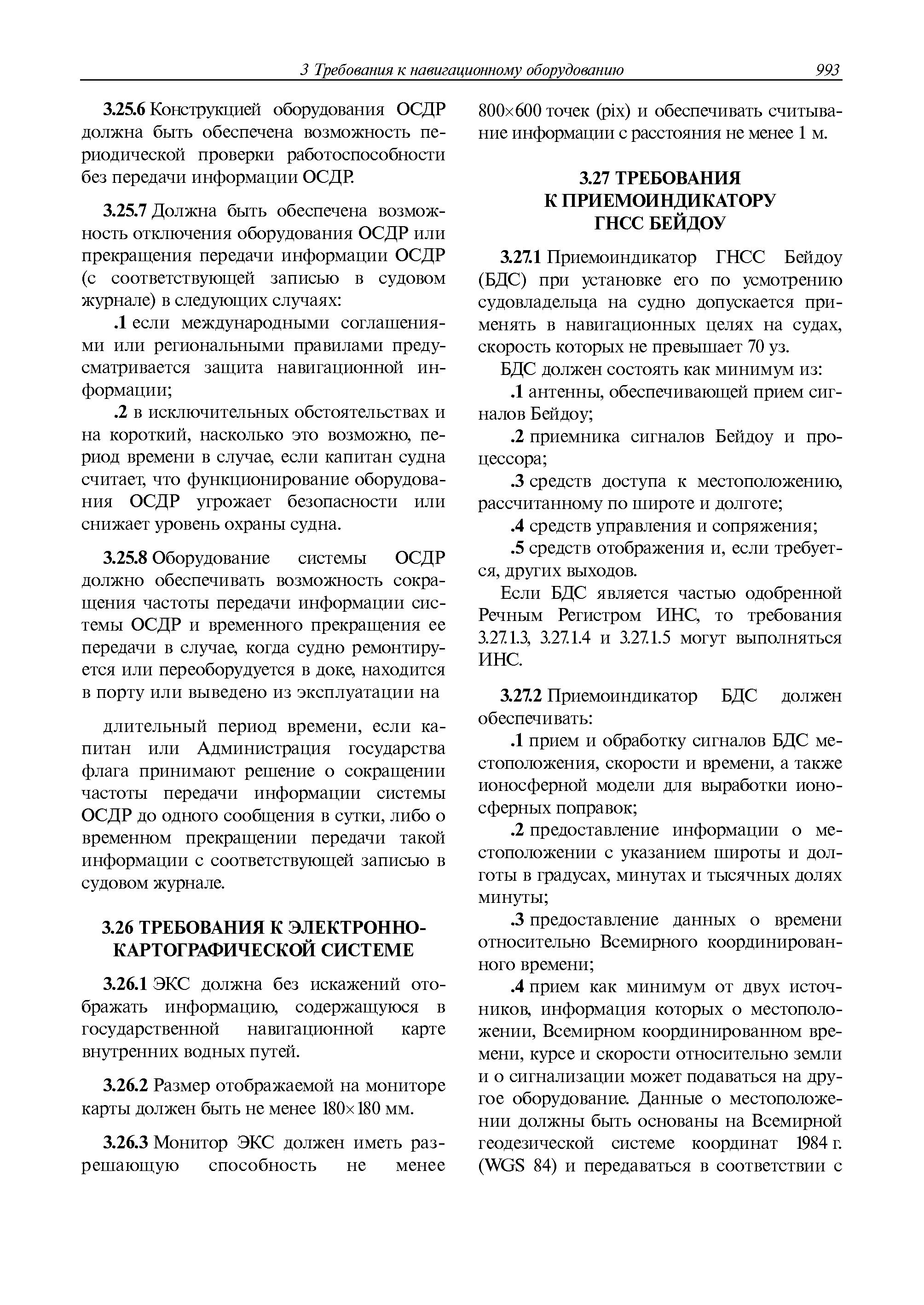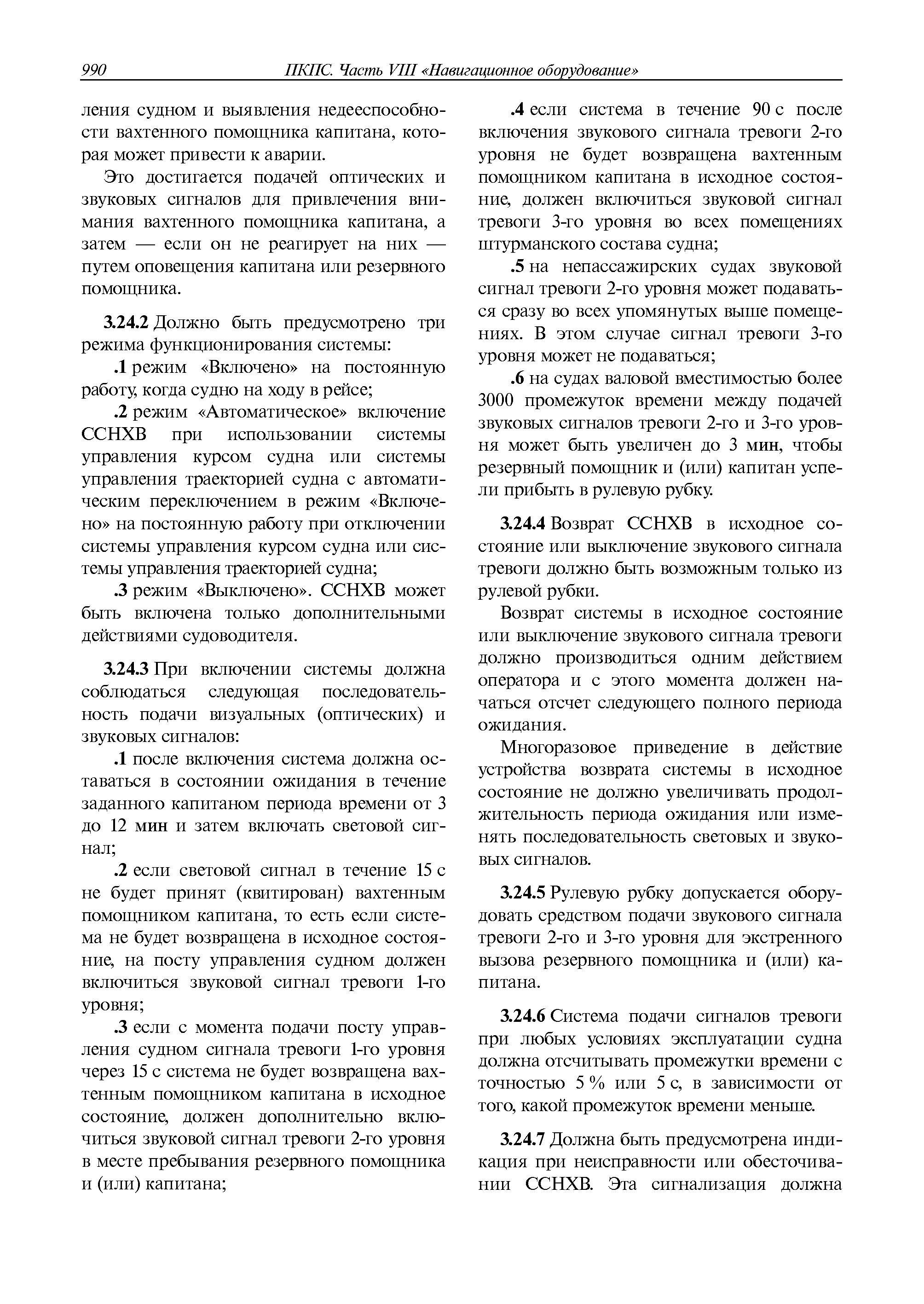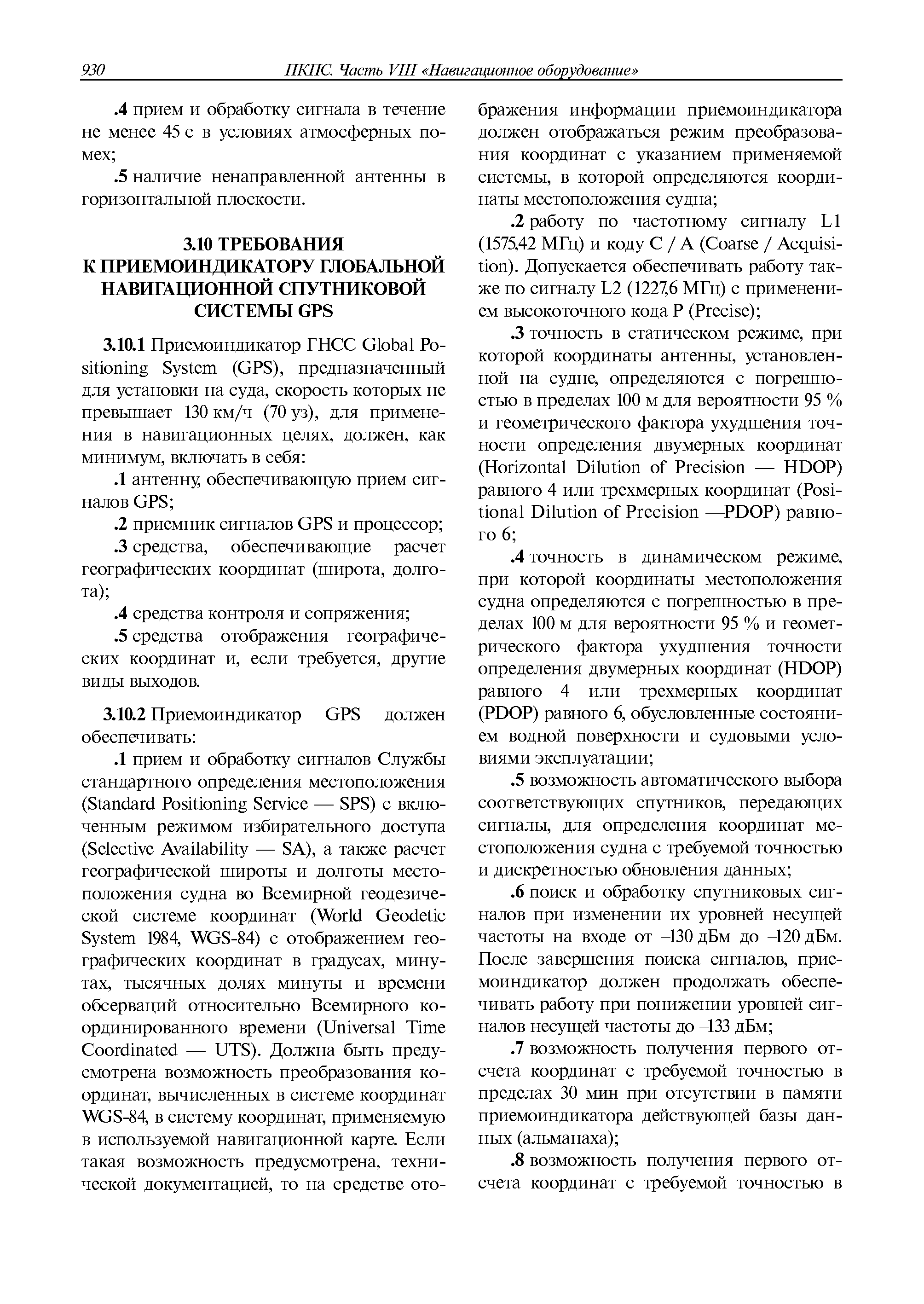 | Оглавление: | 1 Общие требования 1.1 Область распространения 1.2 Термины и их определения 1.3 Состав навигационного оборудования 2 Размещение навигационного оборудования 2.1 Общие требования 2.2 Размещение радиолокационной станции 2.3 Размещение магнитного компаса 2.4 Размещение гирокомпаса 2.5 Размещение авторулевого и стабилизатора курса 2.6 Размещение эхолота 2.7 Размещение лага 2.8 Размещение антенн и приемоиндикаторов систем радионавигации и ГНСС ГЛОНАСС, GРC, ГЛОНАСС/GРC, ГАЛИЛЕО 2.9 Размещение указателя скорости поворота 2.10 Размещение системы отображения электронных навигационных карт и информации (СОЭНКИ) 2.11 Размещение системы управления траекторией судна 2.12 Размещение автоматической идентификационной системы 2.13 Размещение регистратора данных рейса 2.14 Размещение аппаратуры приема внешних звуковых сигналов 2.15 Размещение радиолокационного отражателя 2.16 Размещение интегрированной навигационной системы 3 Требования к навигационному оборудованию 3.1 Общие требования 3.2 Требования к радиолокационной станции 3.3 Требования к магнитному компасу 3.4 Требования к гирокомпасу 3.5 Устройство дистанционной передачи курса 3.6 Требования к авторулевому и стабилизатору курса 3.7 Требования к эхолоту 3.8 Требования к лагу 3.9 Требования к комбинированному приемоиндикатору ГНСС, ГЛОНАСС/GPS 3.10 Требования к приемоиндикатору глобальной навигационной спутниковой системы GPS 3.11 Требования к приемоиндикатору ГЛОНАСС 3.12 Требования к приемоиндикатору навигационной спутниковой системы ГАЛИЛЕО 3.13 Требования к указателю скорости поворота 3.14 Требования к представлению навигационной информации на судовых средствах ее отображения 3.15 Требования к системе отображения электронных навигационных карт и информации 3.16 Требования к электронной картографической навигационно-информационной системе 3.17 Требования к системе управления траекторией судна (СУТС) 3.18 Требования к судовой аппаратуре автоматической идентификационной системы 3.19 Требования к регистратору данных рейса 3.20 Требования к упрощенному регистратору данных рейса 3.21 Требования к радиолокационному отражателю 3.22 Требования к интегрированным навигационным системам 3.23 Требования к аппаратуре приема внешних звуковых сигналов 3.24 Требования к системе сигнализации о несении ходовой вахты 3.25 Требования к оборудованию системы опознавания судов и слежения за ними на дальнем расстоянии 3.26 Требования к электронно-картографической системе 3.27 Требования к приемоиндикатору ГНСС Бейдоу 3.28 Требования к многосистемному радионавигационному приемнику 3.29 Требования к электронному кренометру 3.30 Требования к интегрированным системам рулевой рубки |