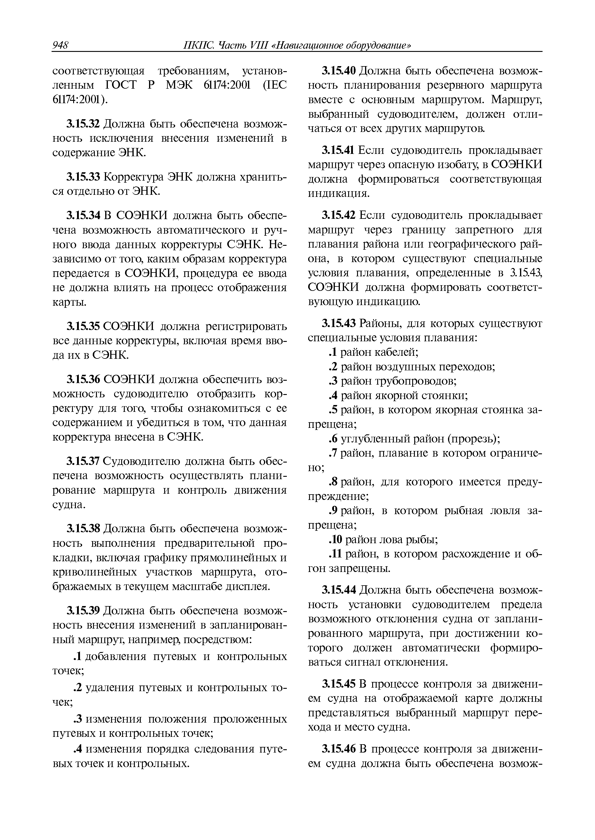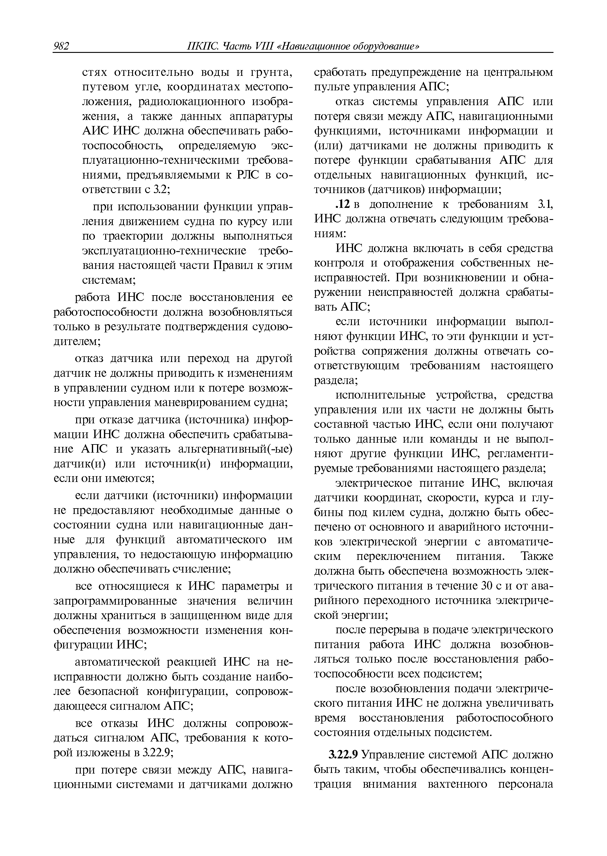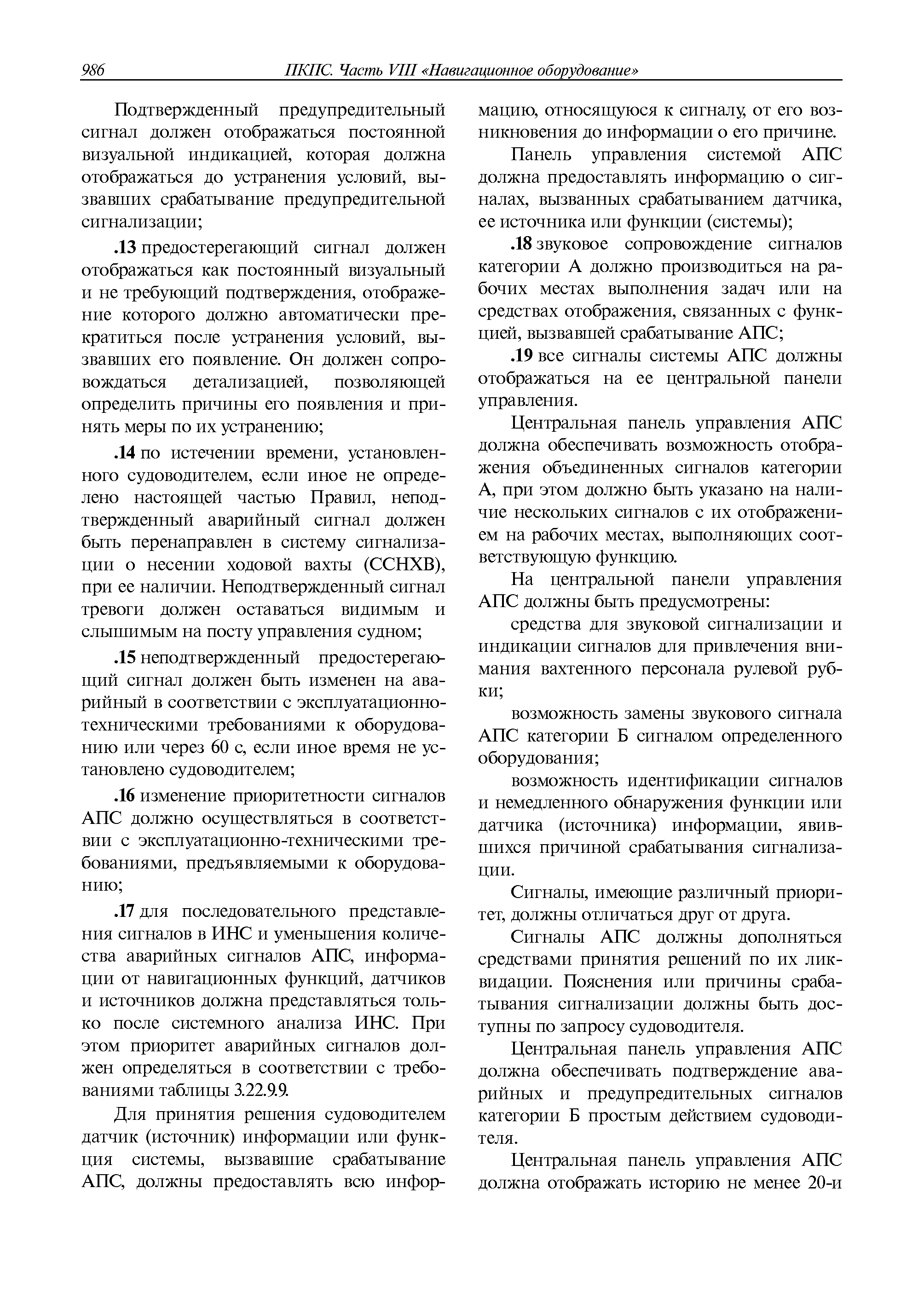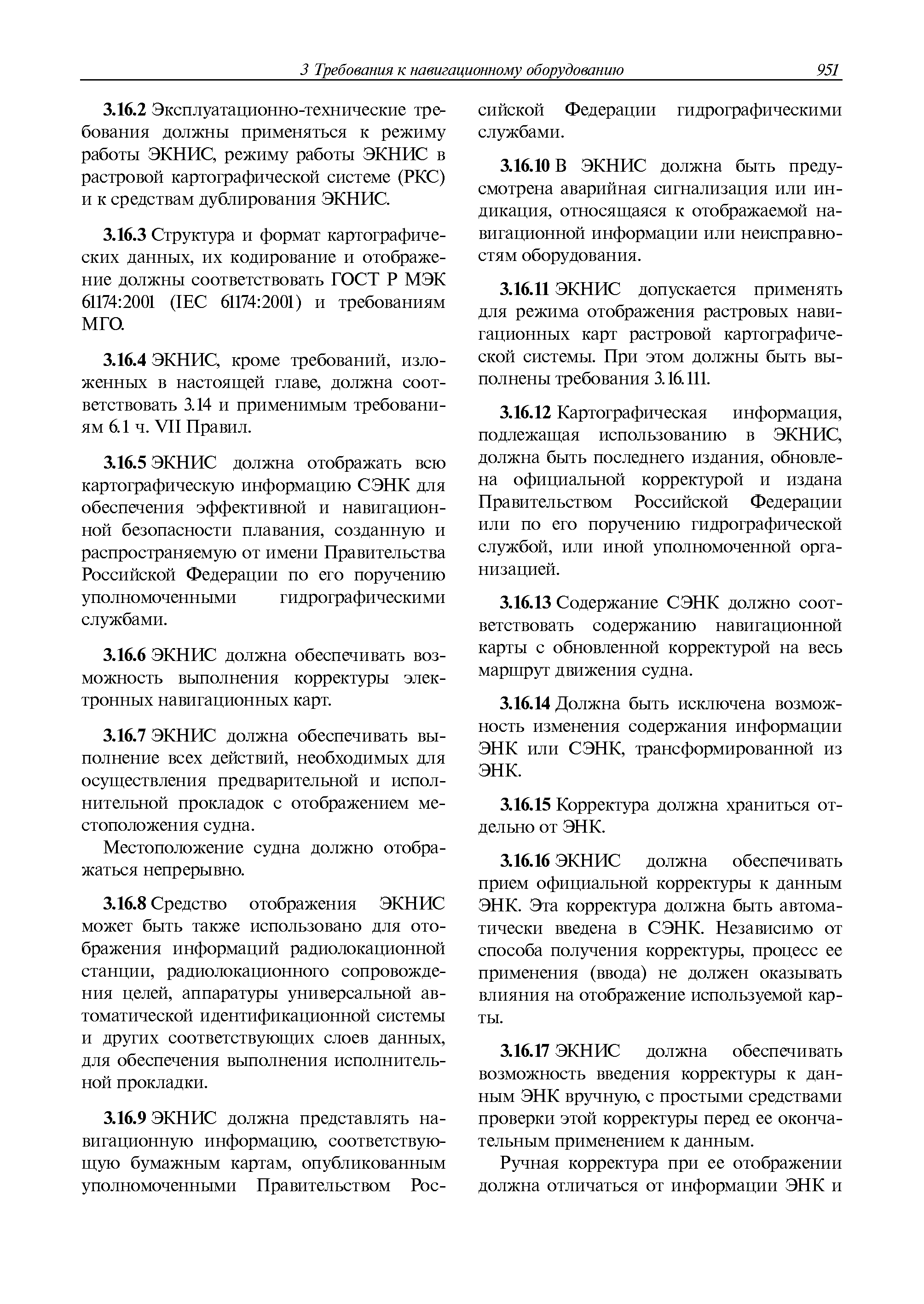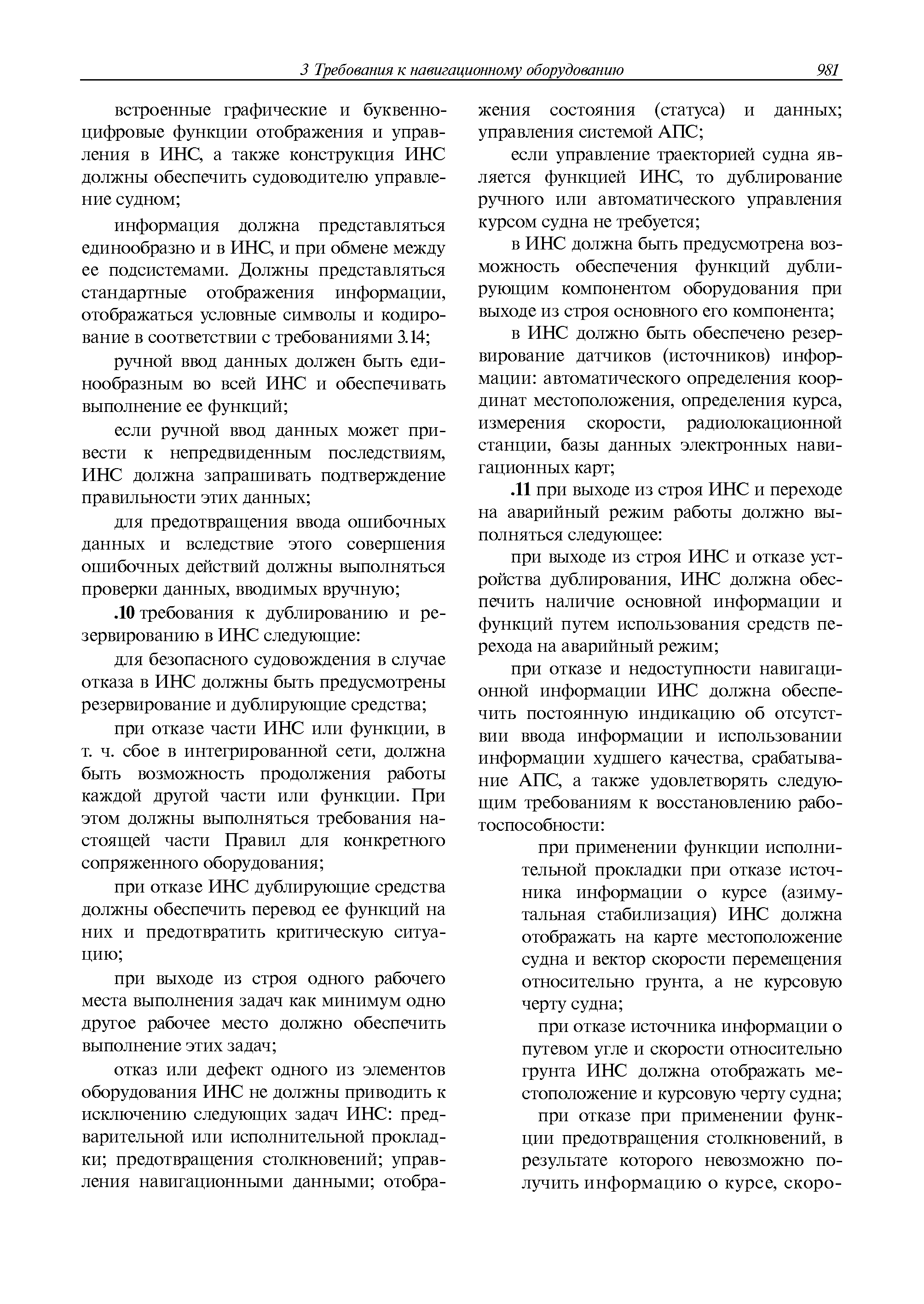 | Оглавление: | 1 Общие требования 1.1 Область распространения 1.2 Термины и их определения 1.3 Состав навигационного оборудования 2 Размещение навигационного оборудования 2.1 Общие требования 2.2 Размещение радиолокационной станции 2.3 Размещение магнитного компаса 2.4 Размещение гирокомпаса 2.5 Размещение авторулевого и стабилизатора курса 2.6 Размещение эхолота 2.7 Размещение лага 2.8 Размещение антенн и приемоиндикаторов систем радионавигации и ГНСС ГЛОНАСС, GРC, ГЛОНАСС/GРC, ГАЛИЛЕО 2.9 Размещение указателя скорости поворота 2.10 Размещение системы отображения электронных навигационных карт и информации (СОЭНКИ) 2.11 Размещение системы управления траекторией судна 2.12 Размещение автоматической идентификационной системы 2.13 Размещение регистратора данных рейса 2.14 Размещение аппаратуры приема внешних звуковых сигналов 2.15 Размещение радиолокационного отражателя 2.16 Размещение интегрированной навигационной системы 3 Требования к навигационному оборудованию 3.1 Общие требования 3.2 Требования к радиолокационной станции 3.3 Требования к магнитному компасу 3.4 Требования к гирокомпасу 3.5 Устройство дистанционной передачи курса 3.6 Требования к авторулевому и стабилизатору курса 3.7 Требования к эхолоту 3.8 Требования к лагу 3.9 Требования к комбинированному приемоиндикатору ГНСС, ГЛОНАСС/GPS 3.10 Требования к приемоиндикатору глобальной навигационной спутниковой системы GPS 3.11 Требования к приемоиндикатору ГЛОНАСС 3.12 Требования к приемоиндикатору навигационной спутниковой системы ГАЛИЛЕО 3.13 Требования к указателю скорости поворота 3.14 Требования к представлению навигационной информации на судовых средствах ее отображения 3.15 Требования к системе отображения электронных навигационных карт и информации 3.16 Требования к электронной картографической навигационно-информационной системе 3.17 Требования к системе управления траекторией судна (СУТС) 3.18 Требования к судовой аппаратуре автоматической идентификационной системы 3.19 Требования к регистратору данных рейса 3.20 Требования к упрощенному регистратору данных рейса 3.21 Требования к радиолокационному отражателю 3.22 Требования к интегрированным навигационным системам 3.23 Требования к аппаратуре приема внешних звуковых сигналов 3.24 Требования к системе сигнализации о несении ходовой вахты 3.25 Требования к оборудованию системы опознавания судов и слежения за ними на дальнем расстоянии 3.26 Требования к электронно-картографической системе 3.27 Требования к приемоиндикатору ГНСС Бейдоу 3.28 Требования к многосистемному радионавигационному приемнику 3.29 Требования к электронному кренометру 3.30 Требования к интегрированным системам рулевой рубки |
