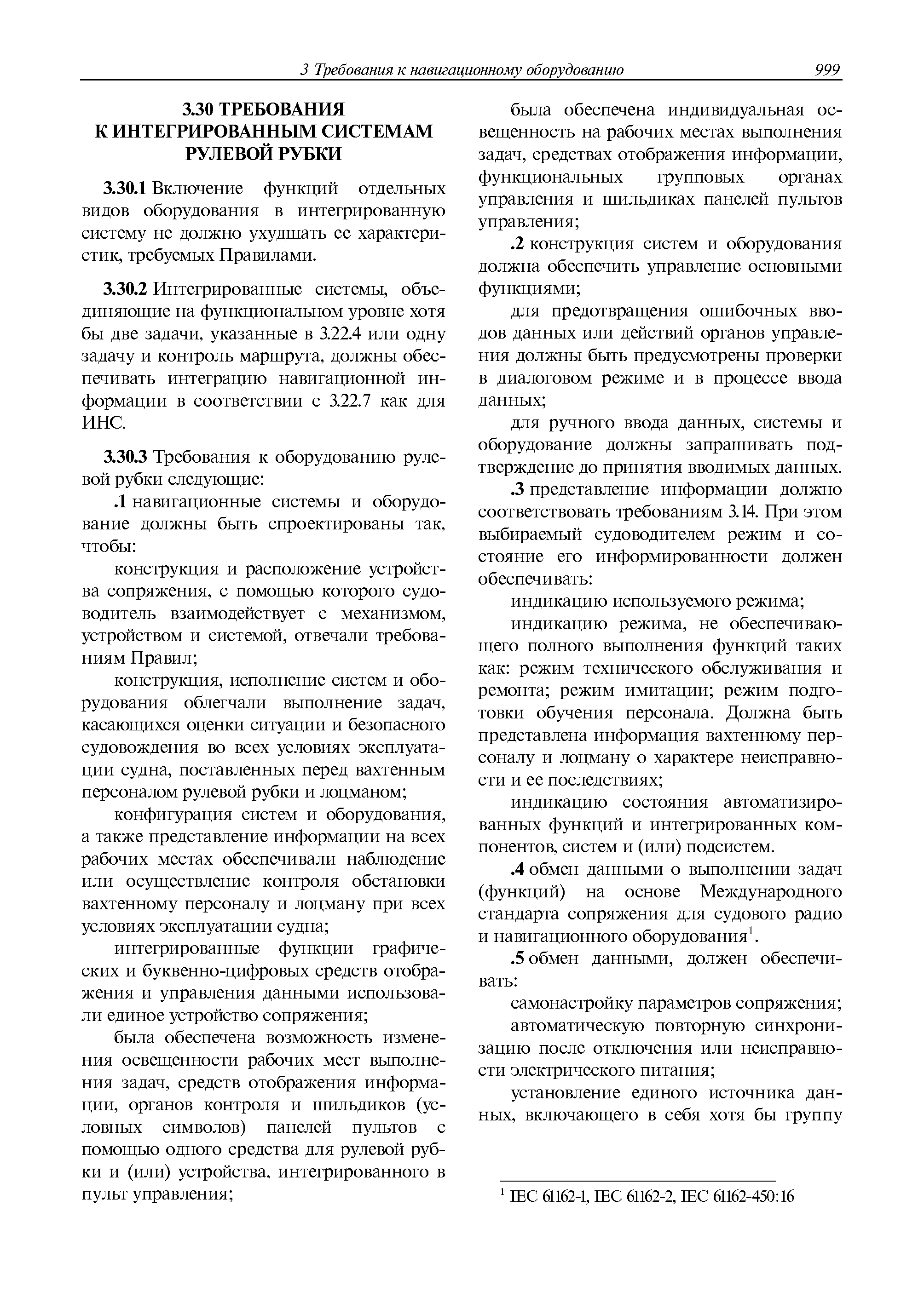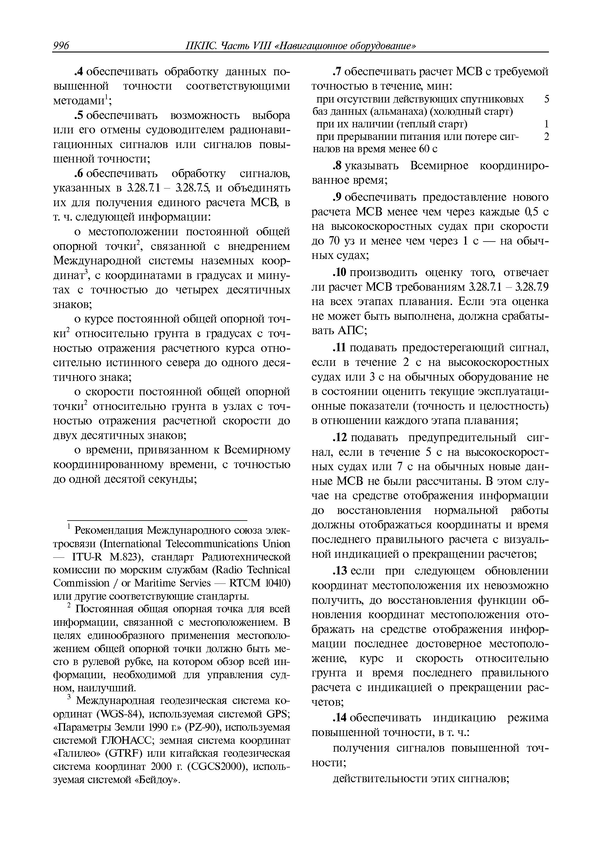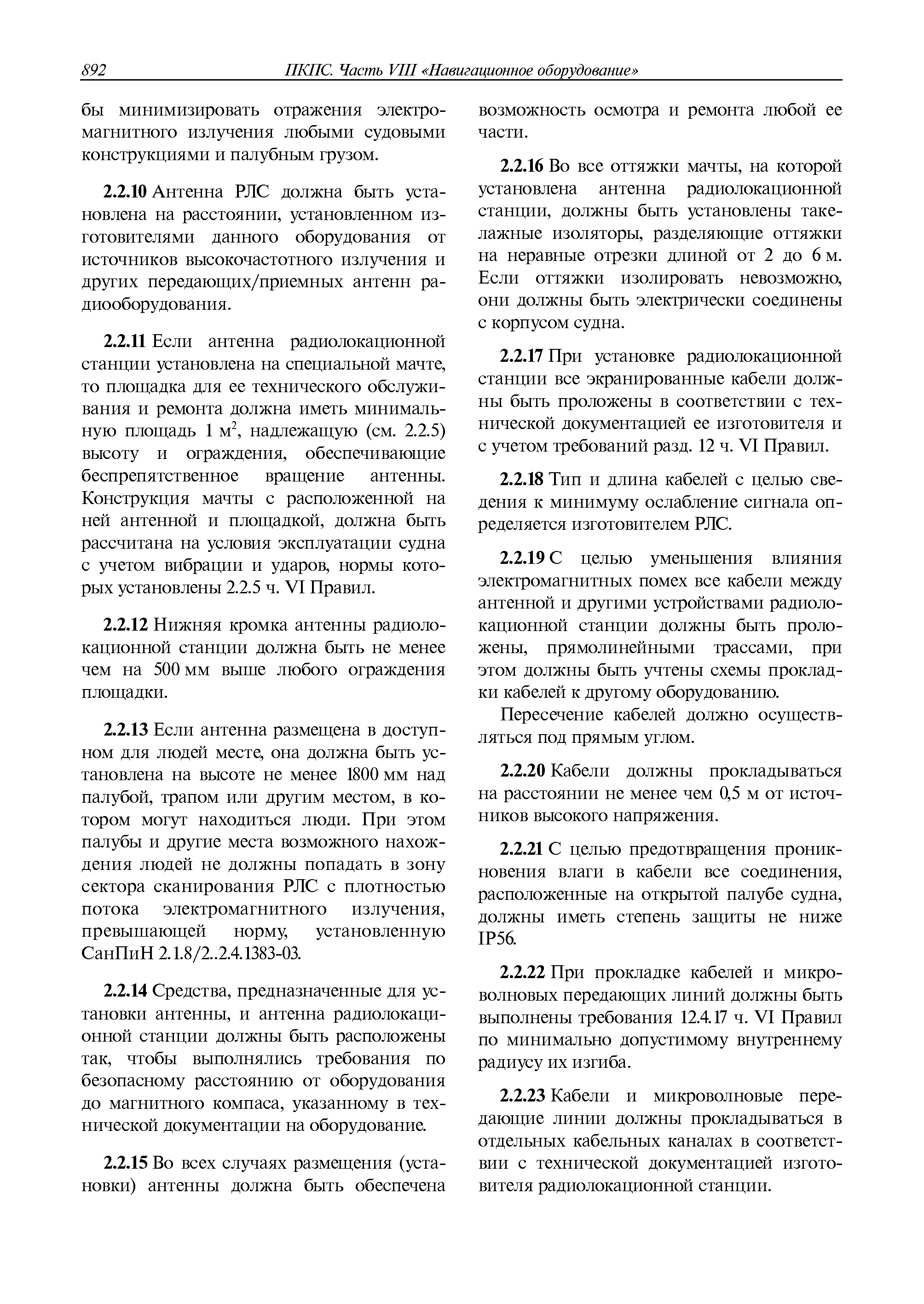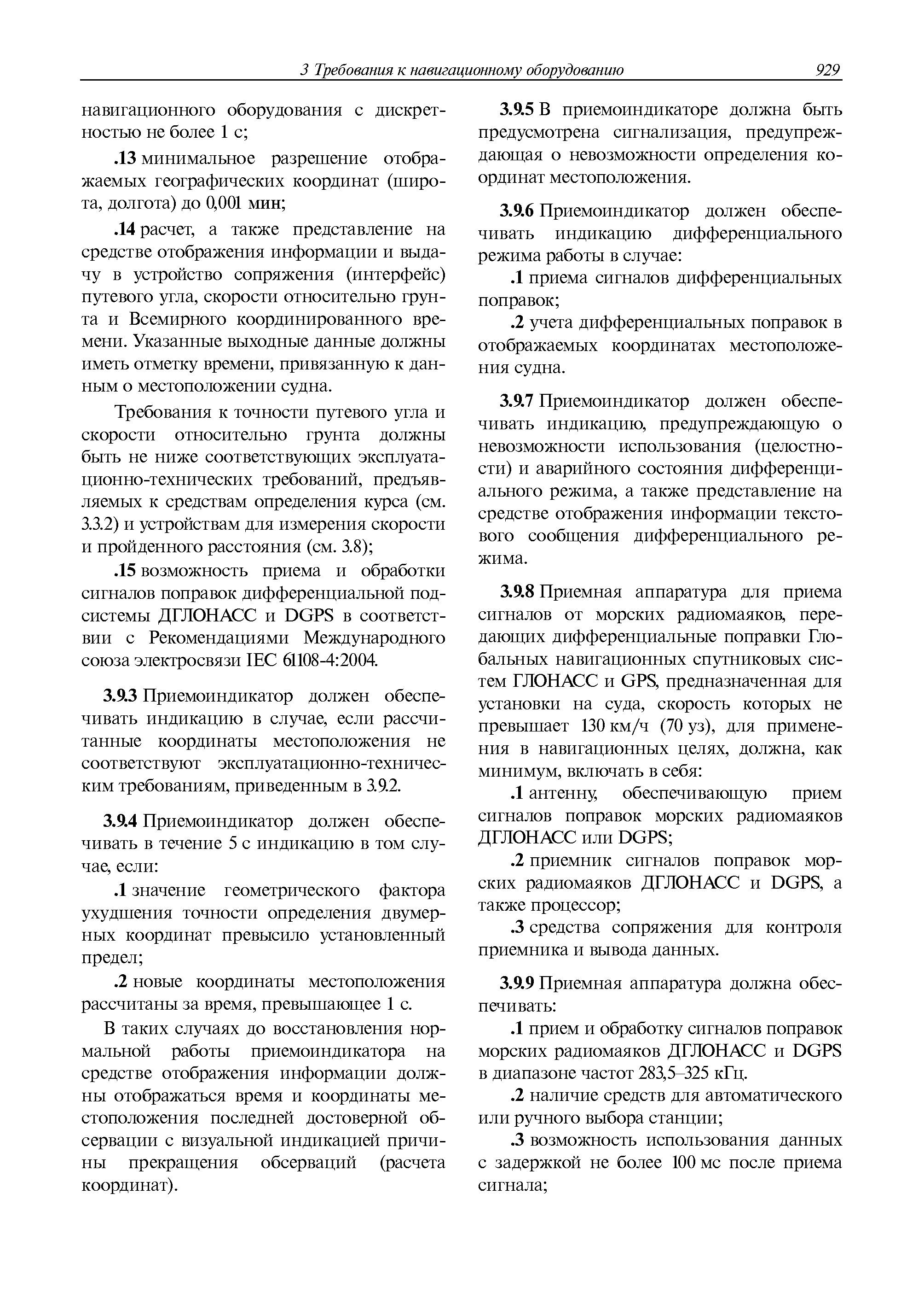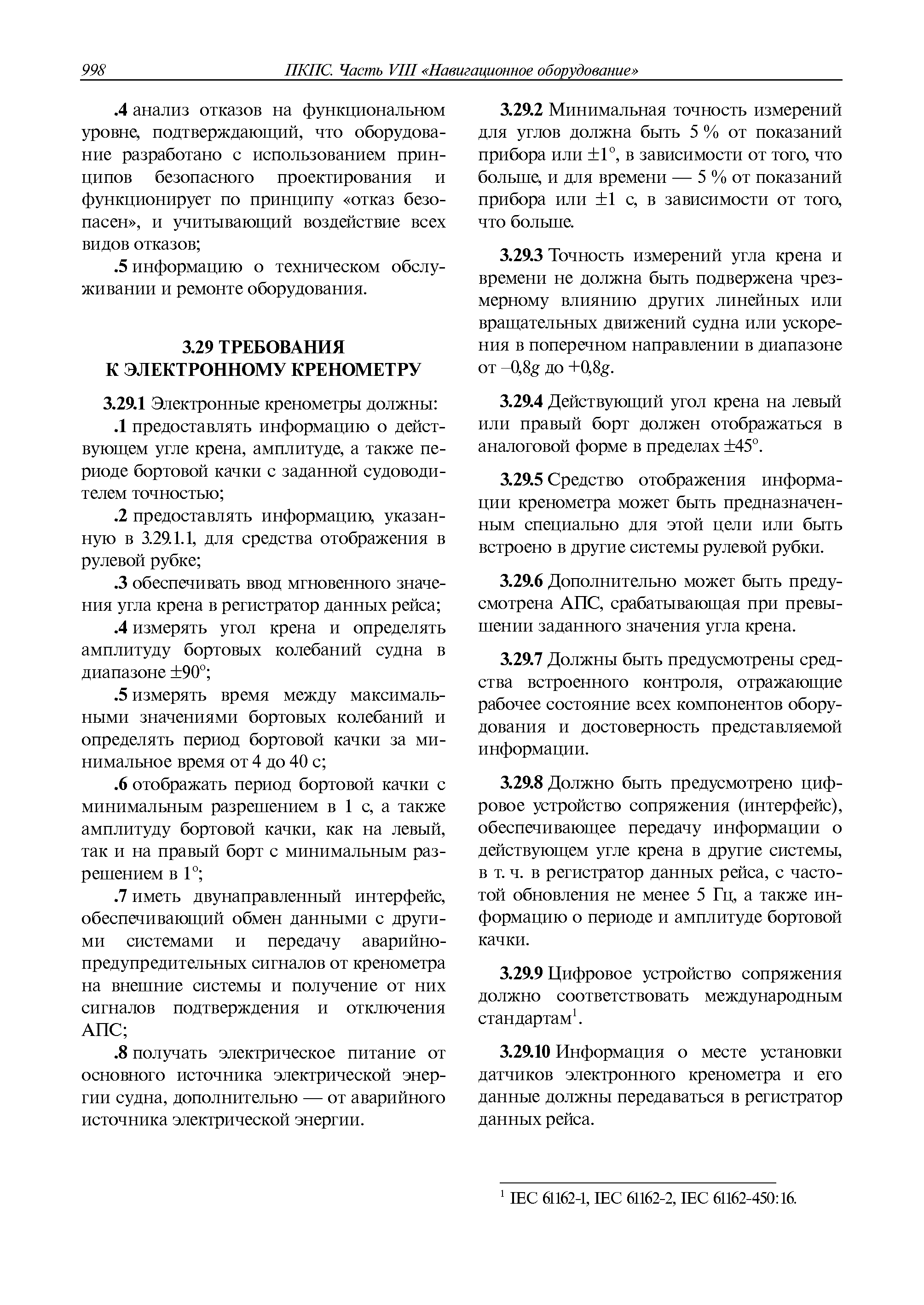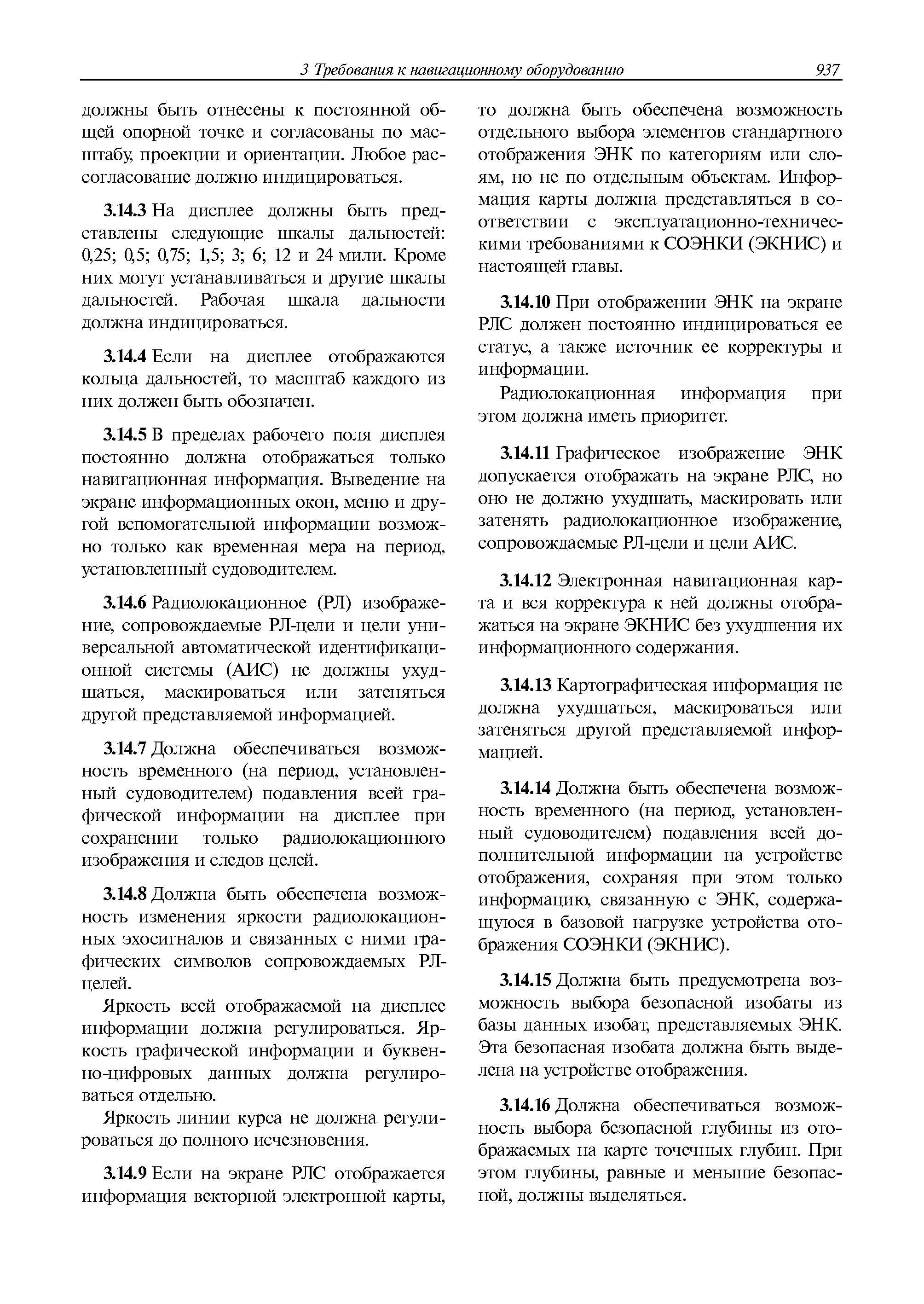 | Оглавление: | 1 Общие требования 1.1 Область распространения 1.2 Термины и их определения 1.3 Состав навигационного оборудования 2 Размещение навигационного оборудования 2.1 Общие требования 2.2 Размещение радиолокационной станции 2.3 Размещение магнитного компаса 2.4 Размещение гирокомпаса 2.5 Размещение авторулевого и стабилизатора курса 2.6 Размещение эхолота 2.7 Размещение лага 2.8 Размещение антенн и приемоиндикаторов систем радионавигации и ГНСС ГЛОНАСС, GРC, ГЛОНАСС/GРC, ГАЛИЛЕО 2.9 Размещение указателя скорости поворота 2.10 Размещение системы отображения электронных навигационных карт и информации (СОЭНКИ) 2.11 Размещение системы управления траекторией судна 2.12 Размещение автоматической идентификационной системы 2.13 Размещение регистратора данных рейса 2.14 Размещение аппаратуры приема внешних звуковых сигналов 2.15 Размещение радиолокационного отражателя 2.16 Размещение интегрированной навигационной системы 3 Требования к навигационному оборудованию 3.1 Общие требования 3.2 Требования к радиолокационной станции 3.3 Требования к магнитному компасу 3.4 Требования к гирокомпасу 3.5 Устройство дистанционной передачи курса 3.6 Требования к авторулевому и стабилизатору курса 3.7 Требования к эхолоту 3.8 Требования к лагу 3.9 Требования к комбинированному приемоиндикатору ГНСС, ГЛОНАСС/GPS 3.10 Требования к приемоиндикатору глобальной навигационной спутниковой системы GPS 3.11 Требования к приемоиндикатору ГЛОНАСС 3.12 Требования к приемоиндикатору навигационной спутниковой системы ГАЛИЛЕО 3.13 Требования к указателю скорости поворота 3.14 Требования к представлению навигационной информации на судовых средствах ее отображения 3.15 Требования к системе отображения электронных навигационных карт и информации 3.16 Требования к электронной картографической навигационно-информационной системе 3.17 Требования к системе управления траекторией судна (СУТС) 3.18 Требования к судовой аппаратуре автоматической идентификационной системы 3.19 Требования к регистратору данных рейса 3.20 Требования к упрощенному регистратору данных рейса 3.21 Требования к радиолокационному отражателю 3.22 Требования к интегрированным навигационным системам 3.23 Требования к аппаратуре приема внешних звуковых сигналов 3.24 Требования к системе сигнализации о несении ходовой вахты 3.25 Требования к оборудованию системы опознавания судов и слежения за ними на дальнем расстоянии 3.26 Требования к электронно-картографической системе 3.27 Требования к приемоиндикатору ГНСС Бейдоу 3.28 Требования к многосистемному радионавигационному приемнику 3.29 Требования к электронному кренометру 3.30 Требования к интегрированным системам рулевой рубки |