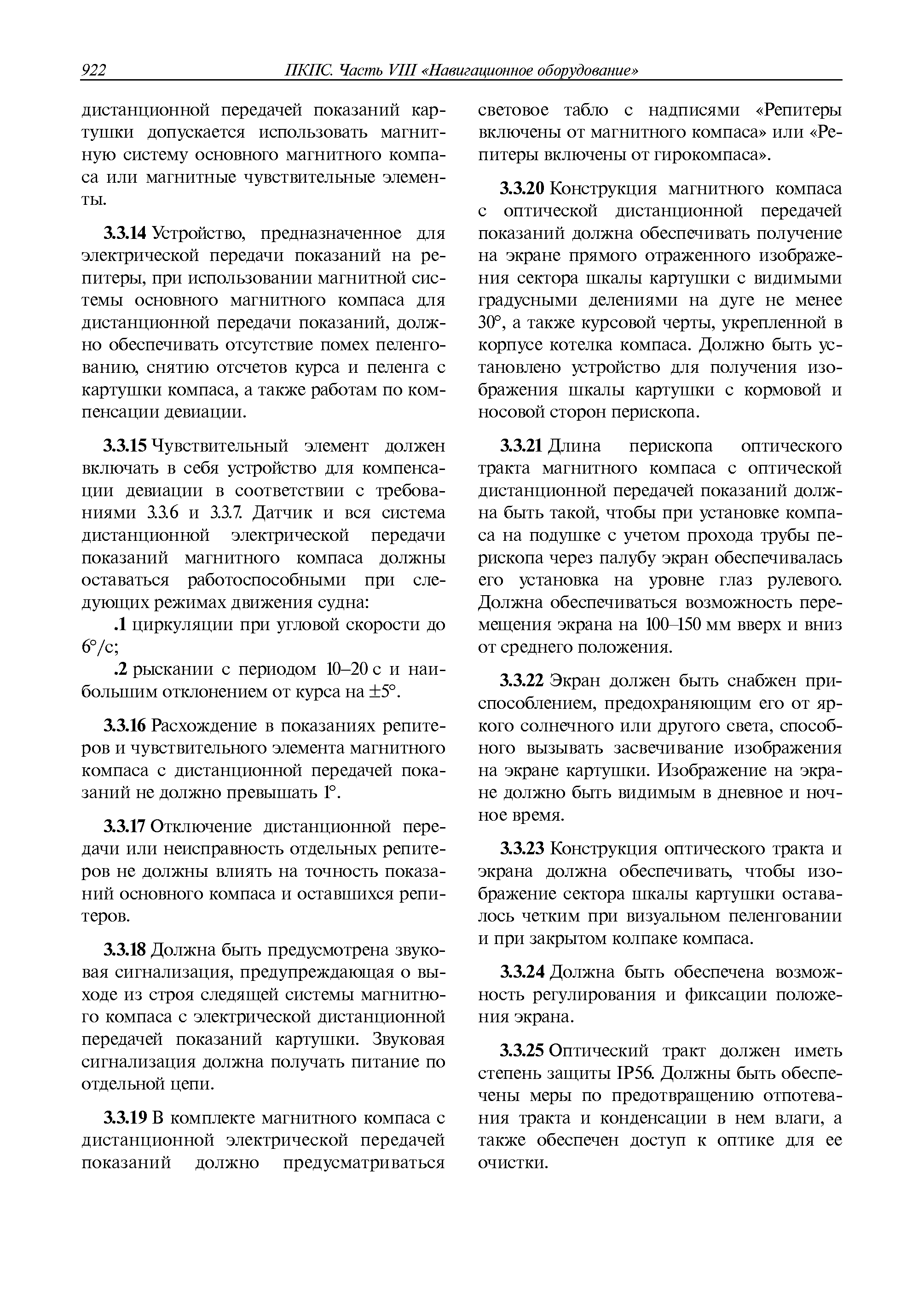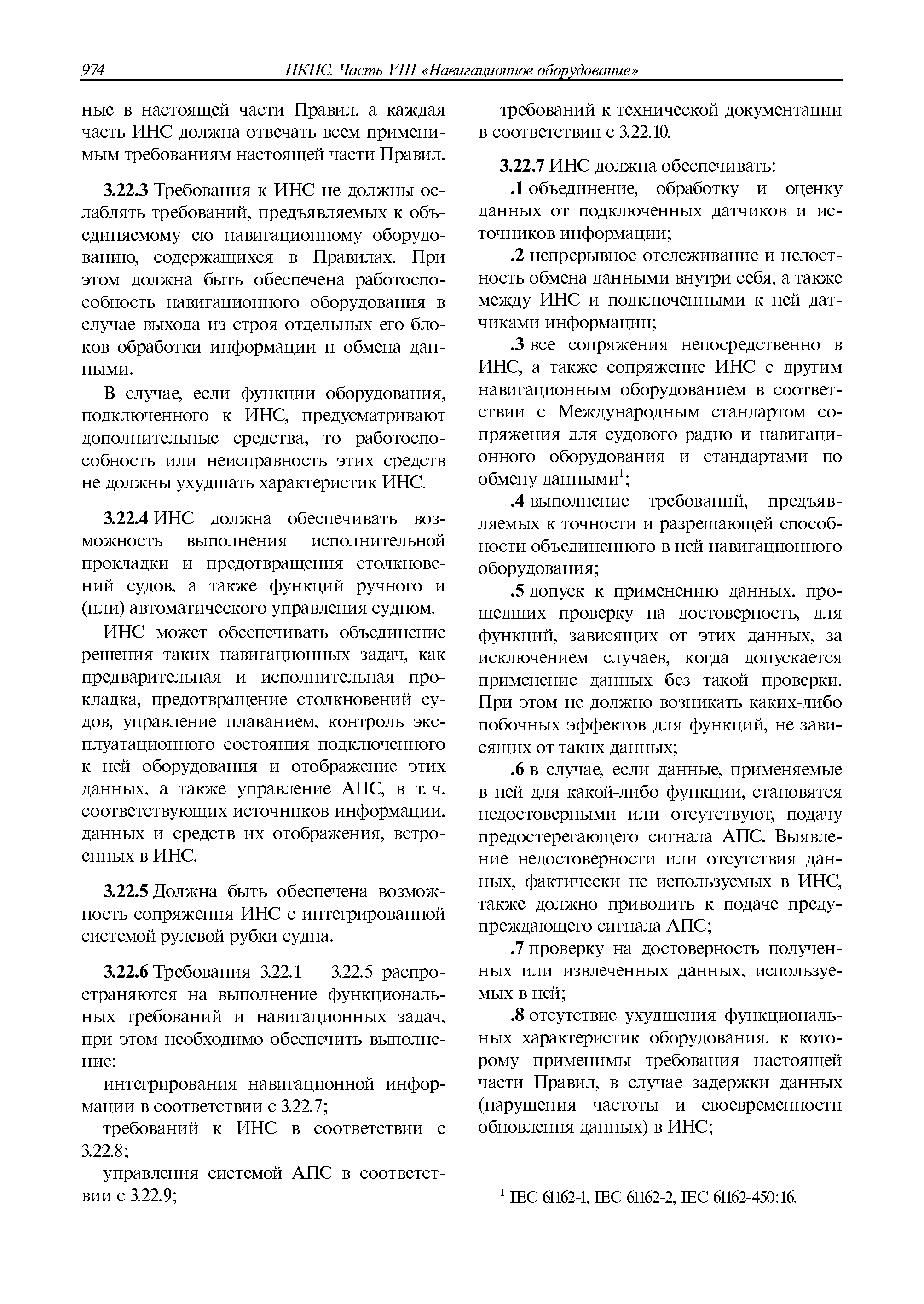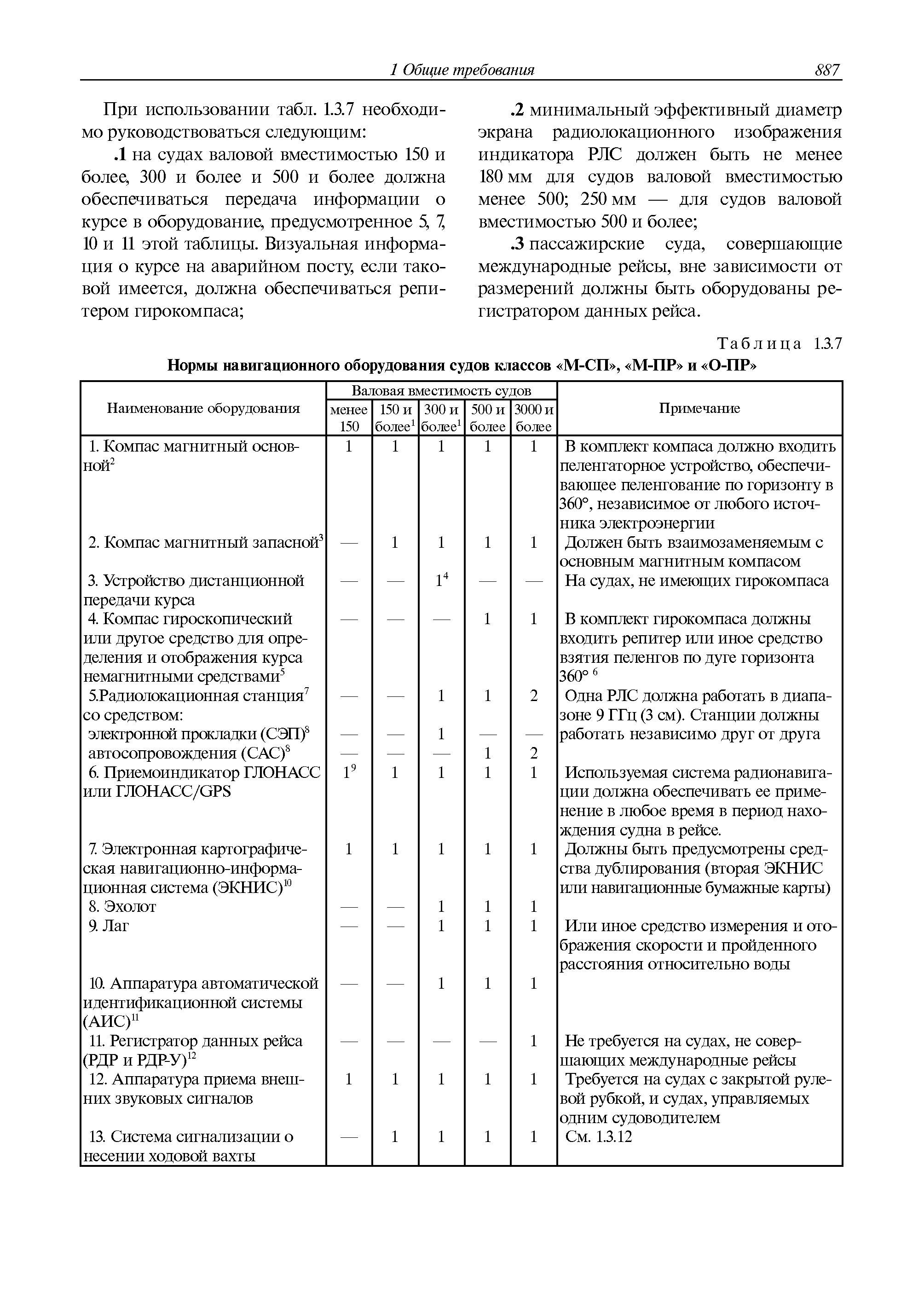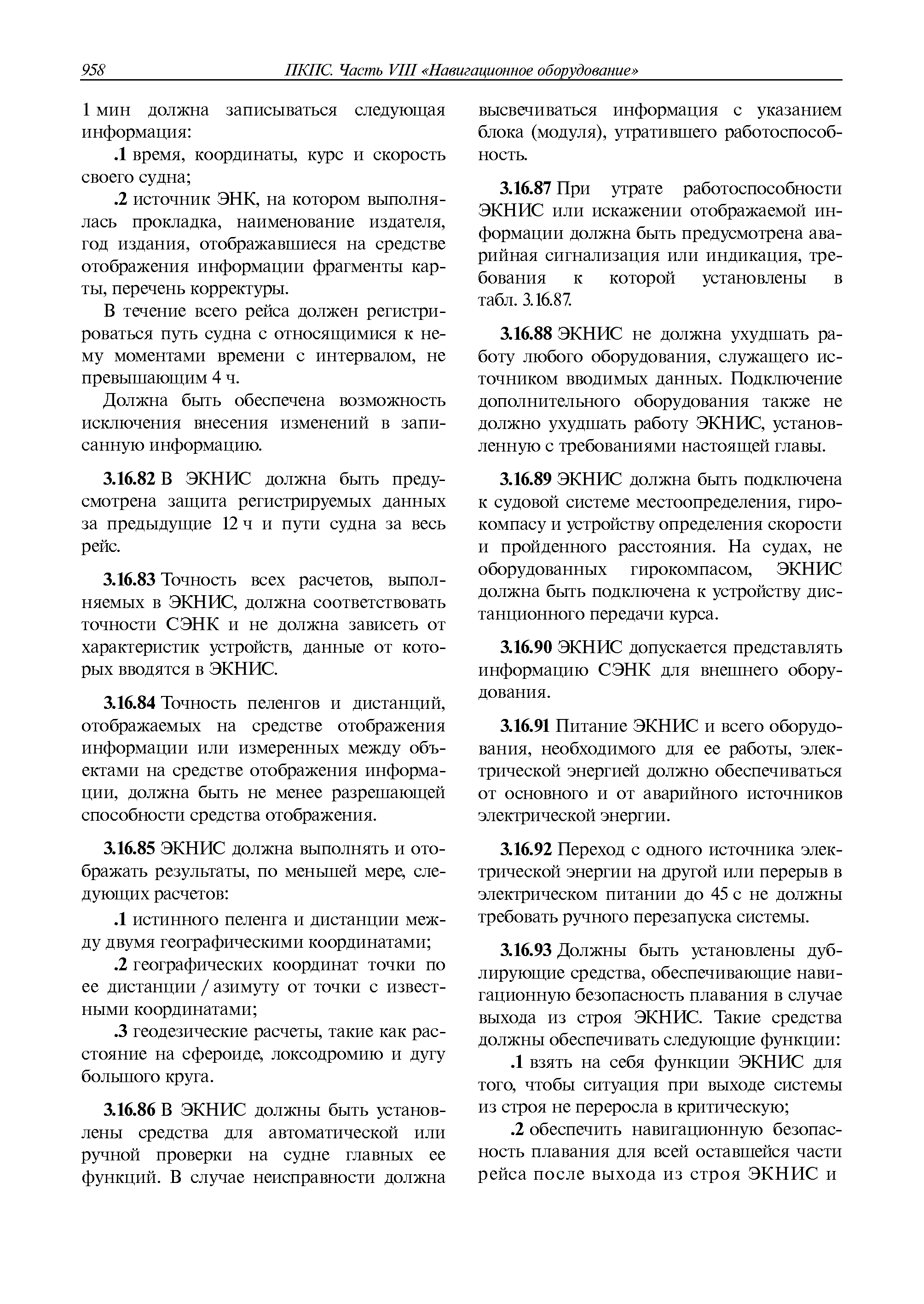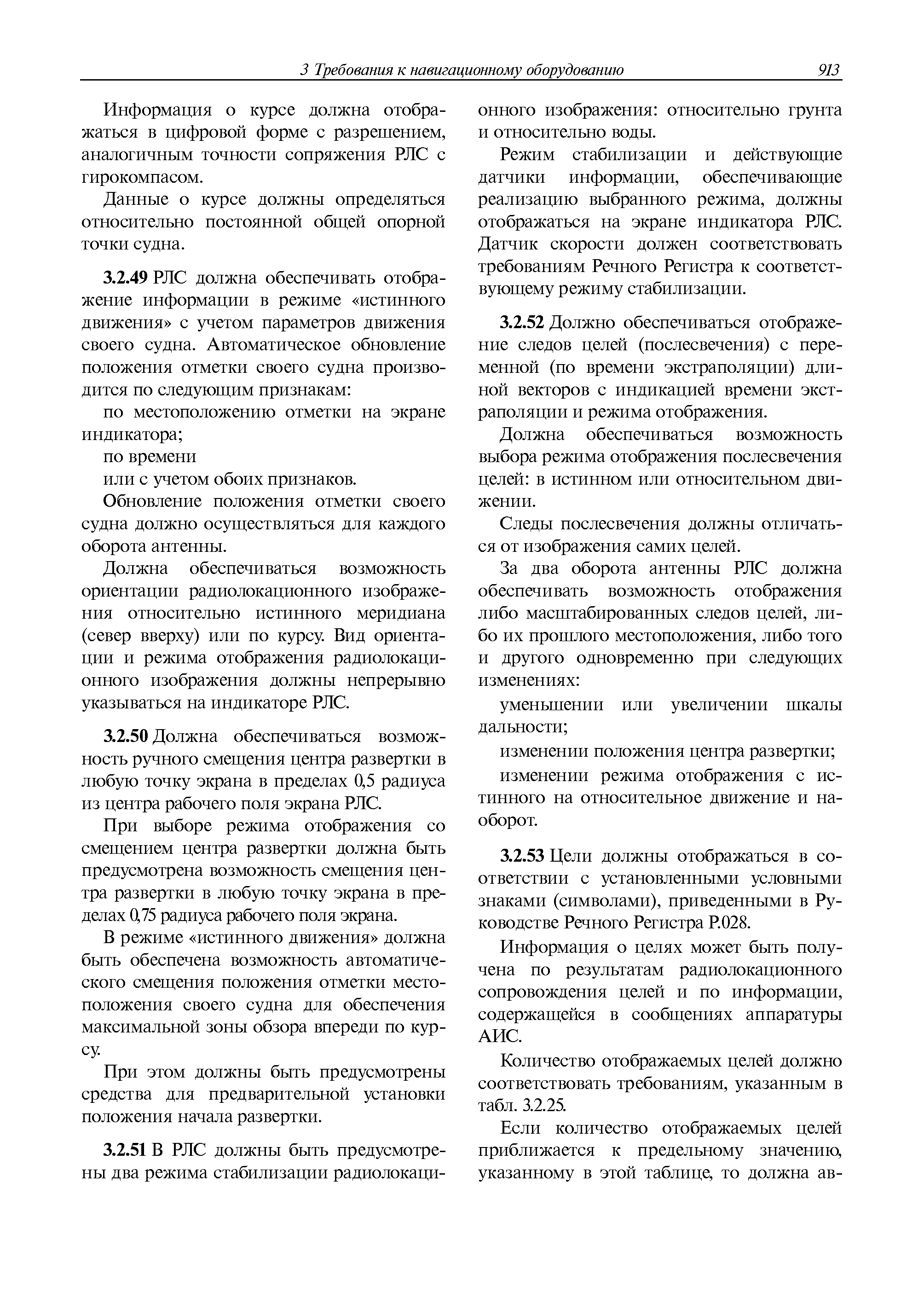 | Оглавление: | 1 Общие требования 1.1 Область распространения 1.2 Термины и их определения 1.3 Состав навигационного оборудования 2 Размещение навигационного оборудования 2.1 Общие требования 2.2 Размещение радиолокационной станции 2.3 Размещение магнитного компаса 2.4 Размещение гирокомпаса 2.5 Размещение авторулевого и стабилизатора курса 2.6 Размещение эхолота 2.7 Размещение лага 2.8 Размещение антенн и приемоиндикаторов систем радионавигации и ГНСС ГЛОНАСС, GРC, ГЛОНАСС/GРC, ГАЛИЛЕО 2.9 Размещение указателя скорости поворота 2.10 Размещение системы отображения электронных навигационных карт и информации (СОЭНКИ) 2.11 Размещение системы управления траекторией судна 2.12 Размещение автоматической идентификационной системы 2.13 Размещение регистратора данных рейса 2.14 Размещение аппаратуры приема внешних звуковых сигналов 2.15 Размещение радиолокационного отражателя 2.16 Размещение интегрированной навигационной системы 3 Требования к навигационному оборудованию 3.1 Общие требования 3.2 Требования к радиолокационной станции 3.3 Требования к магнитному компасу 3.4 Требования к гирокомпасу 3.5 Устройство дистанционной передачи курса 3.6 Требования к авторулевому и стабилизатору курса 3.7 Требования к эхолоту 3.8 Требования к лагу 3.9 Требования к комбинированному приемоиндикатору ГНСС, ГЛОНАСС/GPS 3.10 Требования к приемоиндикатору глобальной навигационной спутниковой системы GPS 3.11 Требования к приемоиндикатору ГЛОНАСС 3.12 Требования к приемоиндикатору навигационной спутниковой системы ГАЛИЛЕО 3.13 Требования к указателю скорости поворота 3.14 Требования к представлению навигационной информации на судовых средствах ее отображения 3.15 Требования к системе отображения электронных навигационных карт и информации 3.16 Требования к электронной картографической навигационно-информационной системе 3.17 Требования к системе управления траекторией судна (СУТС) 3.18 Требования к судовой аппаратуре автоматической идентификационной системы 3.19 Требования к регистратору данных рейса 3.20 Требования к упрощенному регистратору данных рейса 3.21 Требования к радиолокационному отражателю 3.22 Требования к интегрированным навигационным системам 3.23 Требования к аппаратуре приема внешних звуковых сигналов 3.24 Требования к системе сигнализации о несении ходовой вахты 3.25 Требования к оборудованию системы опознавания судов и слежения за ними на дальнем расстоянии 3.26 Требования к электронно-картографической системе 3.27 Требования к приемоиндикатору ГНСС Бейдоу 3.28 Требования к многосистемному радионавигационному приемнику 3.29 Требования к электронному кренометру 3.30 Требования к интегрированным системам рулевой рубки |