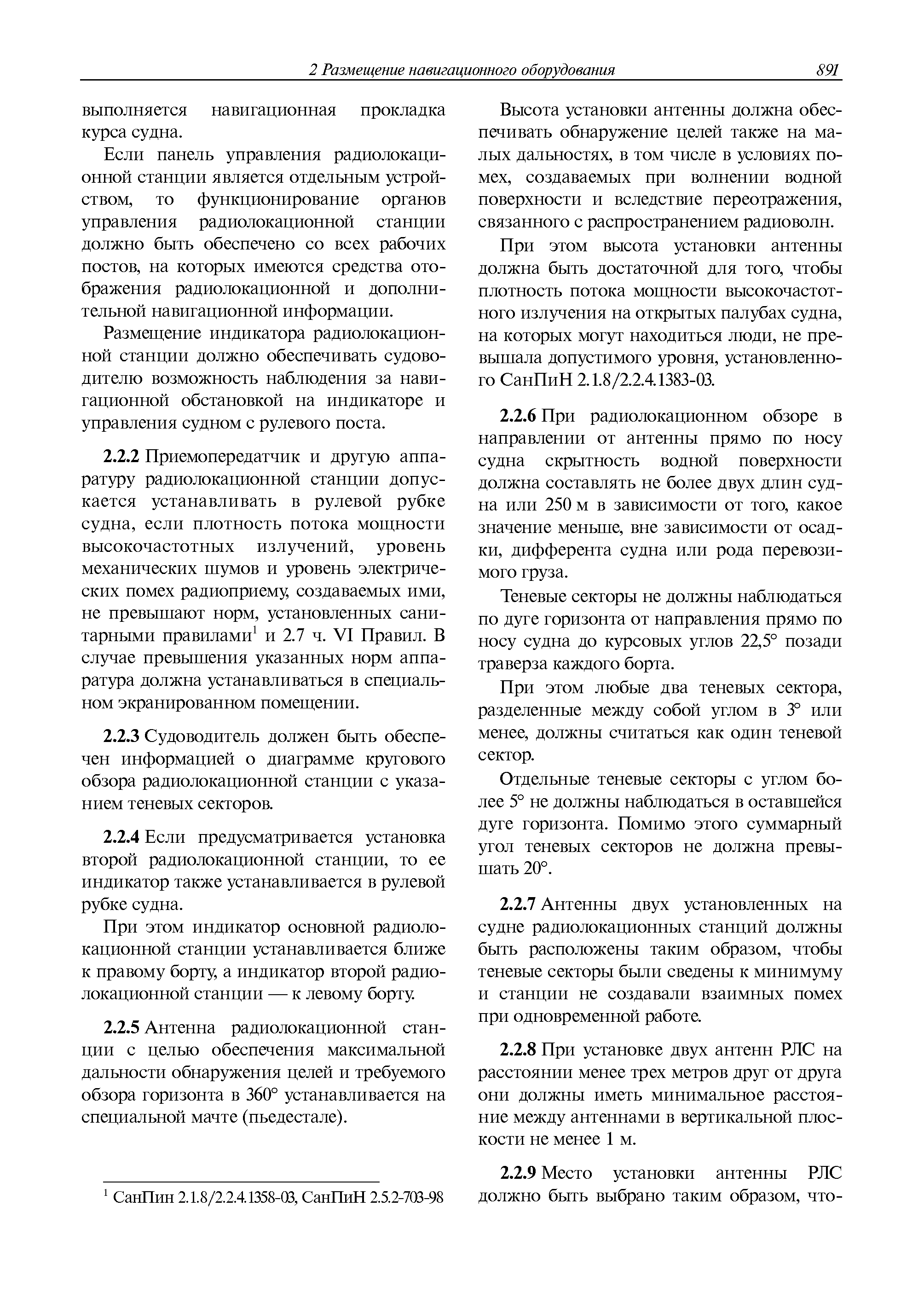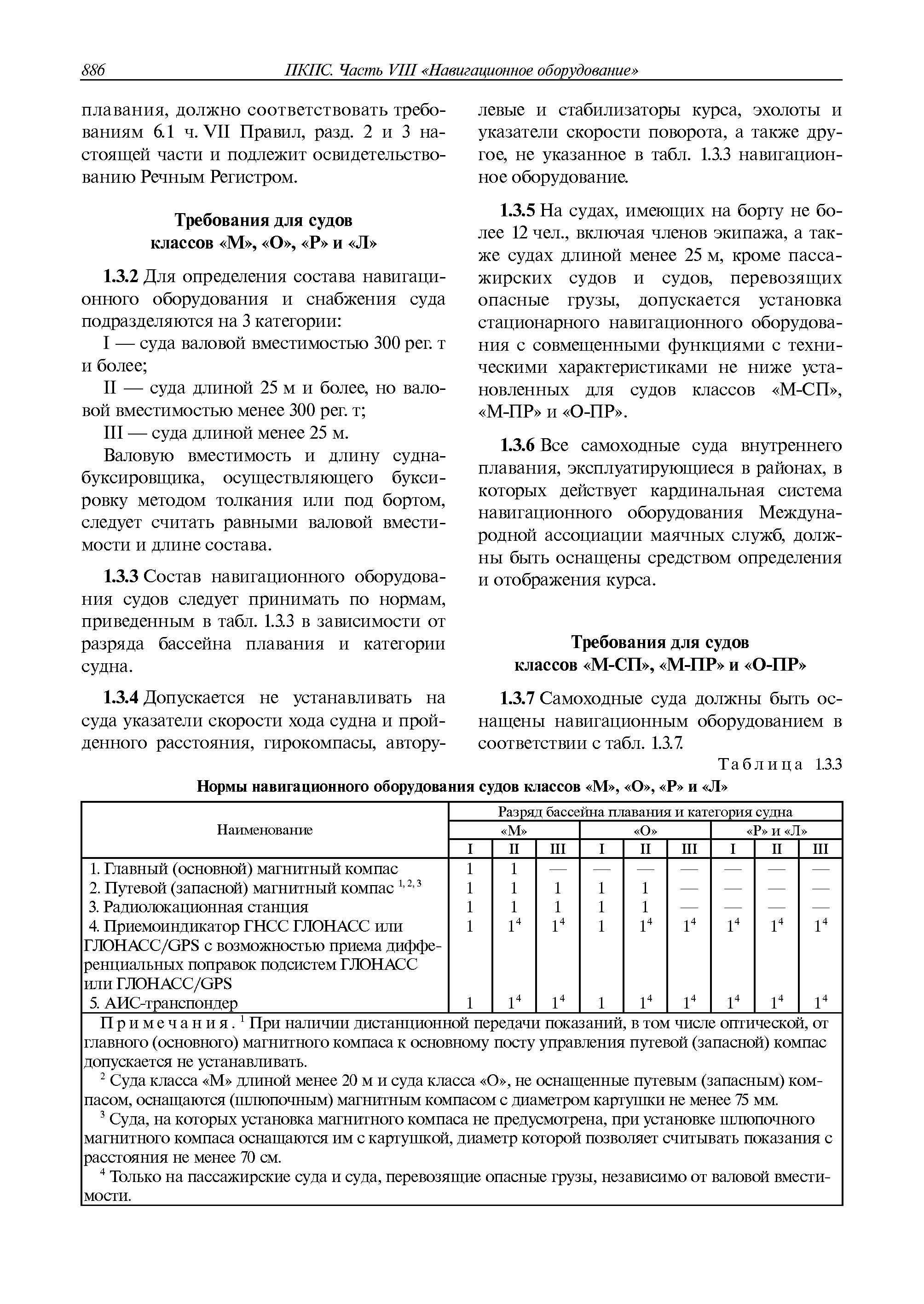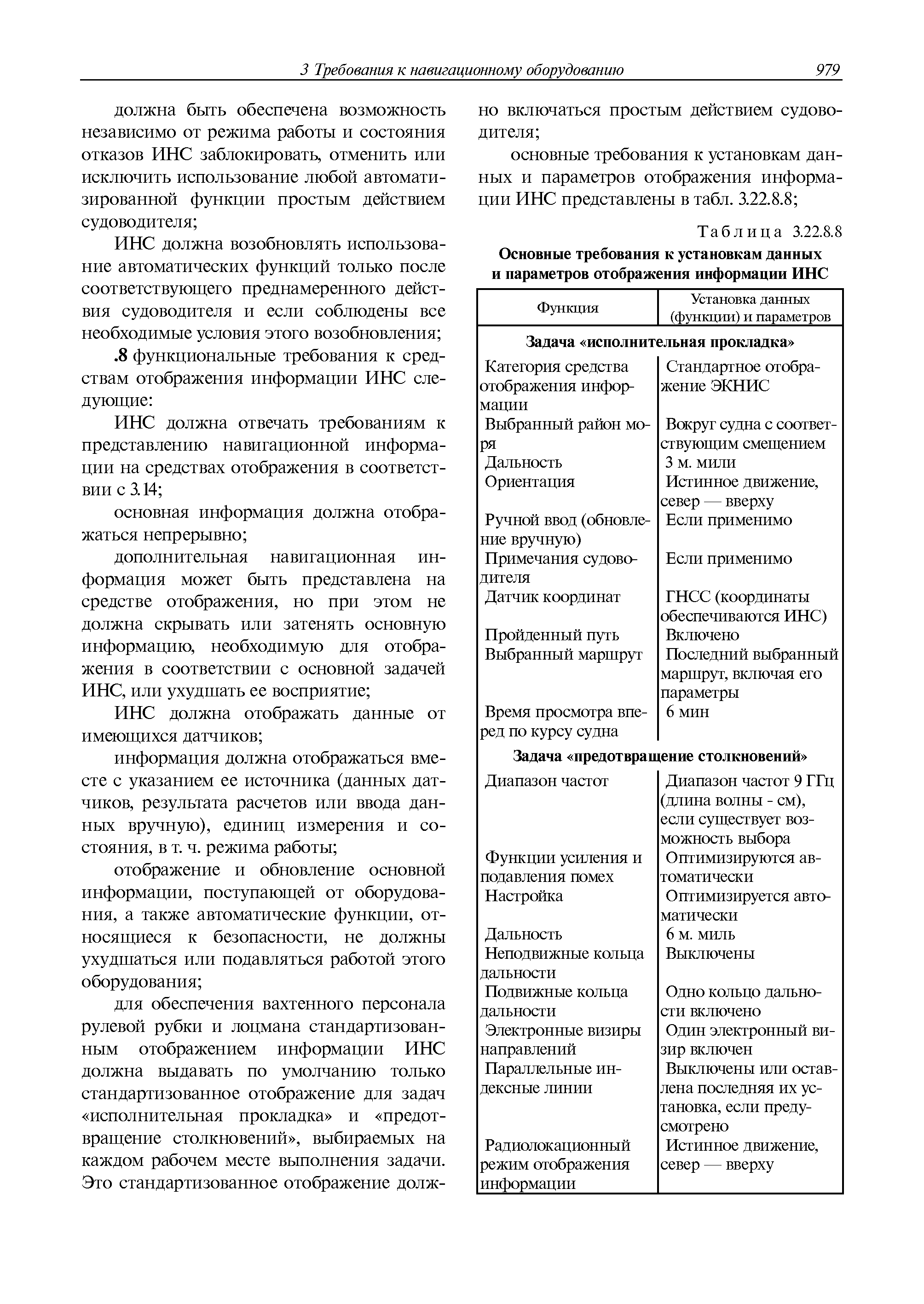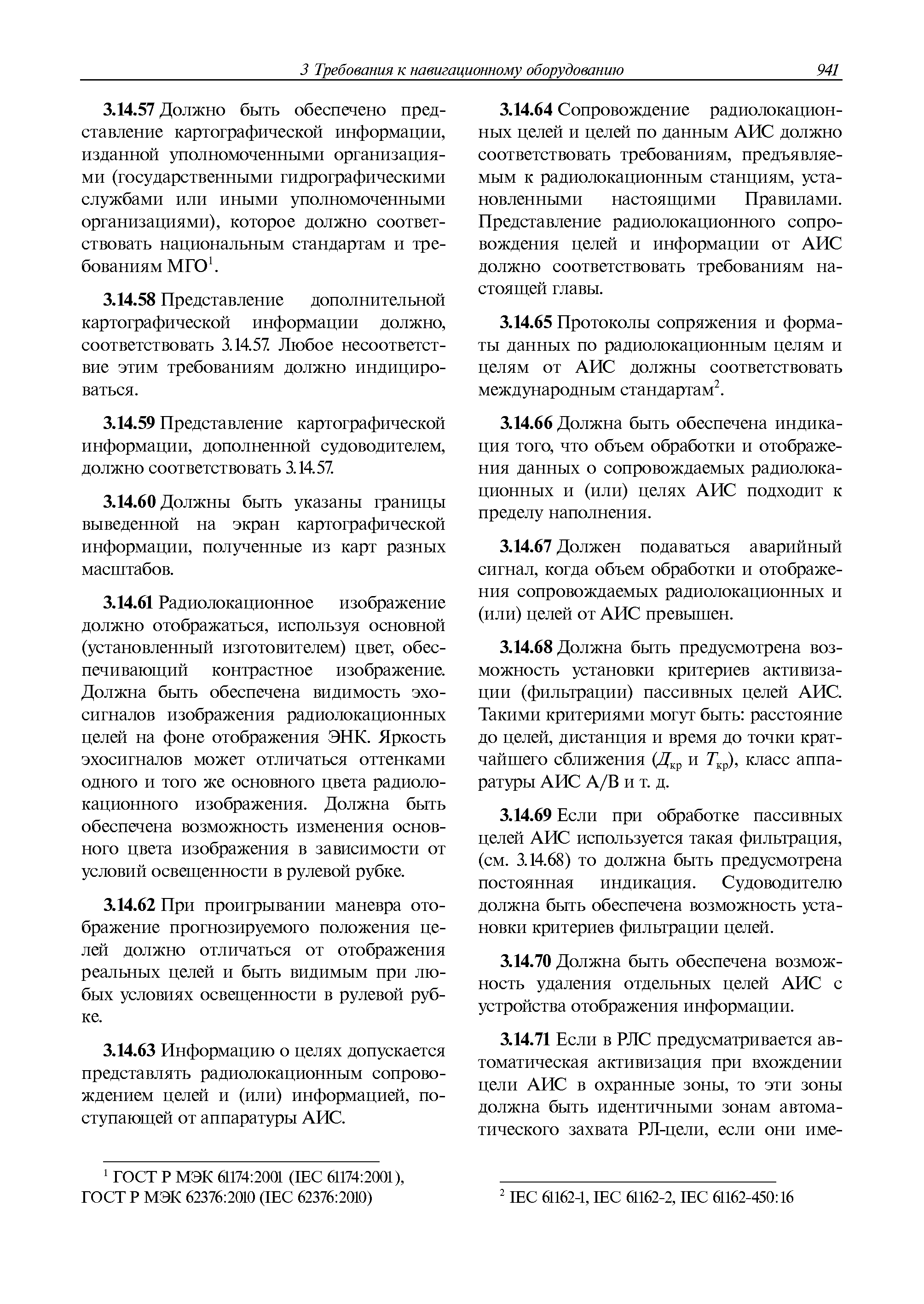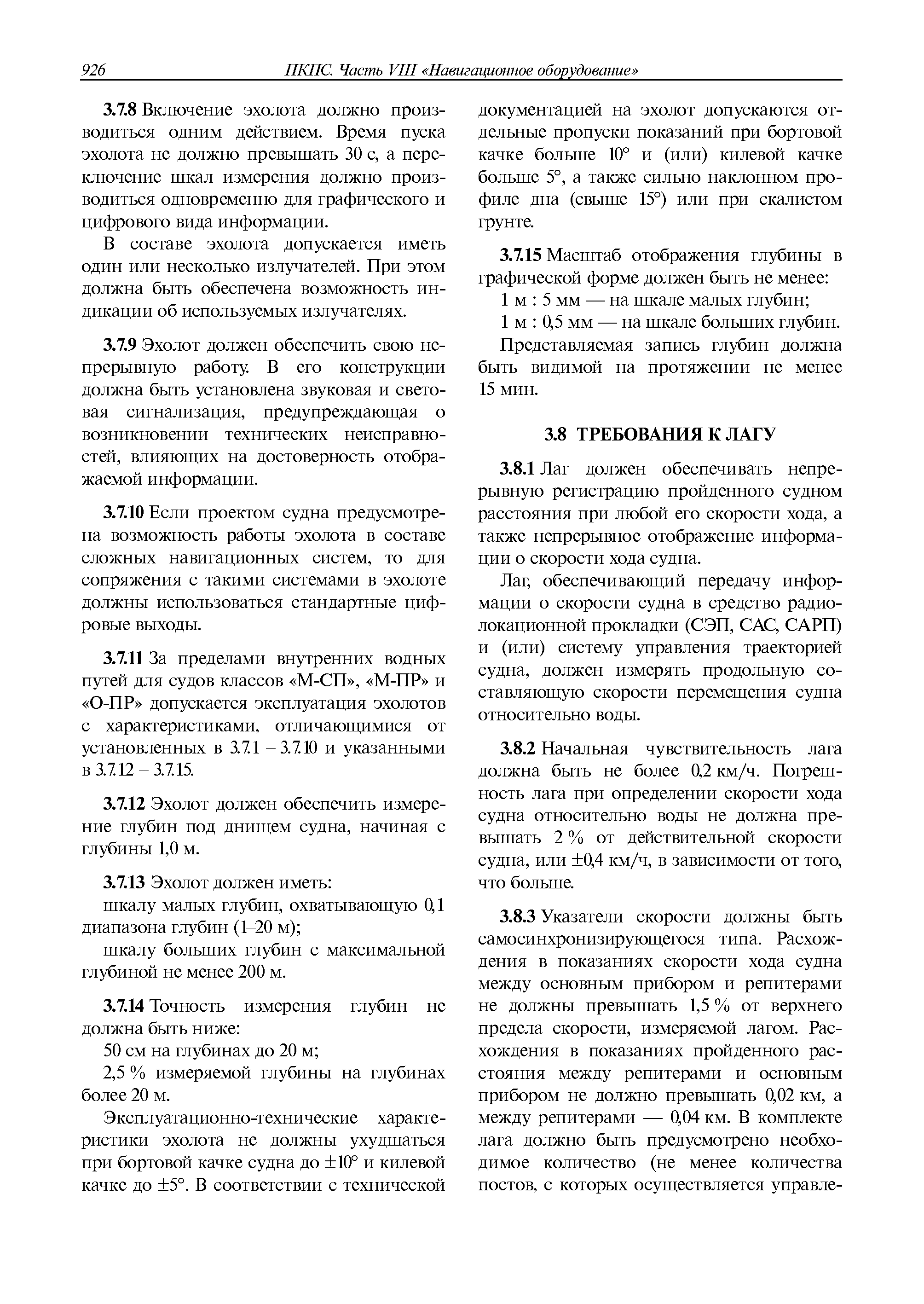| Оглавление: | 1 Общие требования 1.1 Область распространения 1.2 Термины и их определения 1.3 Состав навигационного оборудования 2 Размещение навигационного оборудования 2.1 Общие требования 2.2 Размещение радиолокационной станции 2.3 Размещение магнитного компаса 2.4 Размещение гирокомпаса 2.5 Размещение авторулевого и стабилизатора курса 2.6 Размещение эхолота 2.7 Размещение лага 2.8 Размещение антенн и приемоиндикаторов систем радионавигации и ГНСС ГЛОНАСС, GРC, ГЛОНАСС/GРC, ГАЛИЛЕО 2.9 Размещение указателя скорости поворота 2.10 Размещение системы отображения электронных навигационных карт и информации (СОЭНКИ) 2.11 Размещение системы управления траекторией судна 2.12 Размещение автоматической идентификационной системы 2.13 Размещение регистратора данных рейса 2.14 Размещение аппаратуры приема внешних звуковых сигналов 2.15 Размещение радиолокационного отражателя 2.16 Размещение интегрированной навигационной системы 3 Требования к навигационному оборудованию 3.1 Общие требования 3.2 Требования к радиолокационной станции 3.3 Требования к магнитному компасу 3.4 Требования к гирокомпасу 3.5 Устройство дистанционной передачи курса 3.6 Требования к авторулевому и стабилизатору курса 3.7 Требования к эхолоту 3.8 Требования к лагу 3.9 Требования к комбинированному приемоиндикатору ГНСС, ГЛОНАСС/GPS 3.10 Требования к приемоиндикатору глобальной навигационной спутниковой системы GPS 3.11 Требования к приемоиндикатору ГЛОНАСС 3.12 Требования к приемоиндикатору навигационной спутниковой системы ГАЛИЛЕО 3.13 Требования к указателю скорости поворота 3.14 Требования к представлению навигационной информации на судовых средствах ее отображения 3.15 Требования к системе отображения электронных навигационных карт и информации 3.16 Требования к электронной картографической навигационно-информационной системе 3.17 Требования к системе управления траекторией судна (СУТС) 3.18 Требования к судовой аппаратуре автоматической идентификационной системы 3.19 Требования к регистратору данных рейса 3.20 Требования к упрощенному регистратору данных рейса 3.21 Требования к радиолокационному отражателю 3.22 Требования к интегрированным навигационным системам 3.23 Требования к аппаратуре приема внешних звуковых сигналов 3.24 Требования к системе сигнализации о несении ходовой вахты 3.25 Требования к оборудованию системы опознавания судов и слежения за ними на дальнем расстоянии 3.26 Требования к электронно-картографической системе 3.27 Требования к приемоиндикатору ГНСС Бейдоу 3.28 Требования к многосистемному радионавигационному приемнику 3.29 Требования к электронному кренометру 3.30 Требования к интегрированным системам рулевой рубки |