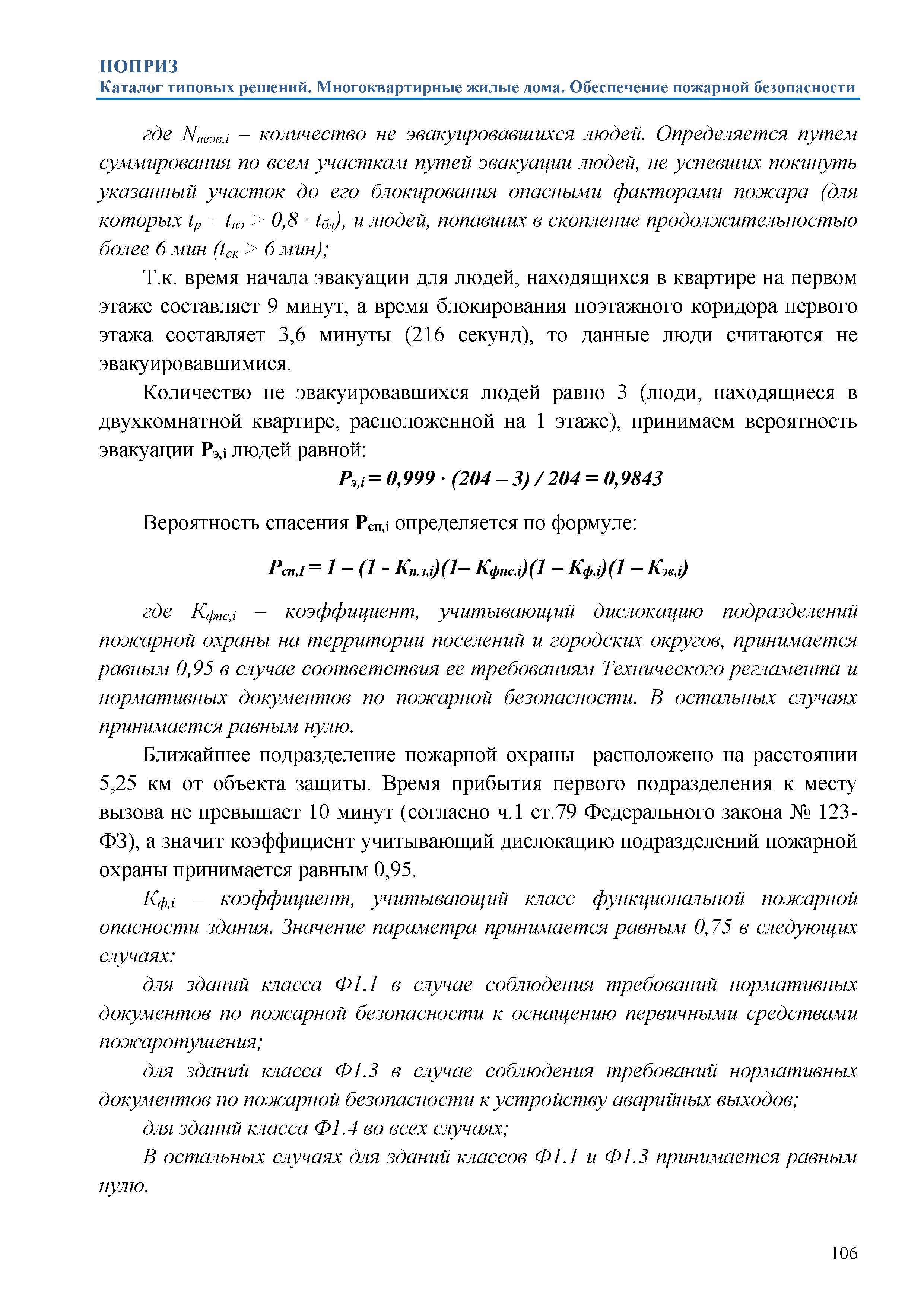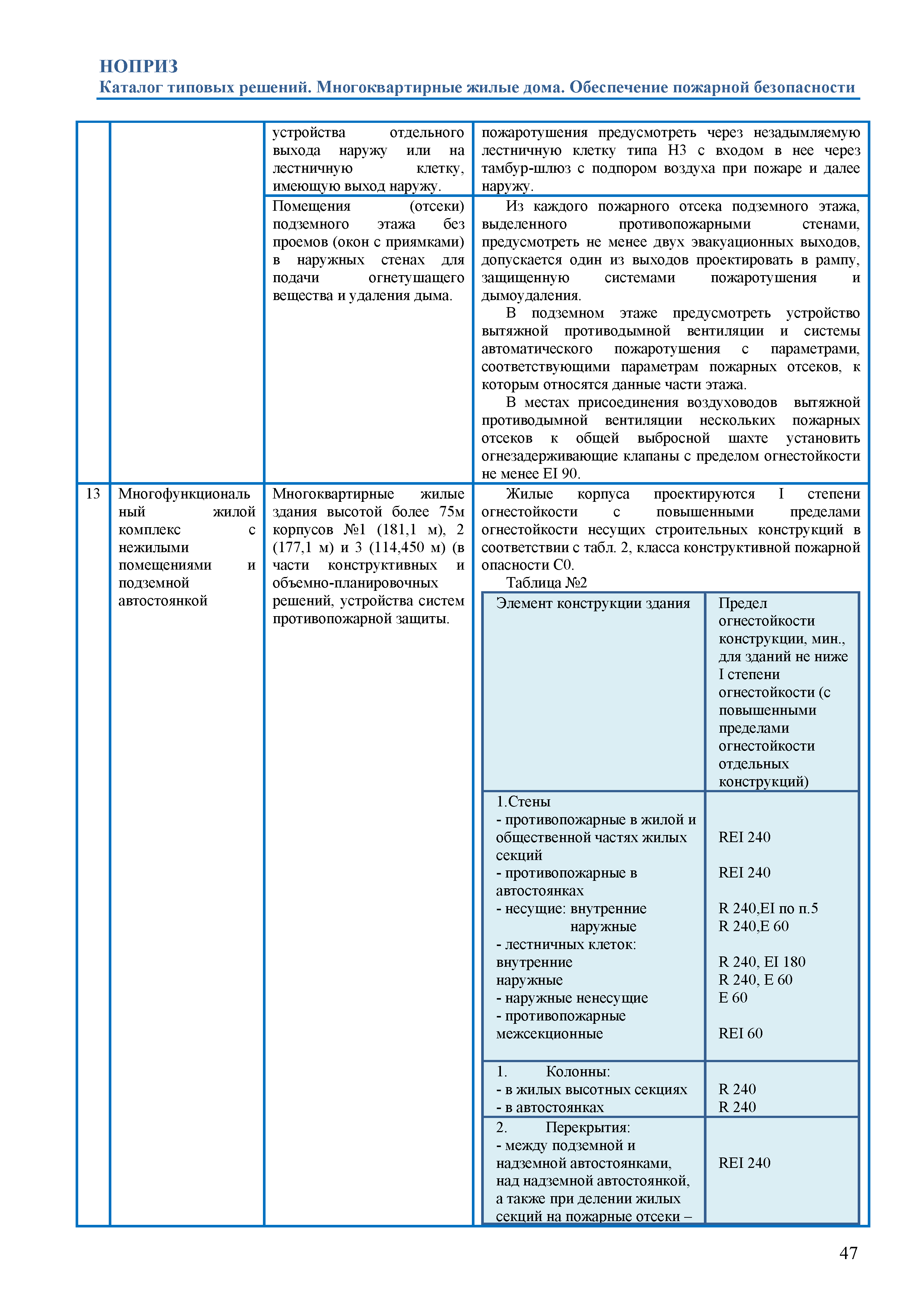 | Оглавление: | 1 Введение 2 Область применения 3 Нормативные ссылки 4 Термины и определения 5 Анализ практики работы нормативно-технических советов МЧС России и Минстроя (Минрегиона) России в части обеспечения противопожарной защиты зданий класса Ф 1.3 5.1 Обобщенный анализ для зданий класса Ф 1.3 по функциональной пожарной опасности (многоквартирные жилые дома). 5.2 Решения для характерных зданий класса Ф 1.3 по функциональной пожарной опасности 6 Технические решения. 6.1 Технические решения по обеспечению требований пожарной безопасности к объемно-планировочным и конструктивным решениям здания фi.з. 6.2 Способы обеспечения степени огнестойкости основных несущих строительных конструкций и класса конструктивной пожарной опасности. 6.3 Технические решения по разделению здания на пожарные отсеки. 6.4 Технические решения по обеспечению требований пожарной безопасности к путям эвакуации здания Ф 1.3 6.5 Технические решения по размещению и устройству на кровле здания площадки для приема спасательных кабин вертолетов. 6.6 Технические решения по выполнению и инженерному обеспечению безопасных зон в зданиях Ф 1.3 6.7 Способы обеспечения незадымляемости переходов через наружную воздушную зону, ведущую к незадымляемым лестничным клеткам типа Н1 6.8 Способы оценки уровня безопасной эвакуации и возможности воздействия опасных факторов пожара на людей при возникновении пожара в помещениях жилого дома. 6.9 Способы размещения в надземной части здания пожарных укрытий и опорных пунктов пожаротушения. 6.10 Способы обеспечения доступа личного состава и подачи средств пожаротушения к очагу пожара в верхние этажи здания при отсутствии технического оснащения пожарных подразделений. 6.11 Схемы размещения лифтов для транспортирования пожарных подразделений. Приложение 1. Письмо по Каталогу ГБУ "Новосибирская областная государственная вневедомственная экспертиза Новосибирской области" № 295/16 от 31.03.2016 года Приложение 2. Письмо по Каталогу ГАУ г. Москвы "Московская государственная экспертиза" МГЭ-18-33/16-101-1 от 13.04.2016 года |