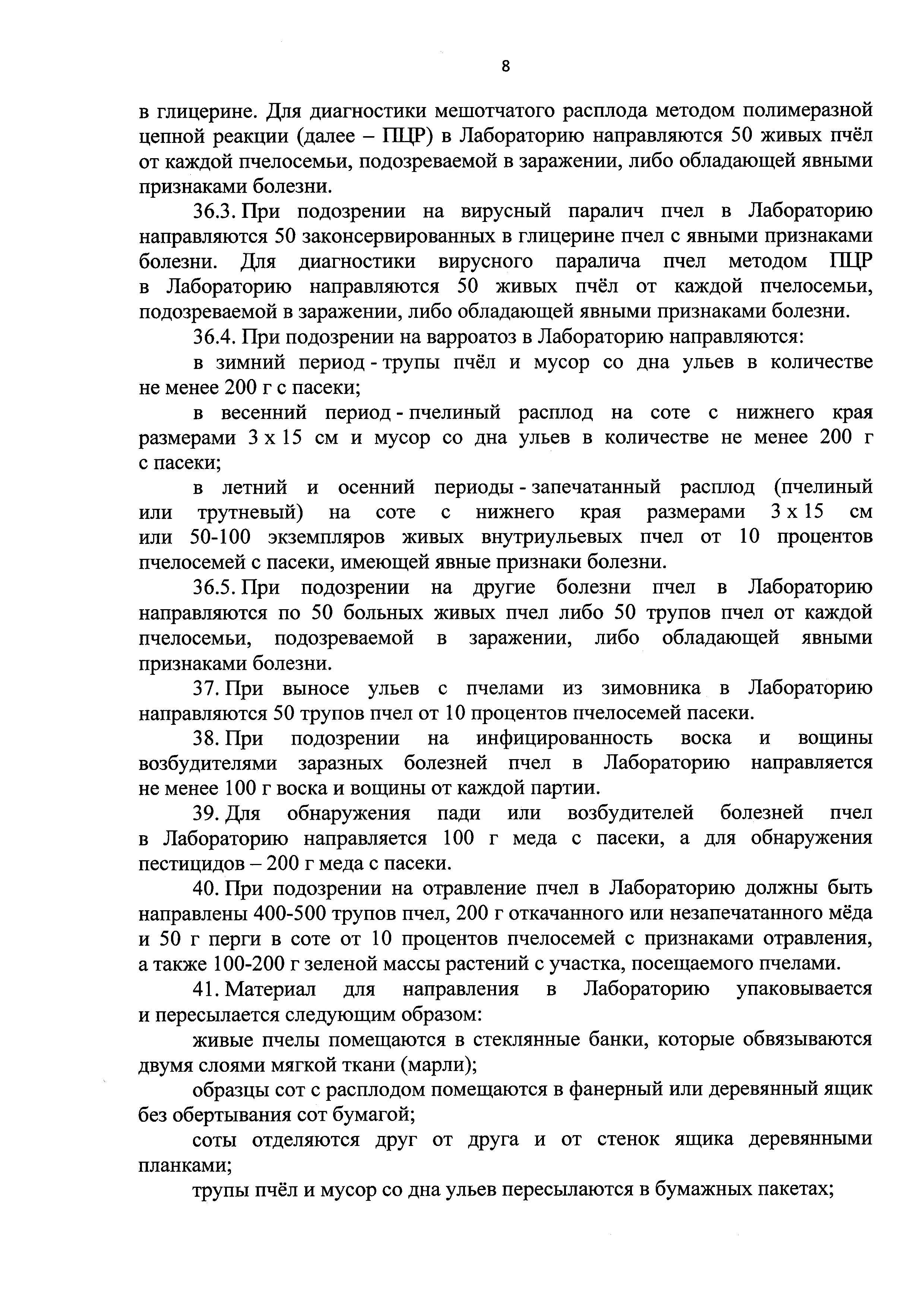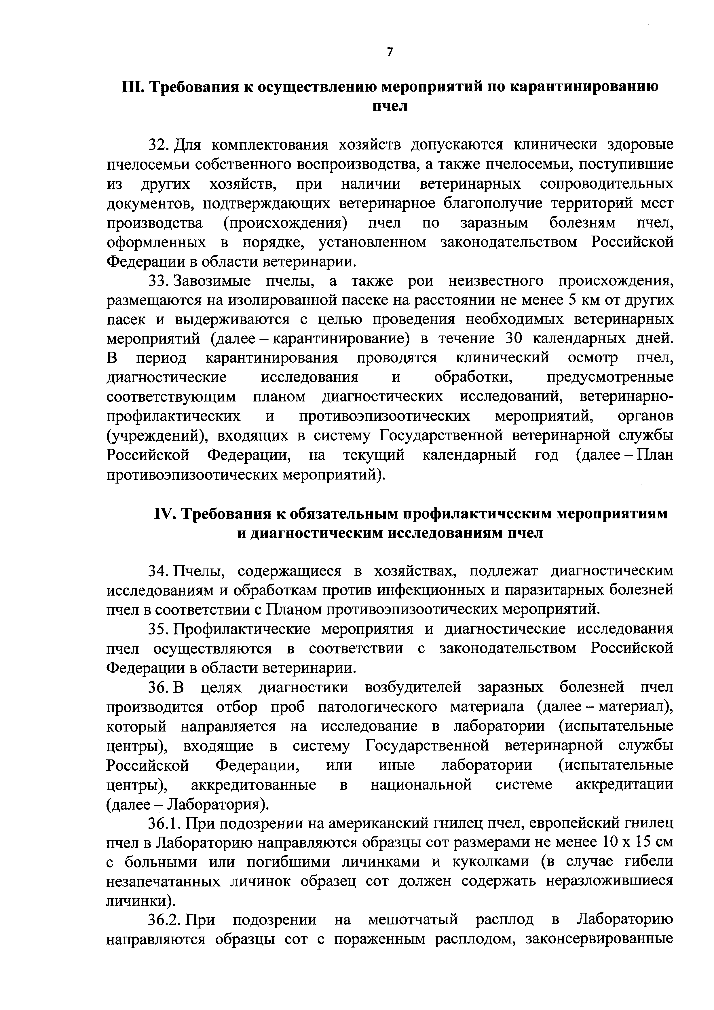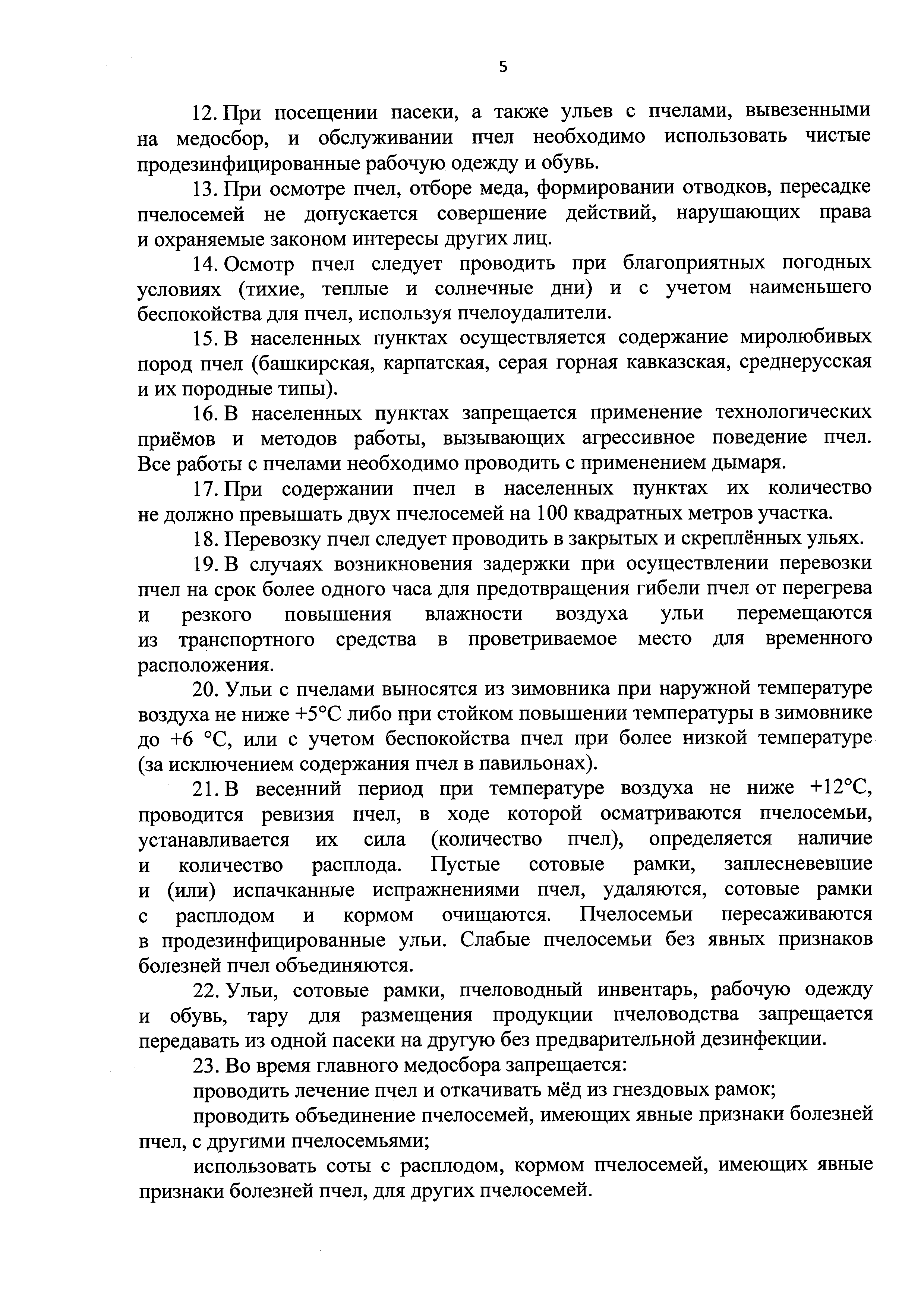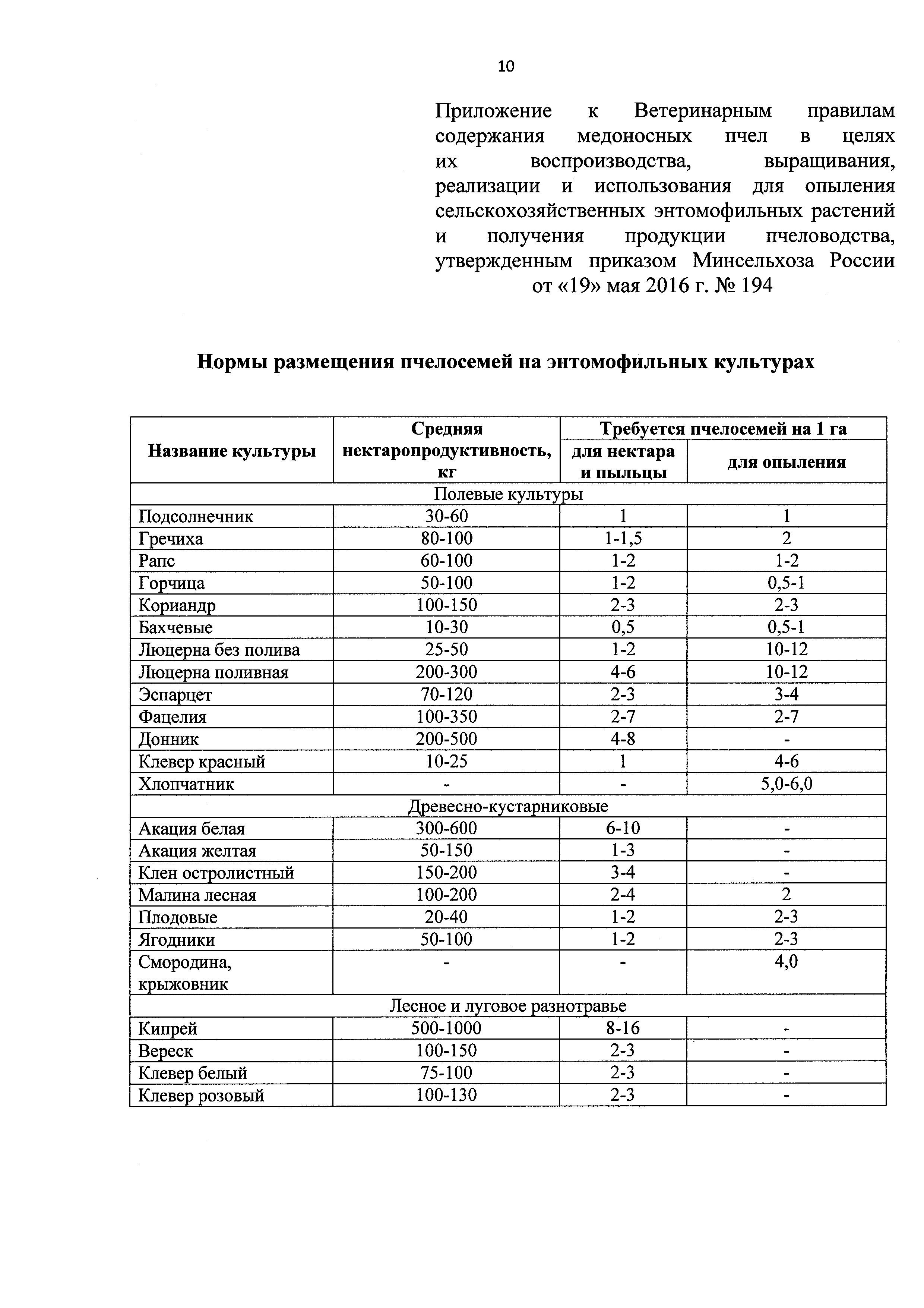 Ветеринарные правила содержания медоносных пчел в целях их воспроизводства, выращивания, реализации и использования для опыления сельскохозяйственных энтомофильных растений и получения продукции пчеловодства| Статус: | действует | | Название рус.: | Ветеринарные правила содержания медоносных пчел в целях их воспроизводства, выращивания, реализации и использования для опыления сельскохозяйственных энтомофильных растений и получения продукции пчеловодства | | Дата добавления в базу: | 01.02.2017 | | Дата актуализации: | 01.01.2021 | | Дата введения: | 16.08.2016 | | Область применения: | Ветеринарные правила содержания медоносных пчел в целях их воспроизводства, выращивания, реализации и использования для опыления сельскохозяйственных энтомофильных растений и получения продукции пчеловодства устанавливают требования к условиям содержания гражданами, в том числе в личных подсобных хозяйствах, в крестьянских (фермерских) хозяйствах, и юридическими лицами медоносных пчел в целях их воспроизводства, выращивания, реализации и использования для опыления сельскохозяйственных энтомофильных растений и получения продукции пчеловодства, а также требования к осуществлению мероприятий по карантинированию пчел, обязательным профилактическим мероприятиям и диагностическим исследованиям пчел | | Оглавление: | I. Общие положения II. Требования к условиям содержания пчел III. Требования к осуществлению мероприятий по карантинированию пчел IV. Требования к обязательным профилактическим мероприятиям и диагностическим исследованиям пчел Приложение. Нормы размещения пчелосемей на энтомофильных культурах | | Утверждён: | 19.05.2016 Министерство сельского хозяйства Российской Федерации (194)