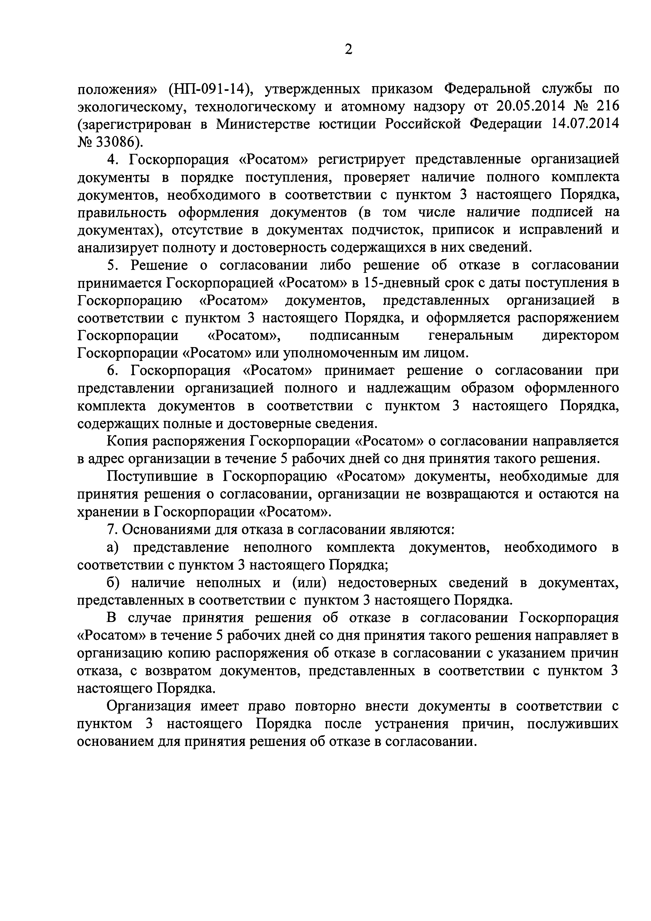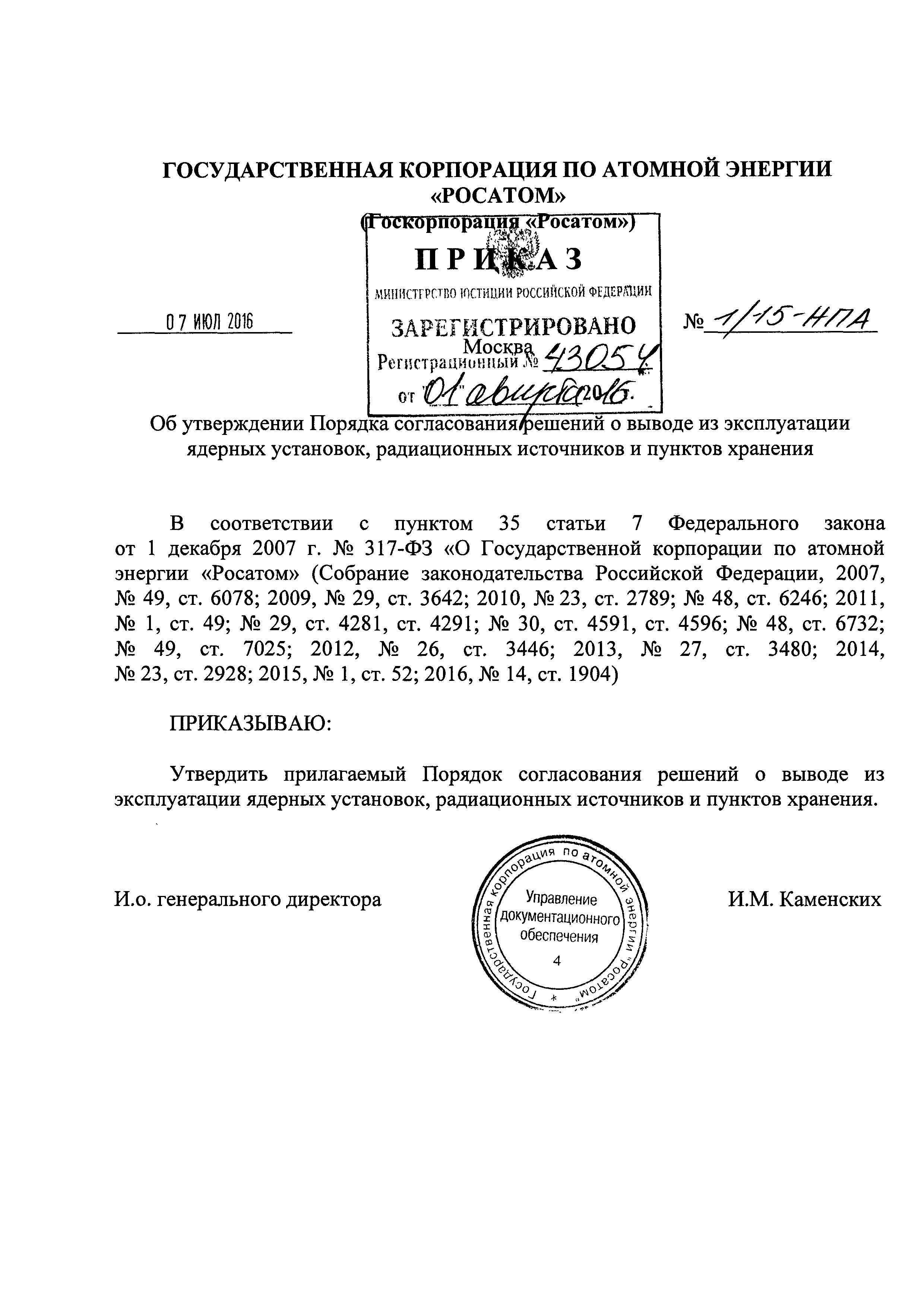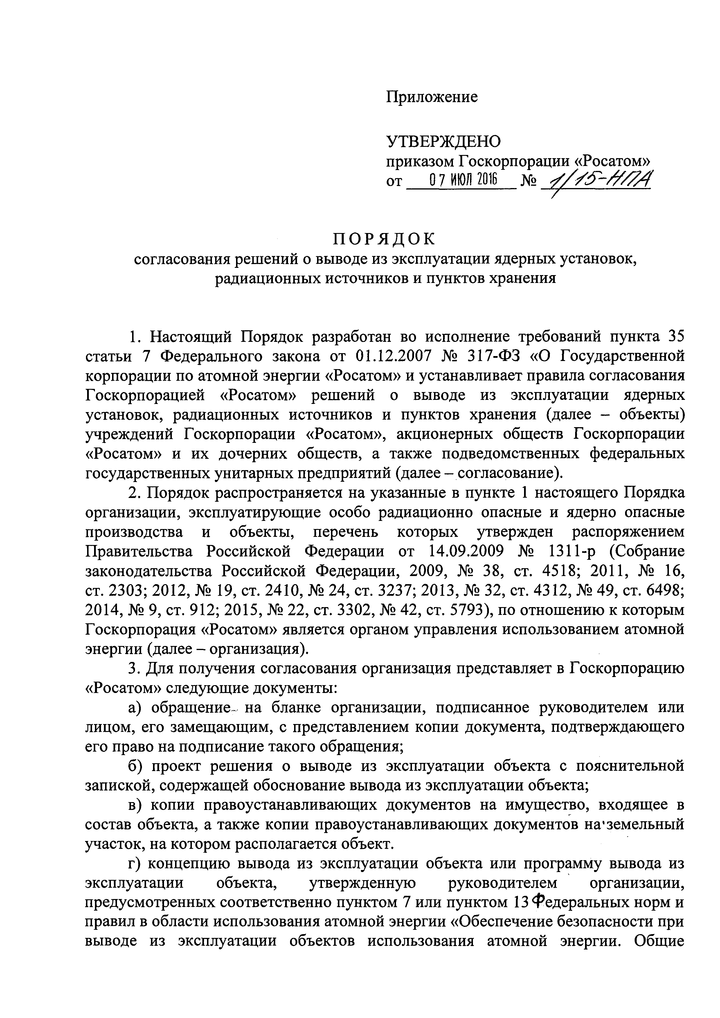 Порядок согласования решений о выводе из эксплуатации ядерных установок, радиационных источников и пунктов хранения| Статус: | действует | | Название рус.: | Порядок согласования решений о выводе из эксплуатации ядерных установок, радиационных источников и пунктов хранения | | Дата добавления в базу: | 01.02.2017 | | Дата актуализации: | 01.01.2021 | | Дата введения: | 13.08.2016 | | Область применения: | Порядок устанавливает правила согласования Госкорпорацией "Росатом" решений о выводе из эксплуатации ядерных установок, радиационных источников и пунктов хранения учреждений Госкорпорации "Росатом", акционерных обществ Госкорпорации "Росатом" и их дочерних обществ, а также подведомственных федеральных государственных унитарных предприятий | | Утверждён: | 07.07.2016 Государственная корпорация по атомной энергии РОСАТОМ (1/15-НПА)