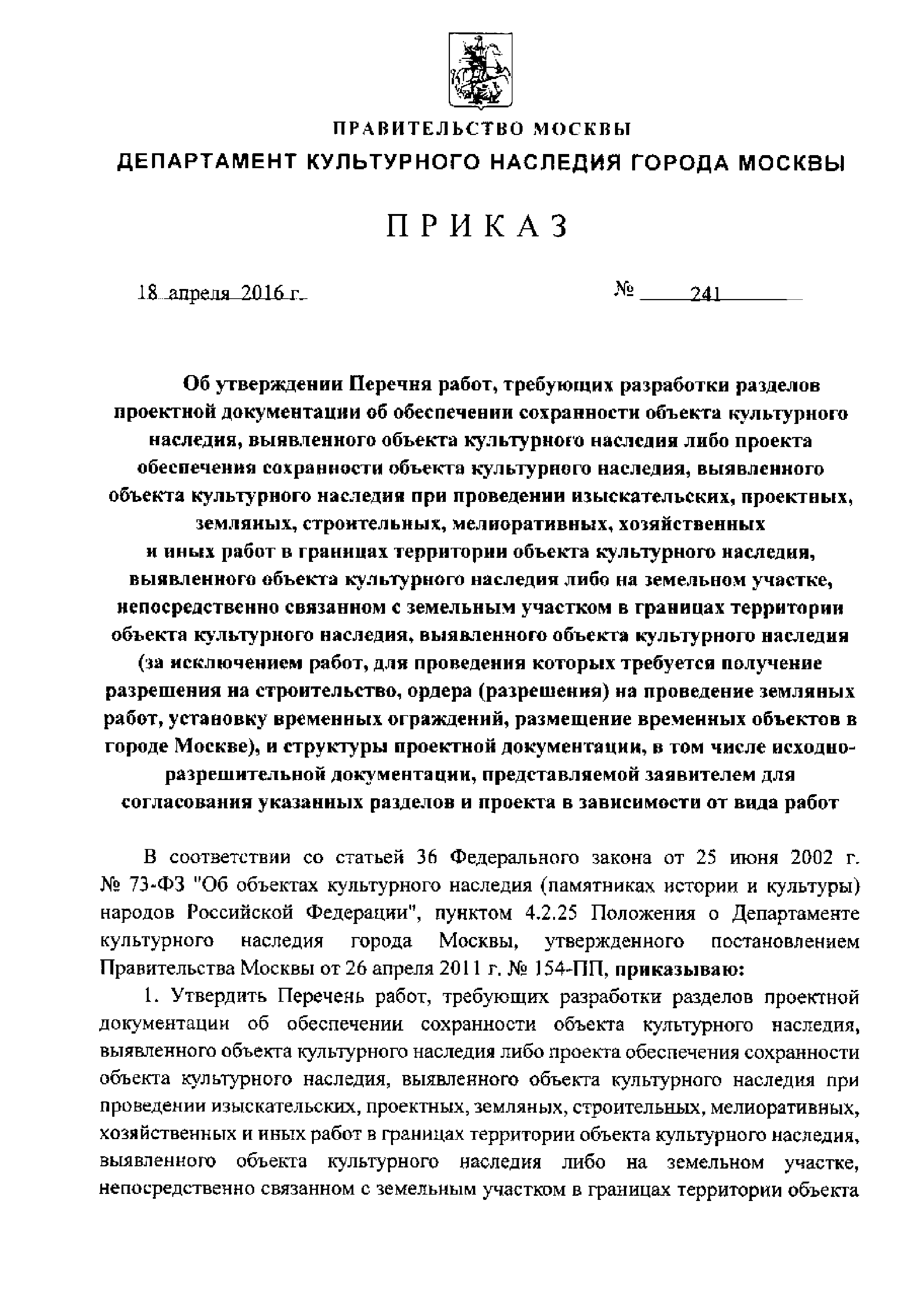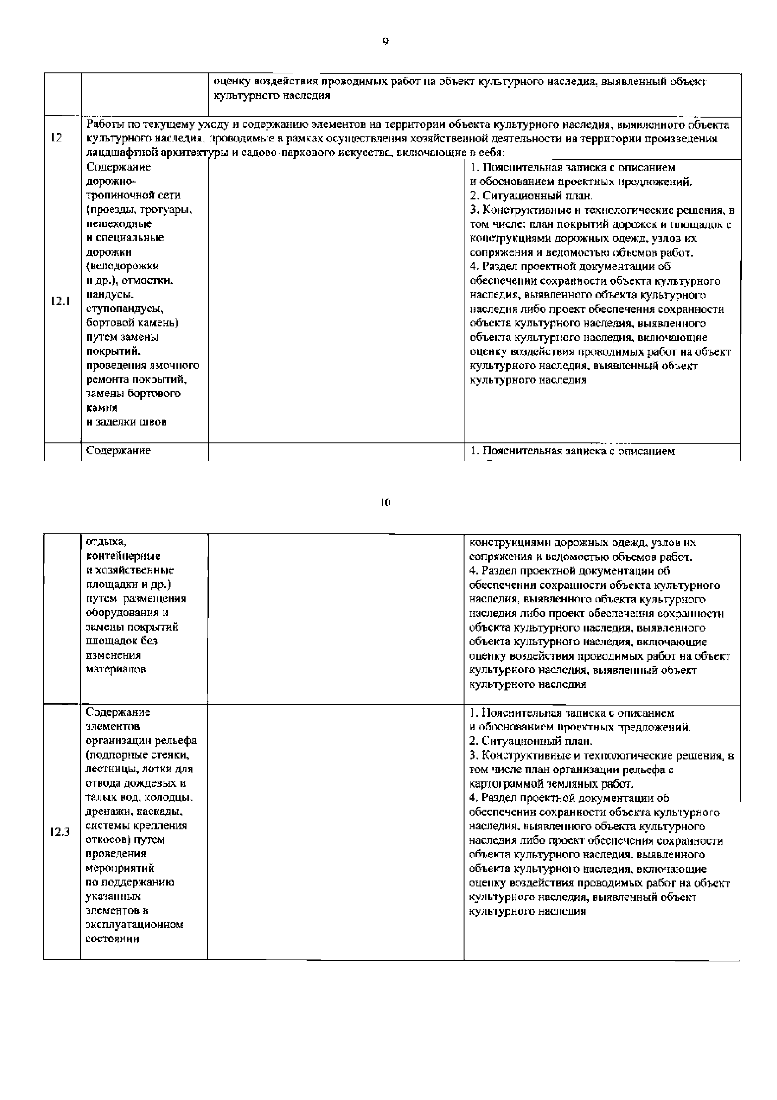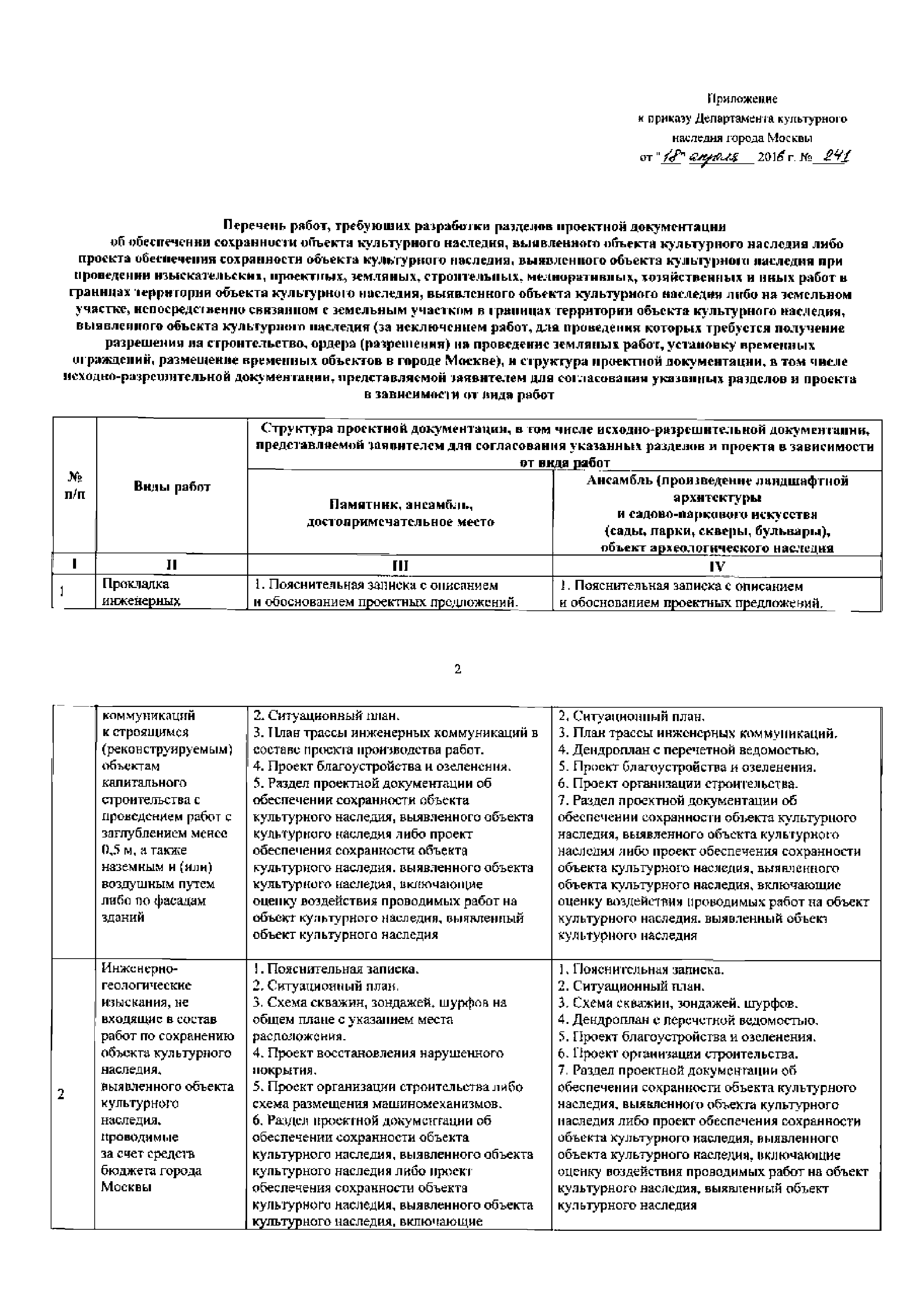 Перечень работ, требующих разработки разделов проектной документации об обеспечении сохранности объекта культурного наследия, выявленного объекта культурного наследия либо проекта обеспечения сохранности объекта культурного наследия, выявленного объекта культурного наследия при проведении изыскательских, проектных, земляных, строительных, мелиоративных, хозяйственных и иных работ в границах территории объекта культурного наследия, выявленного объекта культурного наследия либо на земельном участке, непосредственно связанном с земельным участком в границах территории объекта культурного наследия, выявленного объекта культурного наследия (за исключением работ, для проведения которых требуется получение разрешения на строительство, ордера (разрешения) на проведение земляных работ, установку временных ограждений, размещение временных объектов в городе Москве), и структура проектной документации, в том числе исходно-разрешительной документации, представляемой заявителем для согласования указанных разделов и проекта в зависимости от вида работ| Статус: | действует | | Название рус.: | Перечень работ, требующих разработки разделов проектной документации об обеспечении сохранности объекта культурного наследия, выявленного объекта культурного наследия либо проекта обеспечения сохранности объекта культурного наследия, выявленного объекта культурного наследия при проведении изыскательских, проектных, земляных, строительных, мелиоративных, хозяйственных и иных работ в границах территории объекта культурного наследия, выявленного объекта культурного наследия либо на земельном участке, непосредственно связанном с земельным участком в границах территории объекта культурного наследия, выявленного объекта культурного наследия (за исключением работ, для проведения которых требуется получение разрешения на строительство, ордера (разрешения) на проведение земляных работ, установку временных ограждений, размещение временных объектов в городе Москве), и структура проектной документации, в том числе исходно-разрешительной документации, представляемой заявителем для согласования указанных разделов и проекта в зависимости от вида работ | | Дата добавления в базу: | 01.02.2017 | | Дата актуализации: | 01.01.2021 | | Дата введения: | 18.04.2016 | | Утверждён: | 18.04.2016 Департамент культурного наследия г. Москвы (241)