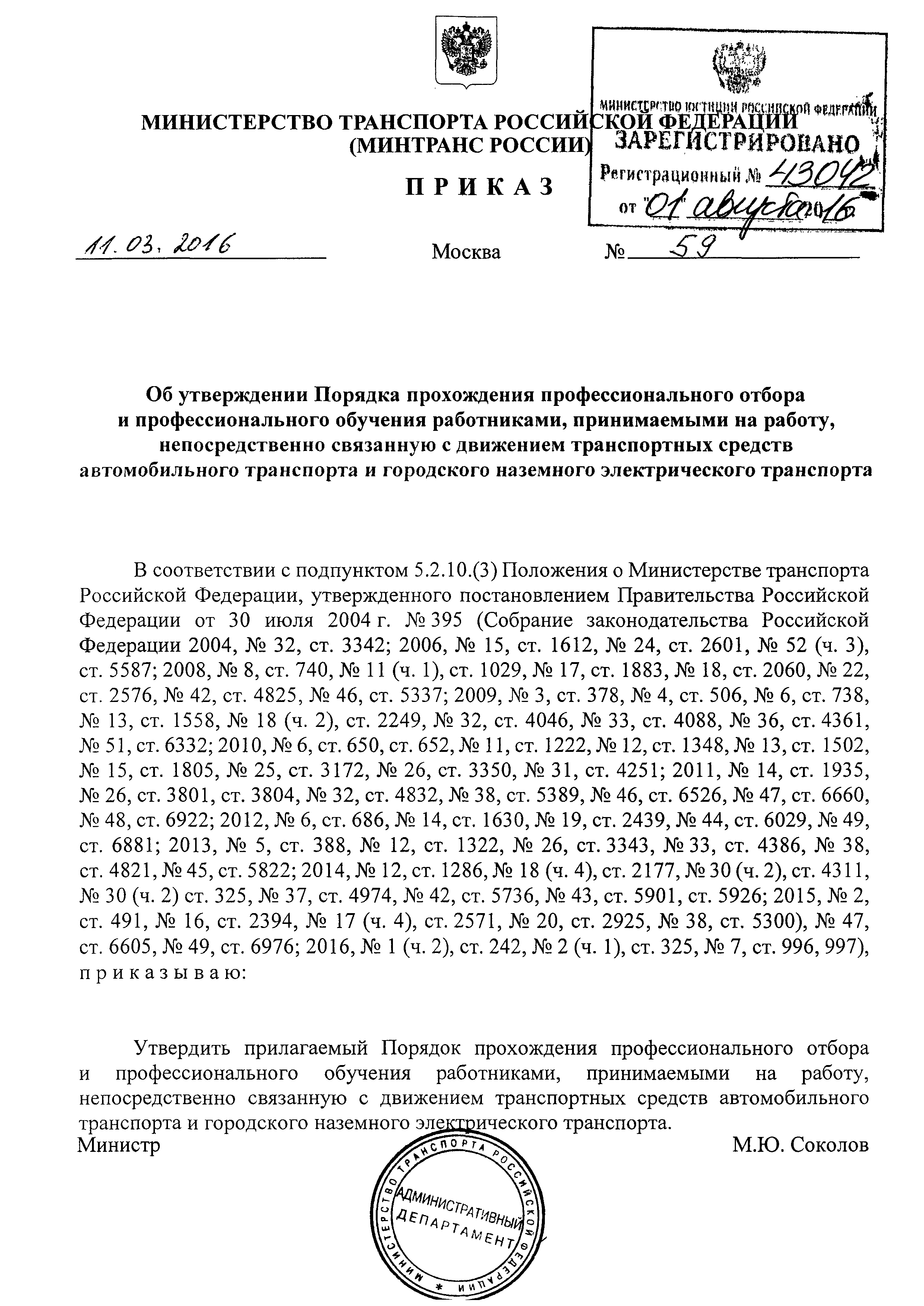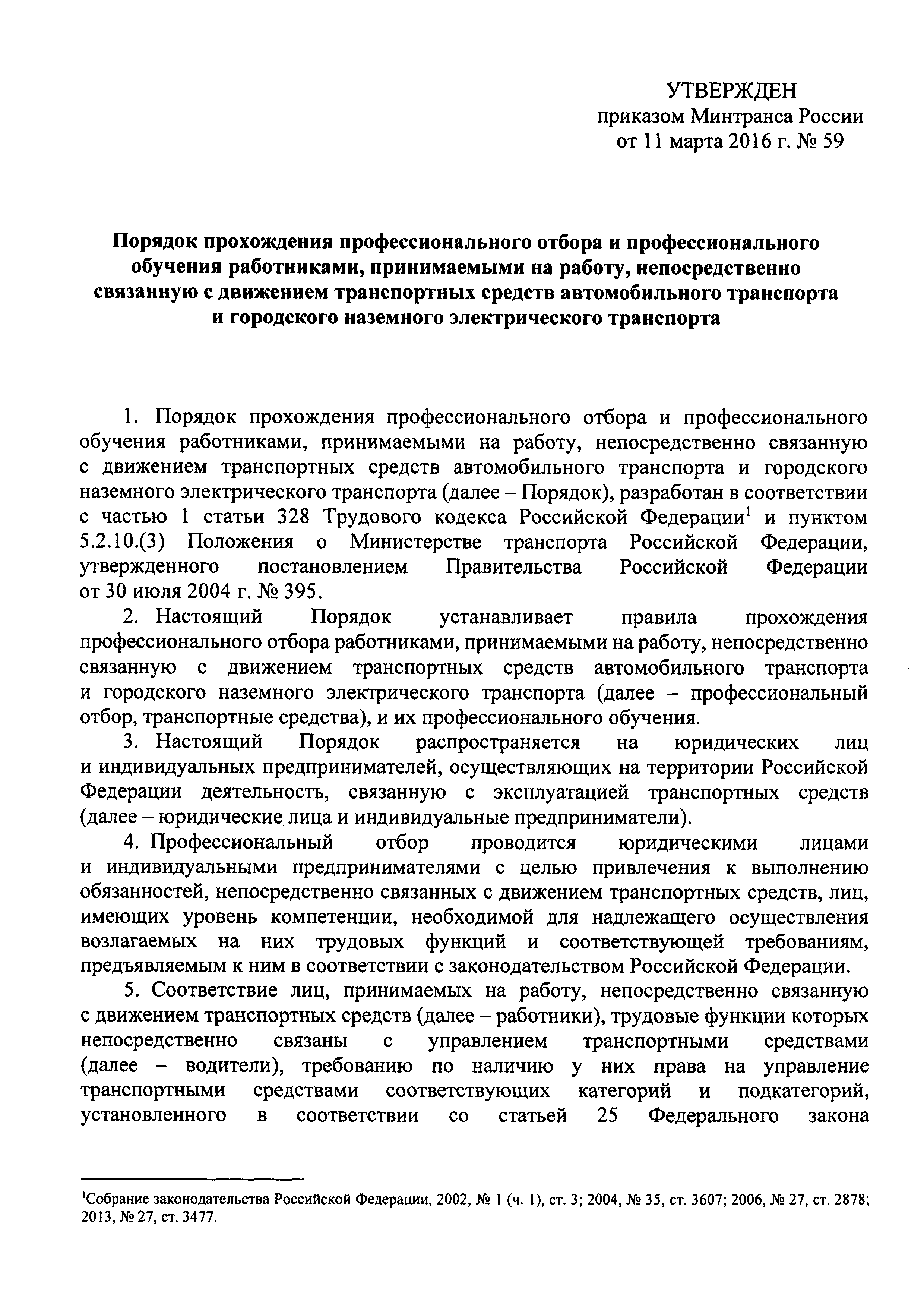 Порядок прохождения профессионального отбора и профессионального обучения работниками, принимаемыми на работу, непосредственно связанную с движением транспортных средств автомобильного транспорта и городского наземного электрического транспорта| Статус: | действует | | Название рус.: | Порядок прохождения профессионального отбора и профессионального обучения работниками, принимаемыми на работу, непосредственно связанную с движением транспортных средств автомобильного транспорта и городского наземного электрического транспорта | | Дата добавления в базу: | 01.02.2017 | | Дата актуализации: | 01.01.2021 | | Дата введения: | 12.08.2016 | | Дата окончания срока действия: | 01.01.2021 | | Область применения: | Порядок устанавливает правила прохождения профессионального отбора работниками, принимаемыми на работу, непосредственно связанную с движением транспортных средств автомобильного транспорта и городского наземного электрического транспорта, и их профессионального обучения | | Оглавление: | Об утверждении Порядка прохождения профессионального отбора и профессионального обучения работниками, принимаемыми на работу, непосредственно связанную с движением транспортных средств автомобильного транспорта и городского наземного электрического ... Порядок прохождения профессионального отбора и профессионального обучения работниками, принимаемыми на работу, непосредственно связанную с движением транспортных средств автомобильного транспорта и городского наземного электрического транспорта | | Утверждён: | 11.03.2016 Минтранс России (Russian Federation Mintrans 59)