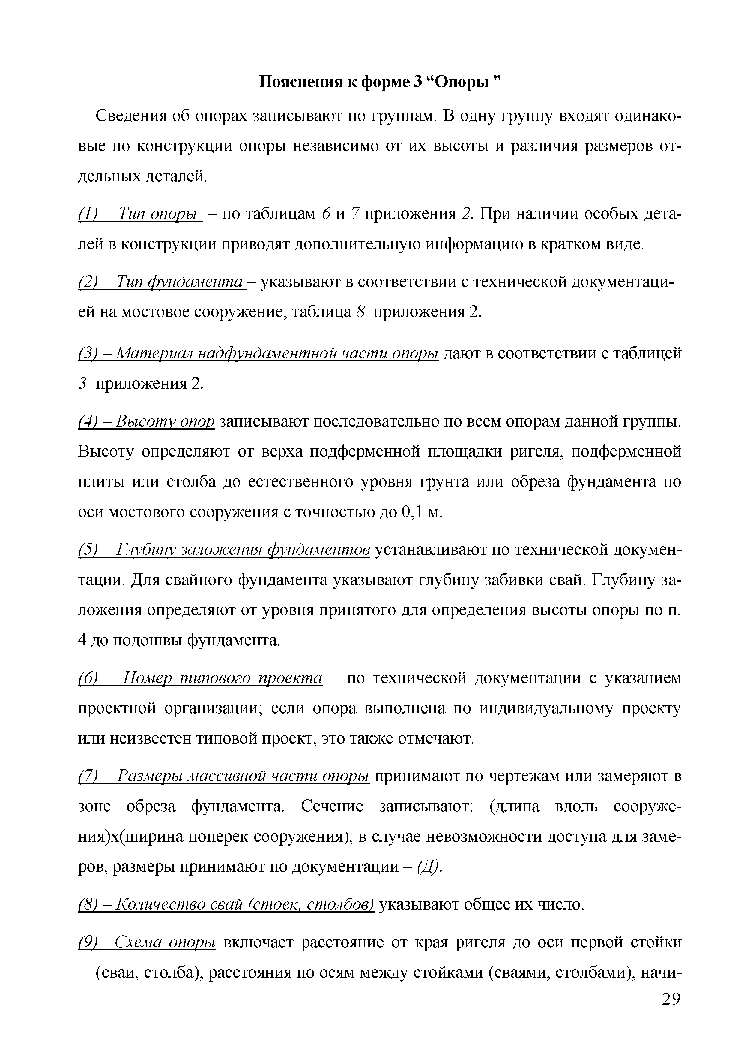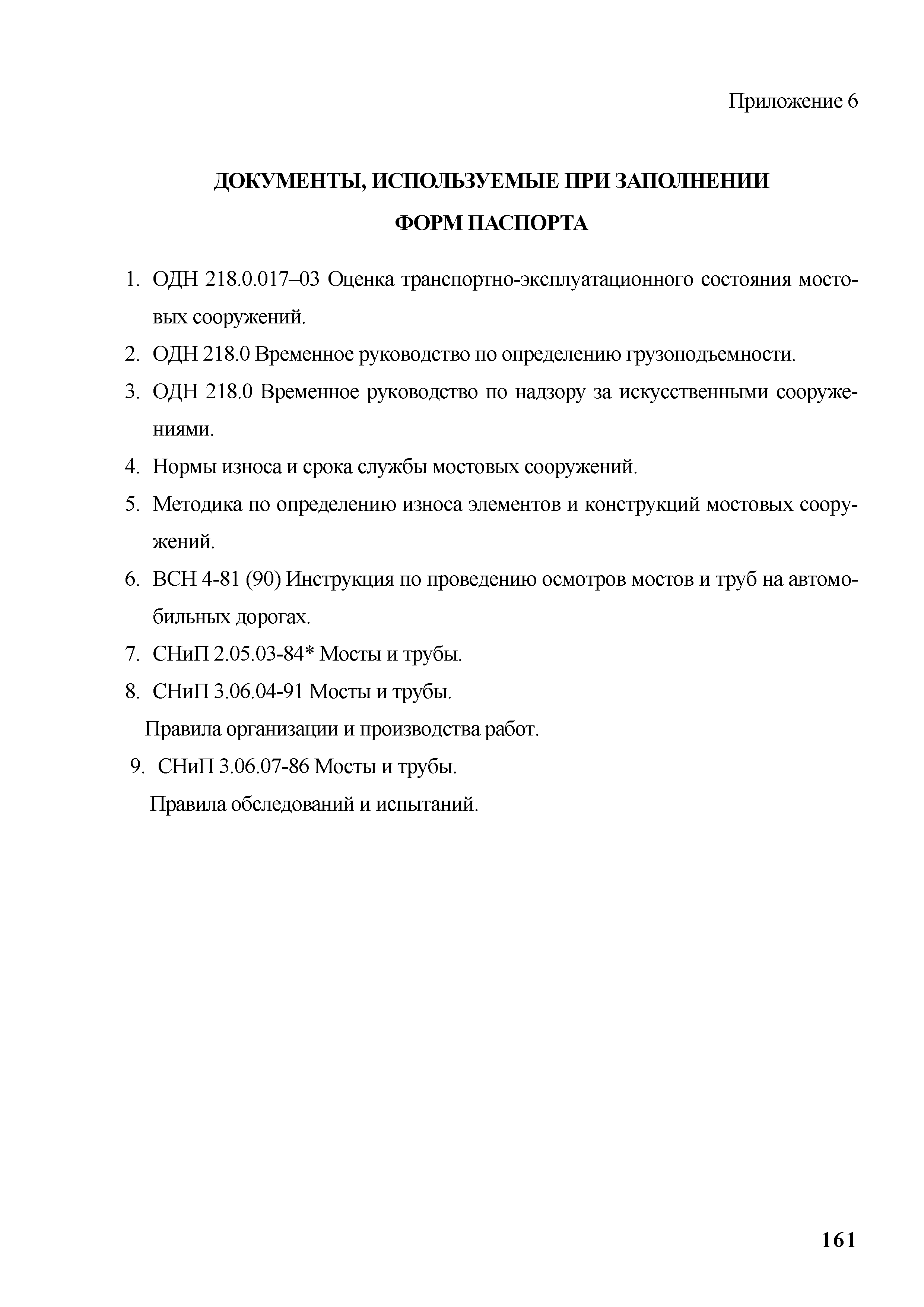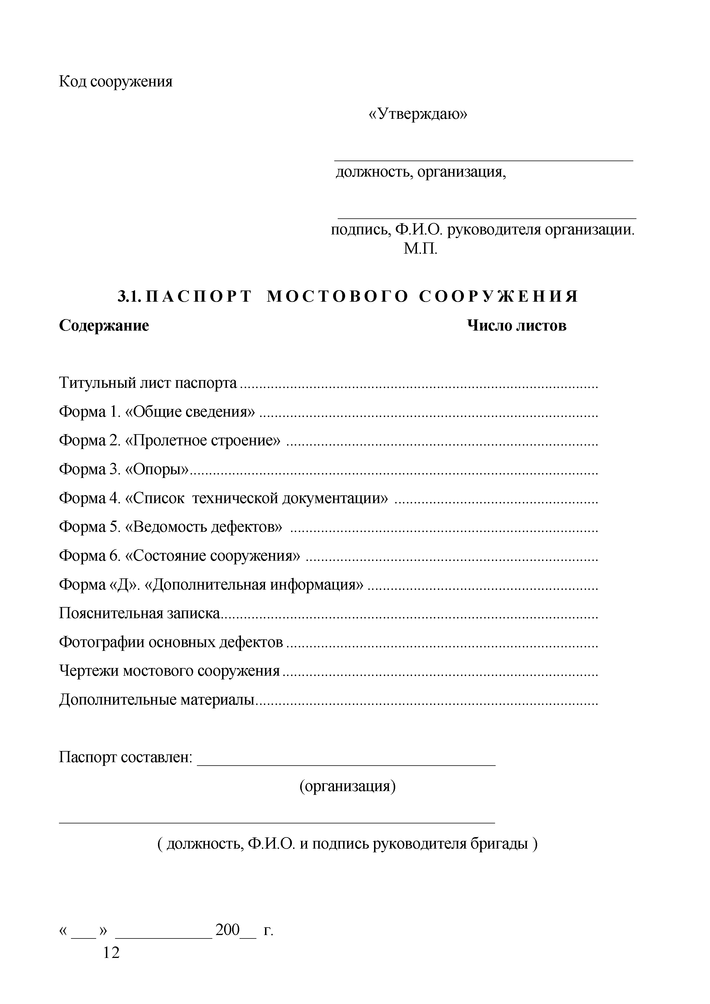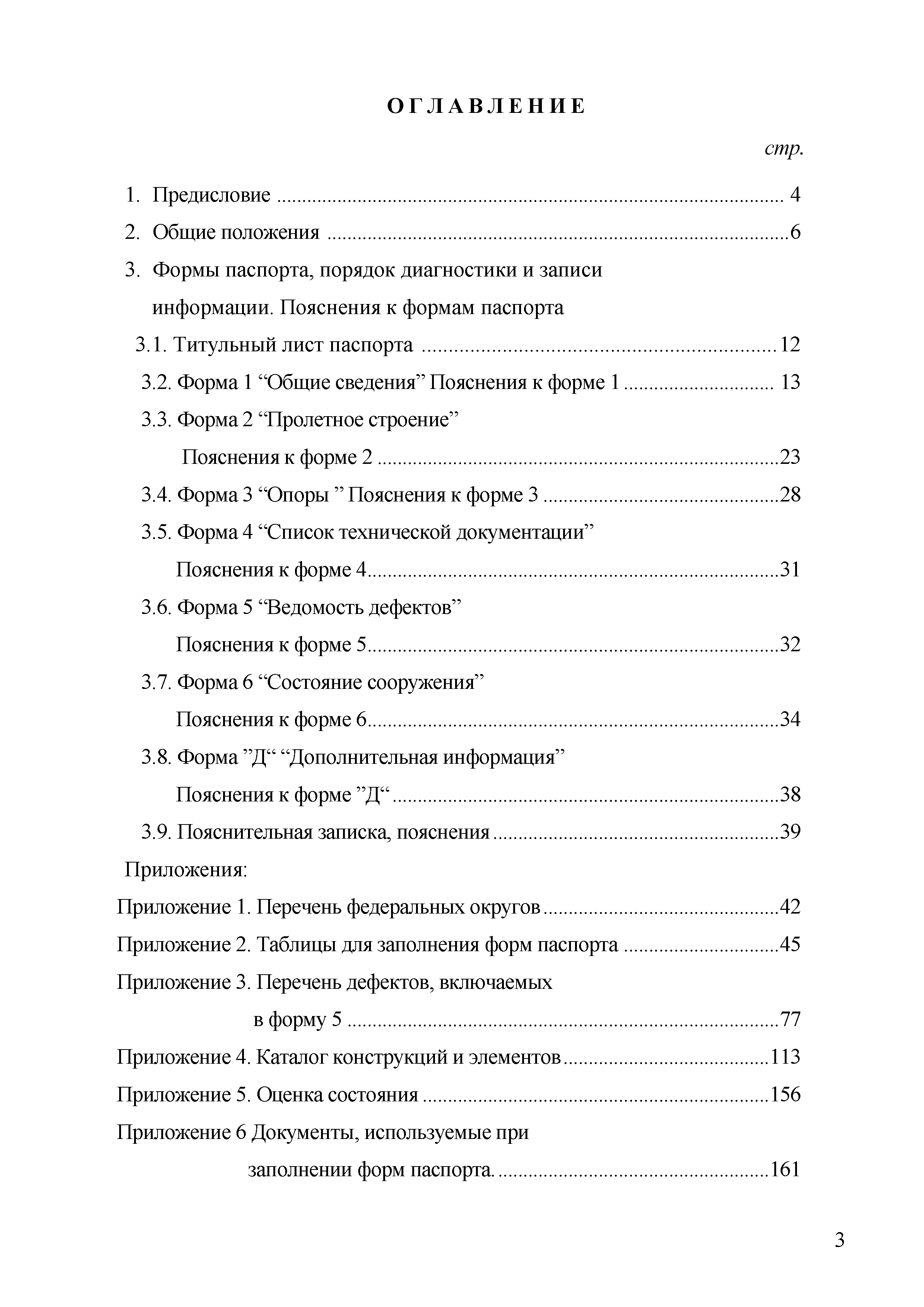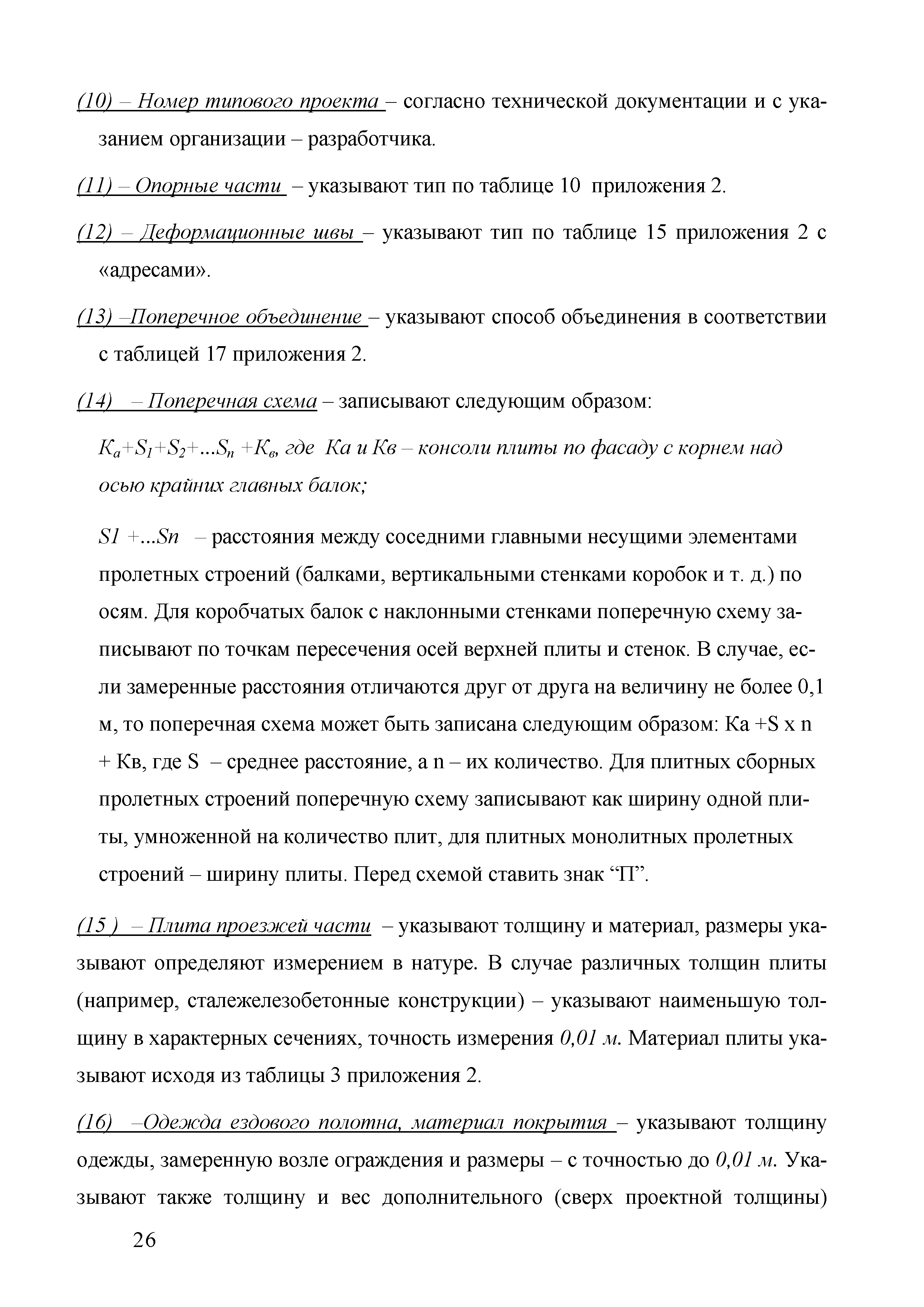 | Оглавление: | 1. Предисловие 2. Общие положения 3. Формы паспорта, порядок диагностики и записи информации. Пояснения к формам паспорта 3.1. Титульный лист паспорта 3.2. Форма 1. "Общие сведения". Пояснения к форме 1 3.3. Форма 2. "Пролетное строение". Пояснения к форме 2 3.4. Форма 3. "Опоры". Пояснения к форме 3 3.5. Форма 4. "Список технической документации". Пояснения к форме 4 3.6. Форма 5. "Ведомость дефектов". Пояснения к форме 5 3.7. Форма 6. "Состояние сооружения". Пояснения к форме 6 3.8. Форма Д. "Дополнительная информация". Пояснения к форме "Д" 3.9. Пояснительная записка, пояснения Приложение 1. Перечень федеральных округов Приложение 2. Таблицы для заполнения форм паспорта Приложение 3. Перечень дефектов, включаемых в форму 5 Приложение 4. Каталог конструкций и элементов Приложение 5. Оценка состояния Приложение 6. Документы, используемые при заполнении форм паспорта |