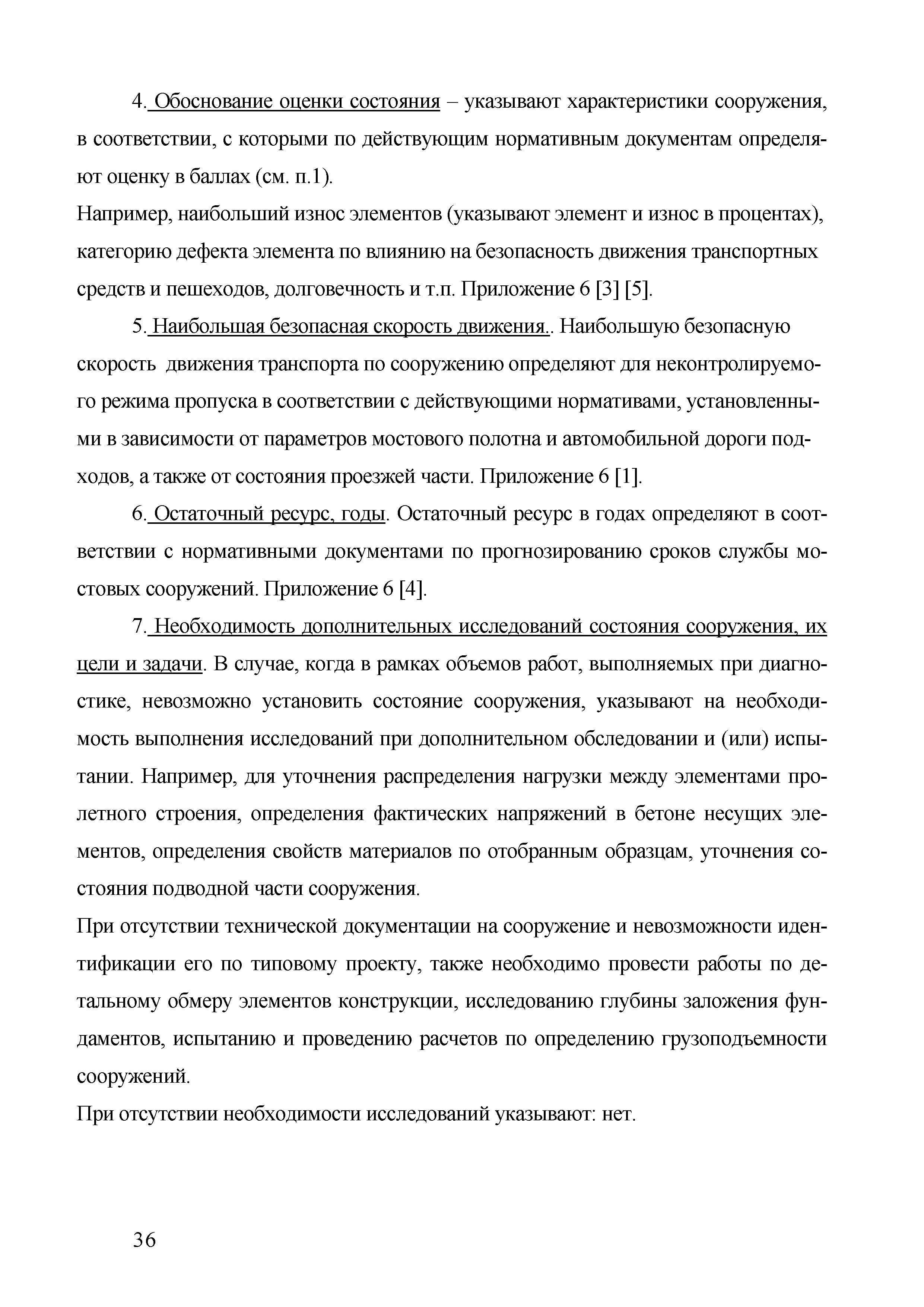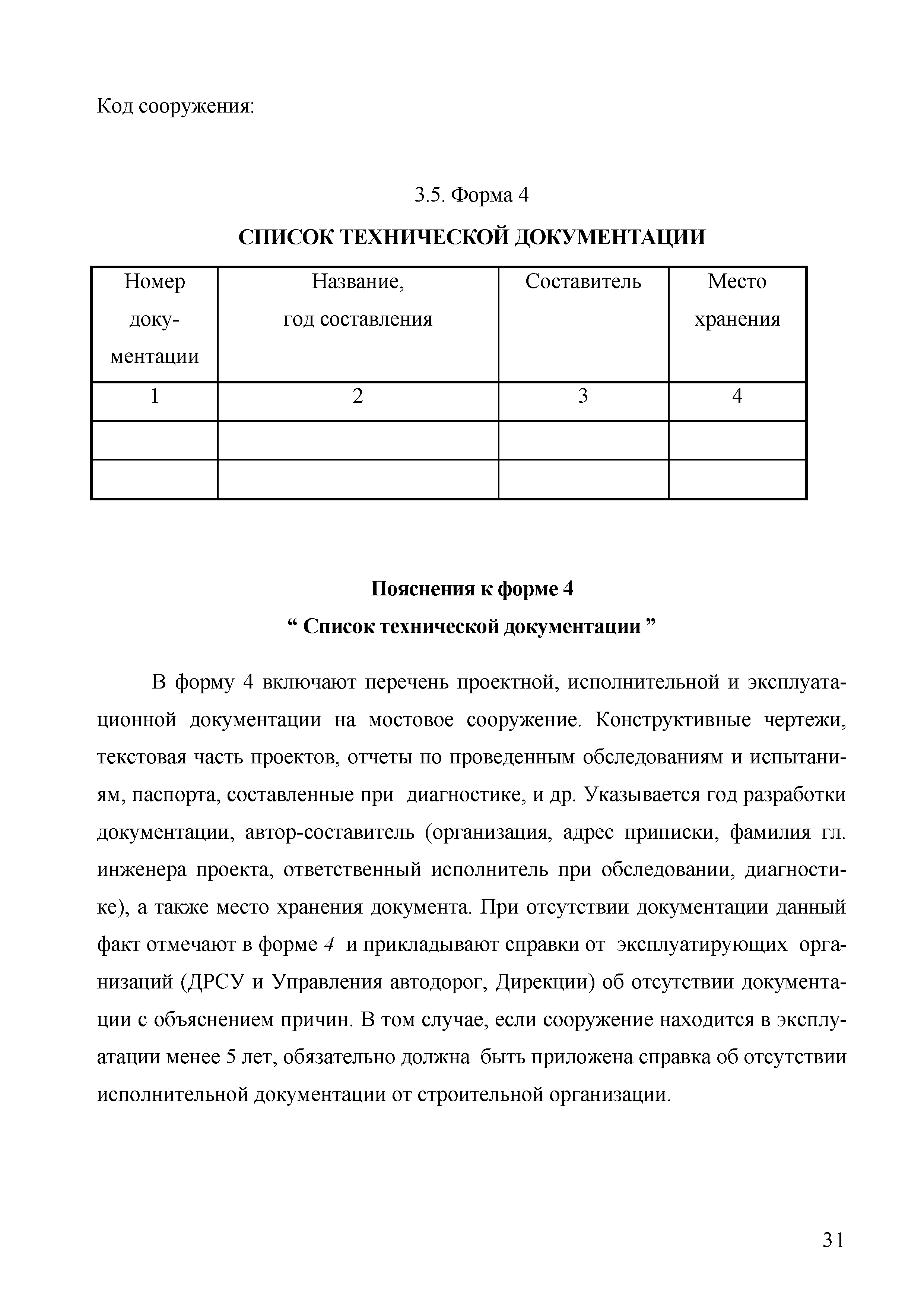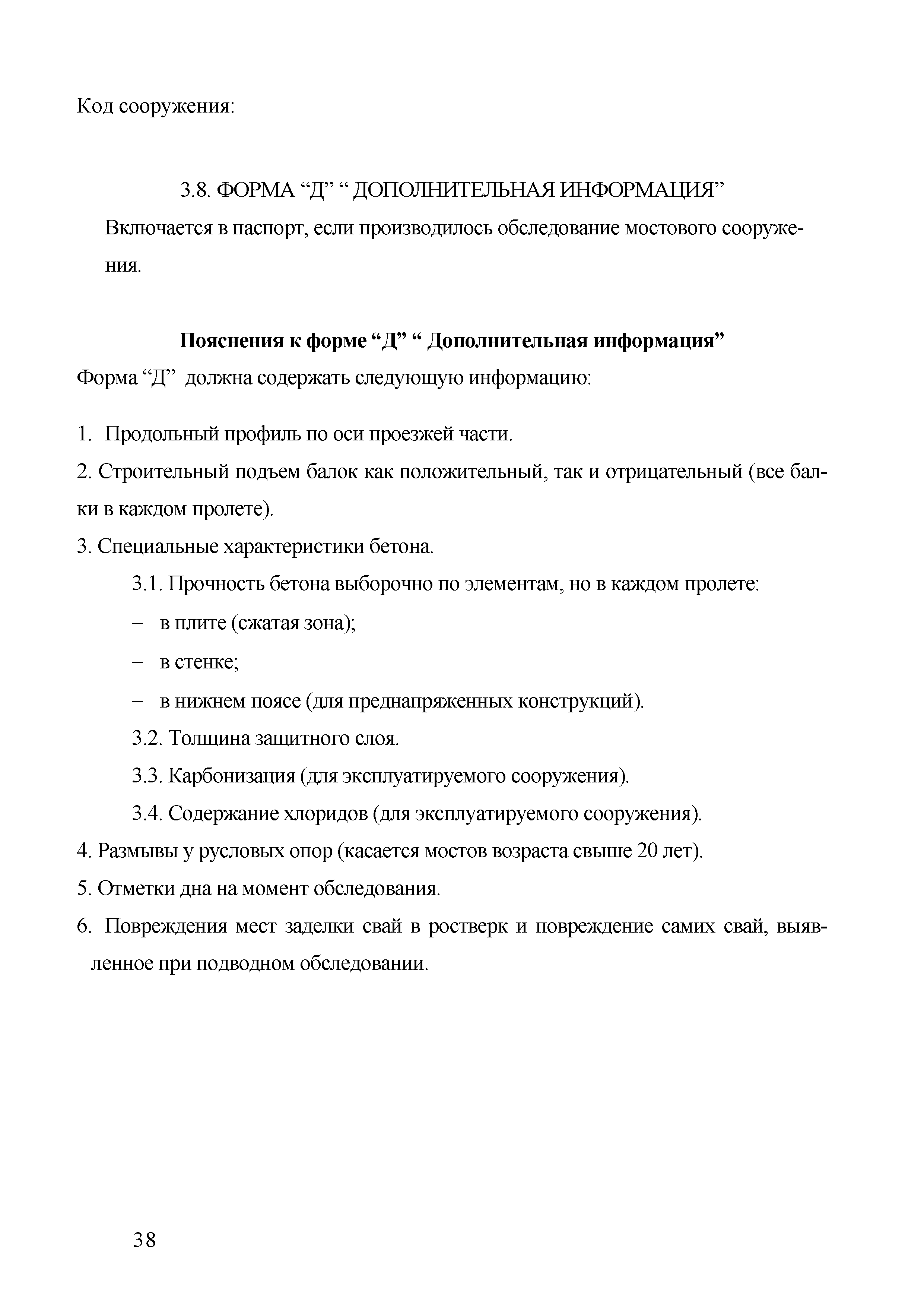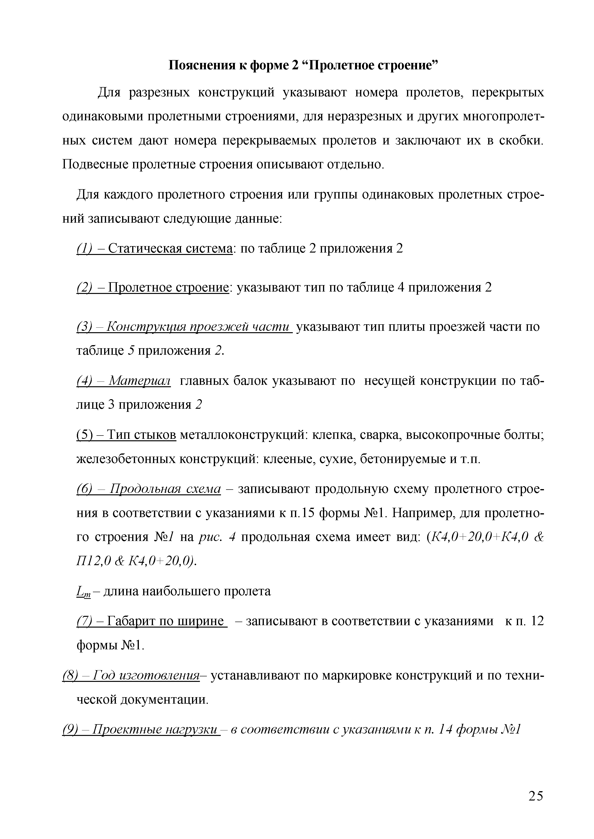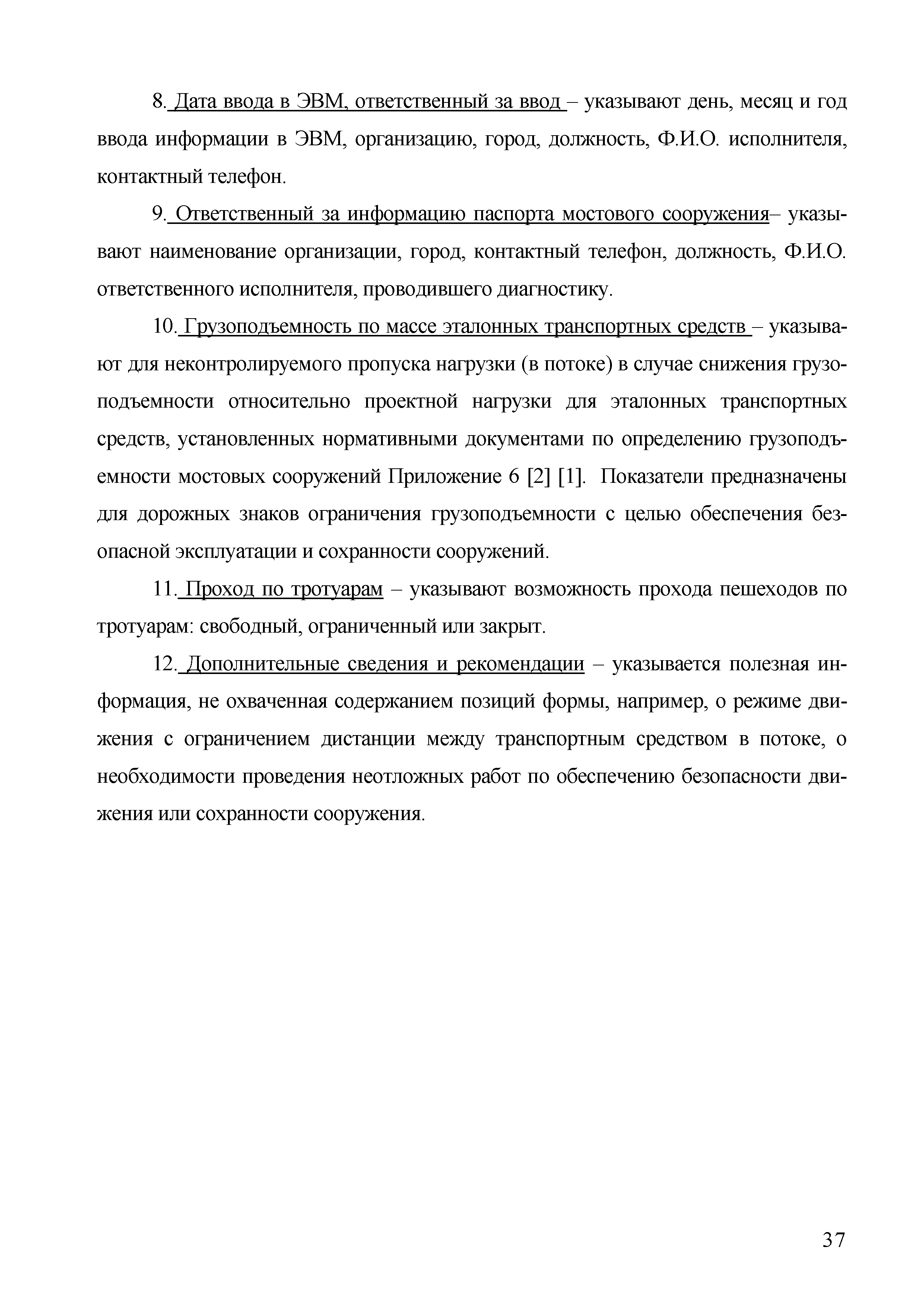 | Оглавление: | 1. Предисловие 2. Общие положения 3. Формы паспорта, порядок диагностики и записи информации. Пояснения к формам паспорта 3.1. Титульный лист паспорта 3.2. Форма 1. "Общие сведения". Пояснения к форме 1 3.3. Форма 2. "Пролетное строение". Пояснения к форме 2 3.4. Форма 3. "Опоры". Пояснения к форме 3 3.5. Форма 4. "Список технической документации". Пояснения к форме 4 3.6. Форма 5. "Ведомость дефектов". Пояснения к форме 5 3.7. Форма 6. "Состояние сооружения". Пояснения к форме 6 3.8. Форма Д. "Дополнительная информация". Пояснения к форме "Д" 3.9. Пояснительная записка, пояснения Приложение 1. Перечень федеральных округов Приложение 2. Таблицы для заполнения форм паспорта Приложение 3. Перечень дефектов, включаемых в форму 5 Приложение 4. Каталог конструкций и элементов Приложение 5. Оценка состояния Приложение 6. Документы, используемые при заполнении форм паспорта |
