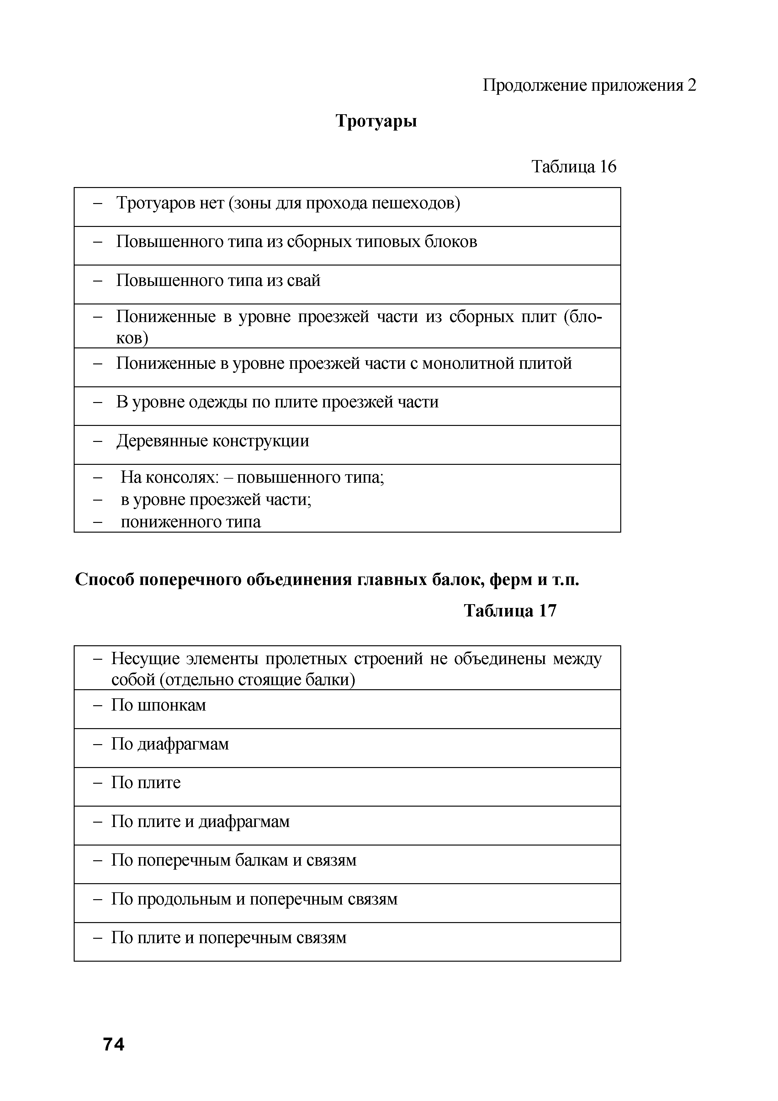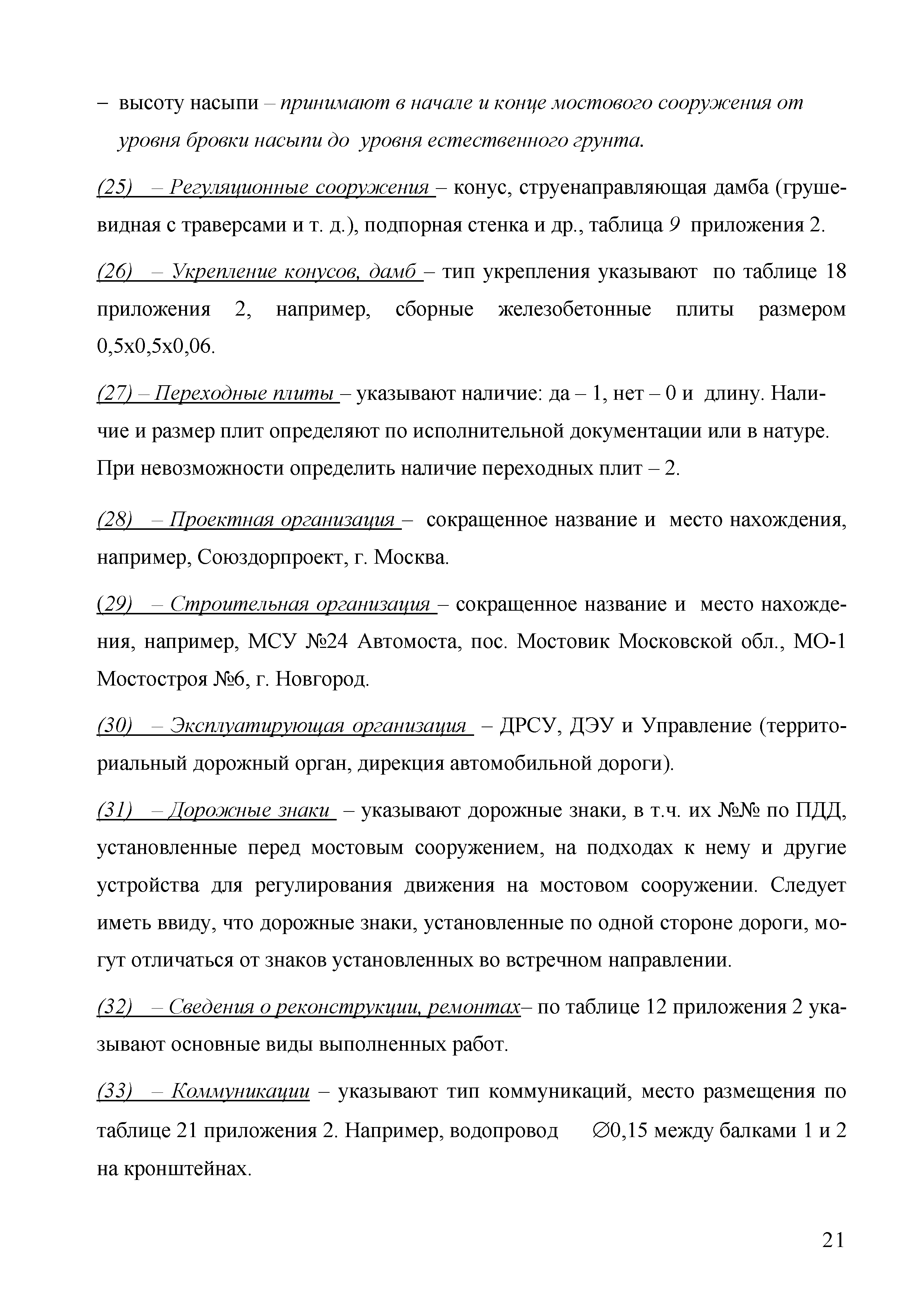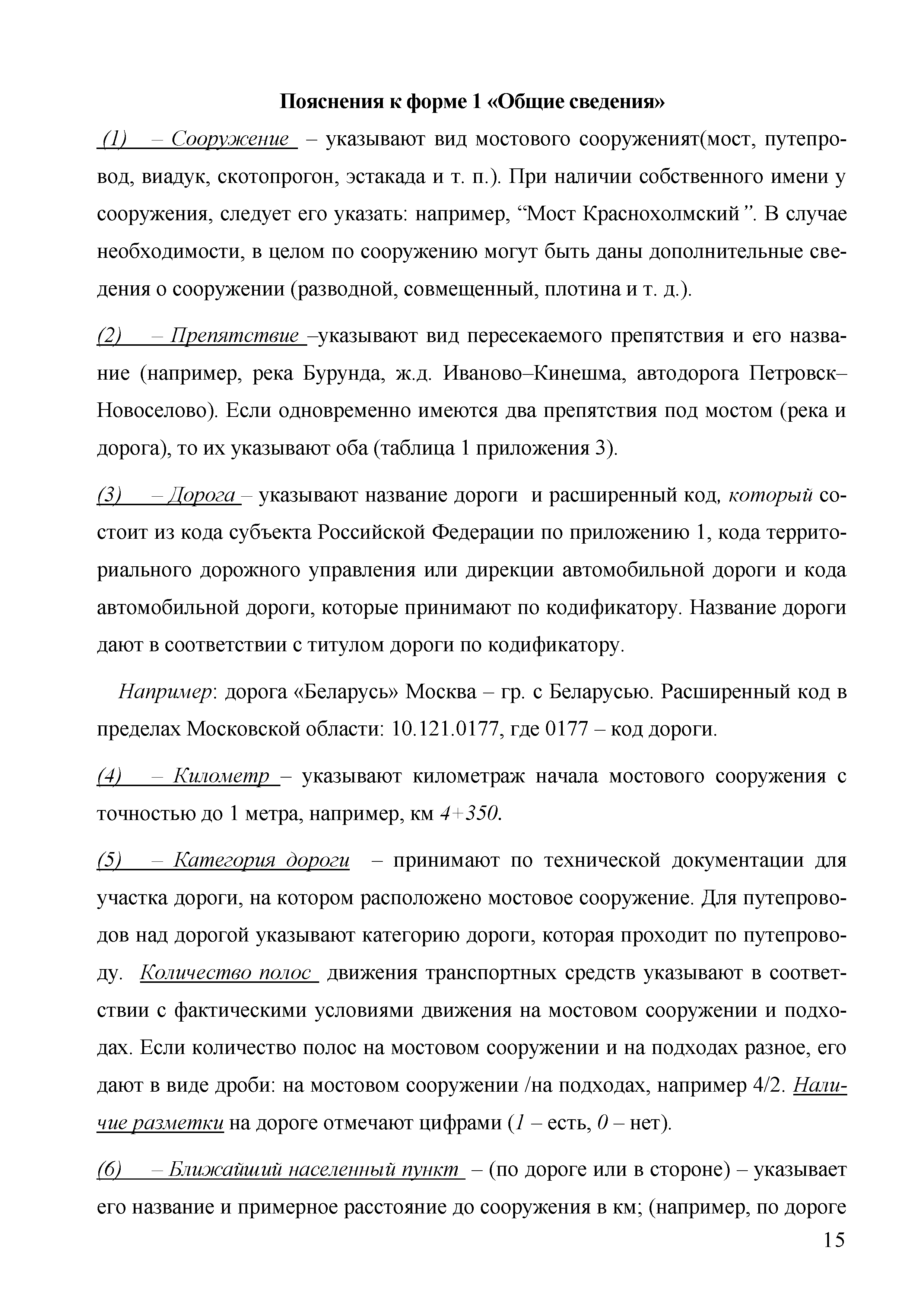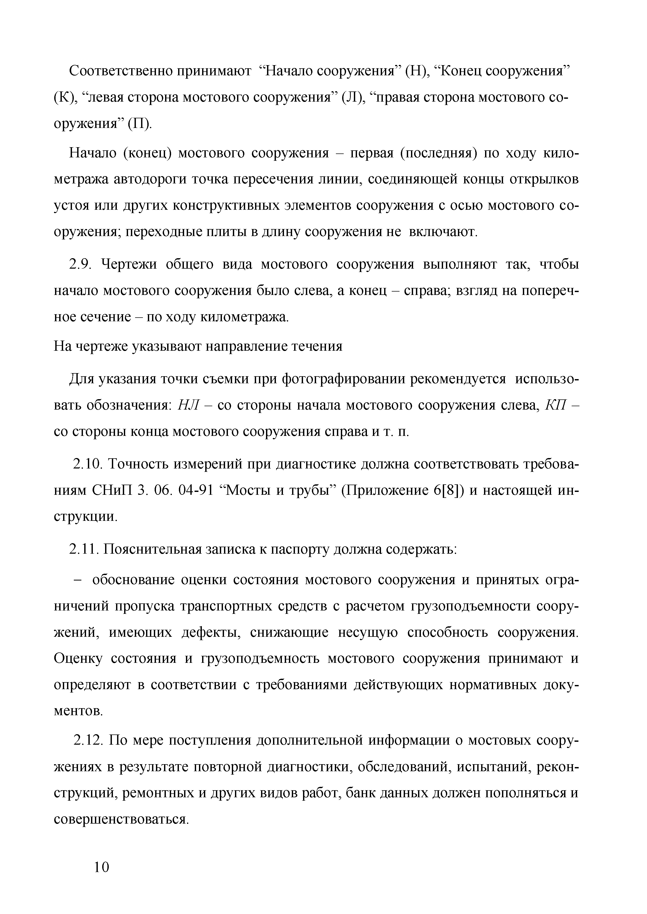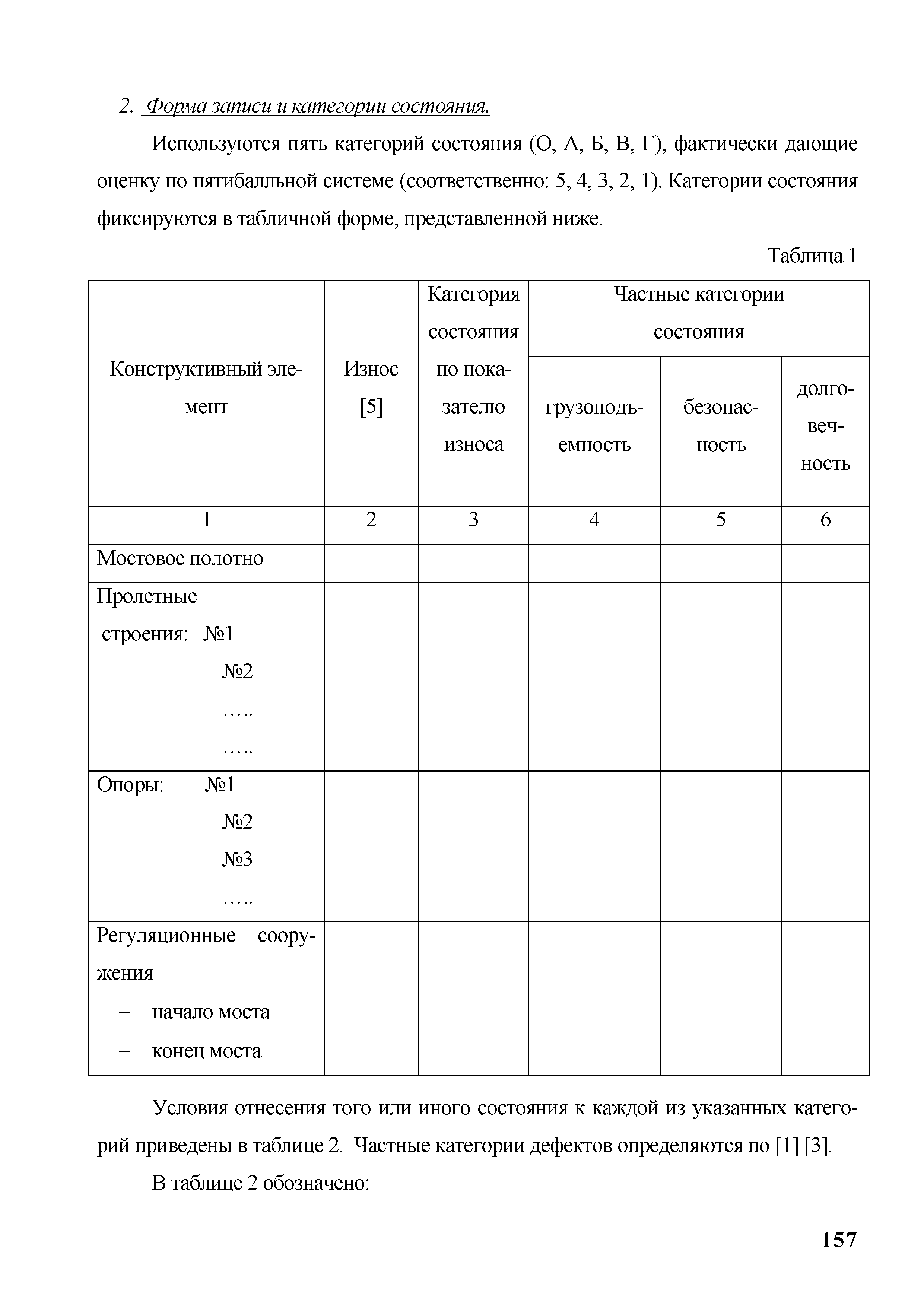| Оглавление: | 1. Предисловие 2. Общие положения 3. Формы паспорта, порядок диагностики и записи информации. Пояснения к формам паспорта 3.1. Титульный лист паспорта 3.2. Форма 1. "Общие сведения". Пояснения к форме 1 3.3. Форма 2. "Пролетное строение". Пояснения к форме 2 3.4. Форма 3. "Опоры". Пояснения к форме 3 3.5. Форма 4. "Список технической документации". Пояснения к форме 4 3.6. Форма 5. "Ведомость дефектов". Пояснения к форме 5 3.7. Форма 6. "Состояние сооружения". Пояснения к форме 6 3.8. Форма Д. "Дополнительная информация". Пояснения к форме "Д" 3.9. Пояснительная записка, пояснения Приложение 1. Перечень федеральных округов Приложение 2. Таблицы для заполнения форм паспорта Приложение 3. Перечень дефектов, включаемых в форму 5 Приложение 4. Каталог конструкций и элементов Приложение 5. Оценка состояния Приложение 6. Документы, используемые при заполнении форм паспорта |