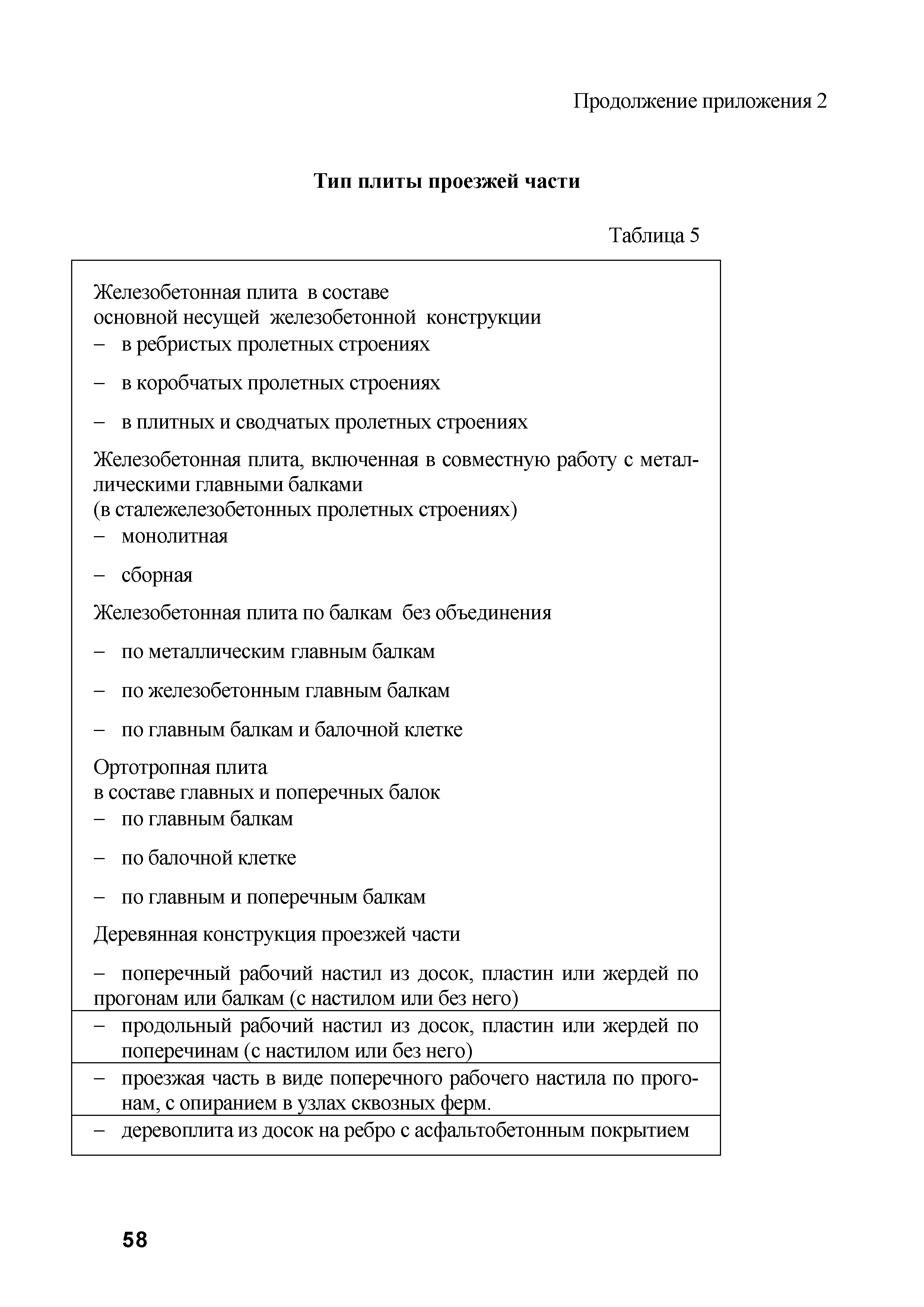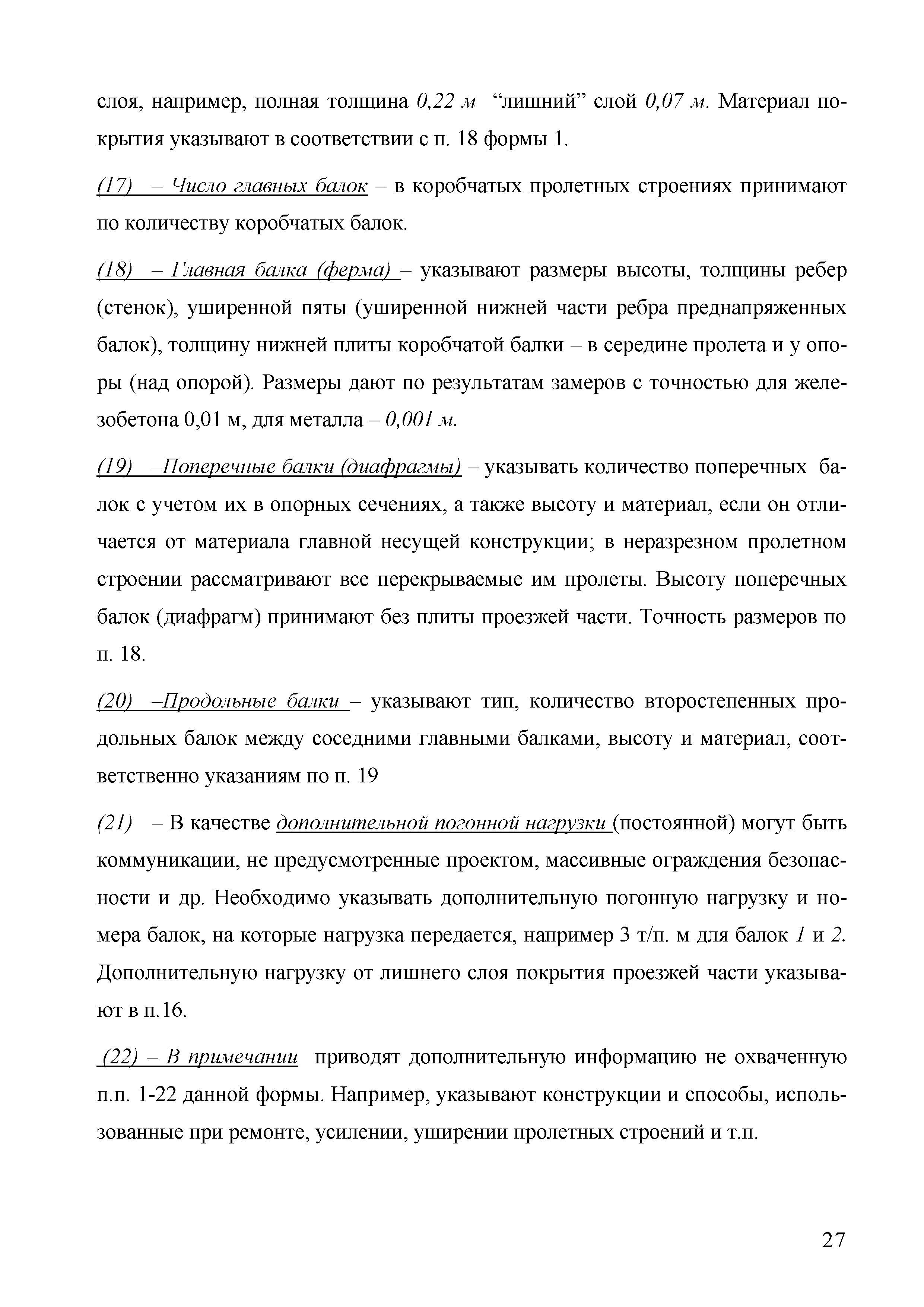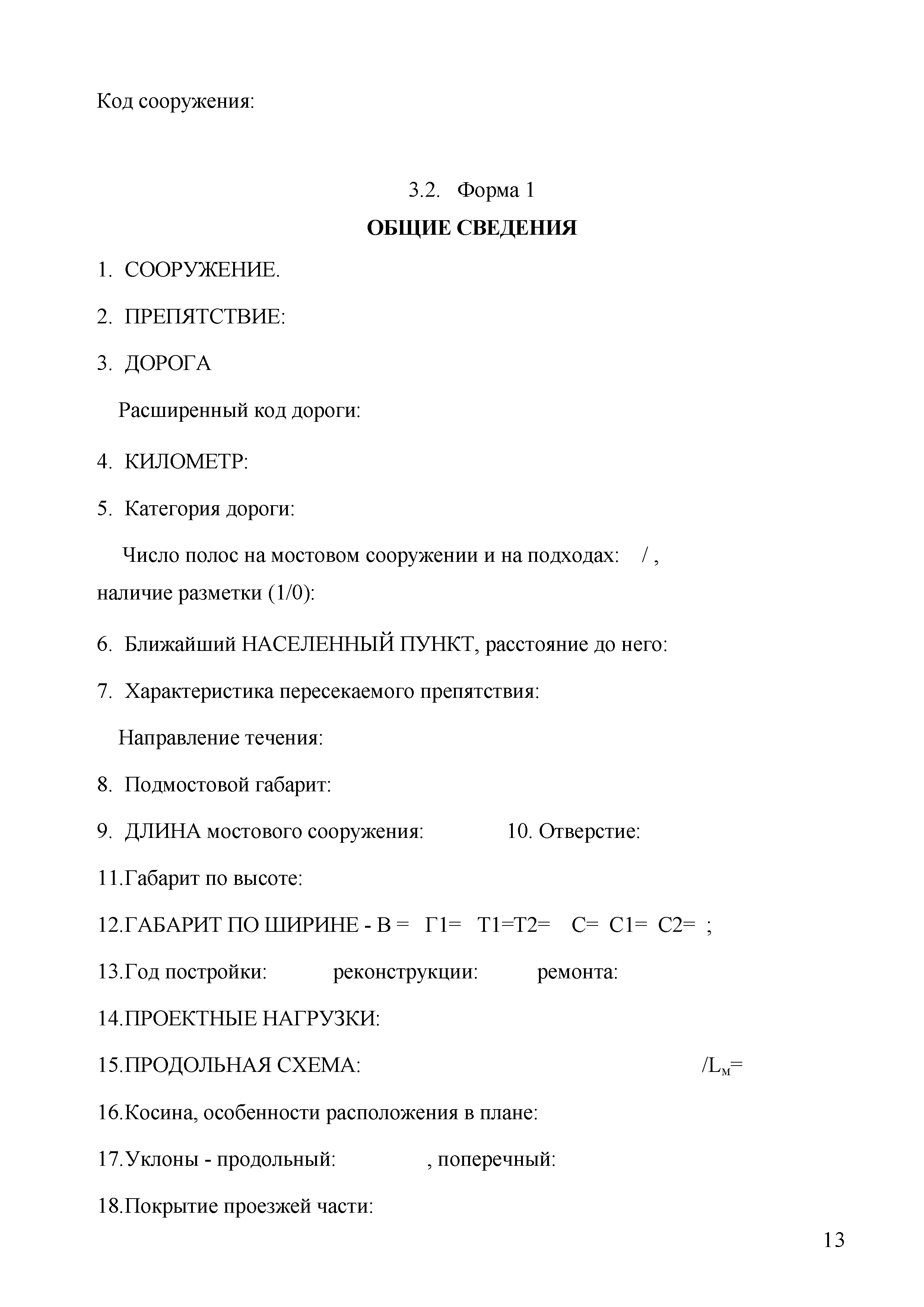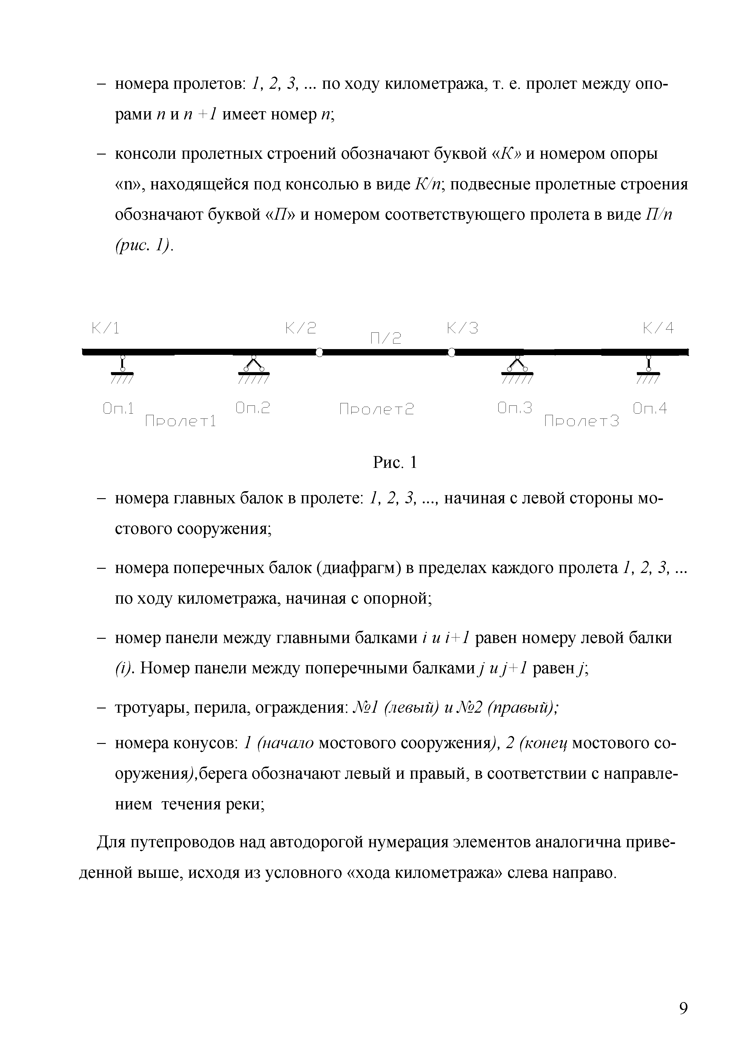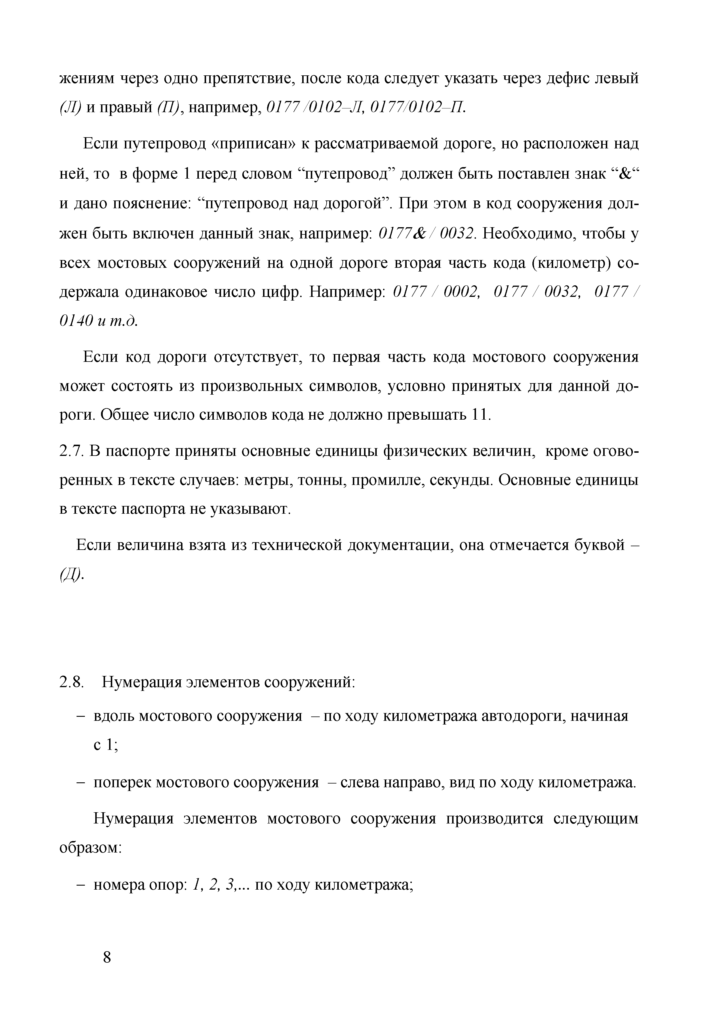 | Оглавление: | 1. Предисловие 2. Общие положения 3. Формы паспорта, порядок диагностики и записи информации. Пояснения к формам паспорта 3.1. Титульный лист паспорта 3.2. Форма 1. "Общие сведения". Пояснения к форме 1 3.3. Форма 2. "Пролетное строение". Пояснения к форме 2 3.4. Форма 3. "Опоры". Пояснения к форме 3 3.5. Форма 4. "Список технической документации". Пояснения к форме 4 3.6. Форма 5. "Ведомость дефектов". Пояснения к форме 5 3.7. Форма 6. "Состояние сооружения". Пояснения к форме 6 3.8. Форма Д. "Дополнительная информация". Пояснения к форме "Д" 3.9. Пояснительная записка, пояснения Приложение 1. Перечень федеральных округов Приложение 2. Таблицы для заполнения форм паспорта Приложение 3. Перечень дефектов, включаемых в форму 5 Приложение 4. Каталог конструкций и элементов Приложение 5. Оценка состояния Приложение 6. Документы, используемые при заполнении форм паспорта |