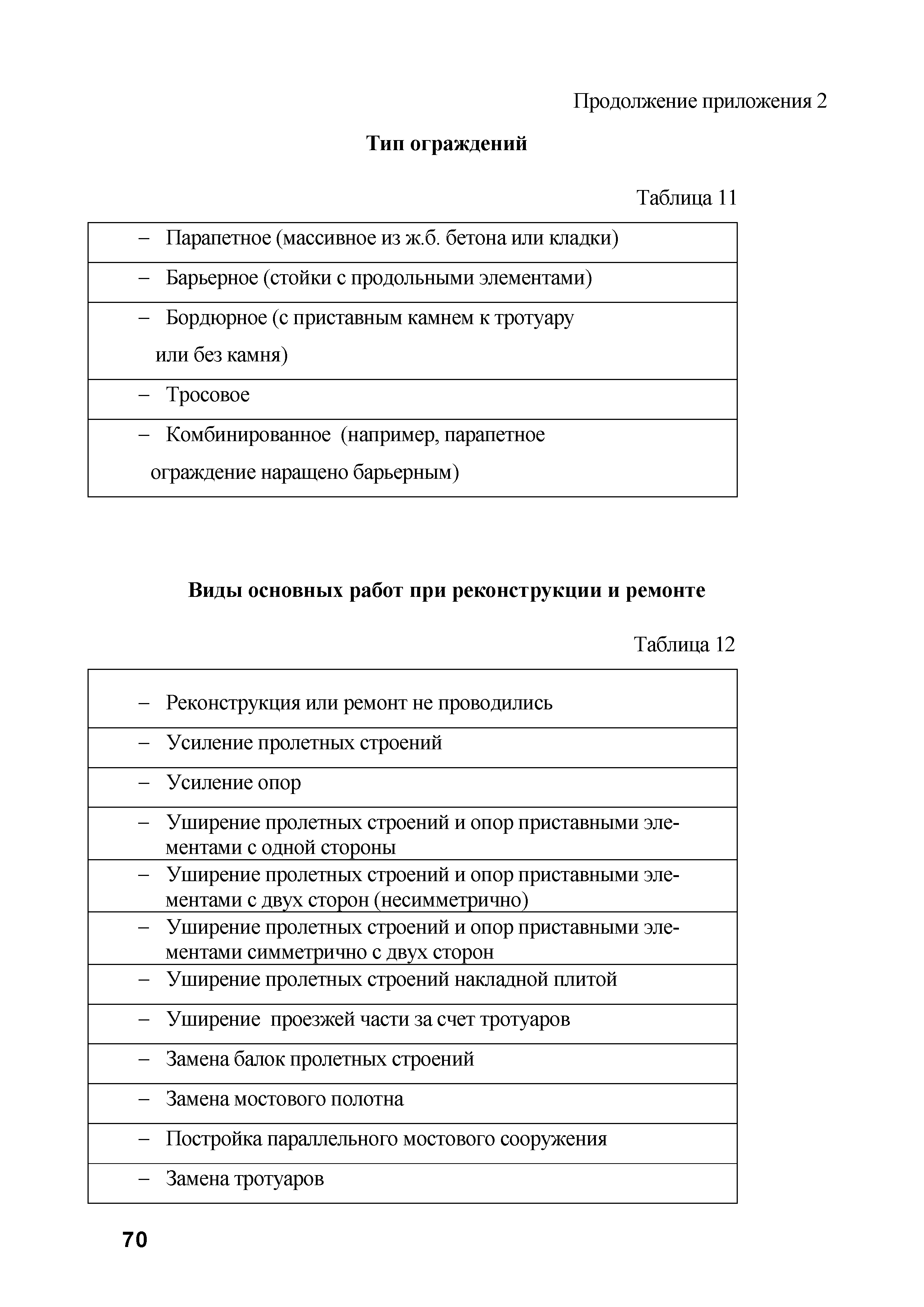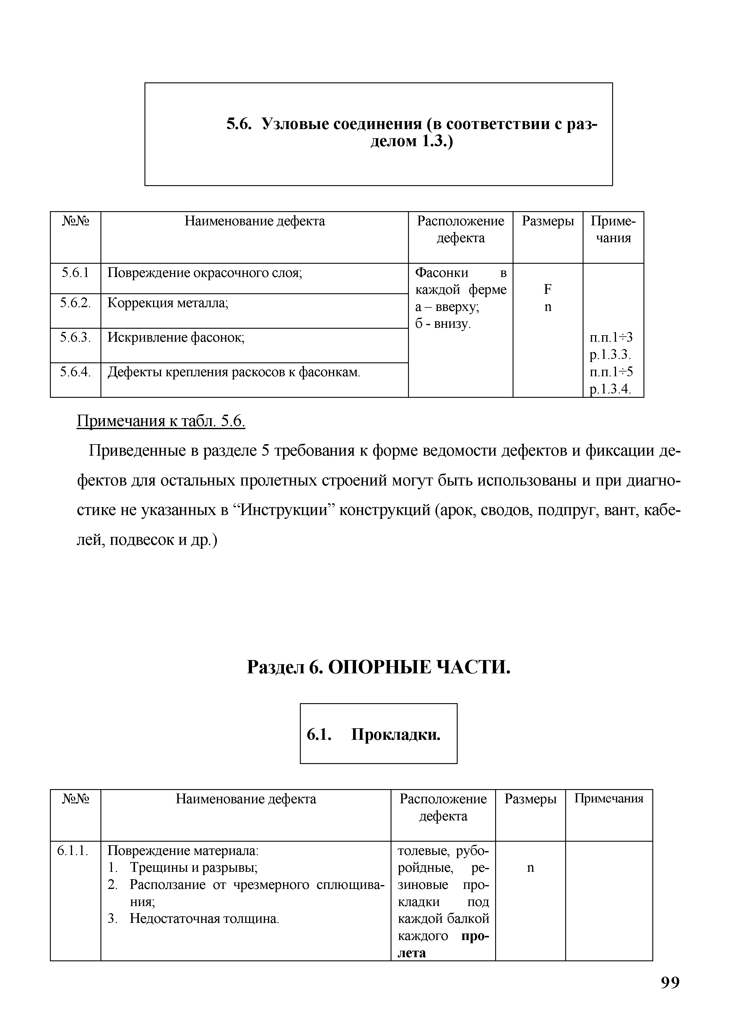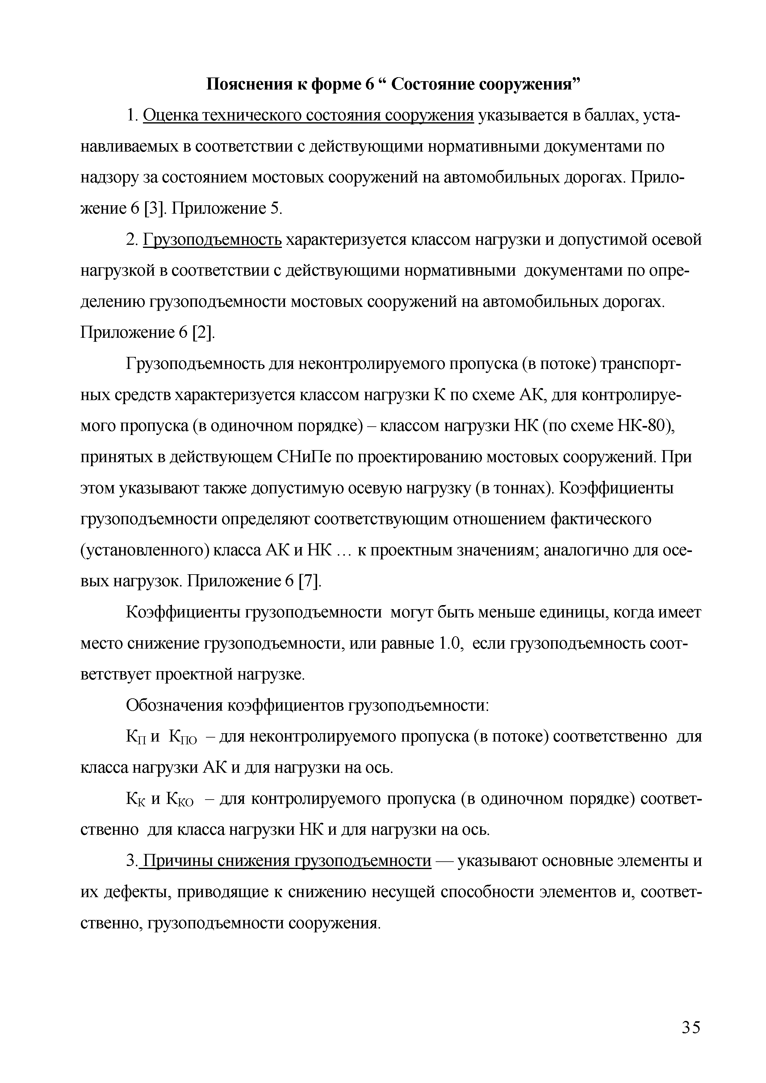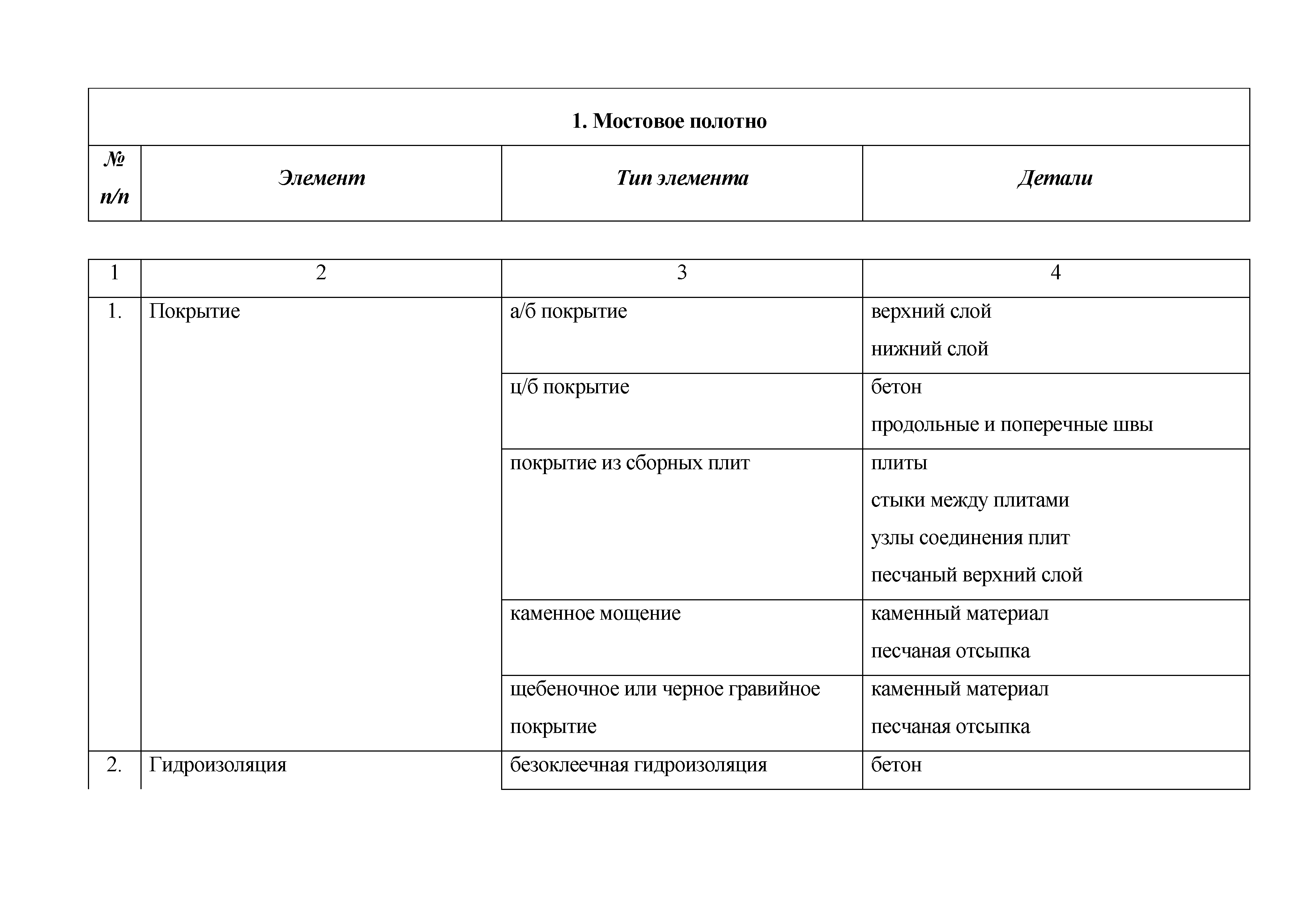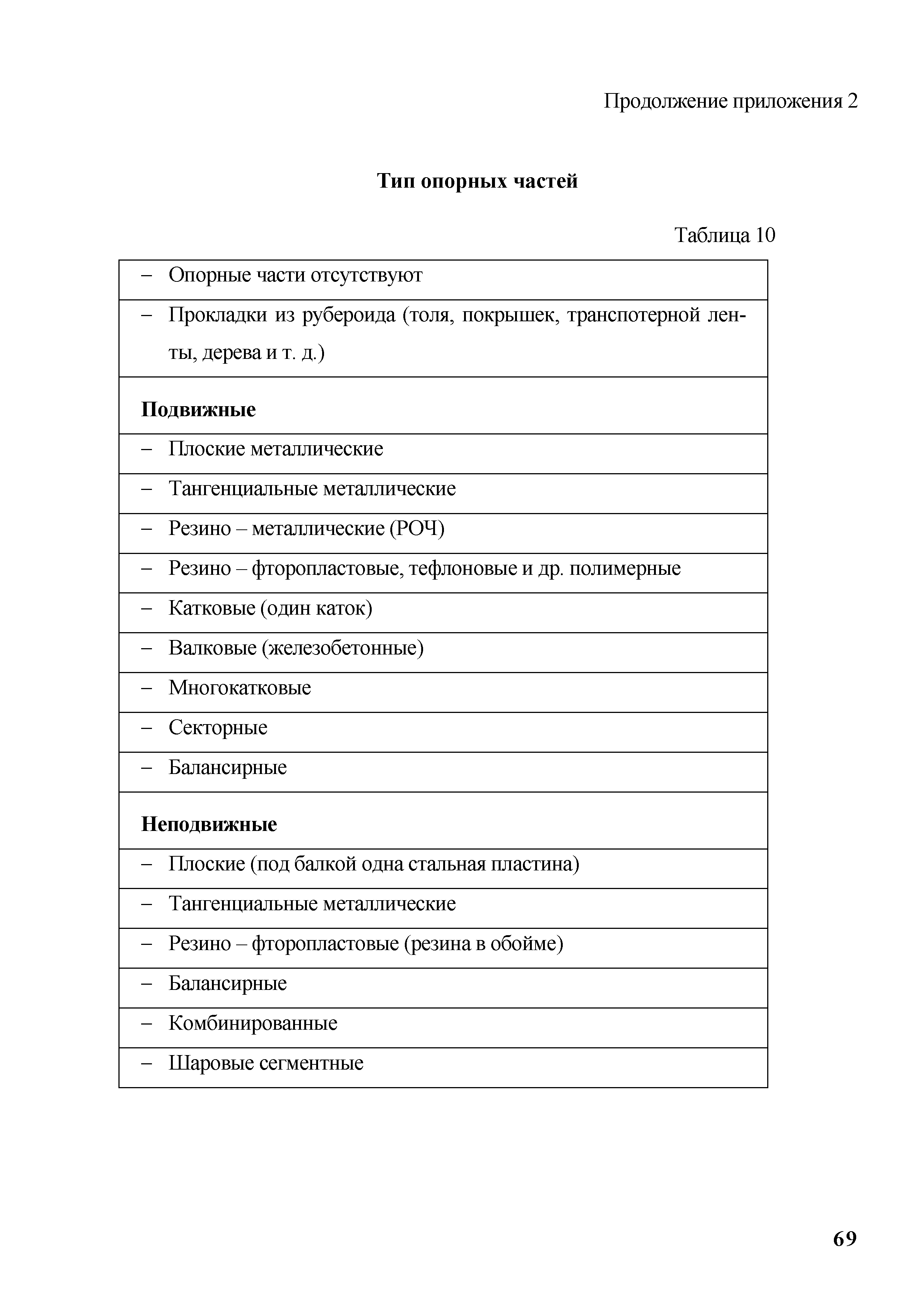 | Оглавление: | 1. Предисловие 2. Общие положения 3. Формы паспорта, порядок диагностики и записи информации. Пояснения к формам паспорта 3.1. Титульный лист паспорта 3.2. Форма 1. "Общие сведения". Пояснения к форме 1 3.3. Форма 2. "Пролетное строение". Пояснения к форме 2 3.4. Форма 3. "Опоры". Пояснения к форме 3 3.5. Форма 4. "Список технической документации". Пояснения к форме 4 3.6. Форма 5. "Ведомость дефектов". Пояснения к форме 5 3.7. Форма 6. "Состояние сооружения". Пояснения к форме 6 3.8. Форма Д. "Дополнительная информация". Пояснения к форме "Д" 3.9. Пояснительная записка, пояснения Приложение 1. Перечень федеральных округов Приложение 2. Таблицы для заполнения форм паспорта Приложение 3. Перечень дефектов, включаемых в форму 5 Приложение 4. Каталог конструкций и элементов Приложение 5. Оценка состояния Приложение 6. Документы, используемые при заполнении форм паспорта |