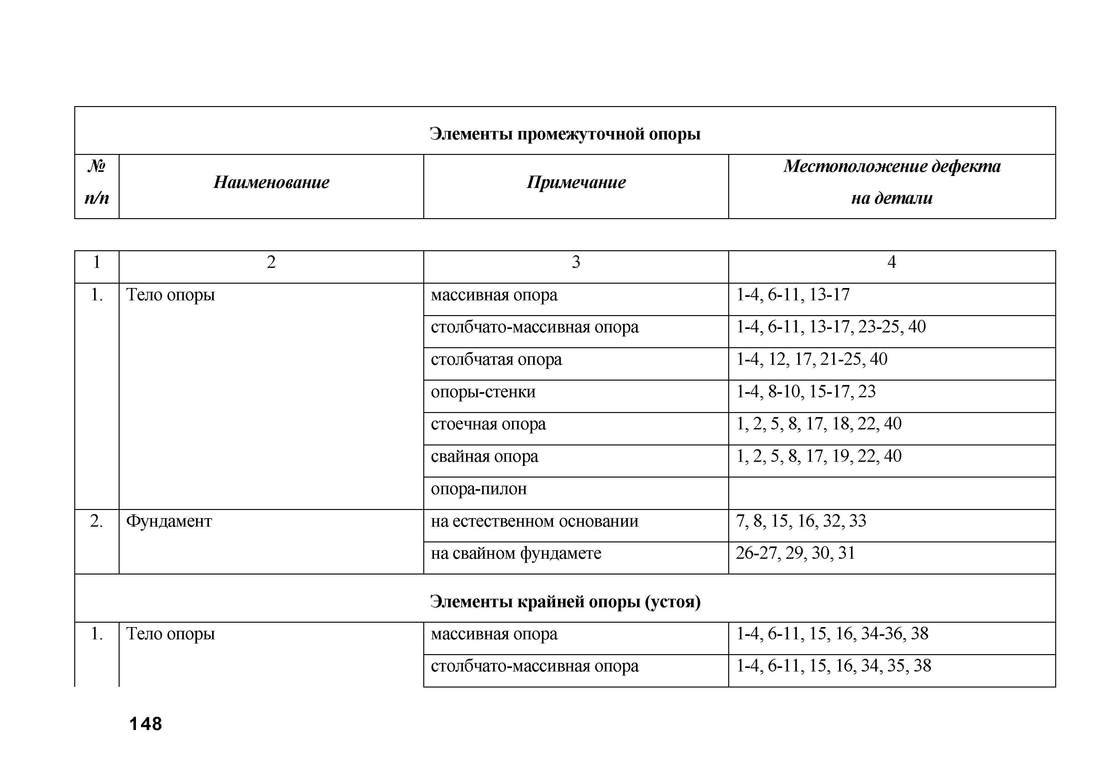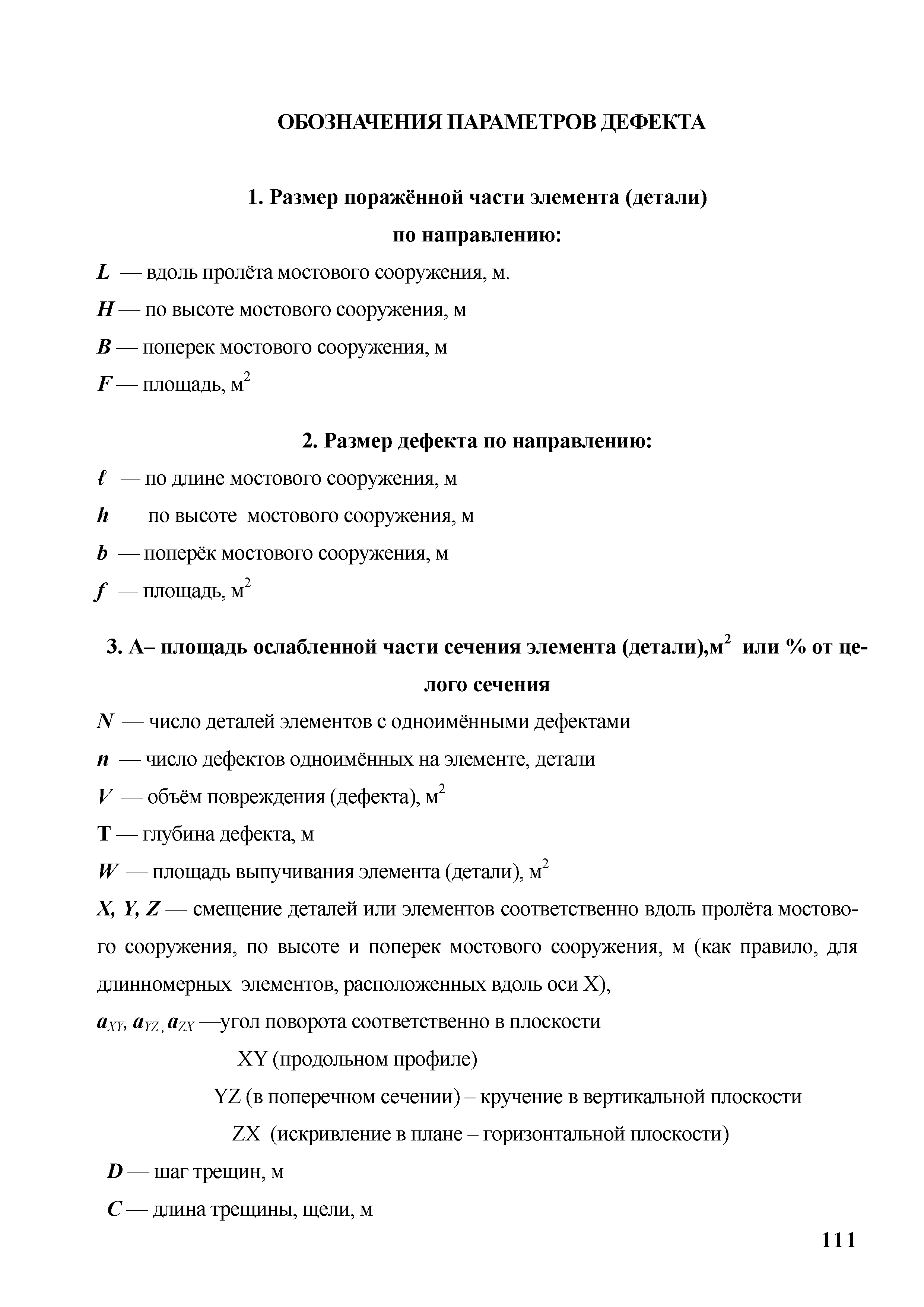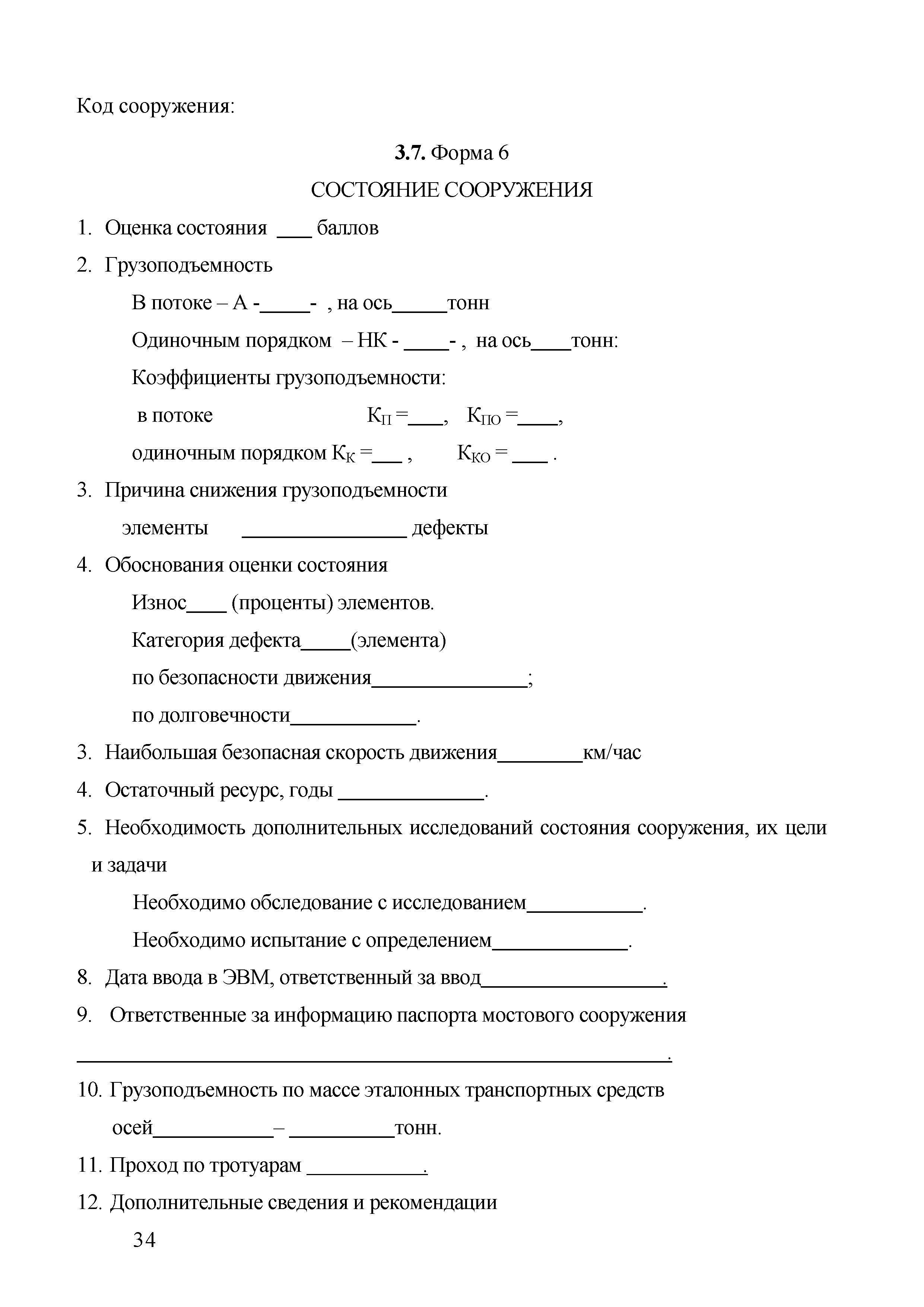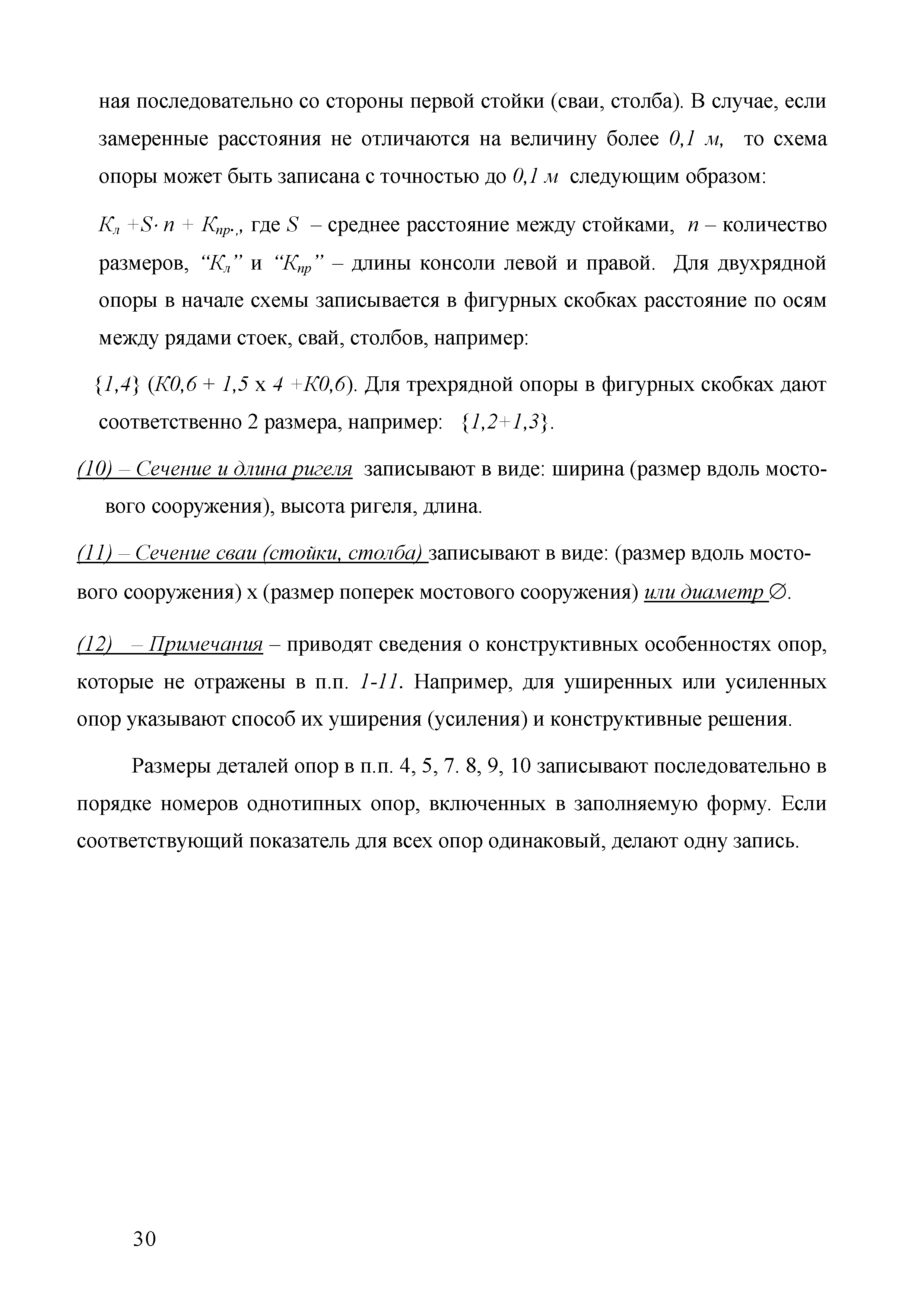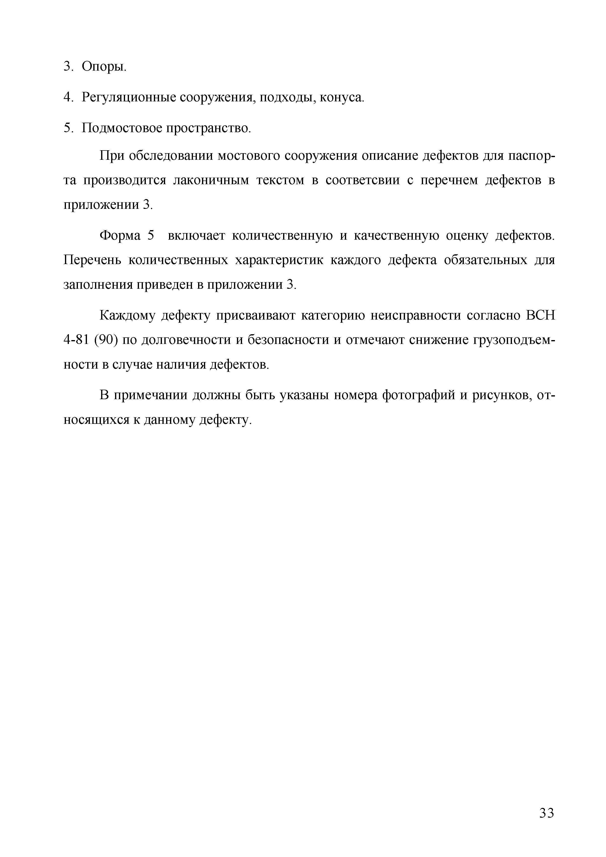 | Оглавление: | 1. Предисловие 2. Общие положения 3. Формы паспорта, порядок диагностики и записи информации. Пояснения к формам паспорта 3.1. Титульный лист паспорта 3.2. Форма 1. "Общие сведения". Пояснения к форме 1 3.3. Форма 2. "Пролетное строение". Пояснения к форме 2 3.4. Форма 3. "Опоры". Пояснения к форме 3 3.5. Форма 4. "Список технической документации". Пояснения к форме 4 3.6. Форма 5. "Ведомость дефектов". Пояснения к форме 5 3.7. Форма 6. "Состояние сооружения". Пояснения к форме 6 3.8. Форма Д. "Дополнительная информация". Пояснения к форме "Д" 3.9. Пояснительная записка, пояснения Приложение 1. Перечень федеральных округов Приложение 2. Таблицы для заполнения форм паспорта Приложение 3. Перечень дефектов, включаемых в форму 5 Приложение 4. Каталог конструкций и элементов Приложение 5. Оценка состояния Приложение 6. Документы, используемые при заполнении форм паспорта |