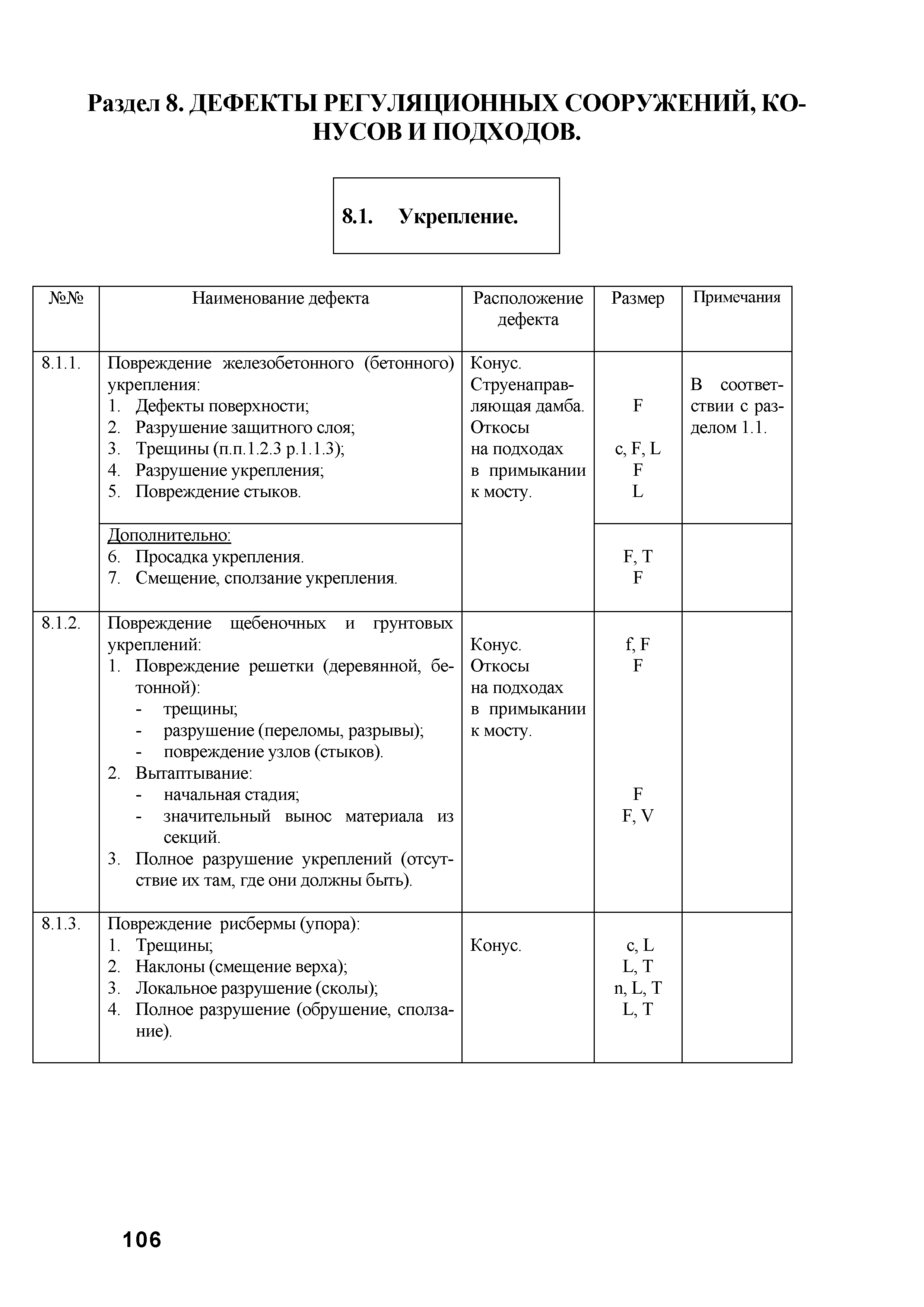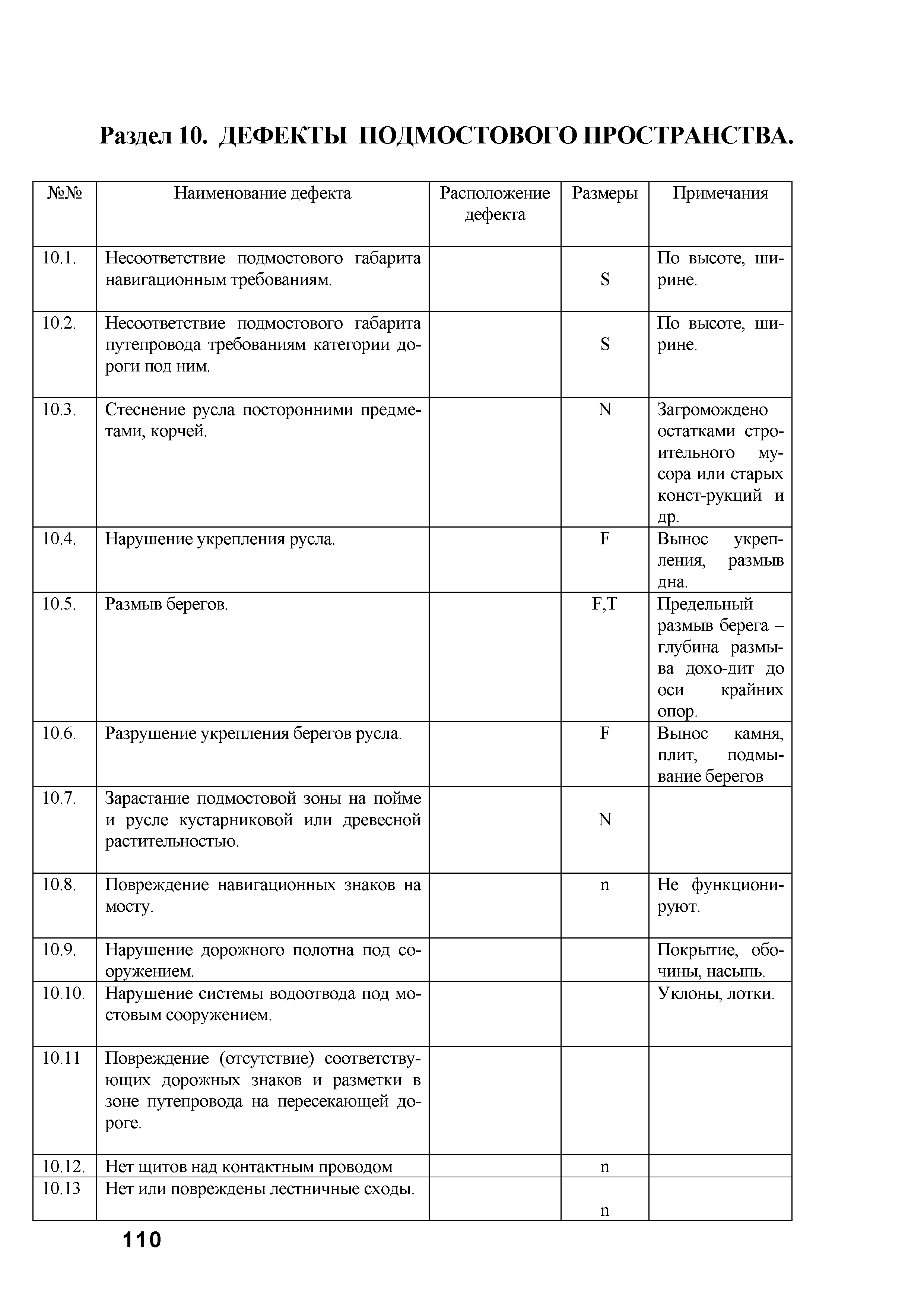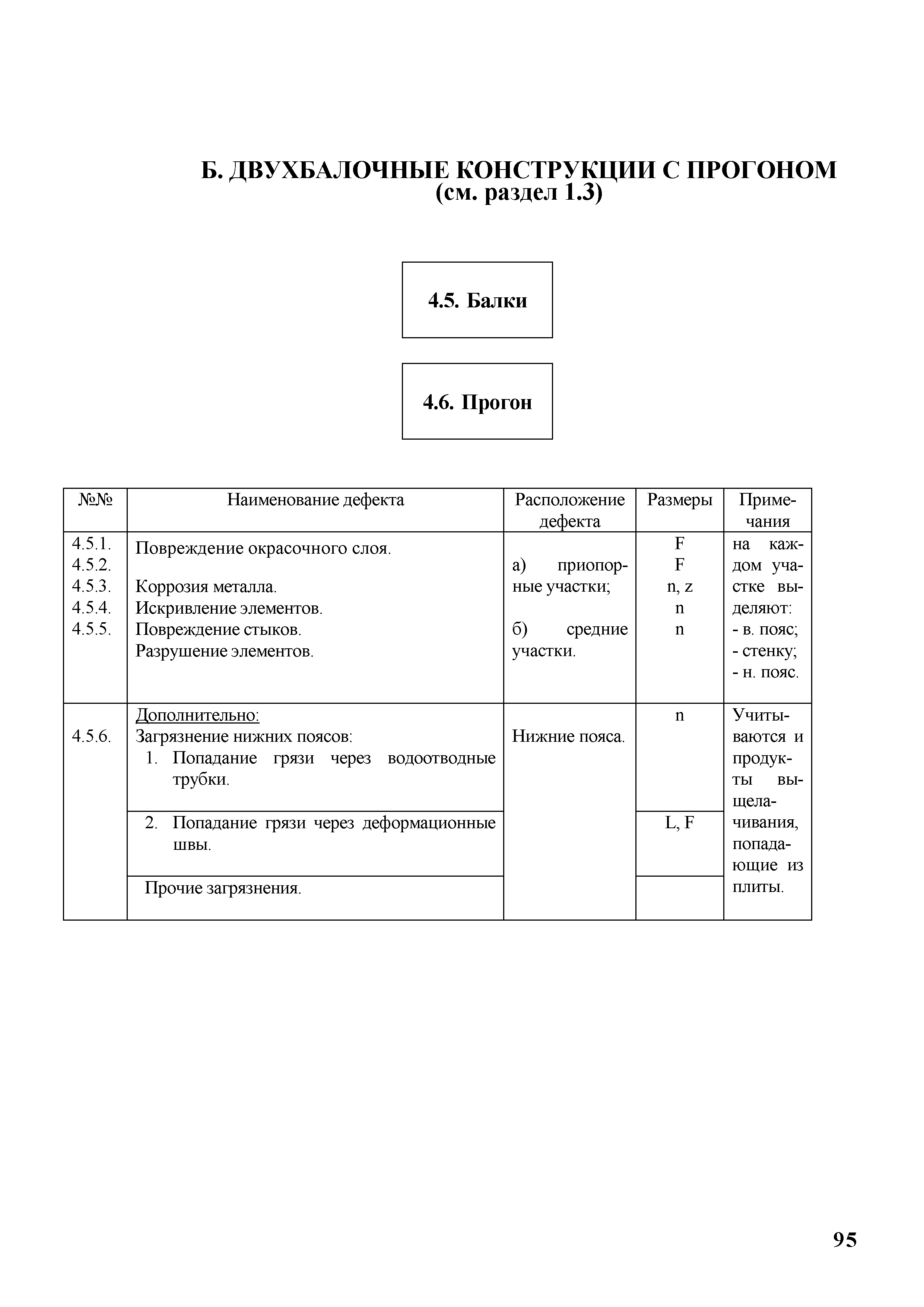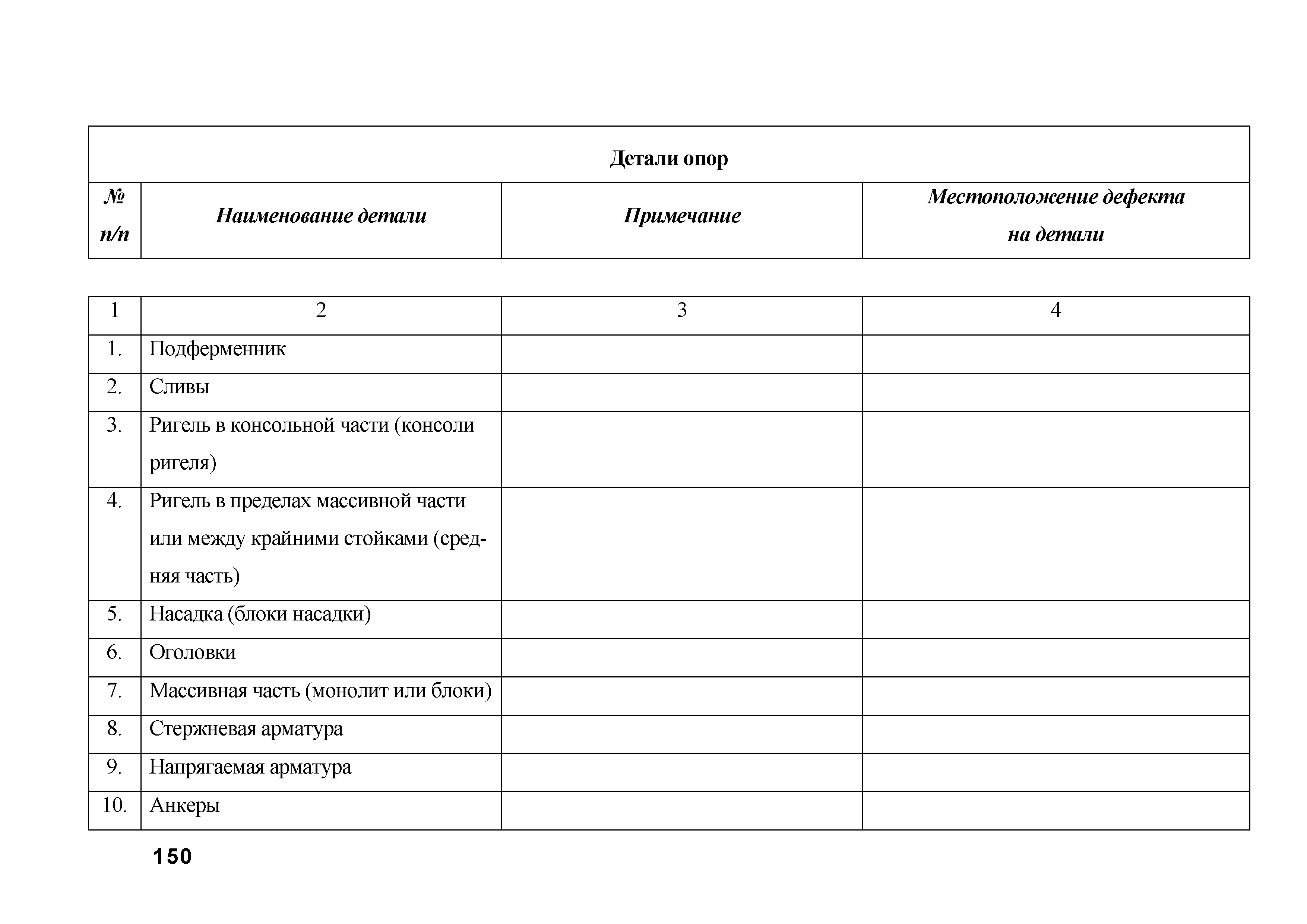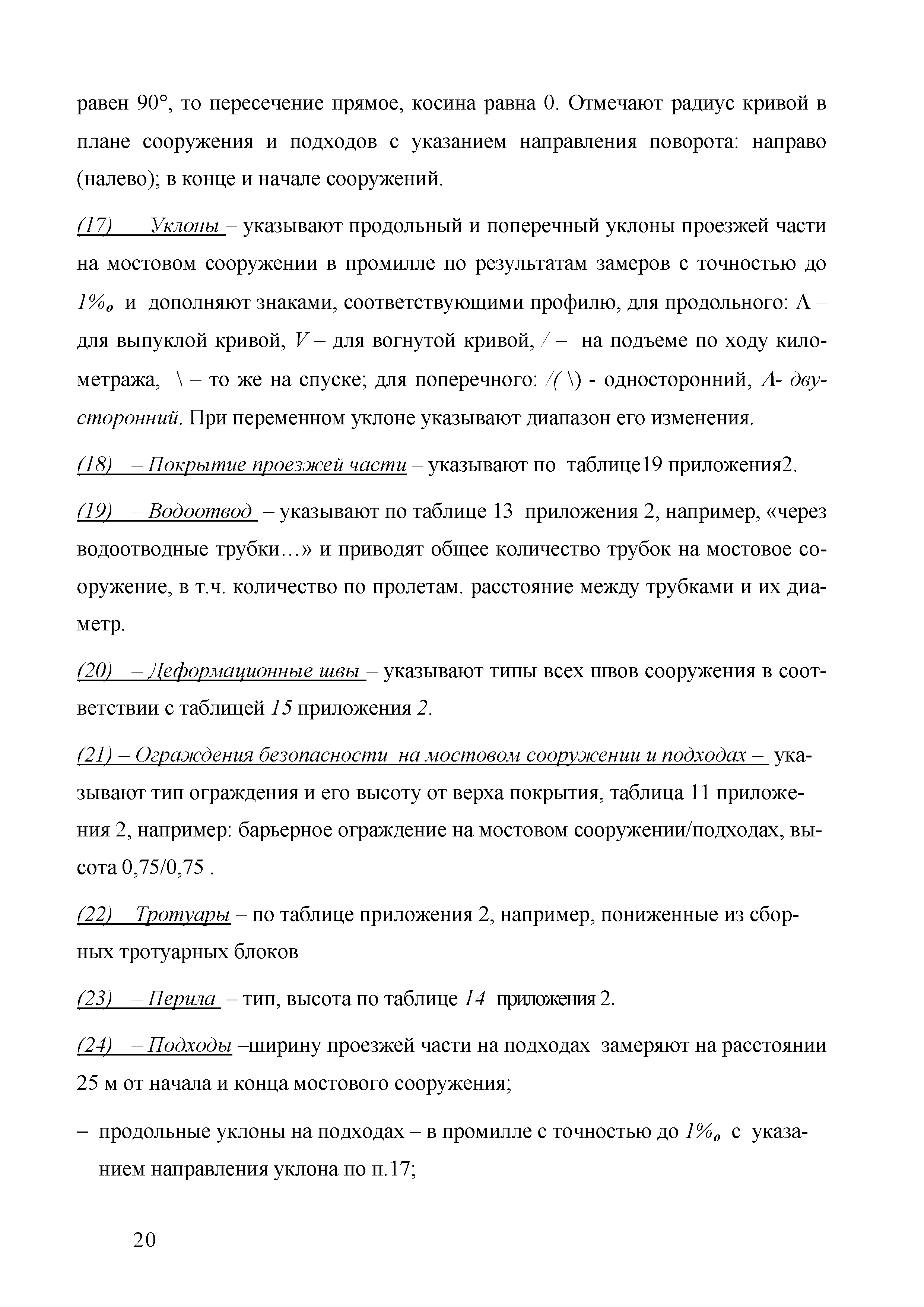 | Оглавление: | 1. Предисловие 2. Общие положения 3. Формы паспорта, порядок диагностики и записи информации. Пояснения к формам паспорта 3.1. Титульный лист паспорта 3.2. Форма 1. "Общие сведения". Пояснения к форме 1 3.3. Форма 2. "Пролетное строение". Пояснения к форме 2 3.4. Форма 3. "Опоры". Пояснения к форме 3 3.5. Форма 4. "Список технической документации". Пояснения к форме 4 3.6. Форма 5. "Ведомость дефектов". Пояснения к форме 5 3.7. Форма 6. "Состояние сооружения". Пояснения к форме 6 3.8. Форма Д. "Дополнительная информация". Пояснения к форме "Д" 3.9. Пояснительная записка, пояснения Приложение 1. Перечень федеральных округов Приложение 2. Таблицы для заполнения форм паспорта Приложение 3. Перечень дефектов, включаемых в форму 5 Приложение 4. Каталог конструкций и элементов Приложение 5. Оценка состояния Приложение 6. Документы, используемые при заполнении форм паспорта |