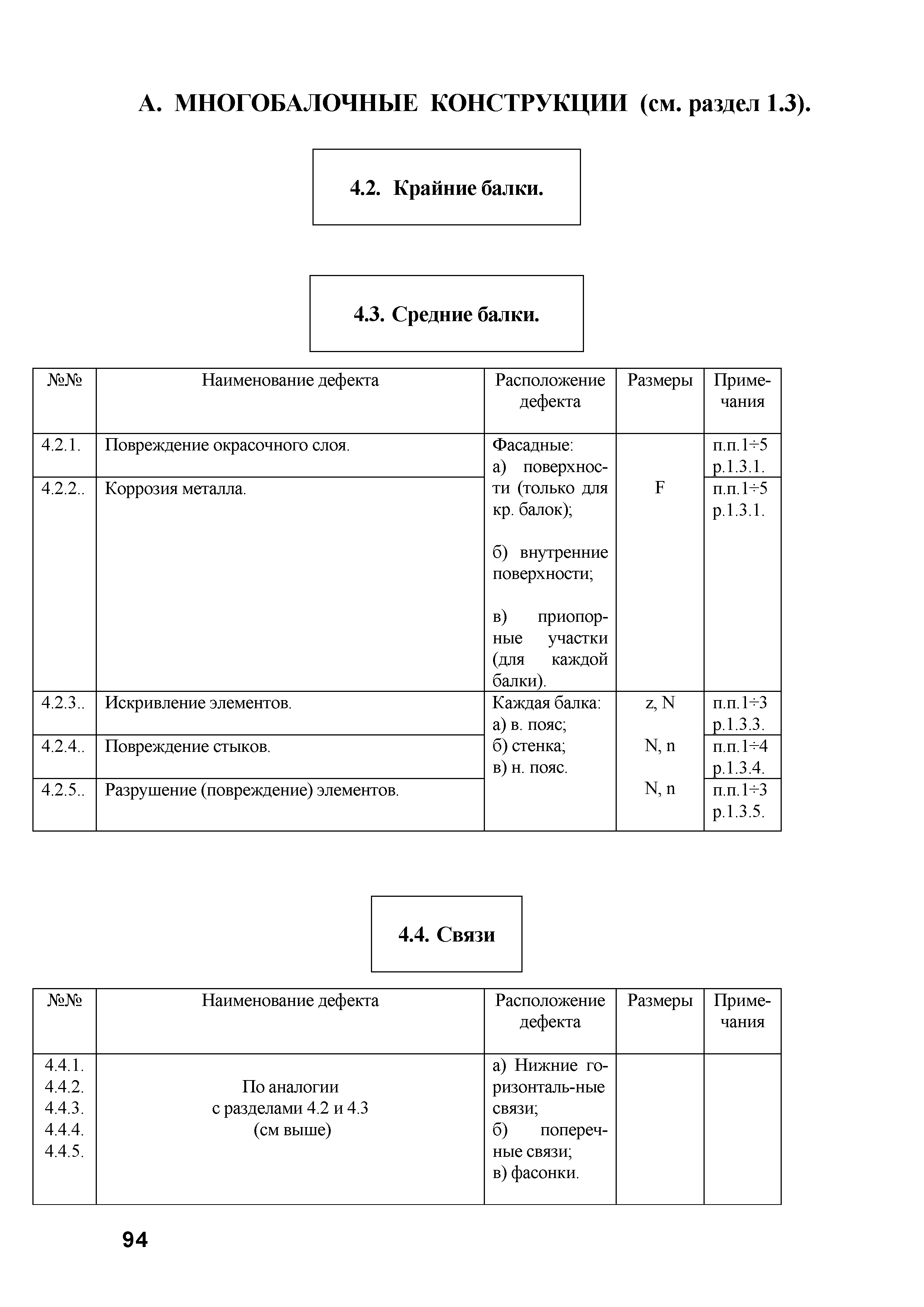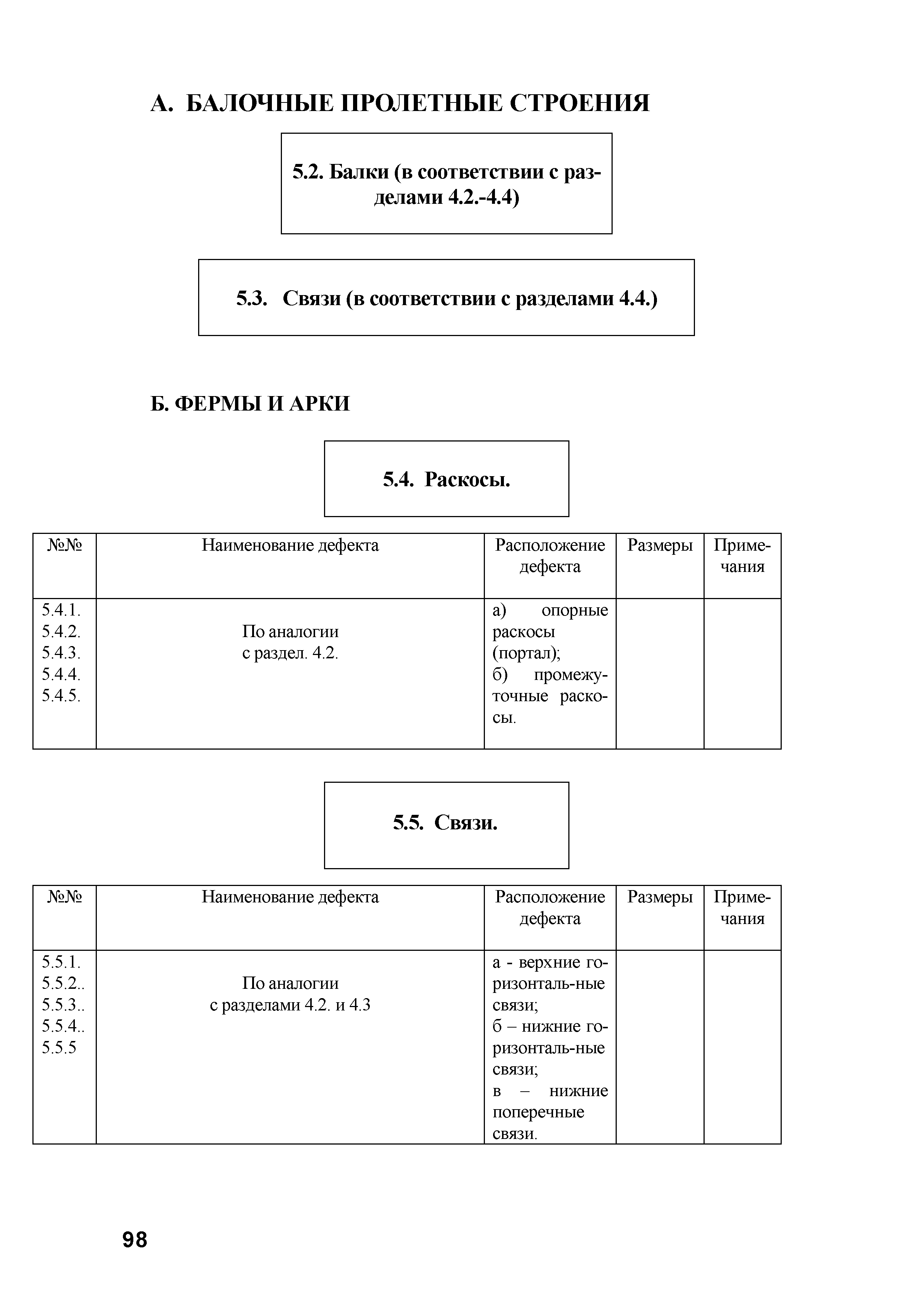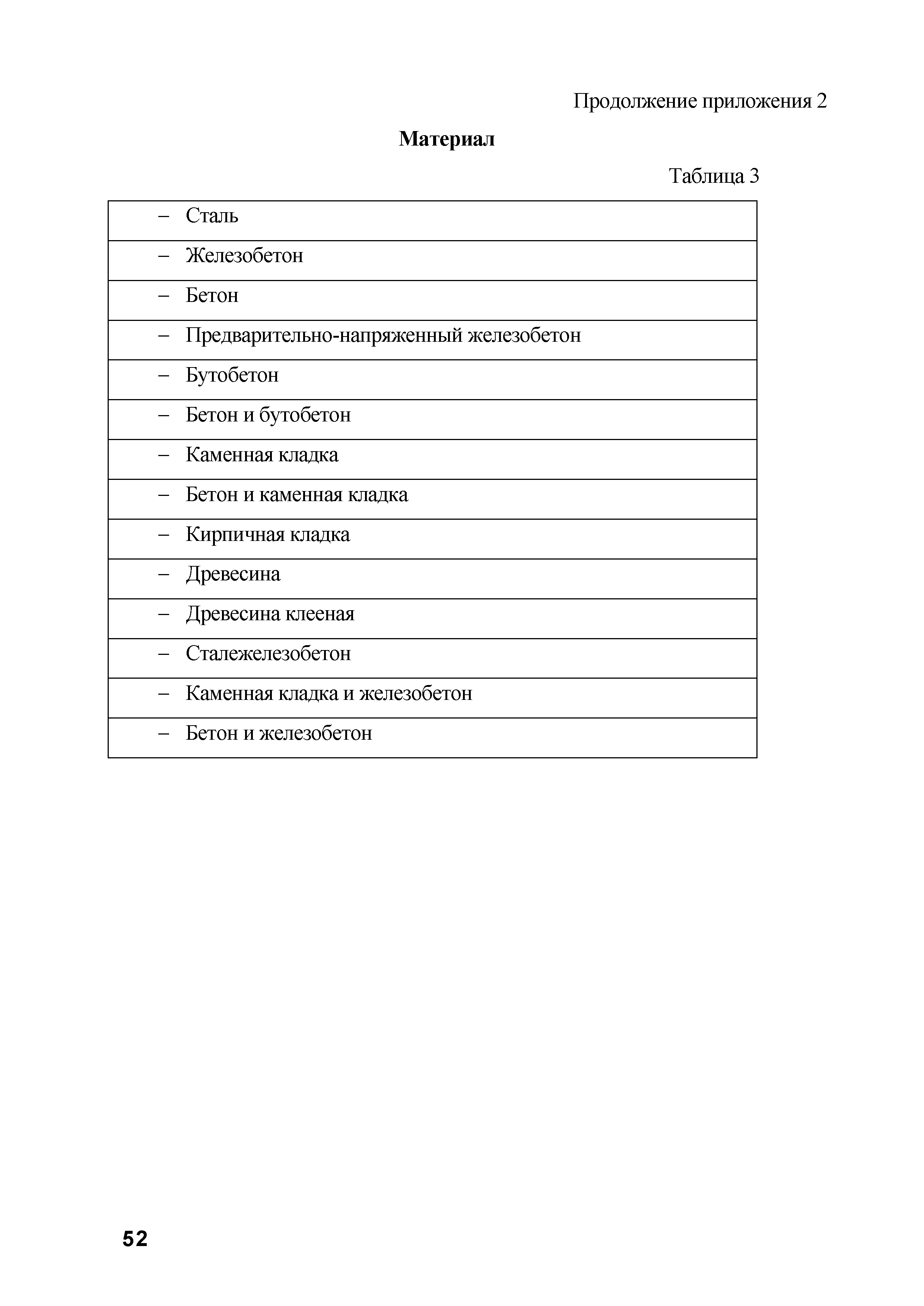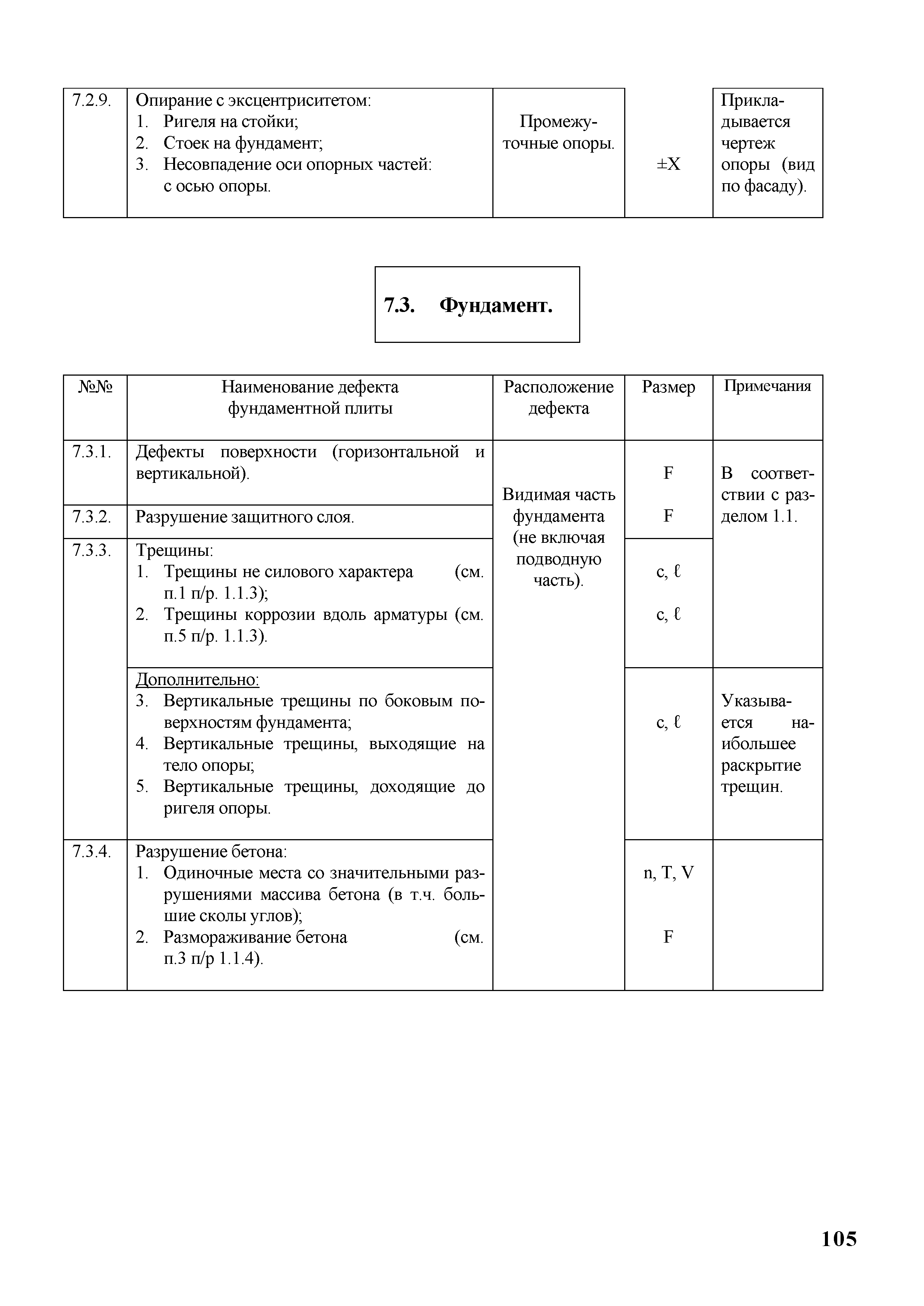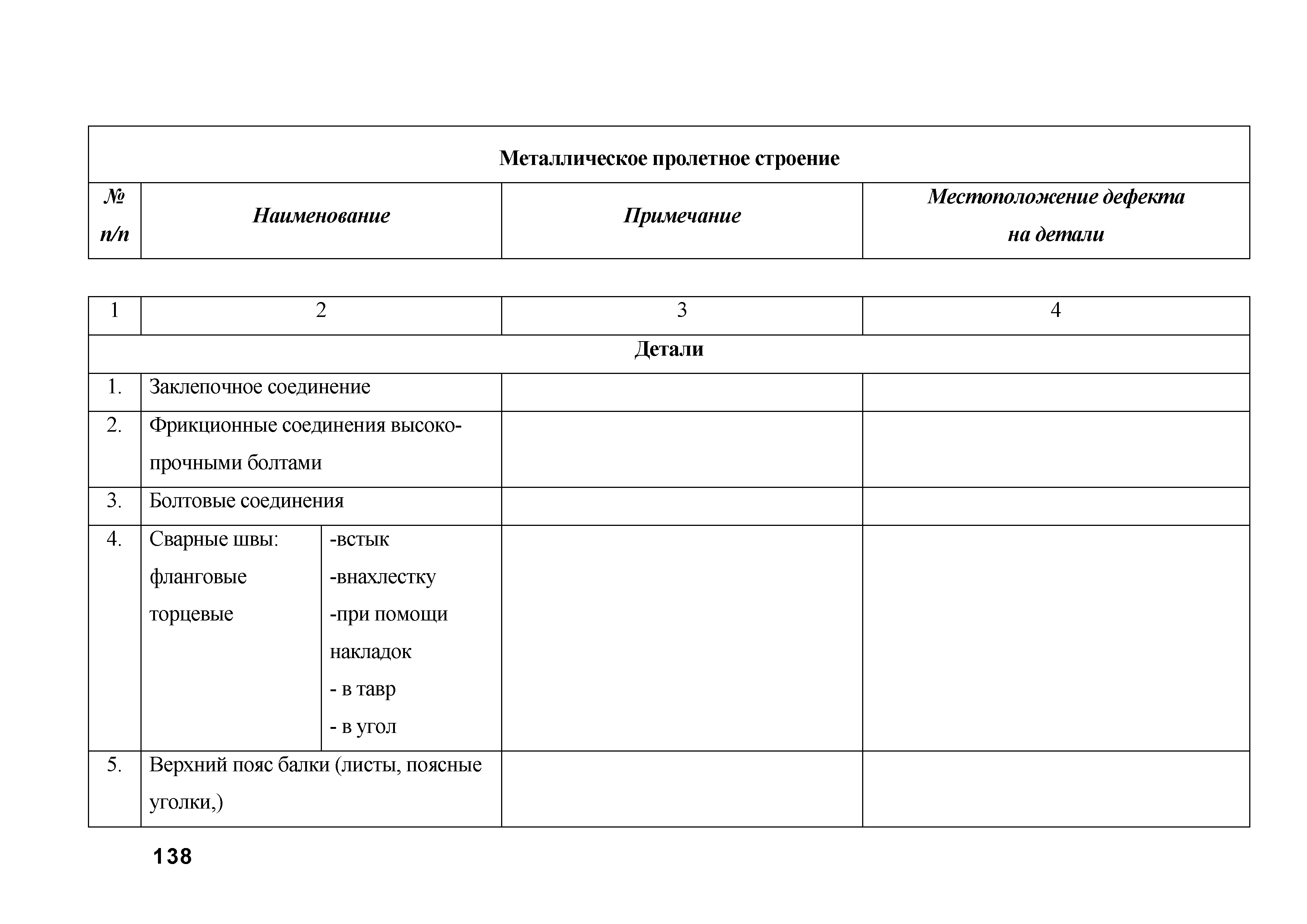 | Оглавление: | 1. Предисловие 2. Общие положения 3. Формы паспорта, порядок диагностики и записи информации. Пояснения к формам паспорта 3.1. Титульный лист паспорта 3.2. Форма 1. "Общие сведения". Пояснения к форме 1 3.3. Форма 2. "Пролетное строение". Пояснения к форме 2 3.4. Форма 3. "Опоры". Пояснения к форме 3 3.5. Форма 4. "Список технической документации". Пояснения к форме 4 3.6. Форма 5. "Ведомость дефектов". Пояснения к форме 5 3.7. Форма 6. "Состояние сооружения". Пояснения к форме 6 3.8. Форма Д. "Дополнительная информация". Пояснения к форме "Д" 3.9. Пояснительная записка, пояснения Приложение 1. Перечень федеральных округов Приложение 2. Таблицы для заполнения форм паспорта Приложение 3. Перечень дефектов, включаемых в форму 5 Приложение 4. Каталог конструкций и элементов Приложение 5. Оценка состояния Приложение 6. Документы, используемые при заполнении форм паспорта |