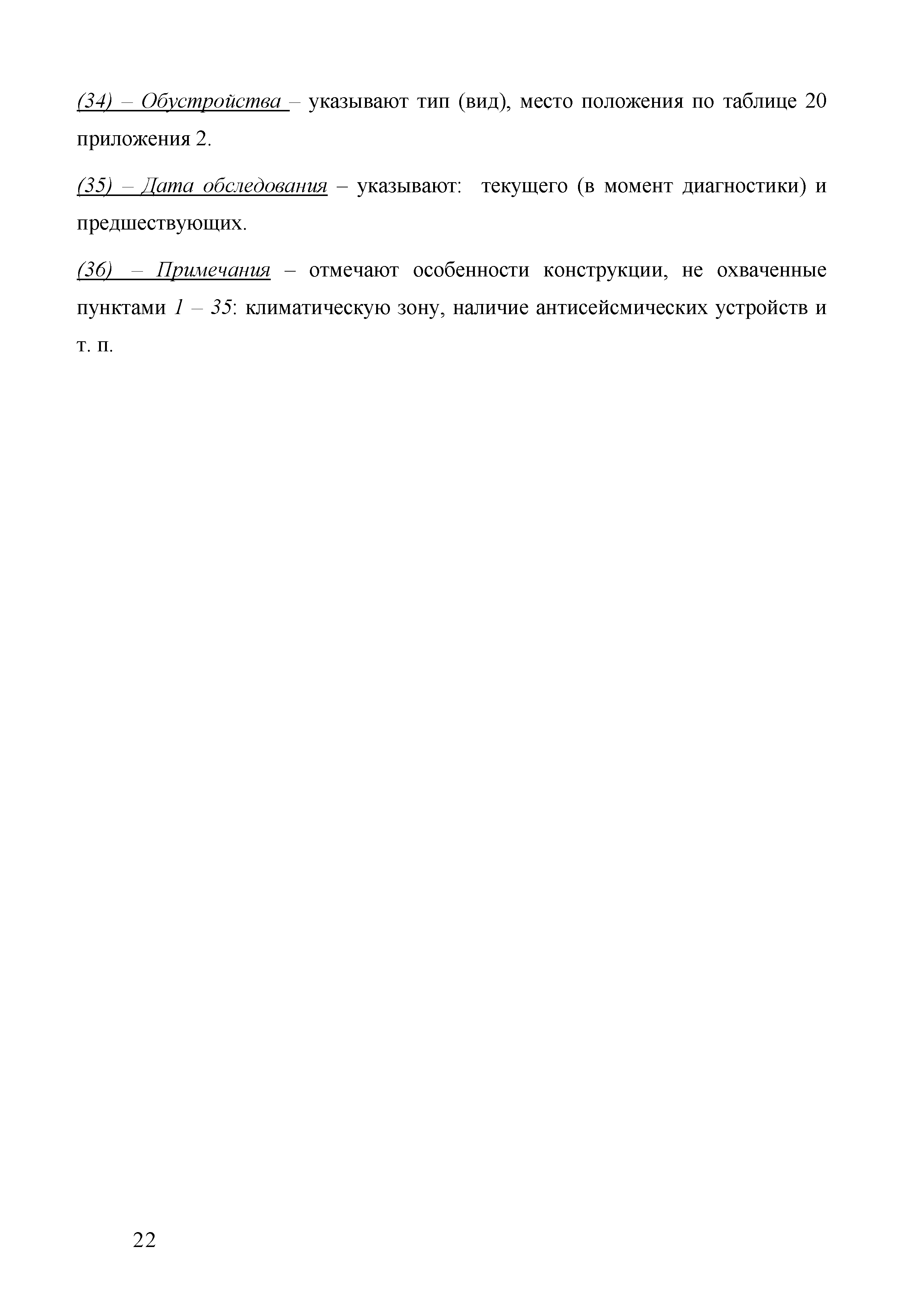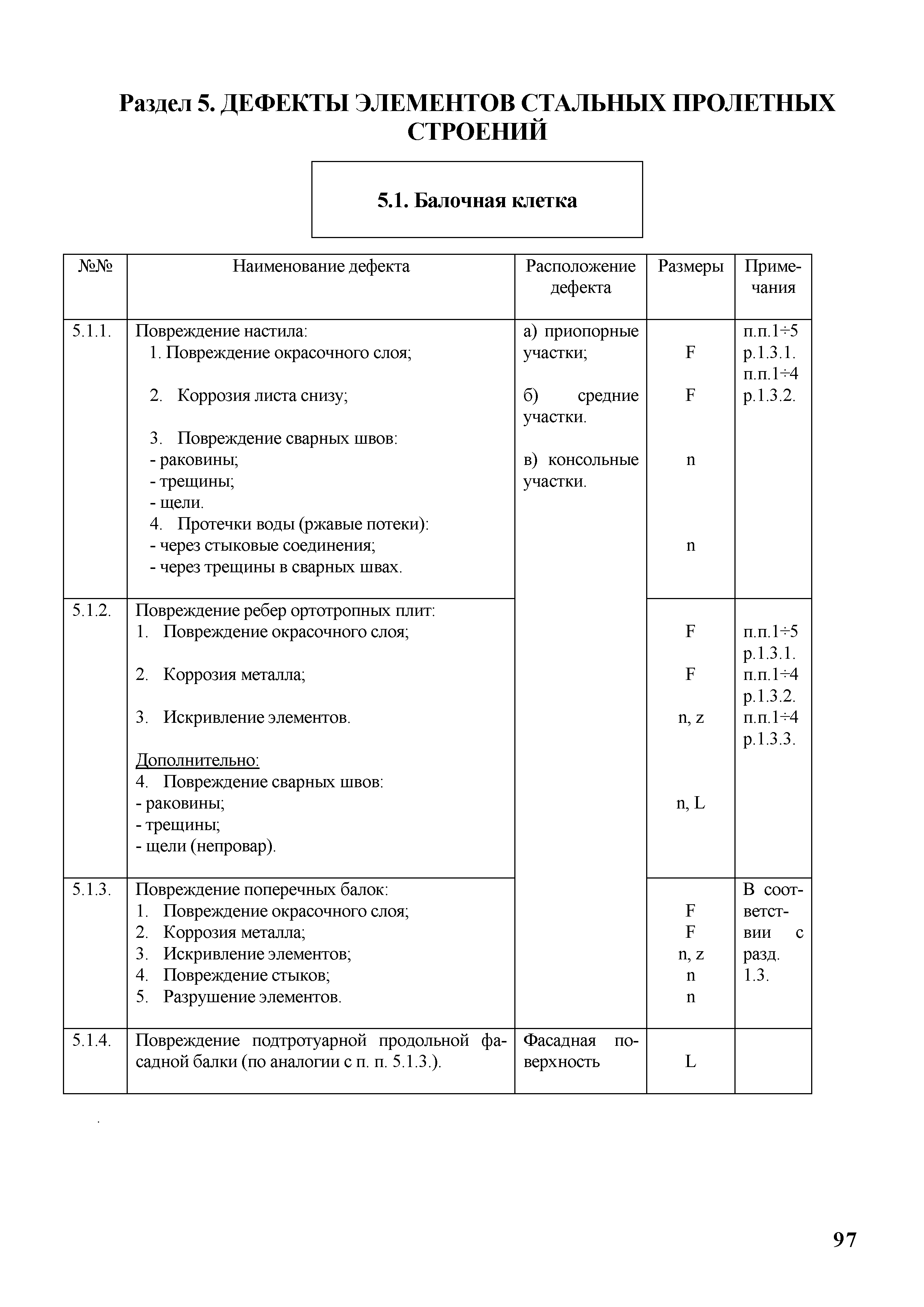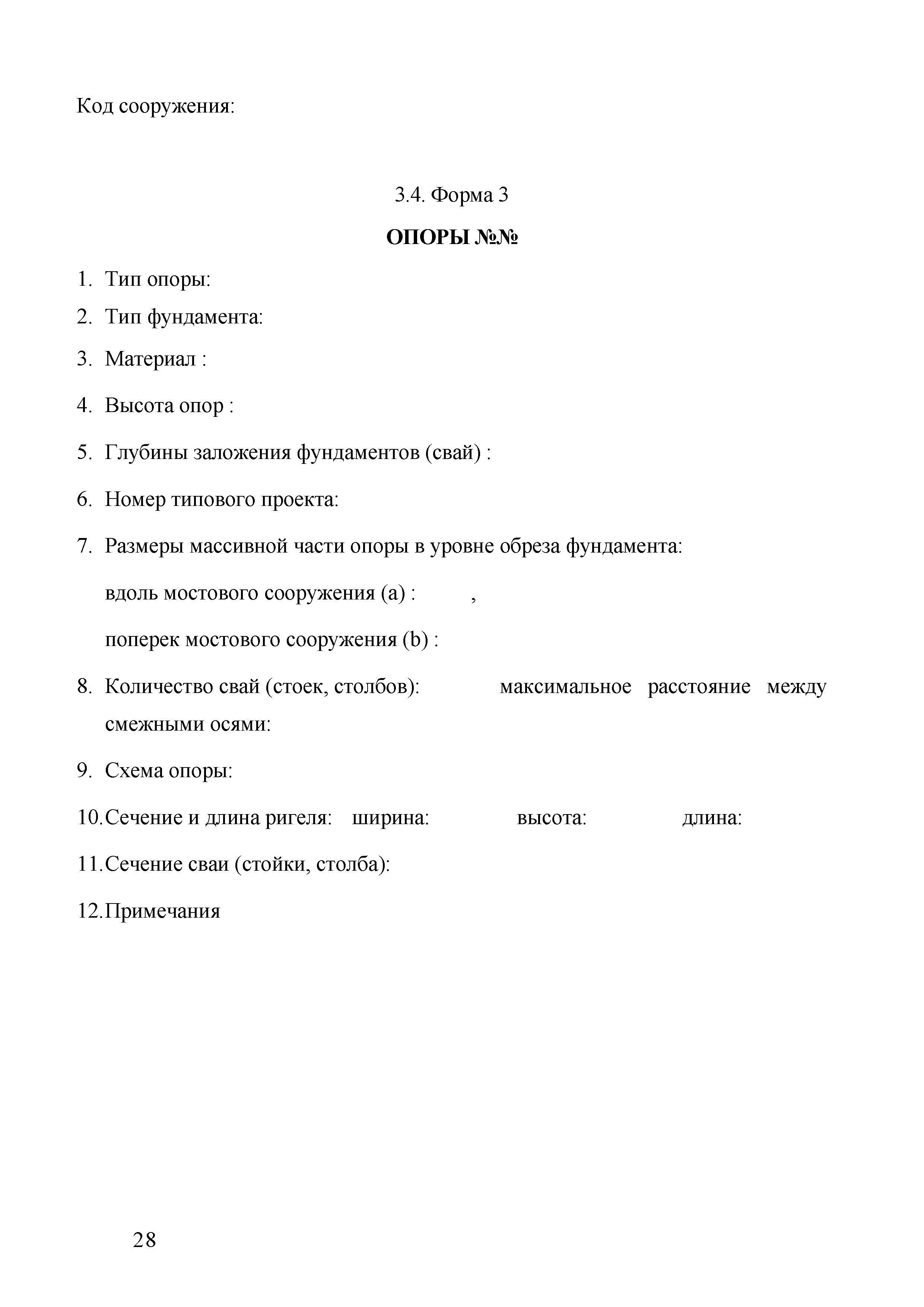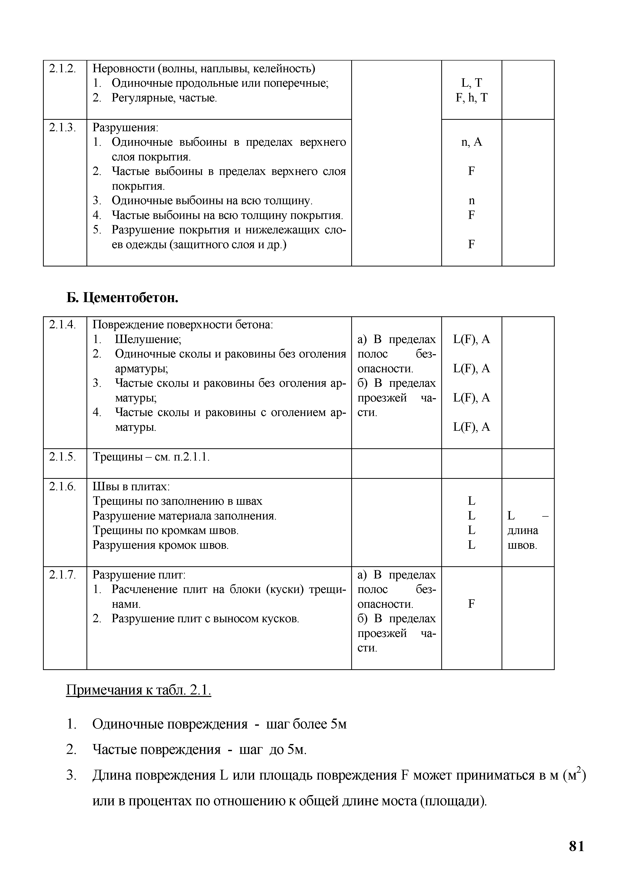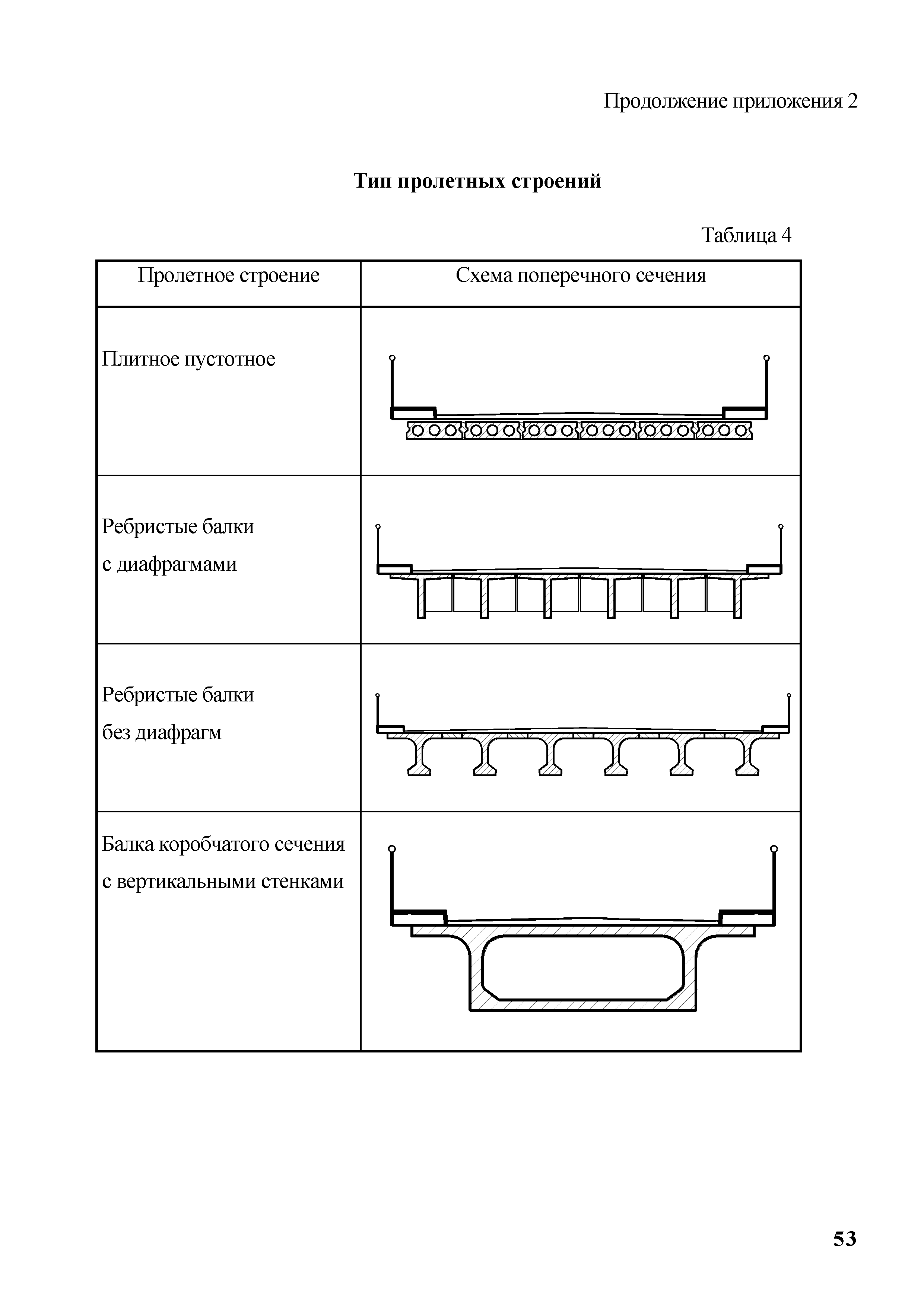| Оглавление: | 1. Предисловие 2. Общие положения 3. Формы паспорта, порядок диагностики и записи информации. Пояснения к формам паспорта 3.1. Титульный лист паспорта 3.2. Форма 1. "Общие сведения". Пояснения к форме 1 3.3. Форма 2. "Пролетное строение". Пояснения к форме 2 3.4. Форма 3. "Опоры". Пояснения к форме 3 3.5. Форма 4. "Список технической документации". Пояснения к форме 4 3.6. Форма 5. "Ведомость дефектов". Пояснения к форме 5 3.7. Форма 6. "Состояние сооружения". Пояснения к форме 6 3.8. Форма Д. "Дополнительная информация". Пояснения к форме "Д" 3.9. Пояснительная записка, пояснения Приложение 1. Перечень федеральных округов Приложение 2. Таблицы для заполнения форм паспорта Приложение 3. Перечень дефектов, включаемых в форму 5 Приложение 4. Каталог конструкций и элементов Приложение 5. Оценка состояния Приложение 6. Документы, используемые при заполнении форм паспорта |
