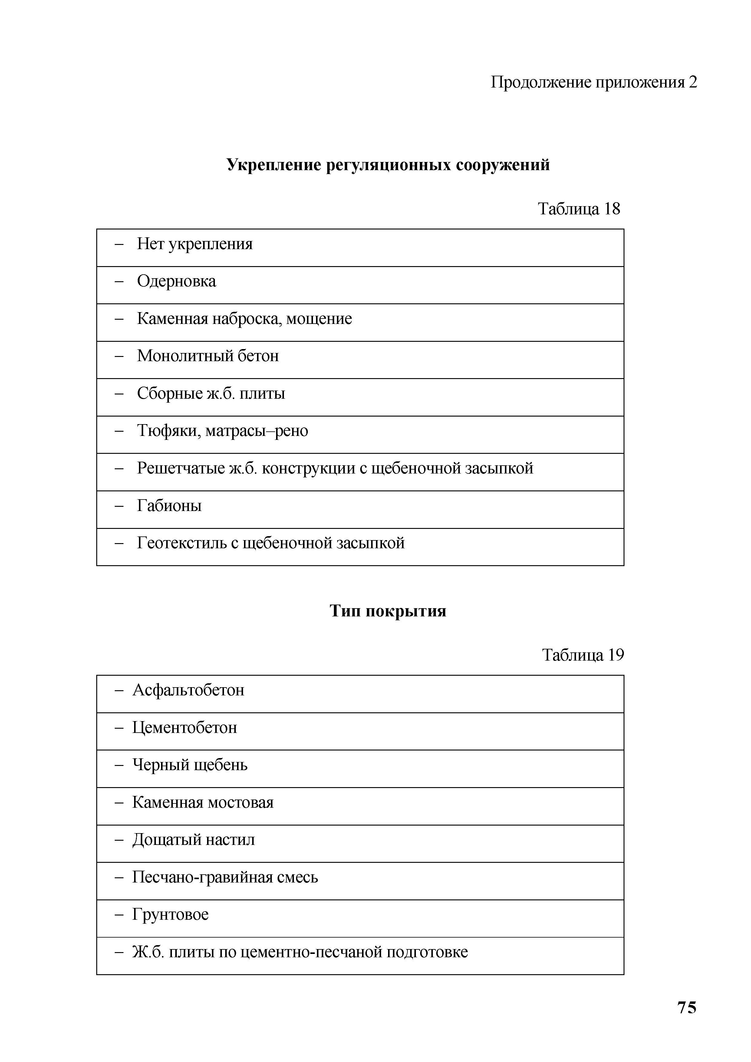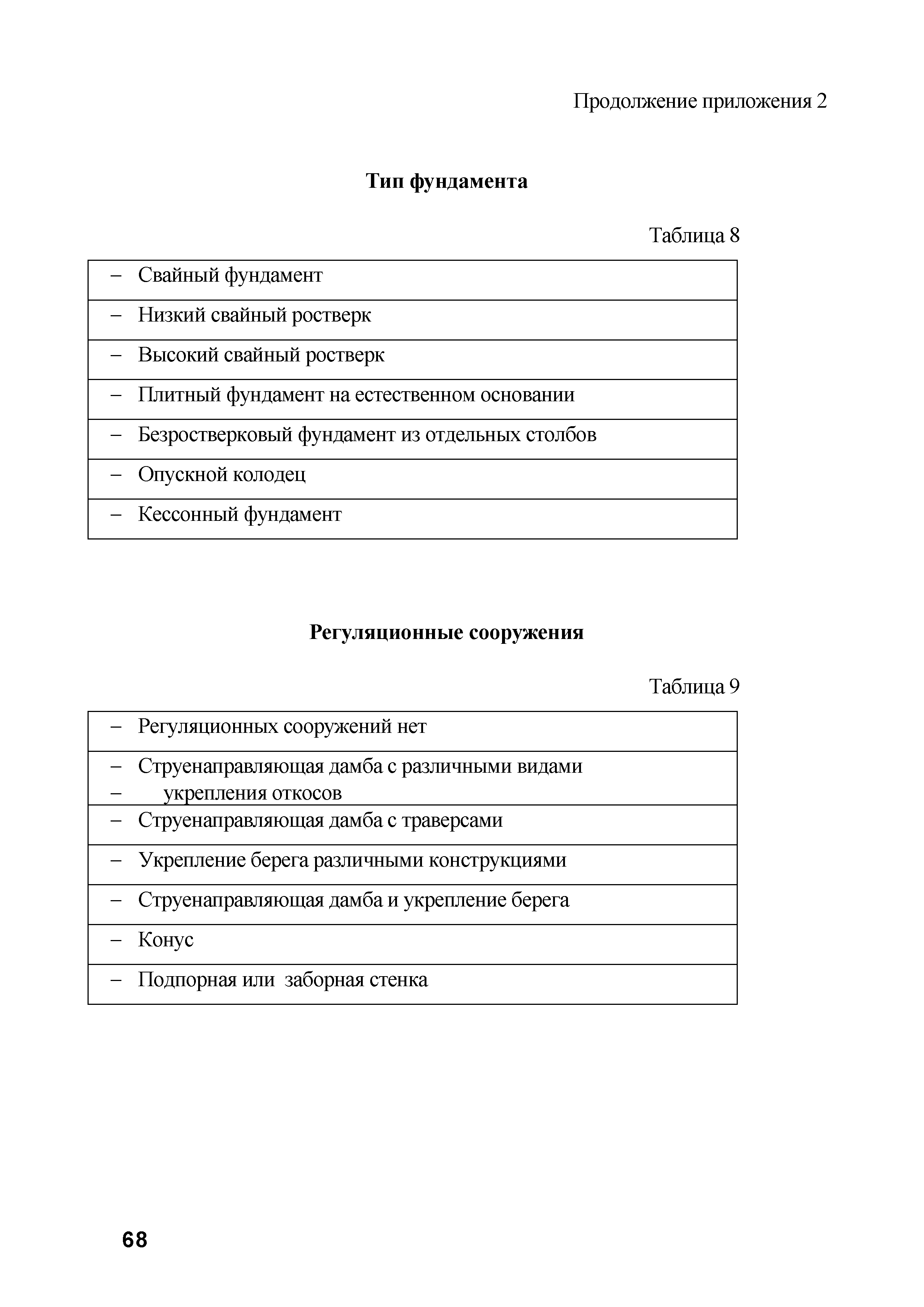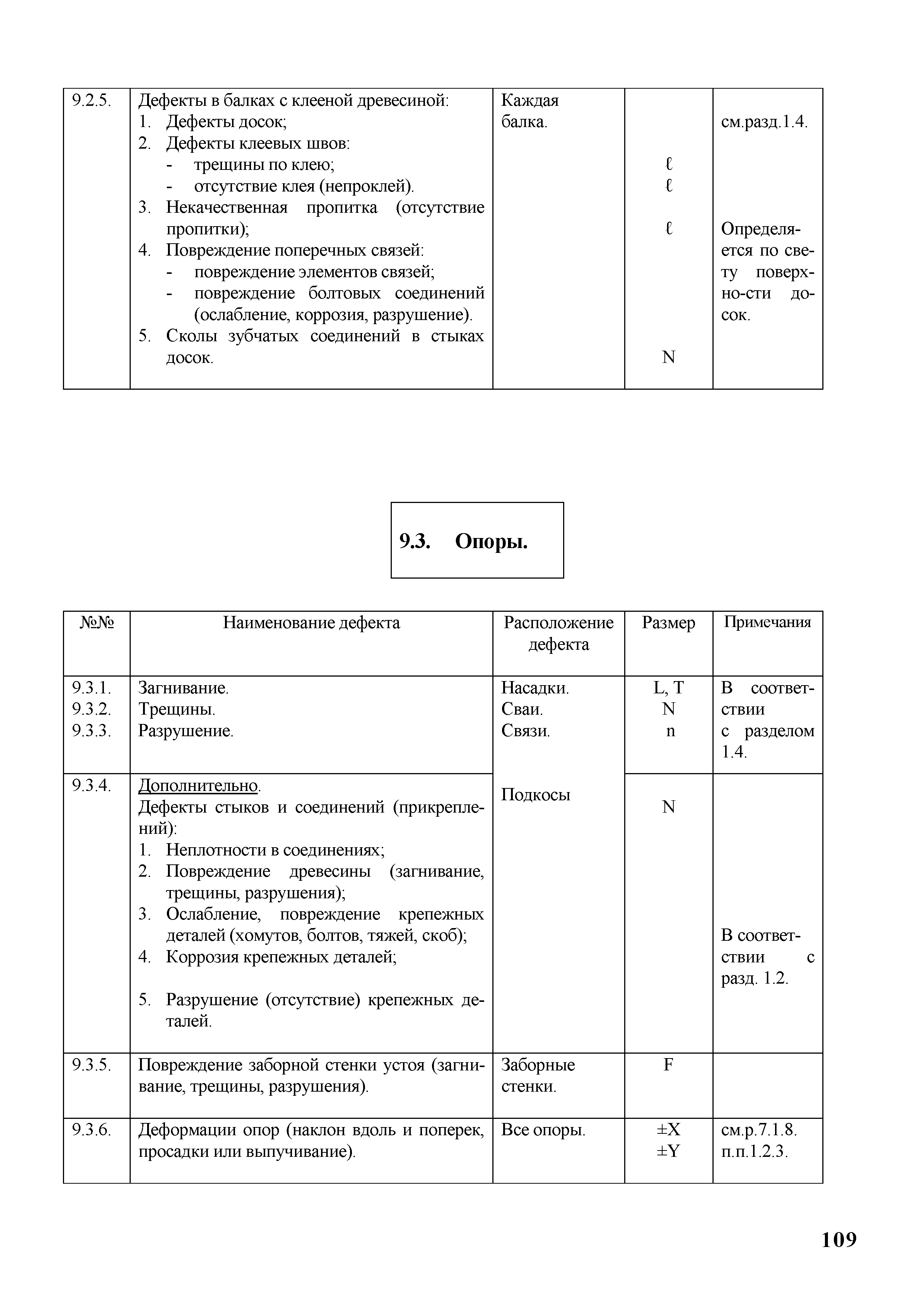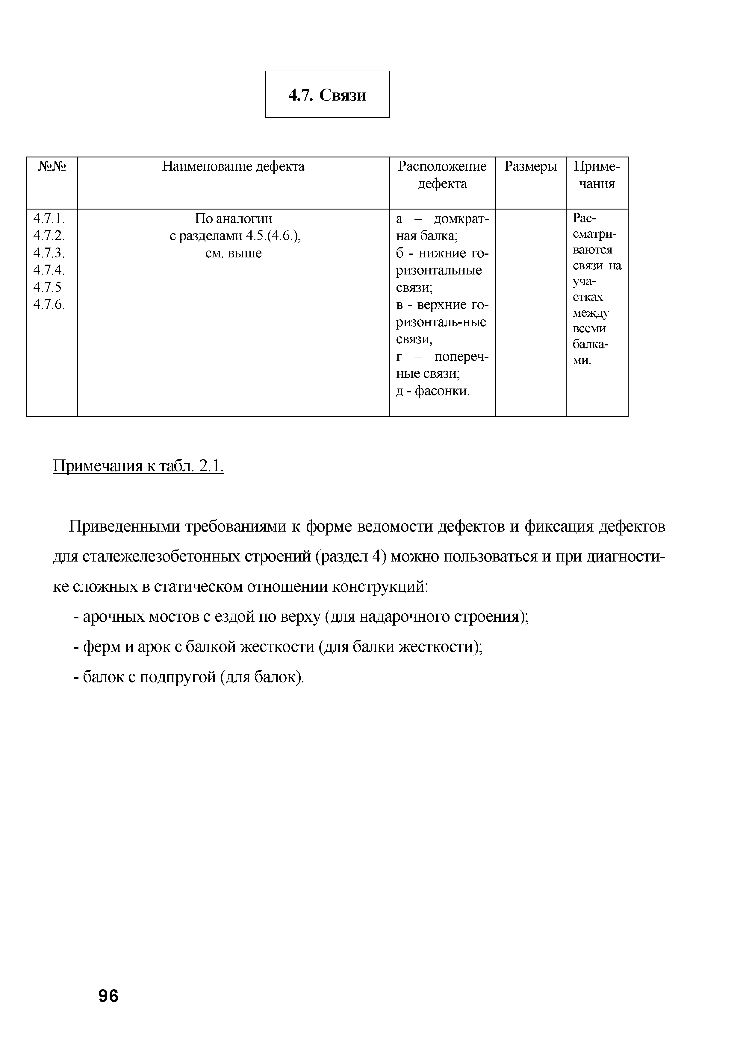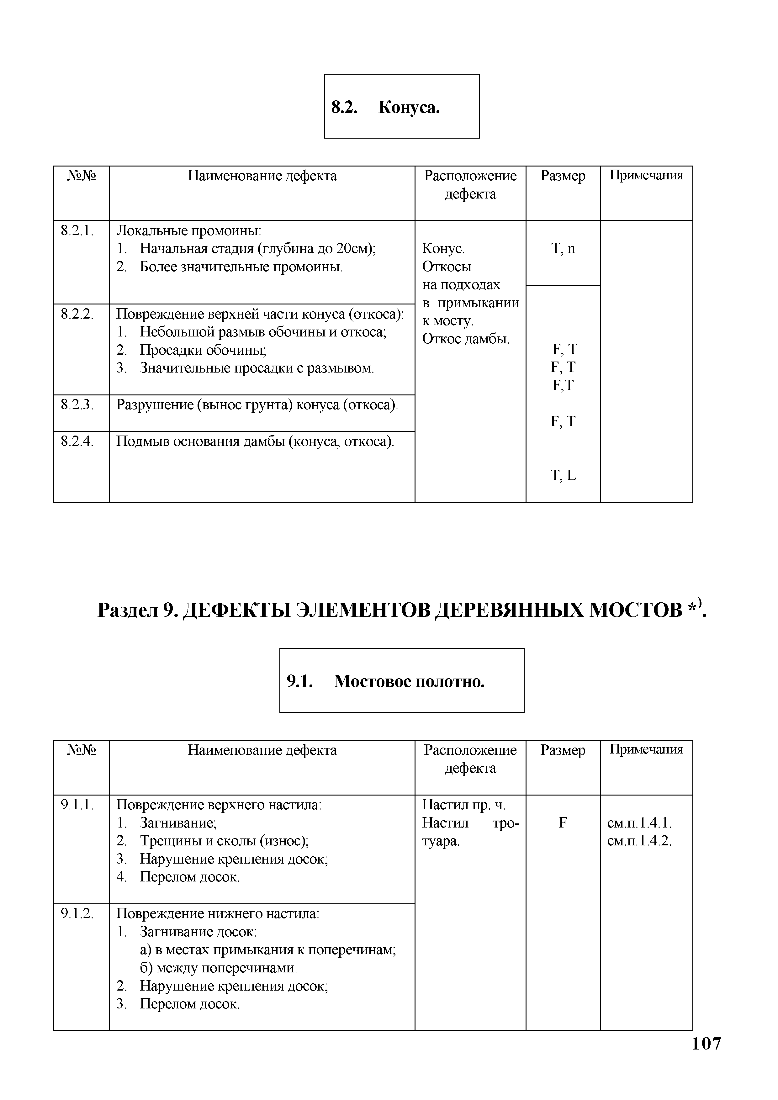 | Оглавление: | 1. Предисловие 2. Общие положения 3. Формы паспорта, порядок диагностики и записи информации. Пояснения к формам паспорта 3.1. Титульный лист паспорта 3.2. Форма 1. "Общие сведения". Пояснения к форме 1 3.3. Форма 2. "Пролетное строение". Пояснения к форме 2 3.4. Форма 3. "Опоры". Пояснения к форме 3 3.5. Форма 4. "Список технической документации". Пояснения к форме 4 3.6. Форма 5. "Ведомость дефектов". Пояснения к форме 5 3.7. Форма 6. "Состояние сооружения". Пояснения к форме 6 3.8. Форма Д. "Дополнительная информация". Пояснения к форме "Д" 3.9. Пояснительная записка, пояснения Приложение 1. Перечень федеральных округов Приложение 2. Таблицы для заполнения форм паспорта Приложение 3. Перечень дефектов, включаемых в форму 5 Приложение 4. Каталог конструкций и элементов Приложение 5. Оценка состояния Приложение 6. Документы, используемые при заполнении форм паспорта |