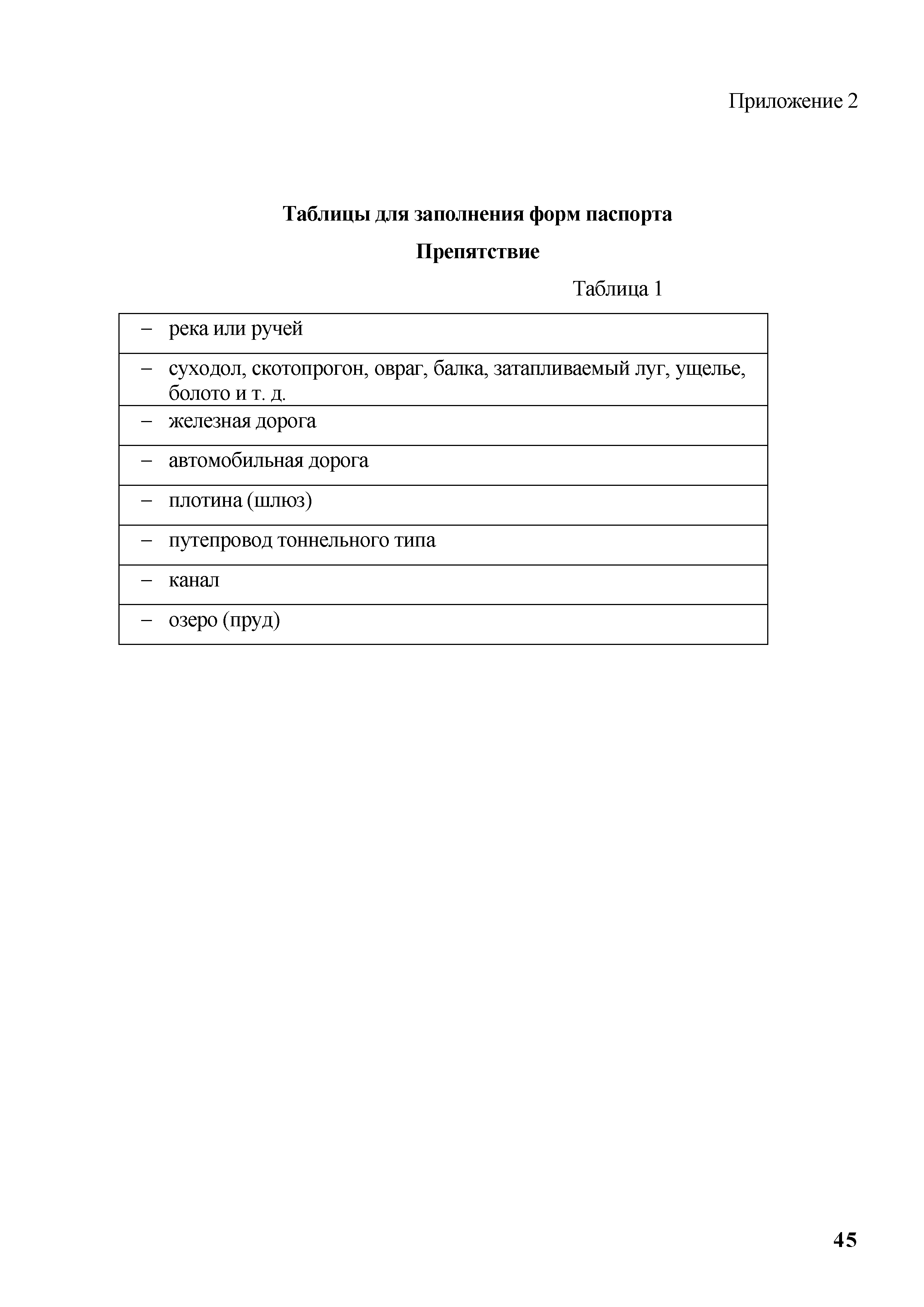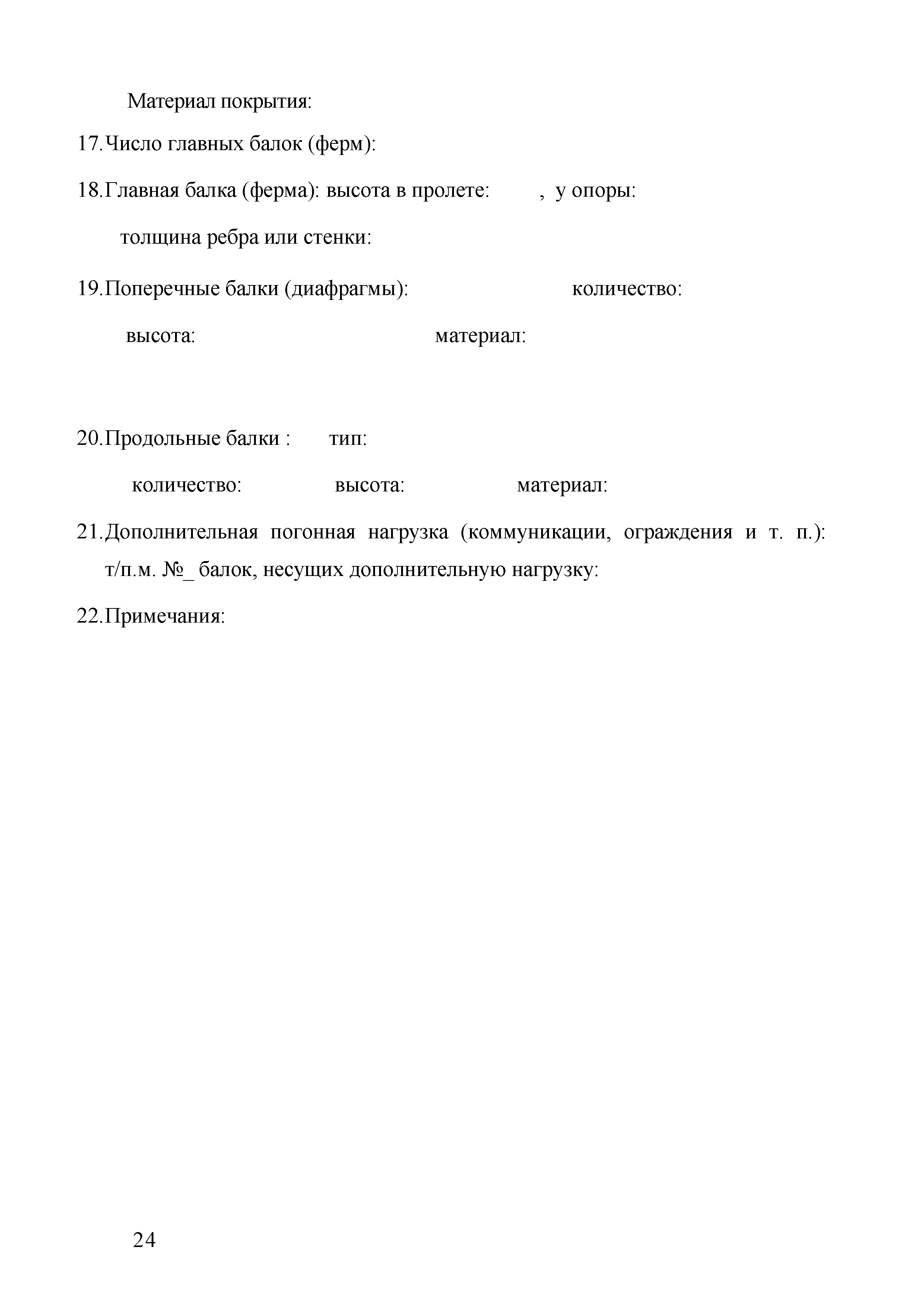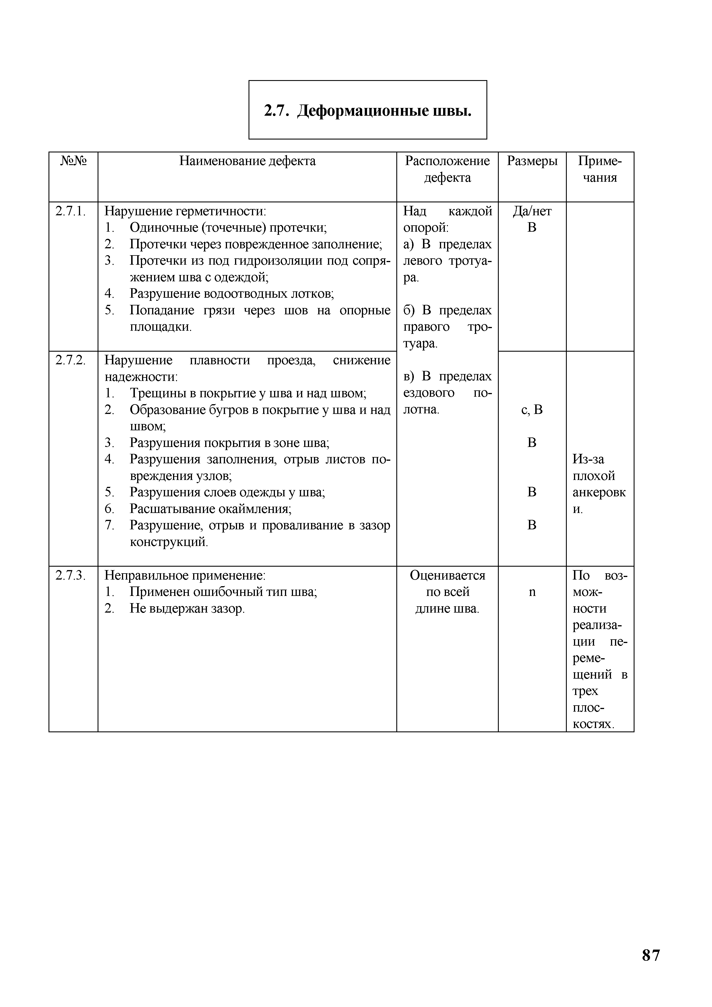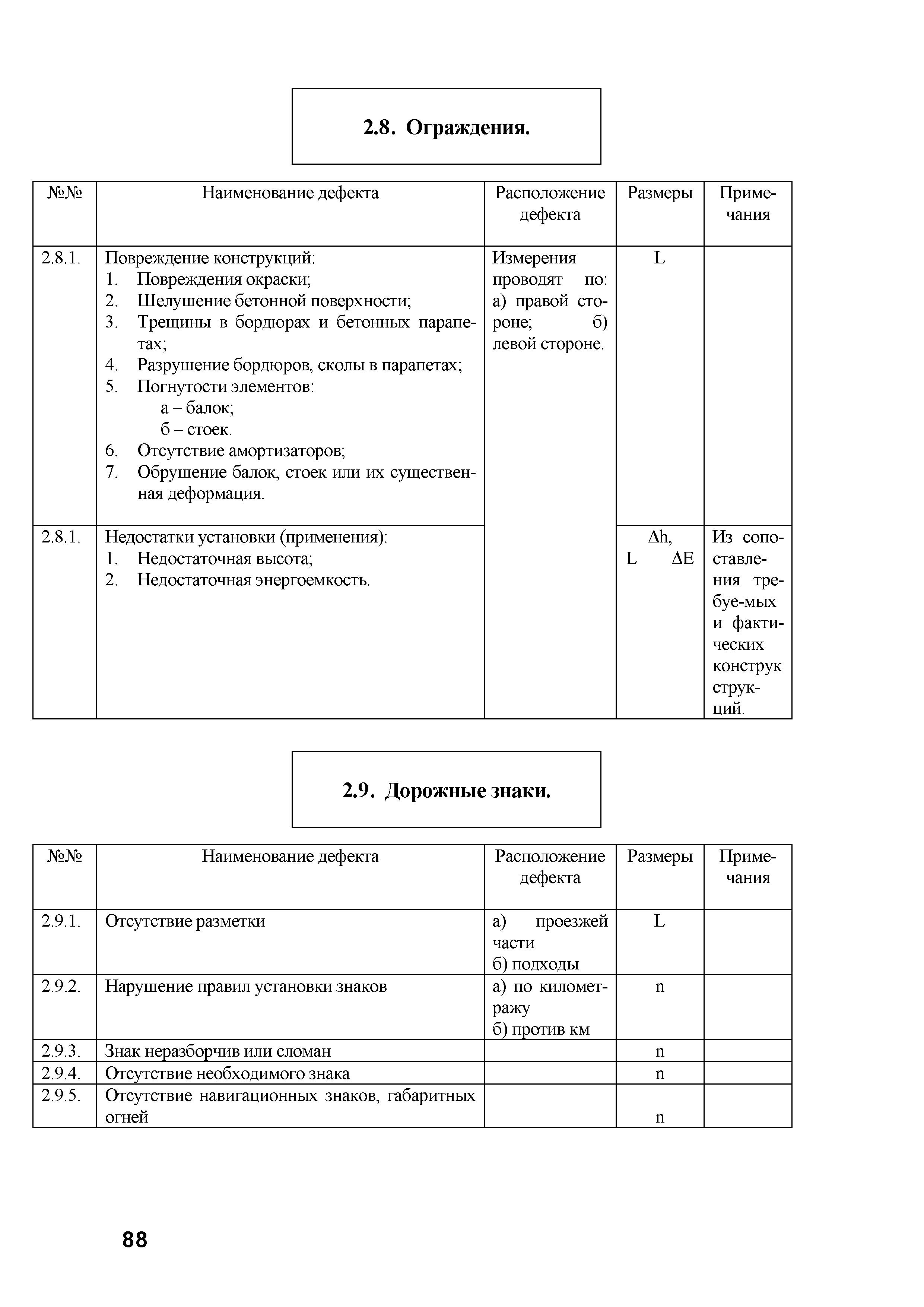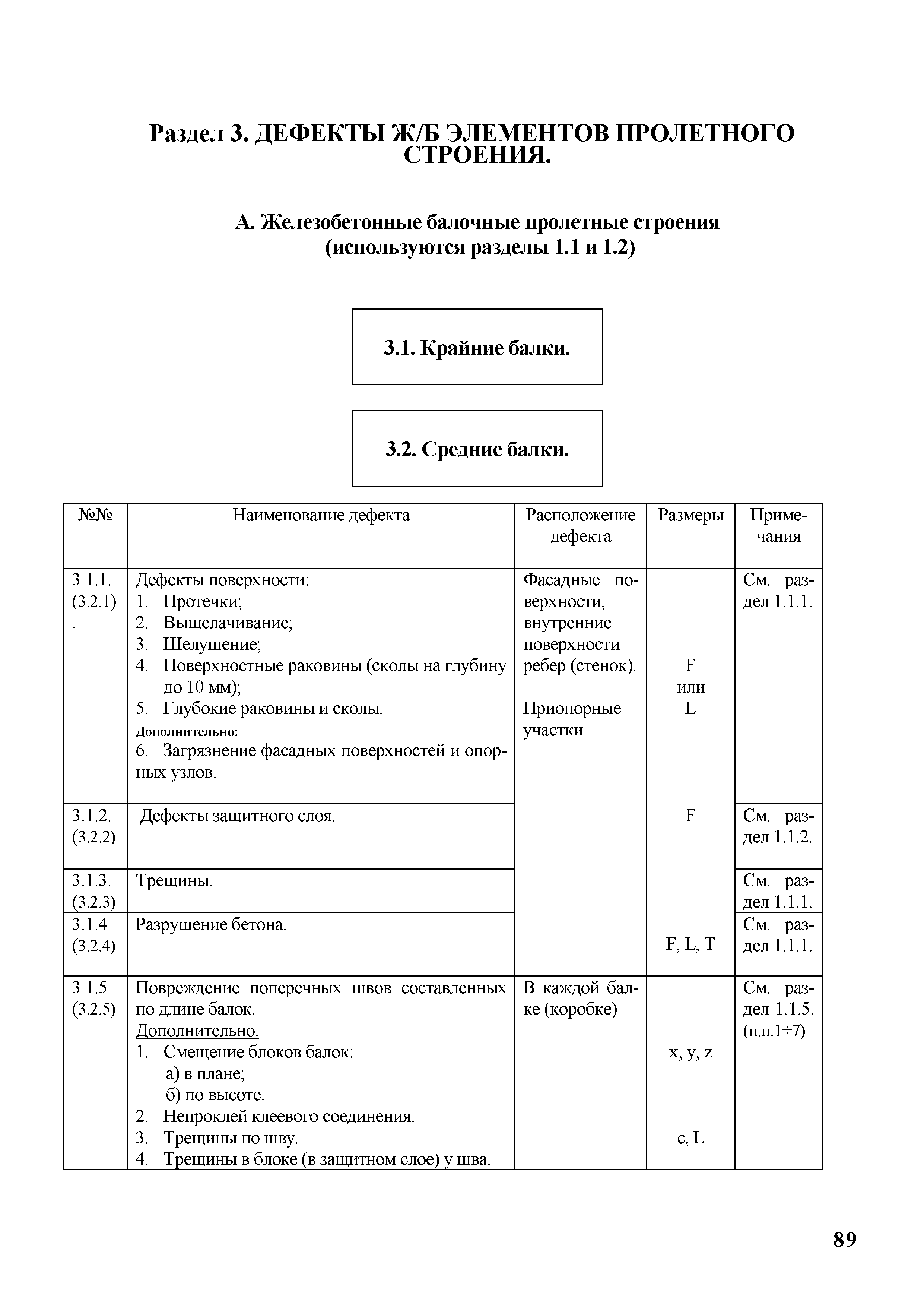 | Оглавление: | 1. Предисловие 2. Общие положения 3. Формы паспорта, порядок диагностики и записи информации. Пояснения к формам паспорта 3.1. Титульный лист паспорта 3.2. Форма 1. "Общие сведения". Пояснения к форме 1 3.3. Форма 2. "Пролетное строение". Пояснения к форме 2 3.4. Форма 3. "Опоры". Пояснения к форме 3 3.5. Форма 4. "Список технической документации". Пояснения к форме 4 3.6. Форма 5. "Ведомость дефектов". Пояснения к форме 5 3.7. Форма 6. "Состояние сооружения". Пояснения к форме 6 3.8. Форма Д. "Дополнительная информация". Пояснения к форме "Д" 3.9. Пояснительная записка, пояснения Приложение 1. Перечень федеральных округов Приложение 2. Таблицы для заполнения форм паспорта Приложение 3. Перечень дефектов, включаемых в форму 5 Приложение 4. Каталог конструкций и элементов Приложение 5. Оценка состояния Приложение 6. Документы, используемые при заполнении форм паспорта |