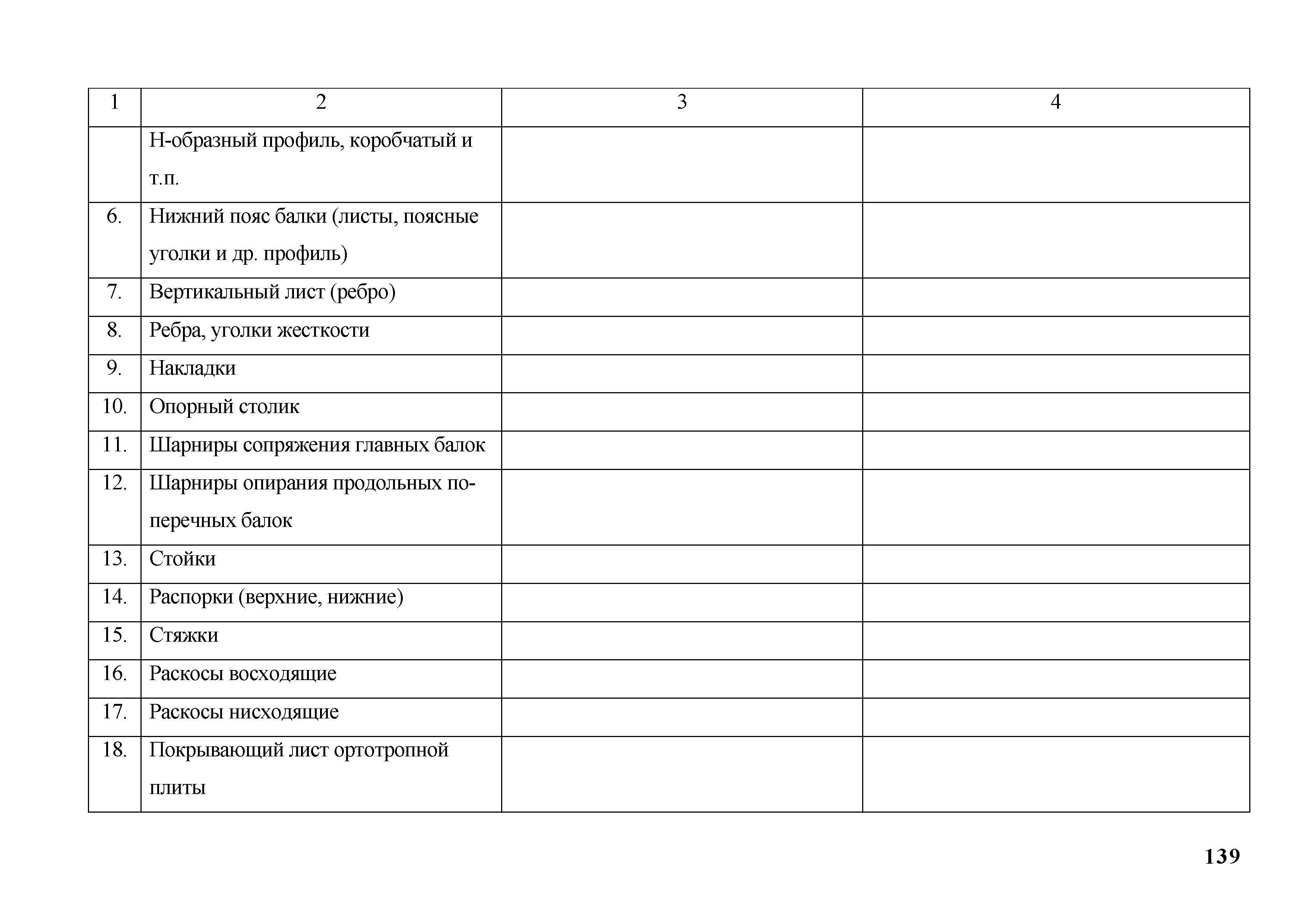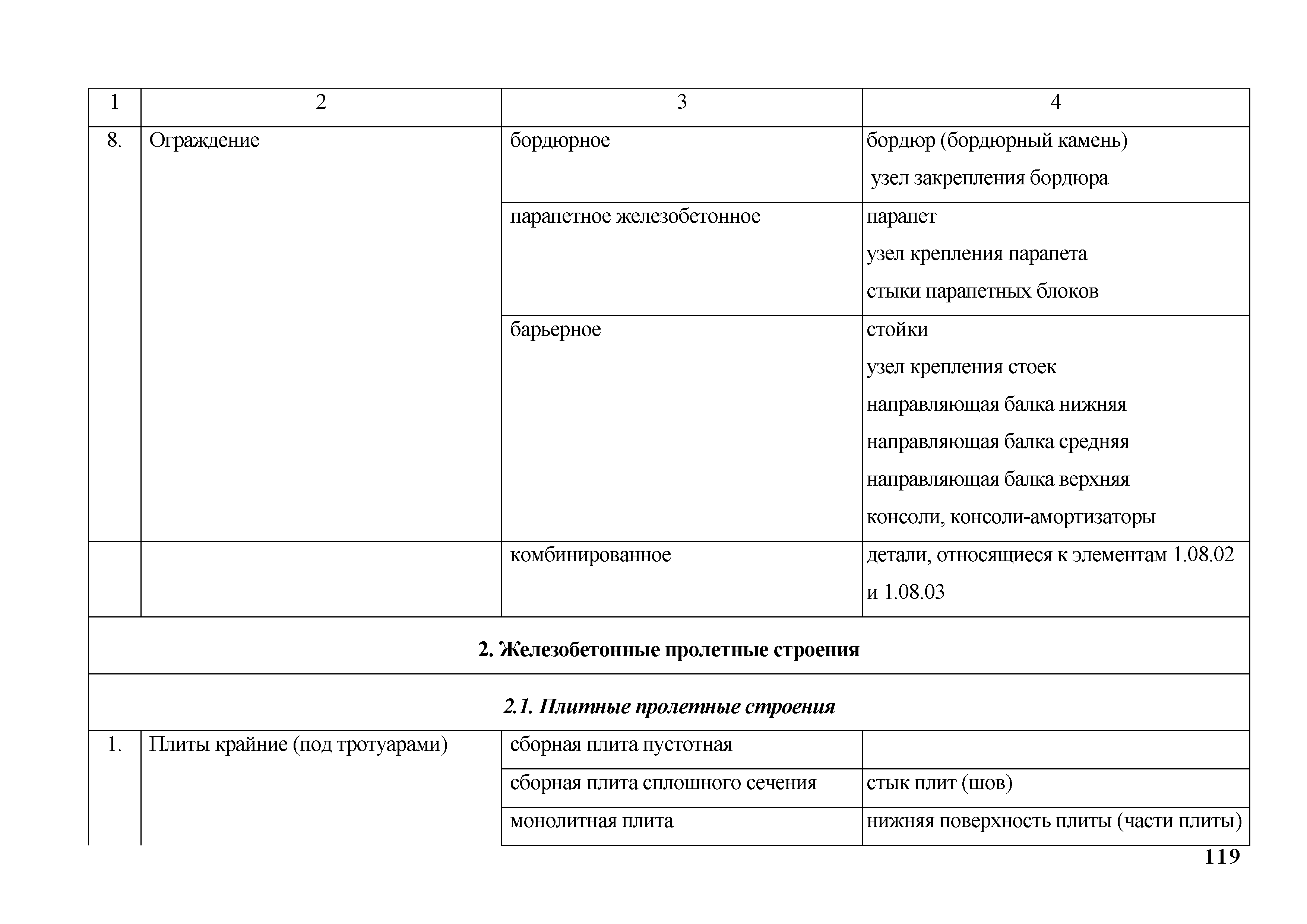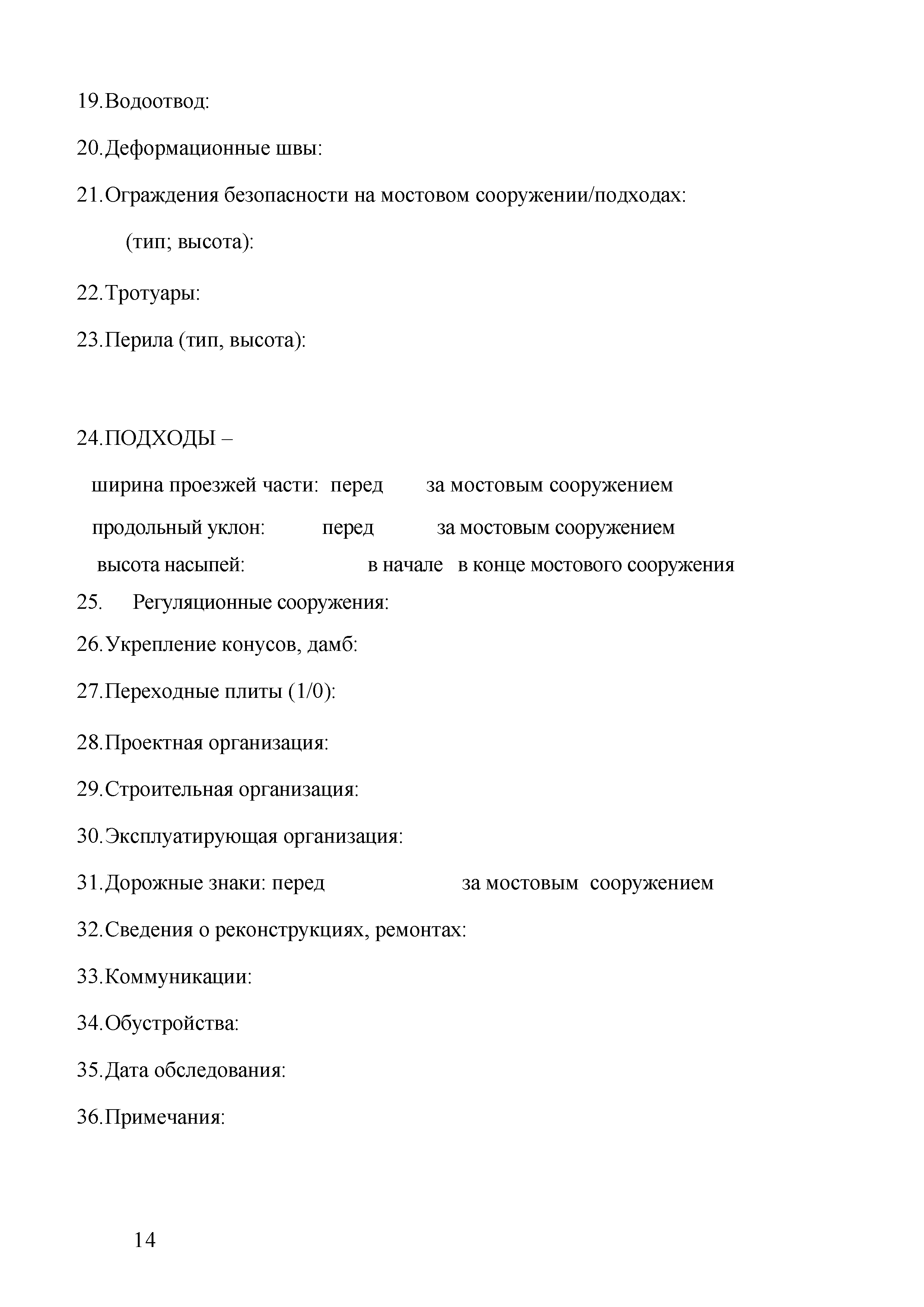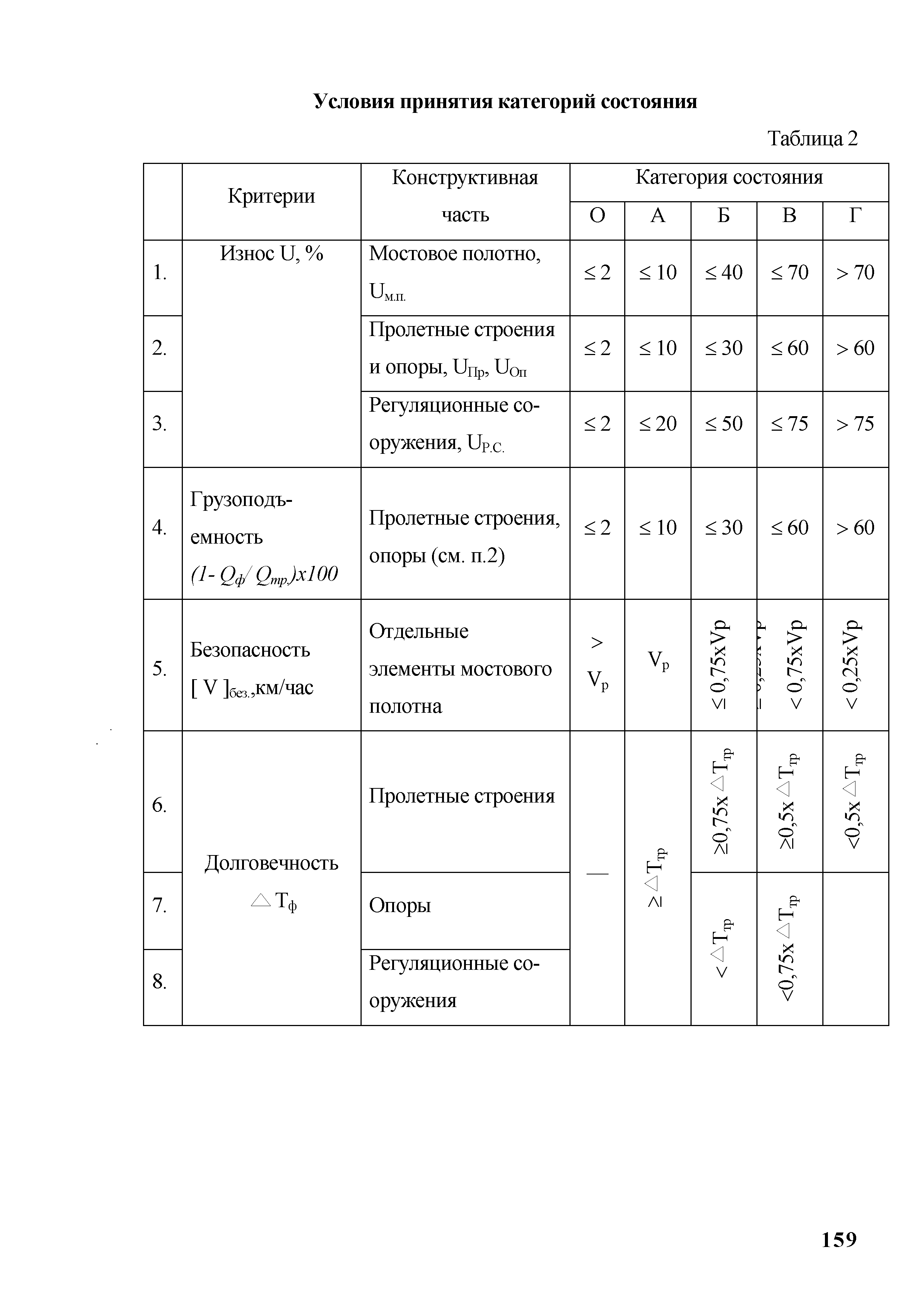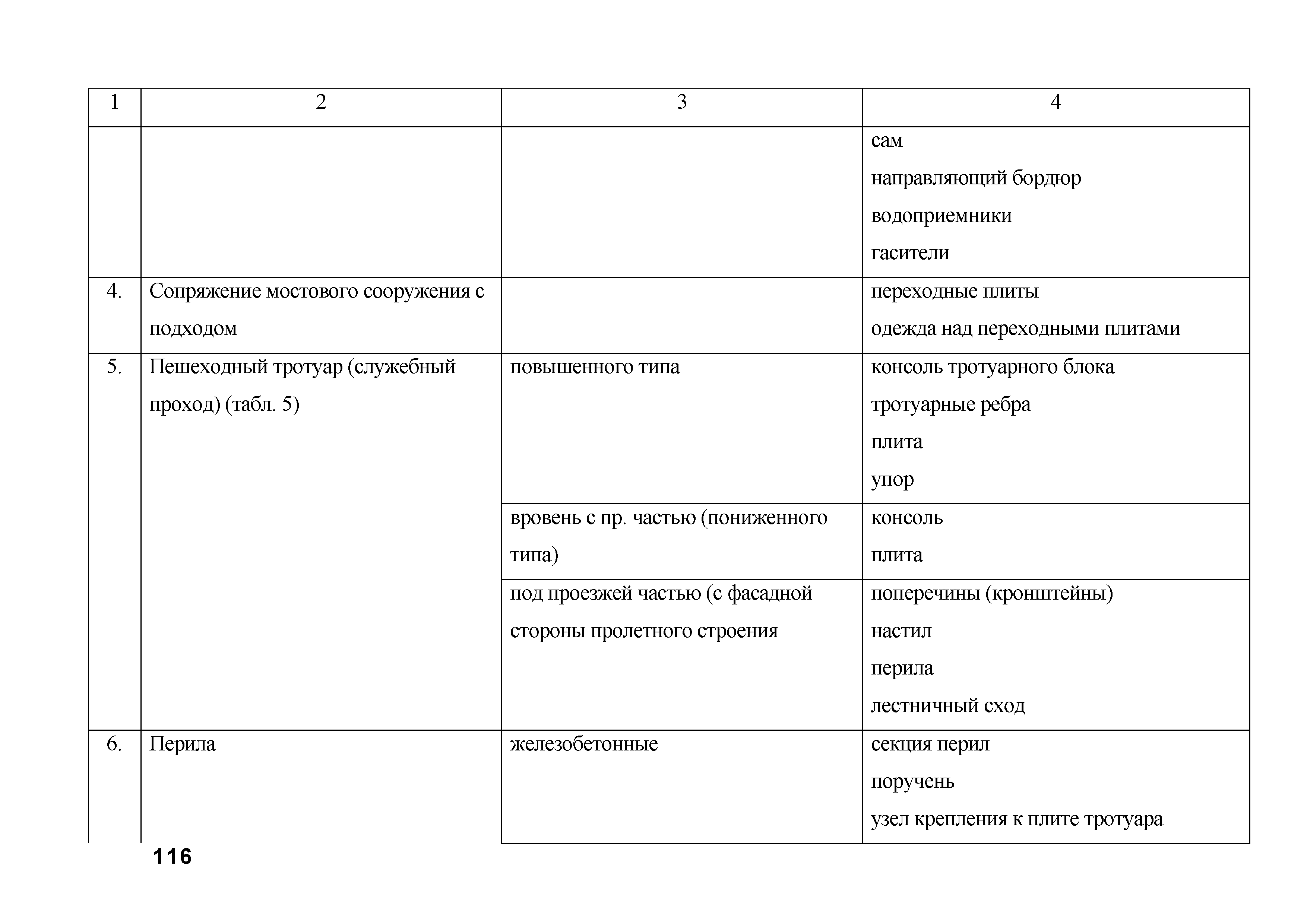| Оглавление: | 1. Предисловие 2. Общие положения 3. Формы паспорта, порядок диагностики и записи информации. Пояснения к формам паспорта 3.1. Титульный лист паспорта 3.2. Форма 1. "Общие сведения". Пояснения к форме 1 3.3. Форма 2. "Пролетное строение". Пояснения к форме 2 3.4. Форма 3. "Опоры". Пояснения к форме 3 3.5. Форма 4. "Список технической документации". Пояснения к форме 4 3.6. Форма 5. "Ведомость дефектов". Пояснения к форме 5 3.7. Форма 6. "Состояние сооружения". Пояснения к форме 6 3.8. Форма Д. "Дополнительная информация". Пояснения к форме "Д" 3.9. Пояснительная записка, пояснения Приложение 1. Перечень федеральных округов Приложение 2. Таблицы для заполнения форм паспорта Приложение 3. Перечень дефектов, включаемых в форму 5 Приложение 4. Каталог конструкций и элементов Приложение 5. Оценка состояния Приложение 6. Документы, используемые при заполнении форм паспорта |