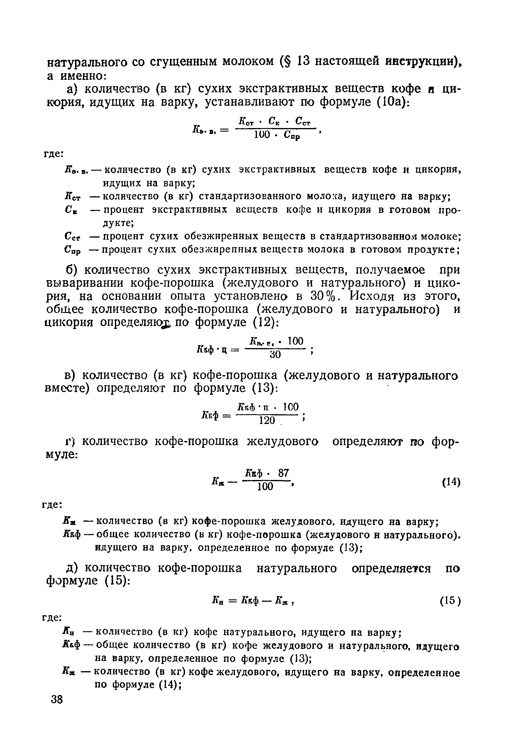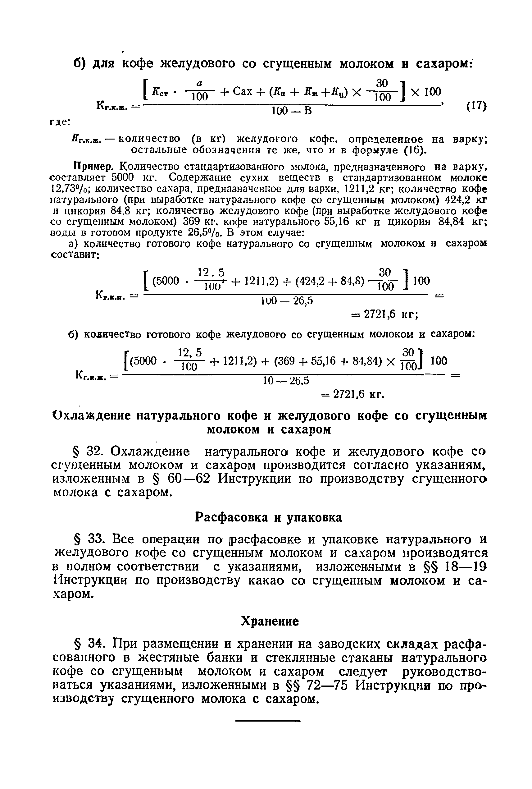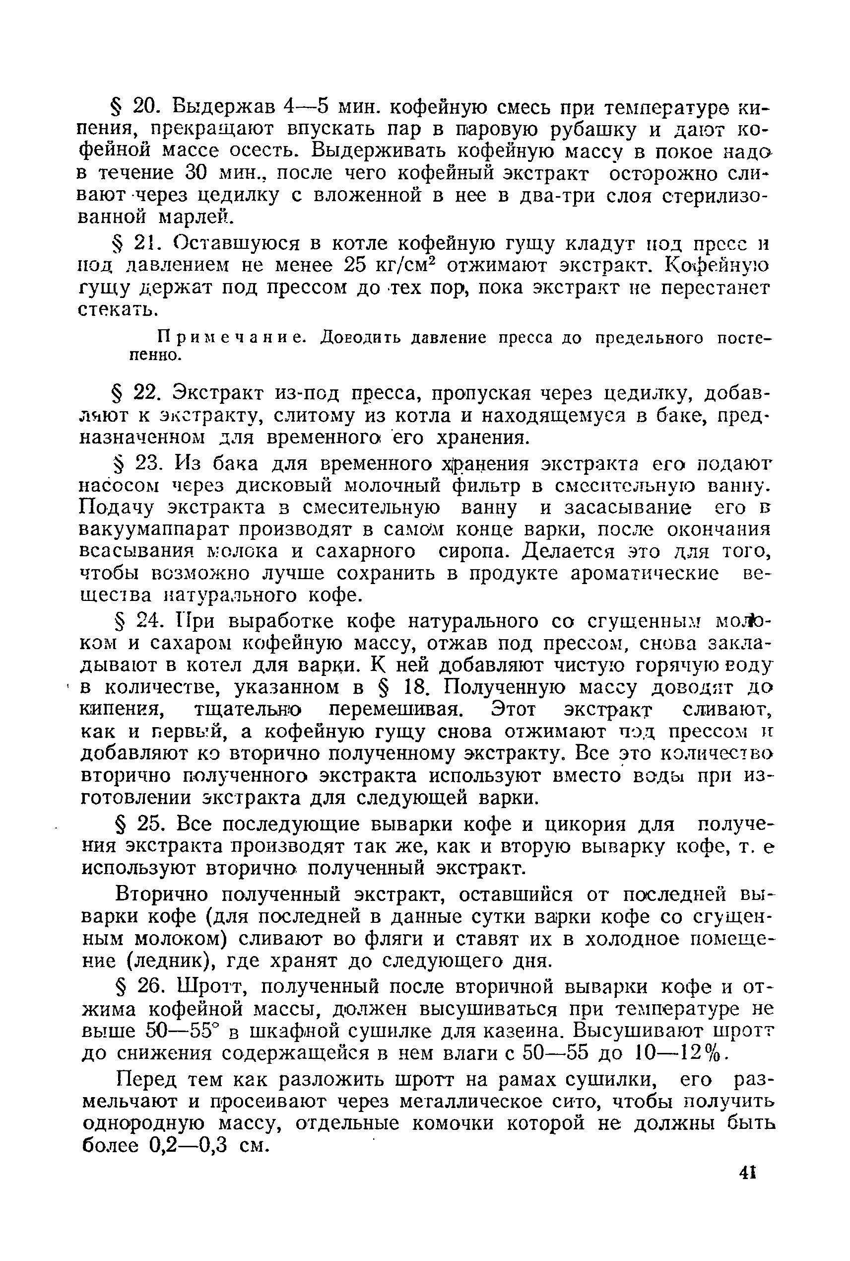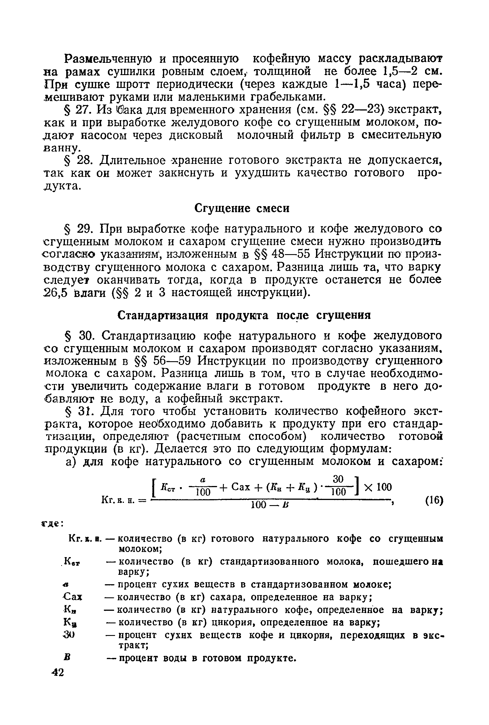 Технологическая инструкция по производству кофе натурального и кофе желудового со сгущенным молоком и сахаром| Статус: | действует | | Название рус.: | Технологическая инструкция по производству кофе натурального и кофе желудового со сгущенным молоком и сахаром | | Дата добавления в базу: | 01.02.2017 | | Дата актуализации: | 01.01.2021 | | Дата введения: | 16.10.1946 | | Область применения: | Кофе натуральный и кофе желудовый со сгущенным молоком и сахаром представляют собой сгущенное молоко с сахаром, к которому добавлен экстракт, полученный путем вываривания порошка натурального кофе и цикория или желудового кофе, к которому добавлены натуральный кофе и цикорий. В настоящей инструкции детально разработаны только те операции, которые отличаются от соответствующих операций производства сгущенного молока с сахаром, а именно: стандартизация исходных смесей, приготовление экстракта кофе, введение экстракта в перерабатываемое молоко. | | Оглавление: | Введение Приемка, очистка, охлаждение и хранение молока Стандартизация молока Пастеризация молока Определение количества сахара, идущего на варку, и приготовление сахарного сиропа Приготовление экстракта из натурального кофе и цикория и из желудового кофе и цикория Сгущение смеси Стандартизация продукта после сгущения Охлаждение натурального кофе и желудового кофе со сгущенным молоком и сахаром Расфасовка и упаковка Хранение | | Утверждён: | 16.10.1946 Министерство мясной и молочной промышленности СССР