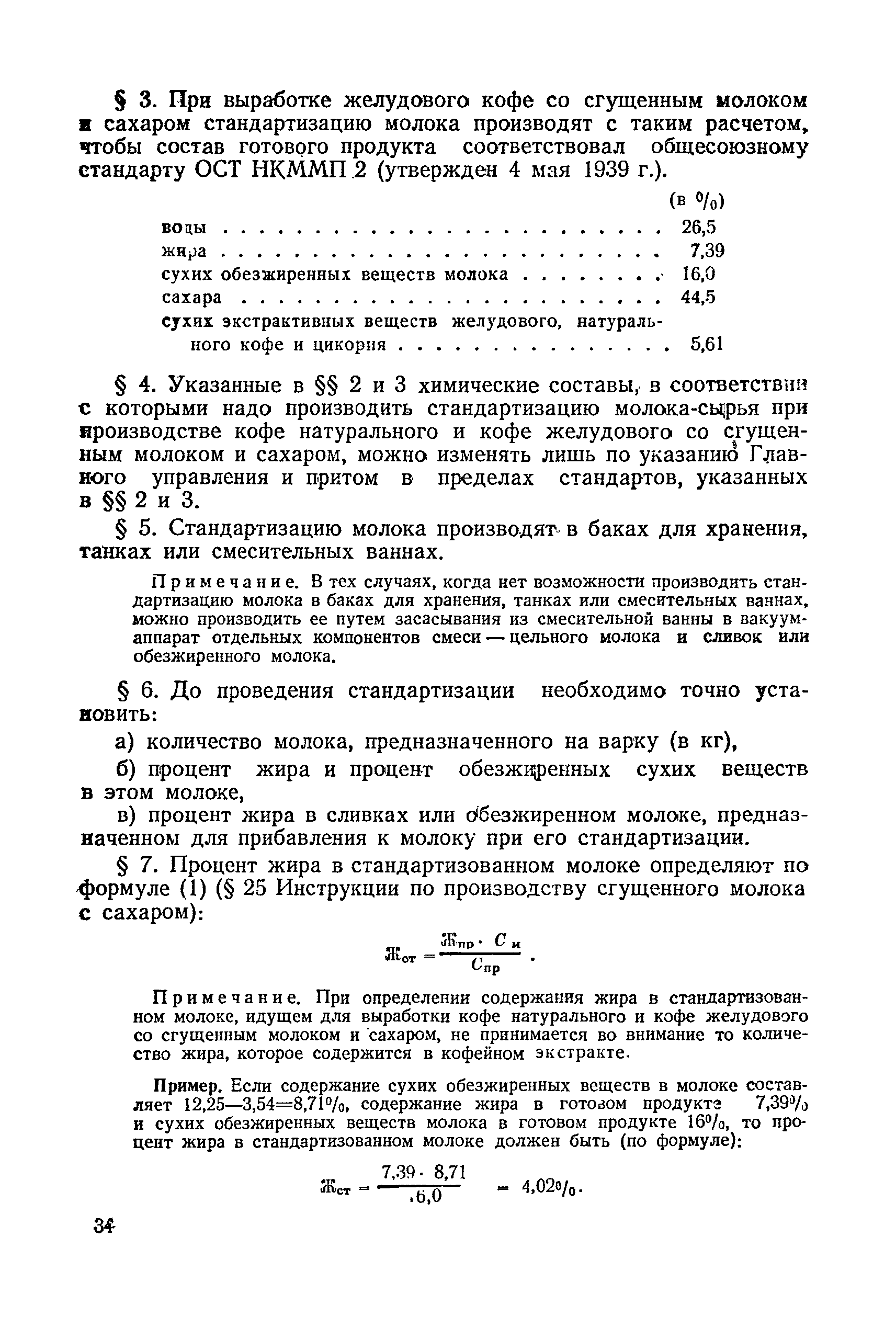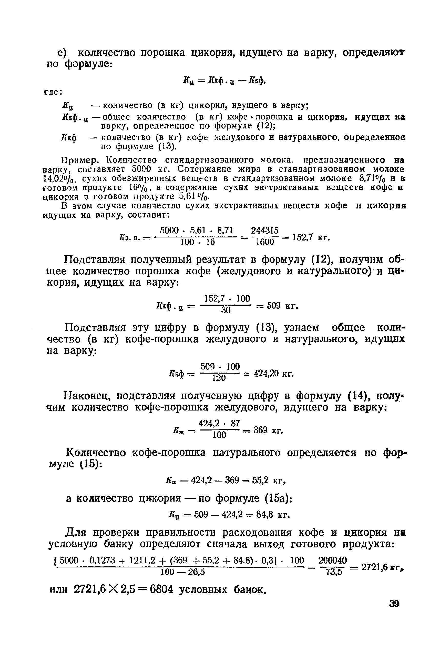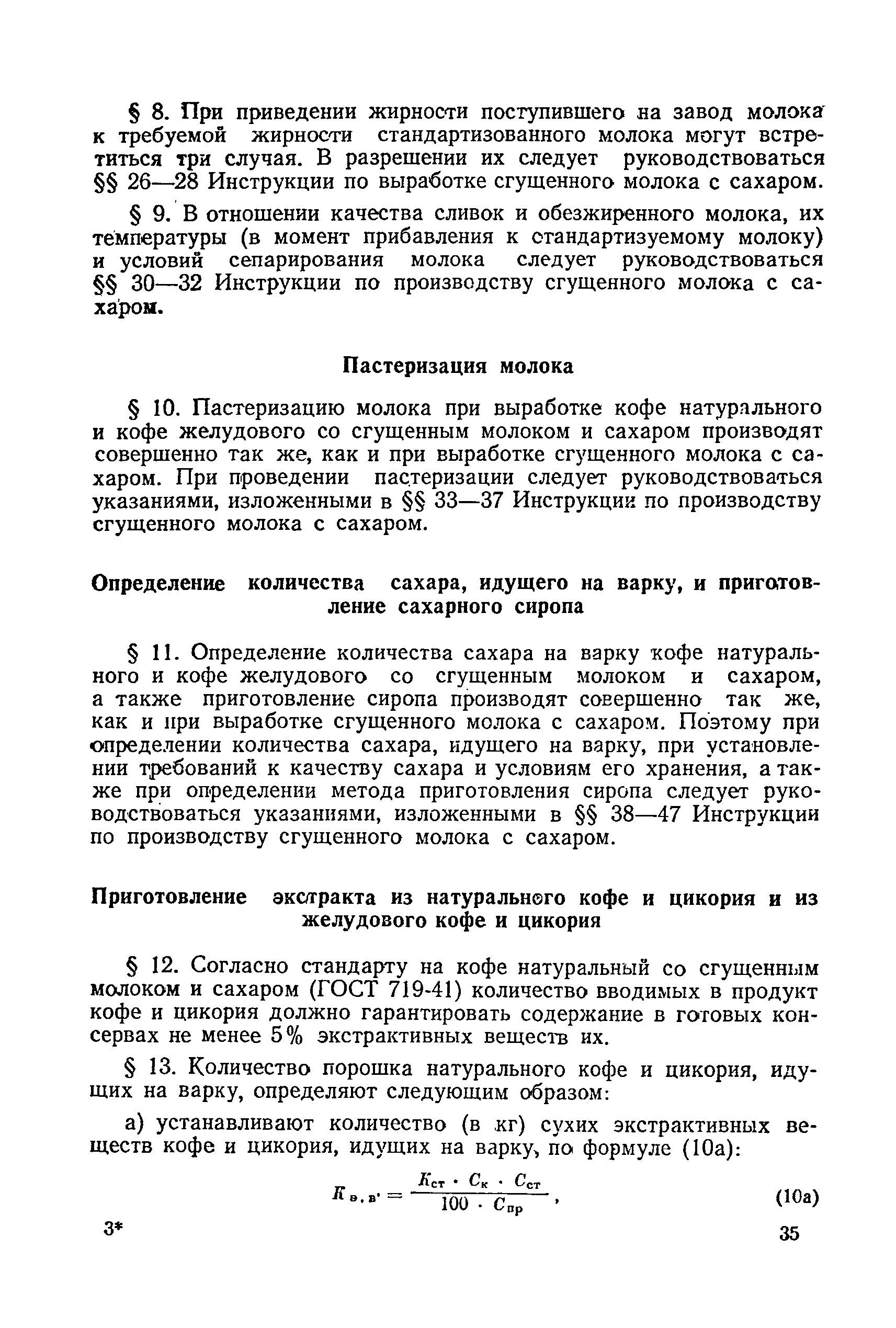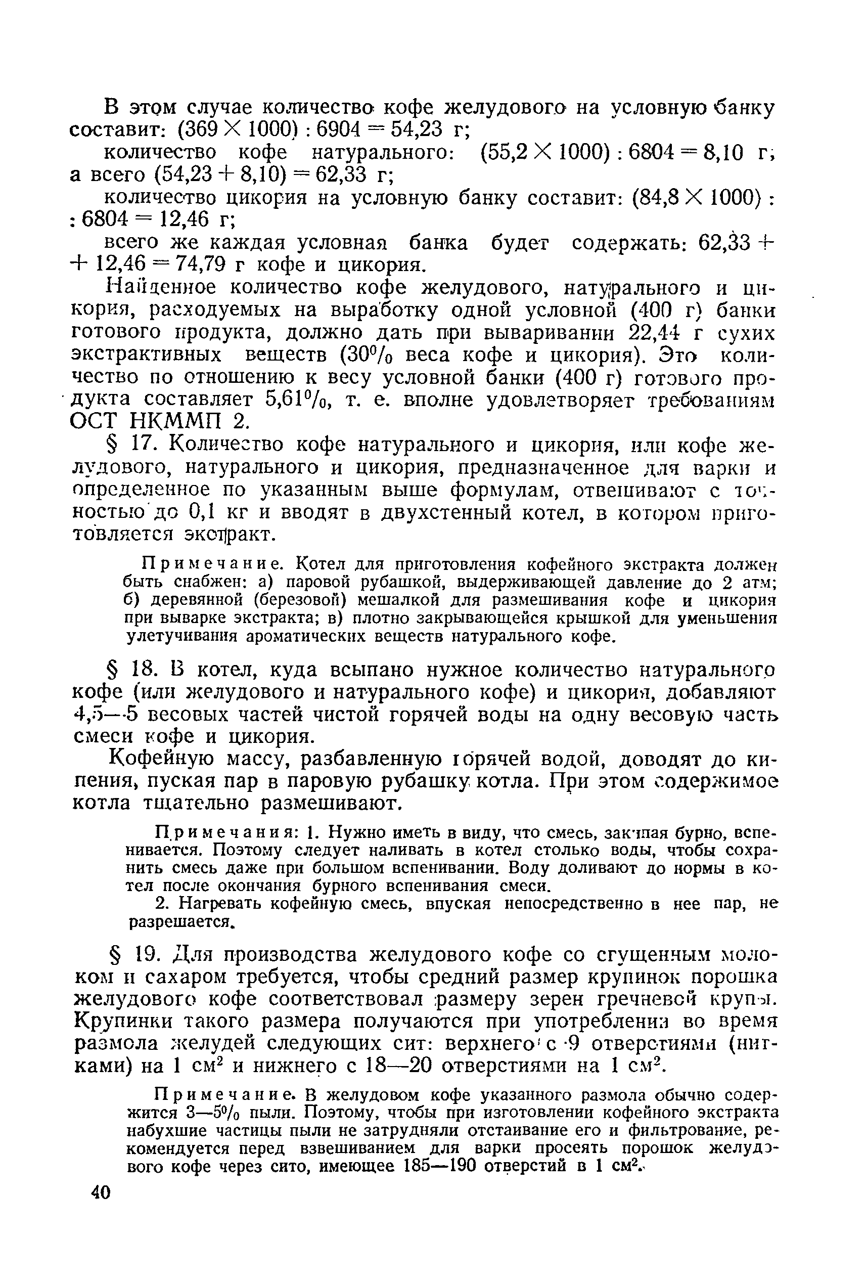 Технологическая инструкция по производству кофе натурального и кофе желудового со сгущенным молоком и сахаром| Статус: | действует | | Название рус.: | Технологическая инструкция по производству кофе натурального и кофе желудового со сгущенным молоком и сахаром | | Дата добавления в базу: | 01.02.2017 | | Дата актуализации: | 01.01.2021 | | Дата введения: | 16.10.1946 | | Область применения: | Кофе натуральный и кофе желудовый со сгущенным молоком и сахаром представляют собой сгущенное молоко с сахаром, к которому добавлен экстракт, полученный путем вываривания порошка натурального кофе и цикория или желудового кофе, к которому добавлены натуральный кофе и цикорий. В настоящей инструкции детально разработаны только те операции, которые отличаются от соответствующих операций производства сгущенного молока с сахаром, а именно: стандартизация исходных смесей, приготовление экстракта кофе, введение экстракта в перерабатываемое молоко. | | Оглавление: | Введение Приемка, очистка, охлаждение и хранение молока Стандартизация молока Пастеризация молока Определение количества сахара, идущего на варку, и приготовление сахарного сиропа Приготовление экстракта из натурального кофе и цикория и из желудового кофе и цикория Сгущение смеси Стандартизация продукта после сгущения Охлаждение натурального кофе и желудового кофе со сгущенным молоком и сахаром Расфасовка и упаковка Хранение | | Утверждён: | 16.10.1946 Министерство мясной и молочной промышленности СССР