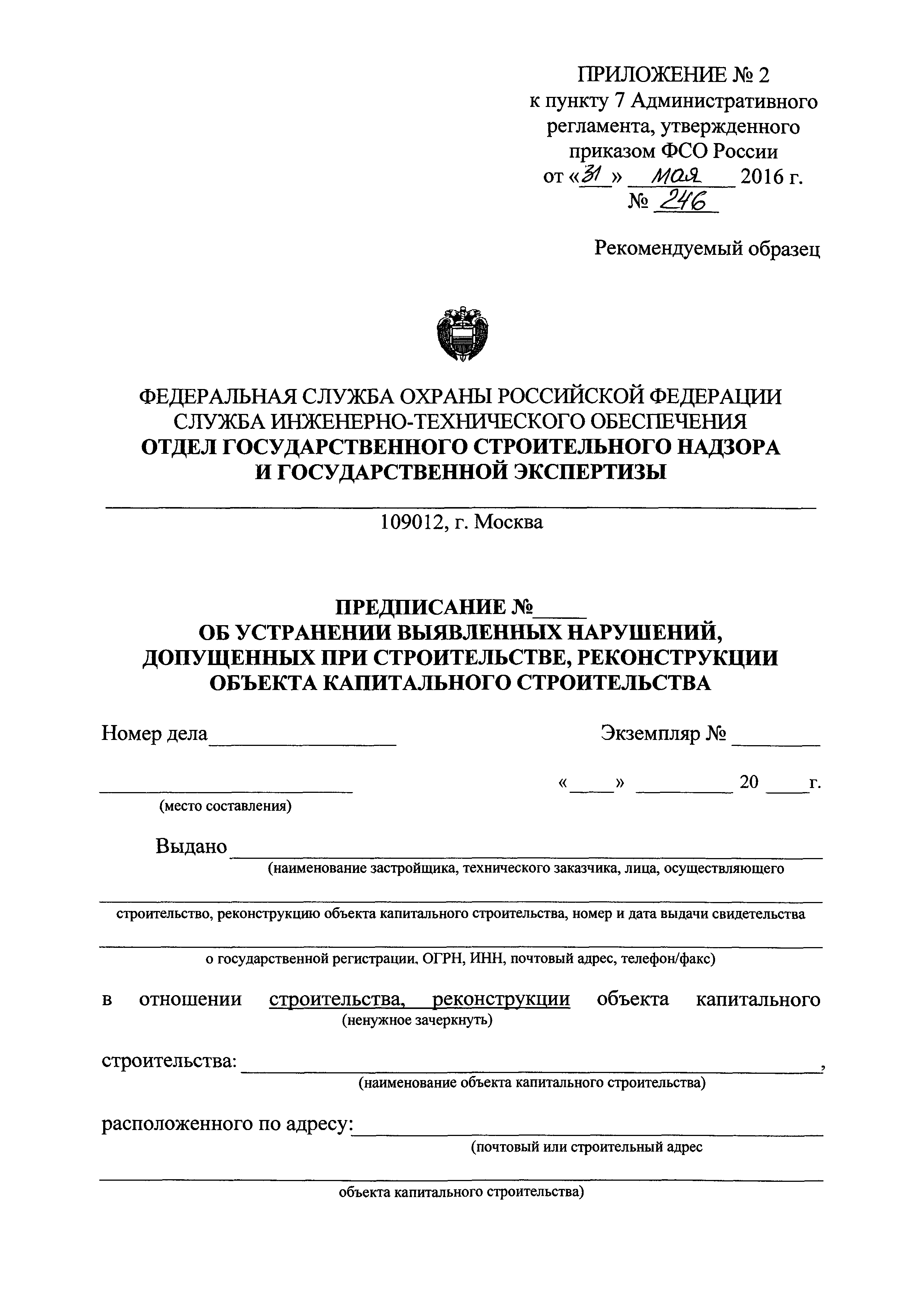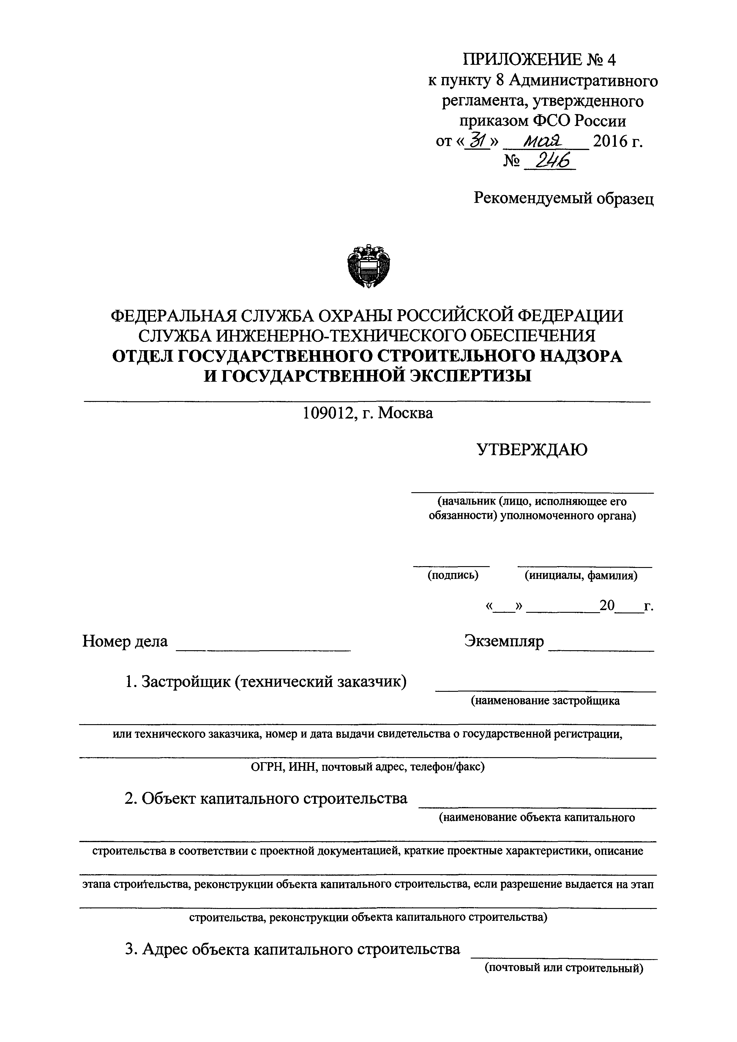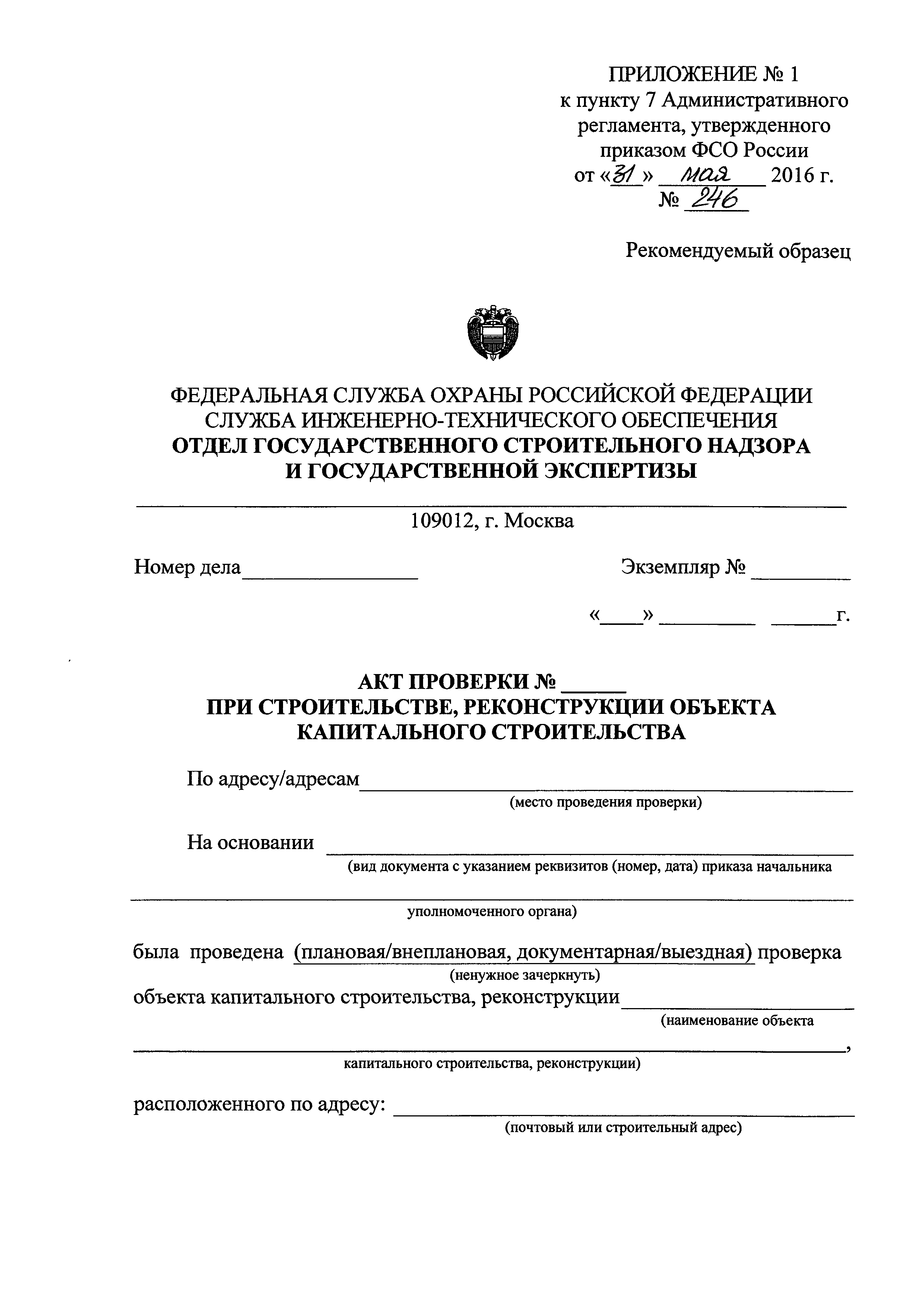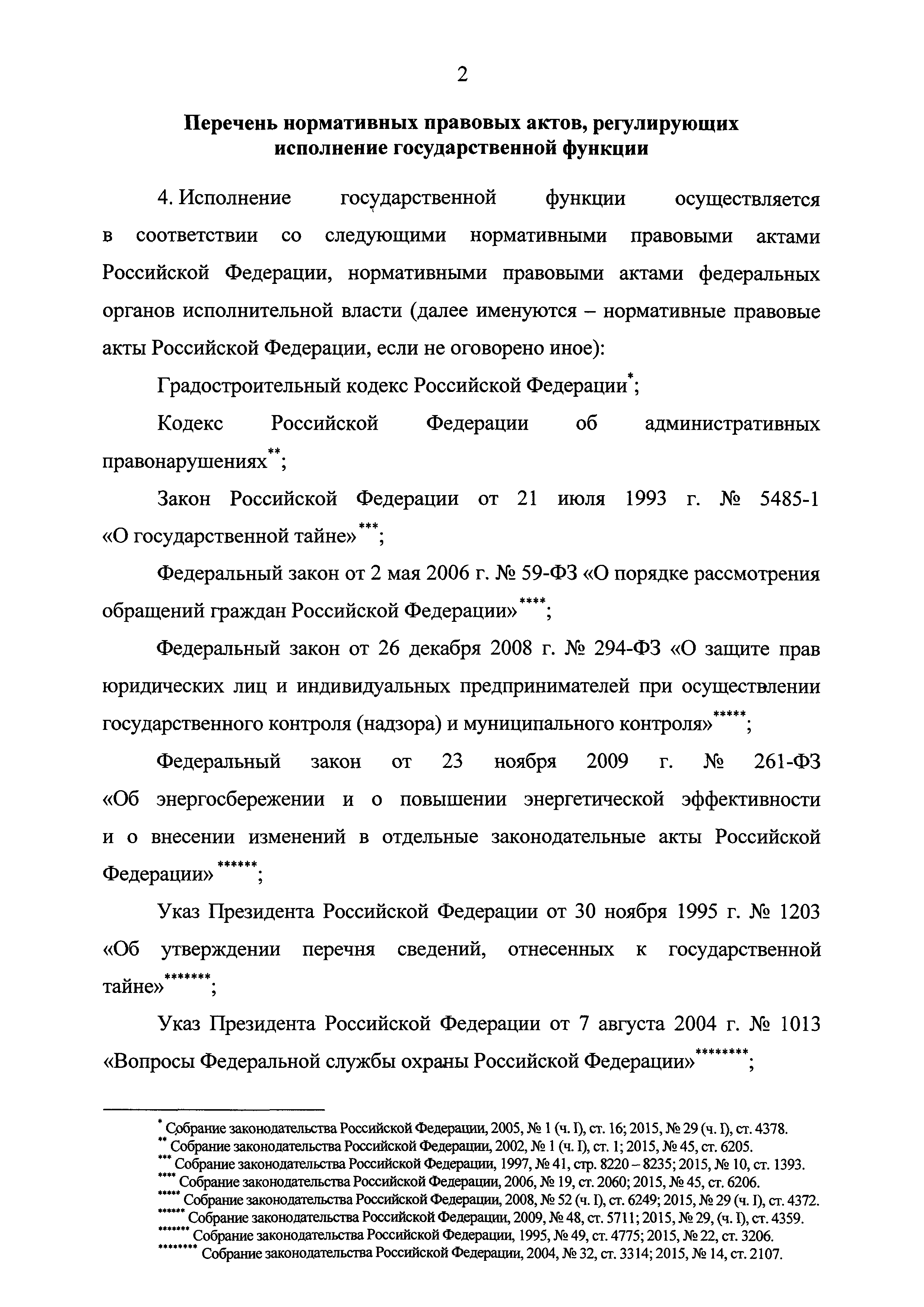 Административный регламент исполнения Федеральной службой охраны Российской Федерации государственной функции по осуществлению федерального государственного строительного надзора при строительстве и реконструкции объектов обороны и безопасности и объектов, сведения о которых составляют государственную тайну, заказчиком которых выступают органы государственной охраны| Статус: | действует | | Название рус.: | Административный регламент исполнения Федеральной службой охраны Российской Федерации государственной функции по осуществлению федерального государственного строительного надзора при строительстве и реконструкции объектов обороны и безопасности и объектов, сведения о которых составляют государственную тайну, заказчиком которых выступают органы государственной охраны | | Дата добавления в базу: | 01.02.2017 | | Дата актуализации: | 01.01.2021 | | Дата введения: | 02.08.2016 | | Утверждён: | 31.05.2016 Федеральная служба охраны Российской Федерации (246)