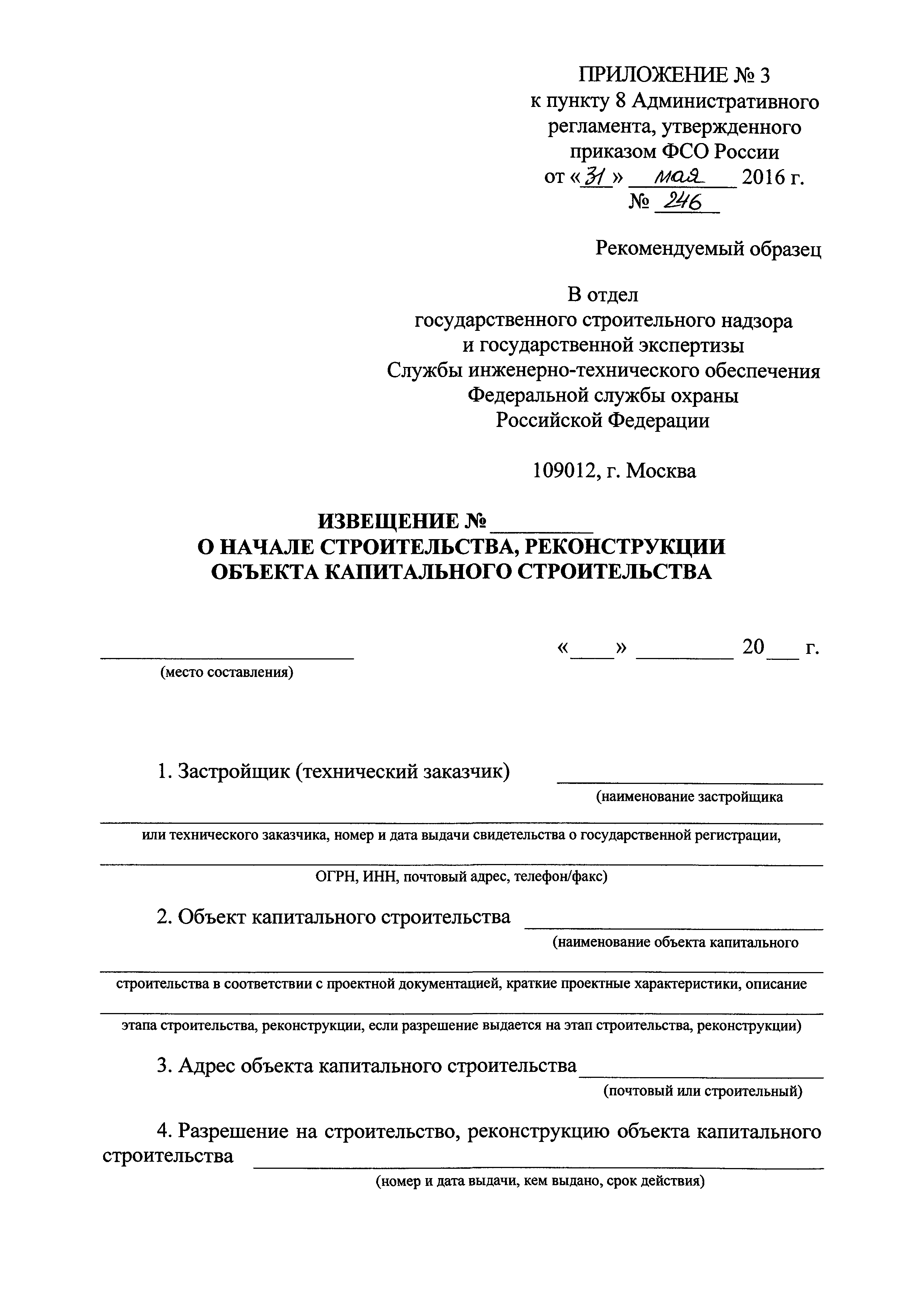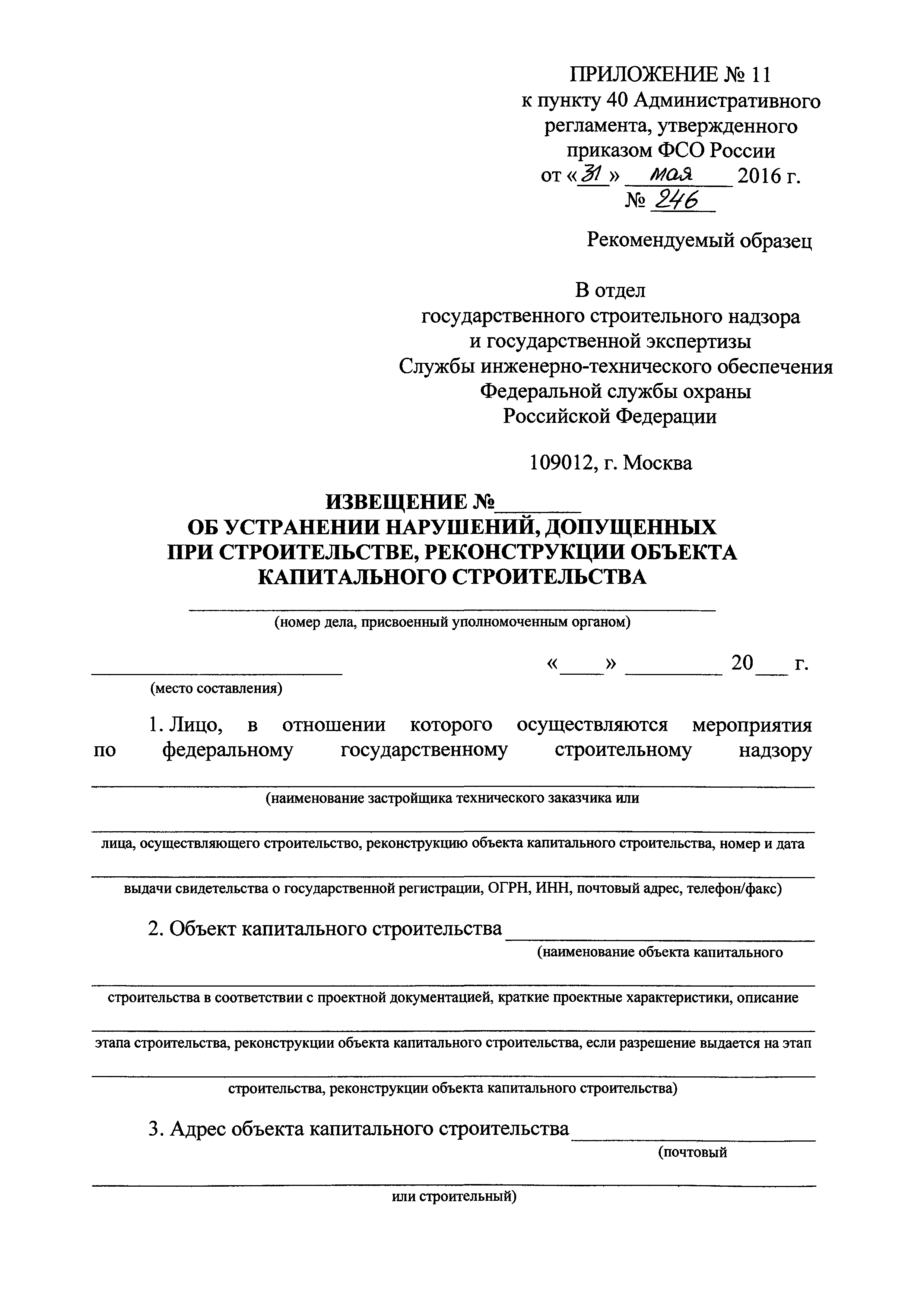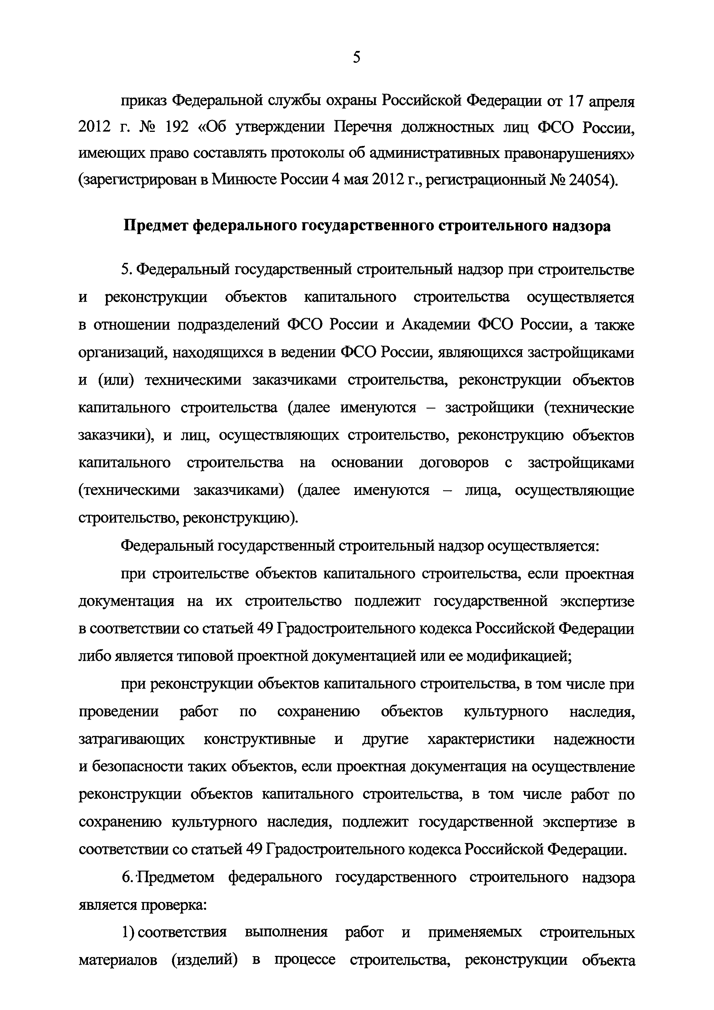 Административный регламент исполнения Федеральной службой охраны Российской Федерации государственной функции по осуществлению федерального государственного строительного надзора при строительстве и реконструкции объектов обороны и безопасности и объектов, сведения о которых составляют государственную тайну, заказчиком которых выступают органы государственной охраны| Статус: | действует | | Название рус.: | Административный регламент исполнения Федеральной службой охраны Российской Федерации государственной функции по осуществлению федерального государственного строительного надзора при строительстве и реконструкции объектов обороны и безопасности и объектов, сведения о которых составляют государственную тайну, заказчиком которых выступают органы государственной охраны | | Дата добавления в базу: | 01.02.2017 | | Дата актуализации: | 01.01.2021 | | Дата введения: | 02.08.2016 | | Утверждён: | 31.05.2016 Федеральная служба охраны Российской Федерации (246)