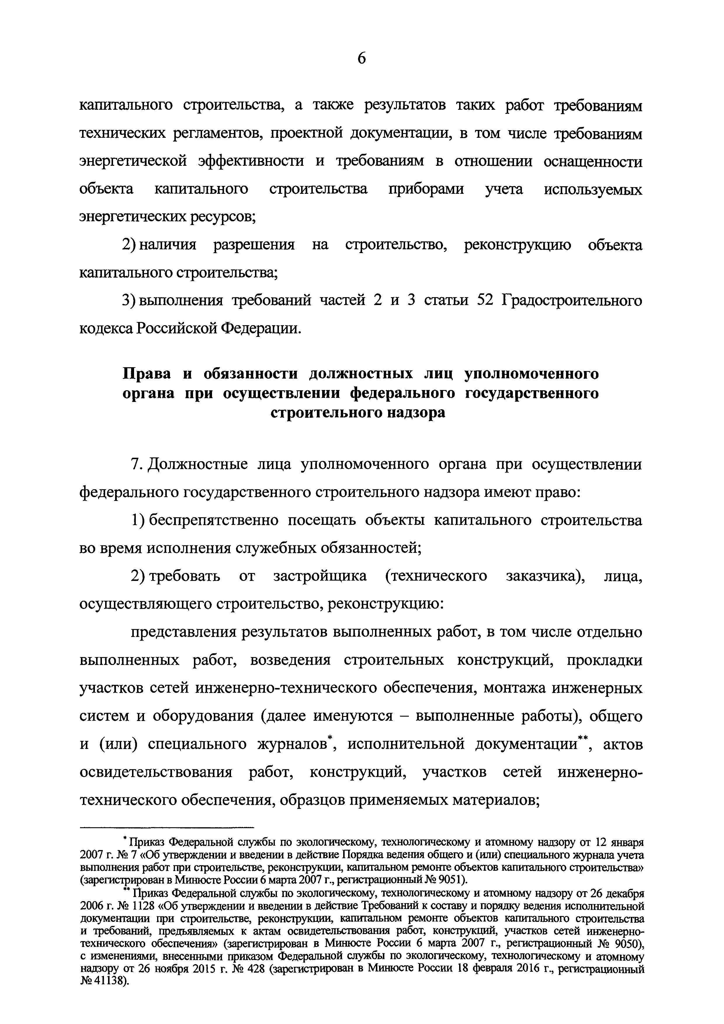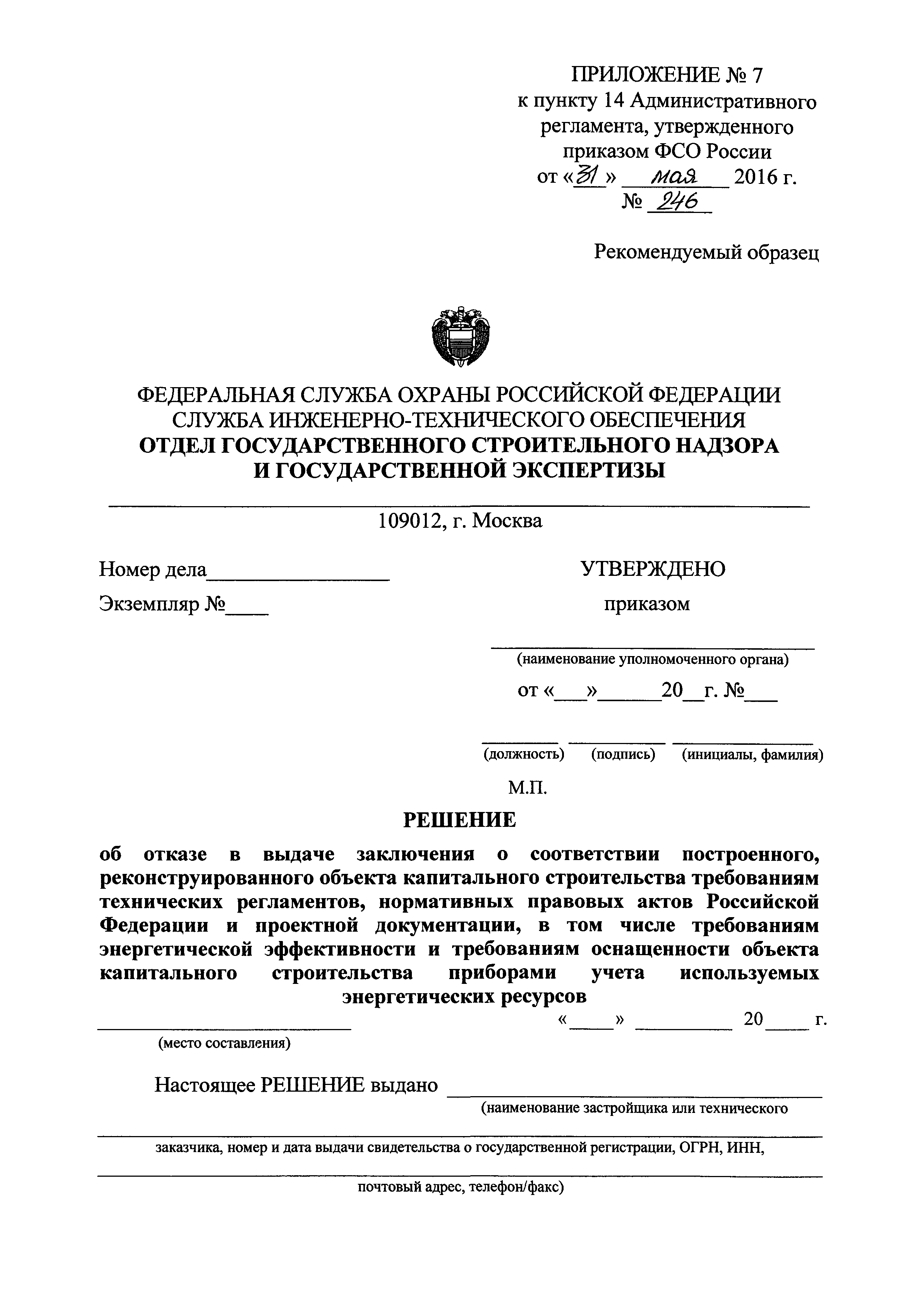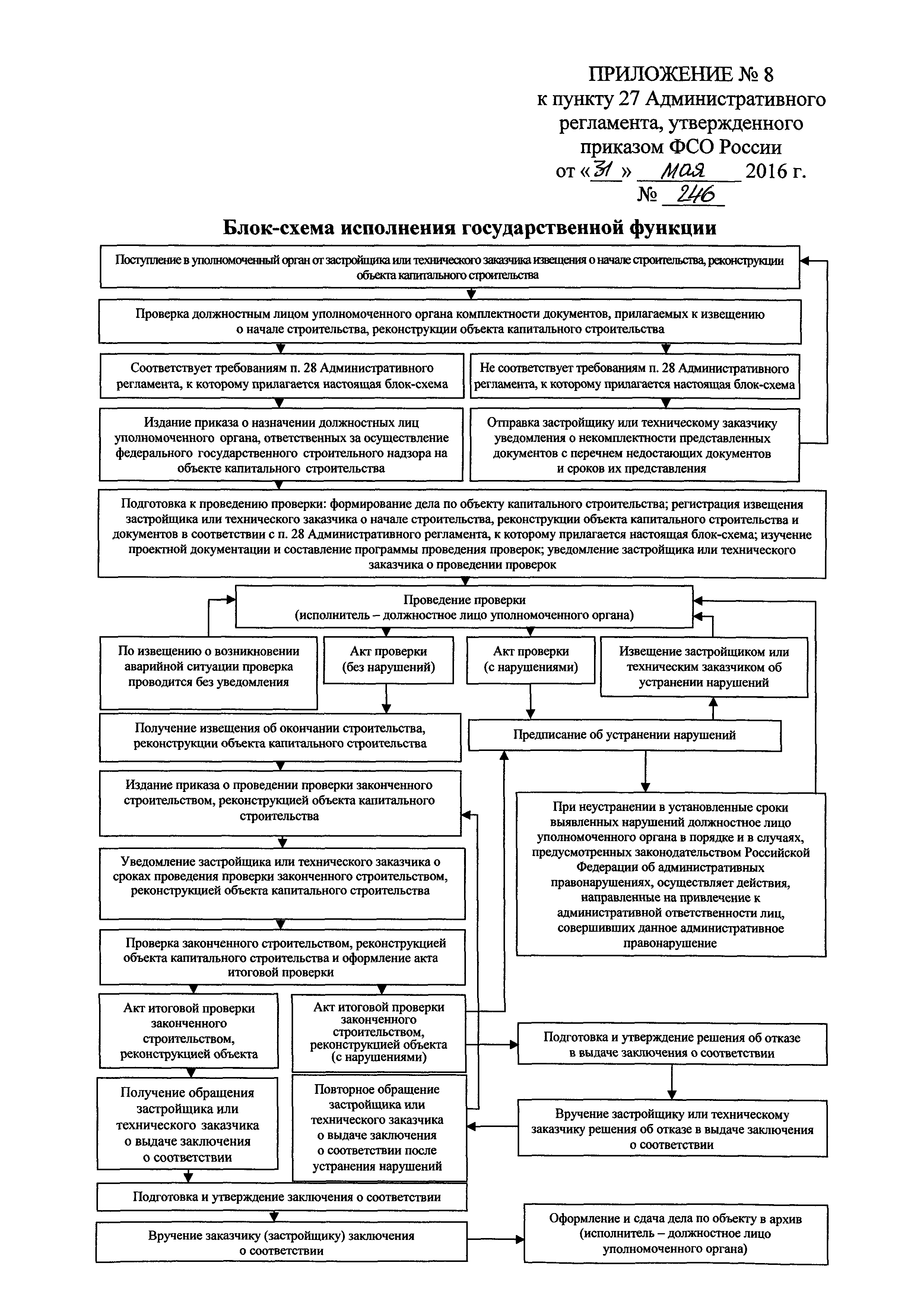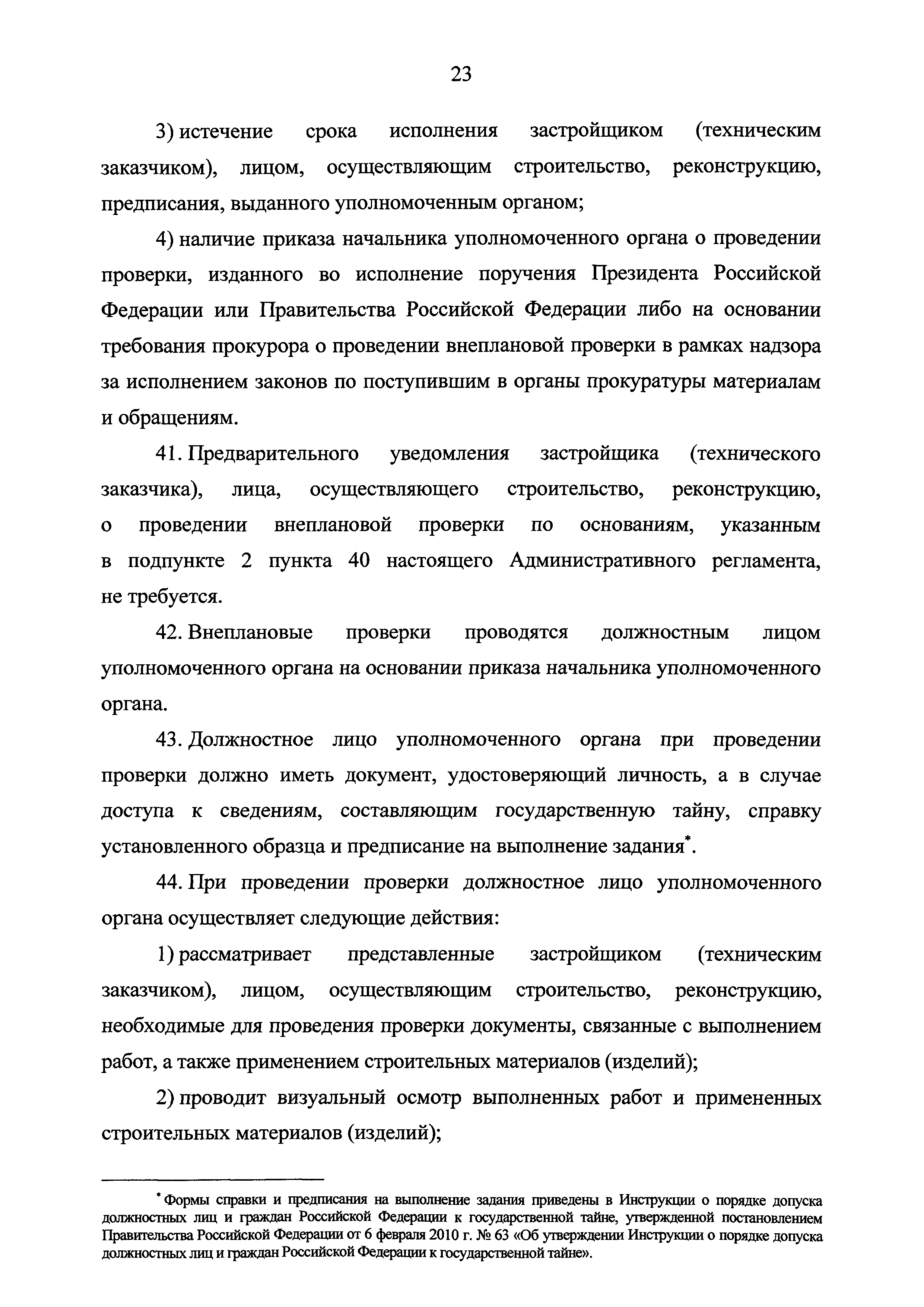 Административный регламент исполнения Федеральной службой охраны Российской Федерации государственной функции по осуществлению федерального государственного строительного надзора при строительстве и реконструкции объектов обороны и безопасности и объектов, сведения о которых составляют государственную тайну, заказчиком которых выступают органы государственной охраны| Статус: | действует | | Название рус.: | Административный регламент исполнения Федеральной службой охраны Российской Федерации государственной функции по осуществлению федерального государственного строительного надзора при строительстве и реконструкции объектов обороны и безопасности и объектов, сведения о которых составляют государственную тайну, заказчиком которых выступают органы государственной охраны | | Дата добавления в базу: | 01.02.2017 | | Дата актуализации: | 01.01.2021 | | Дата введения: | 02.08.2016 | | Утверждён: | 31.05.2016 Федеральная служба охраны Российской Федерации (246)