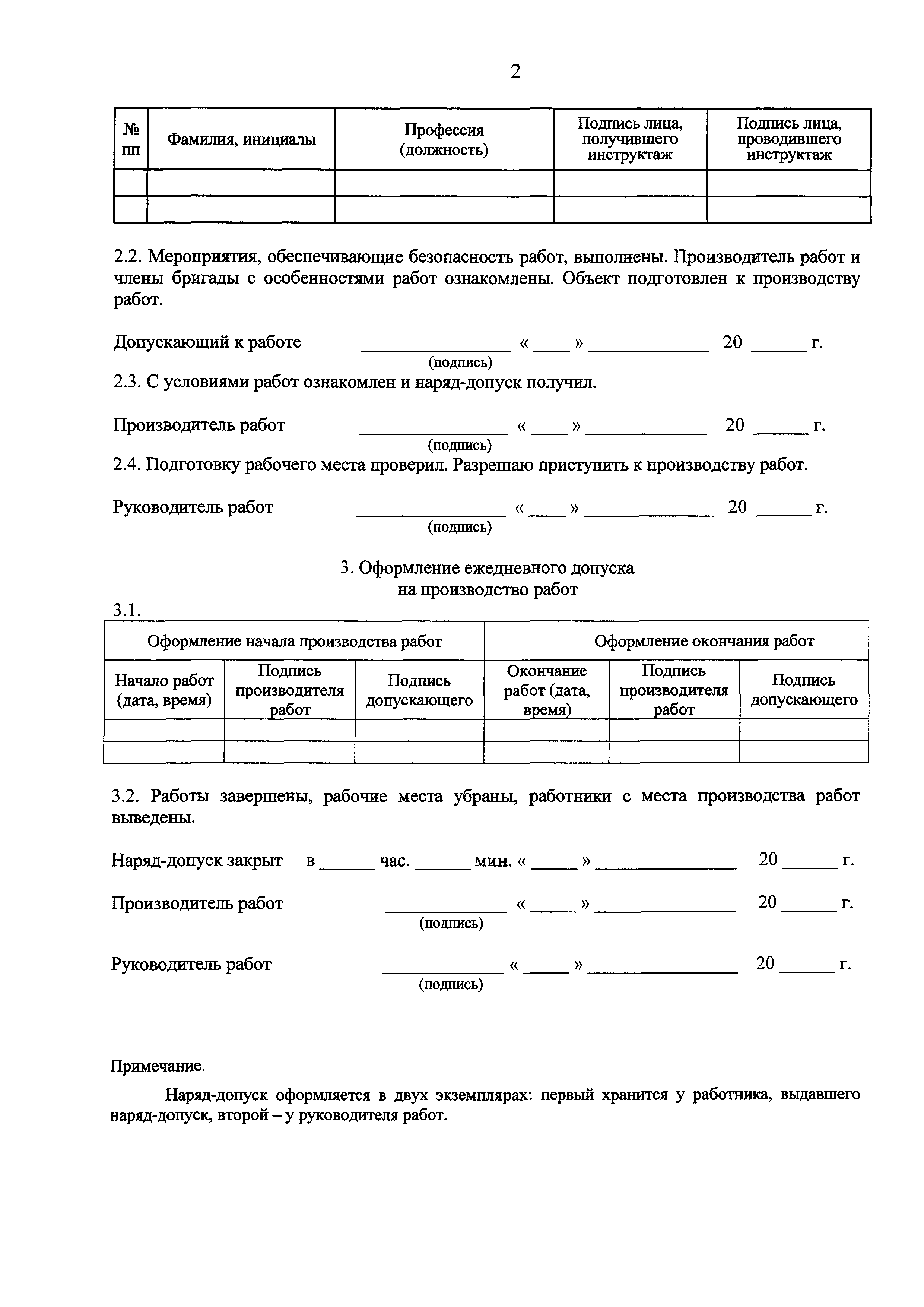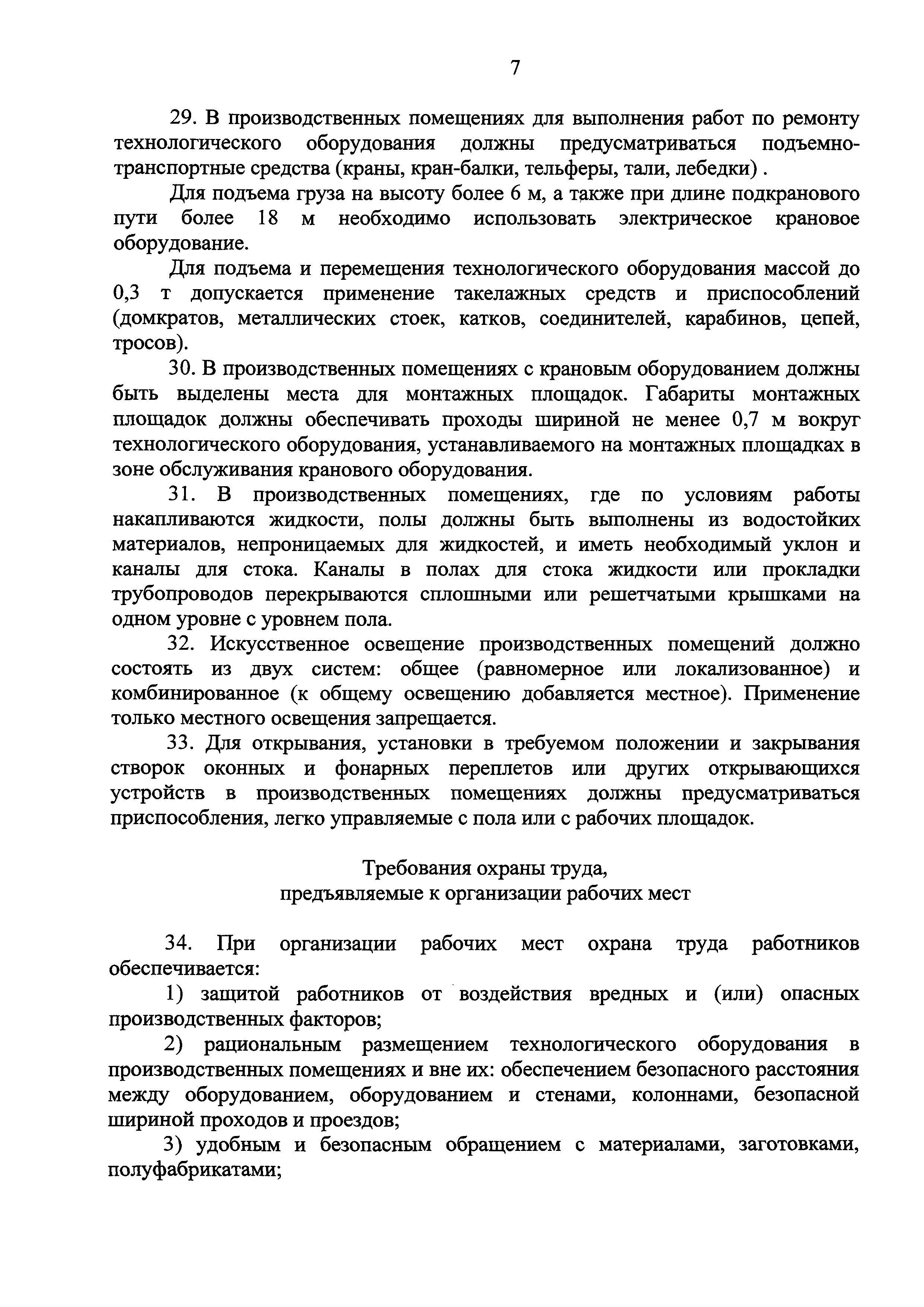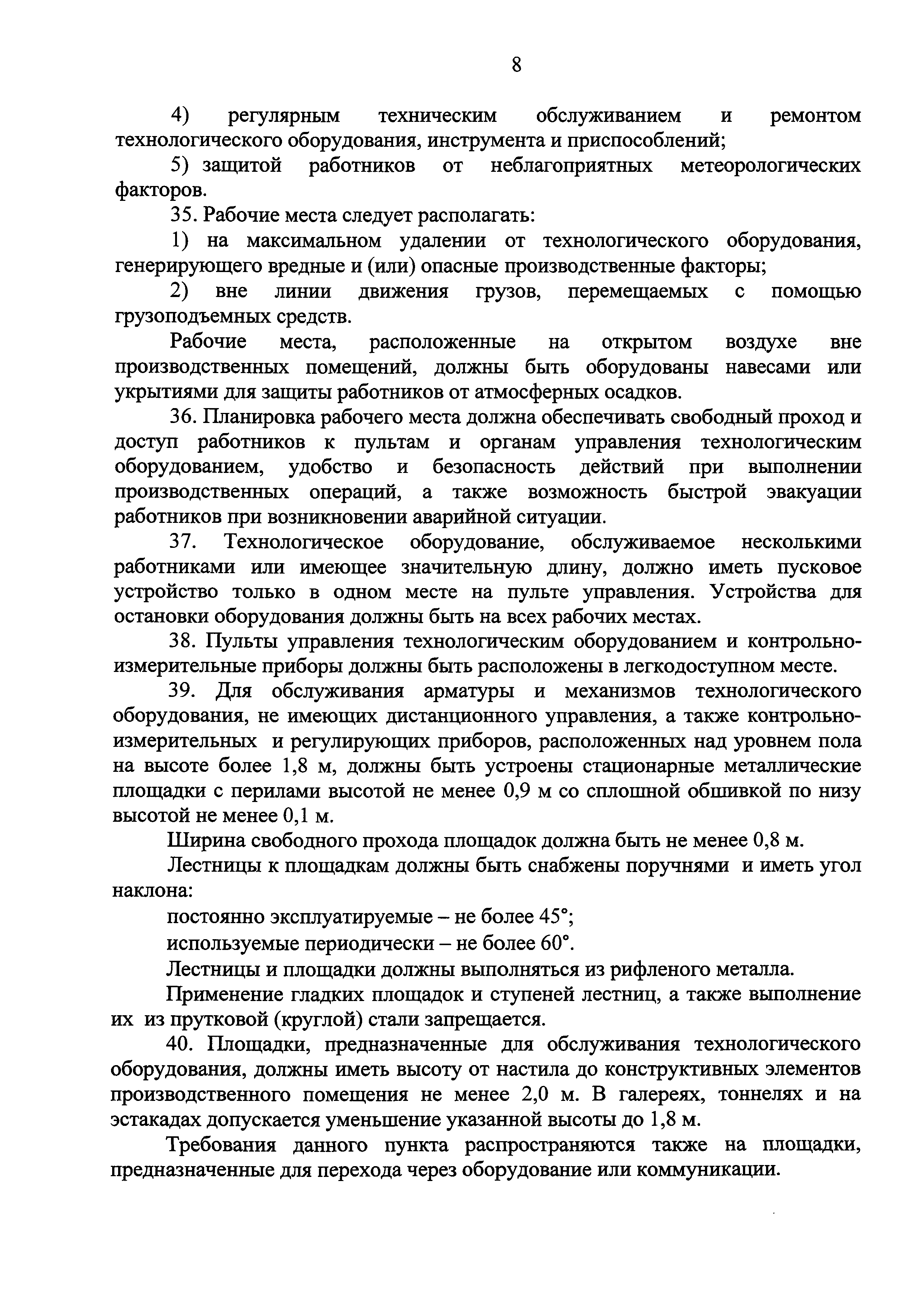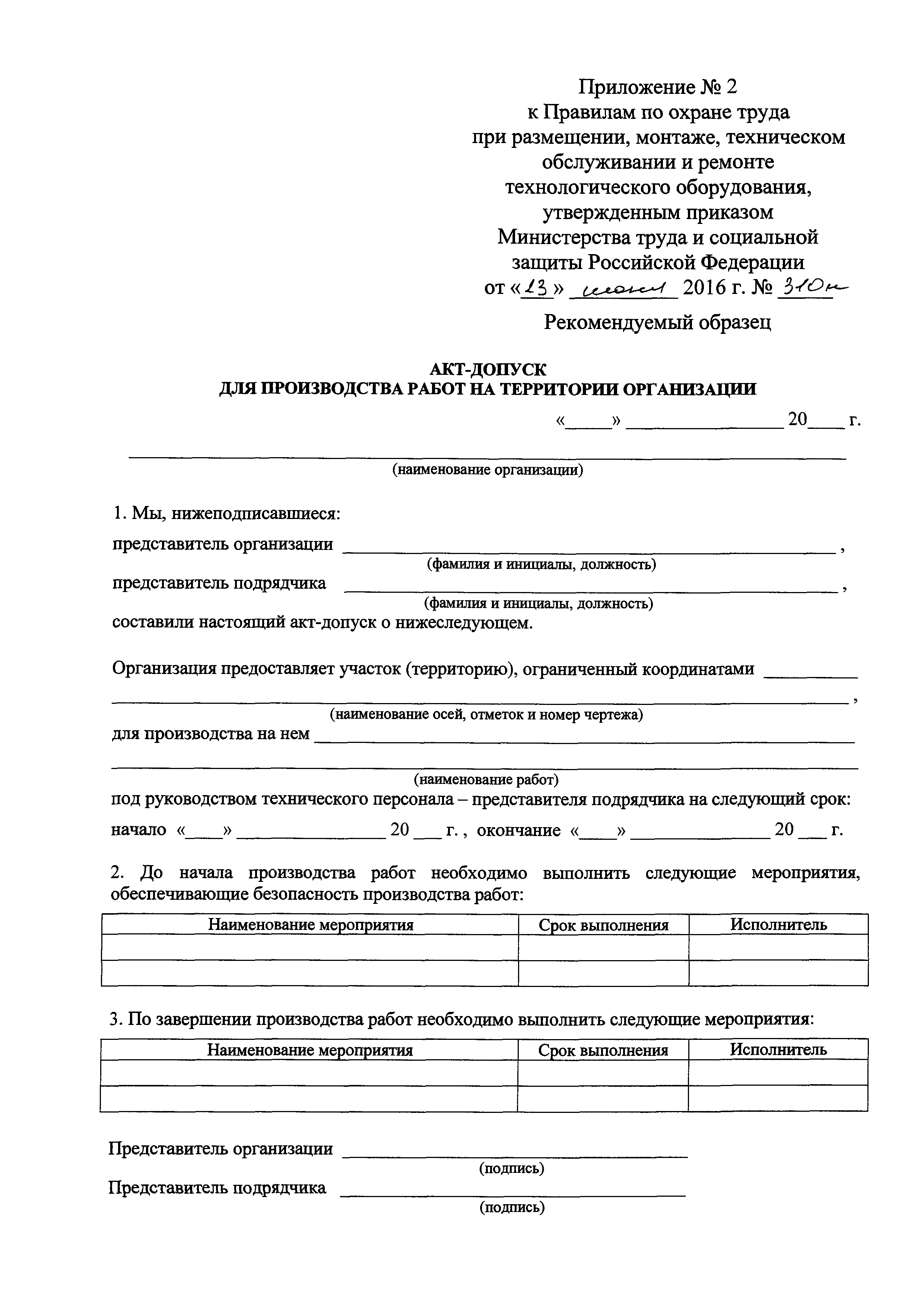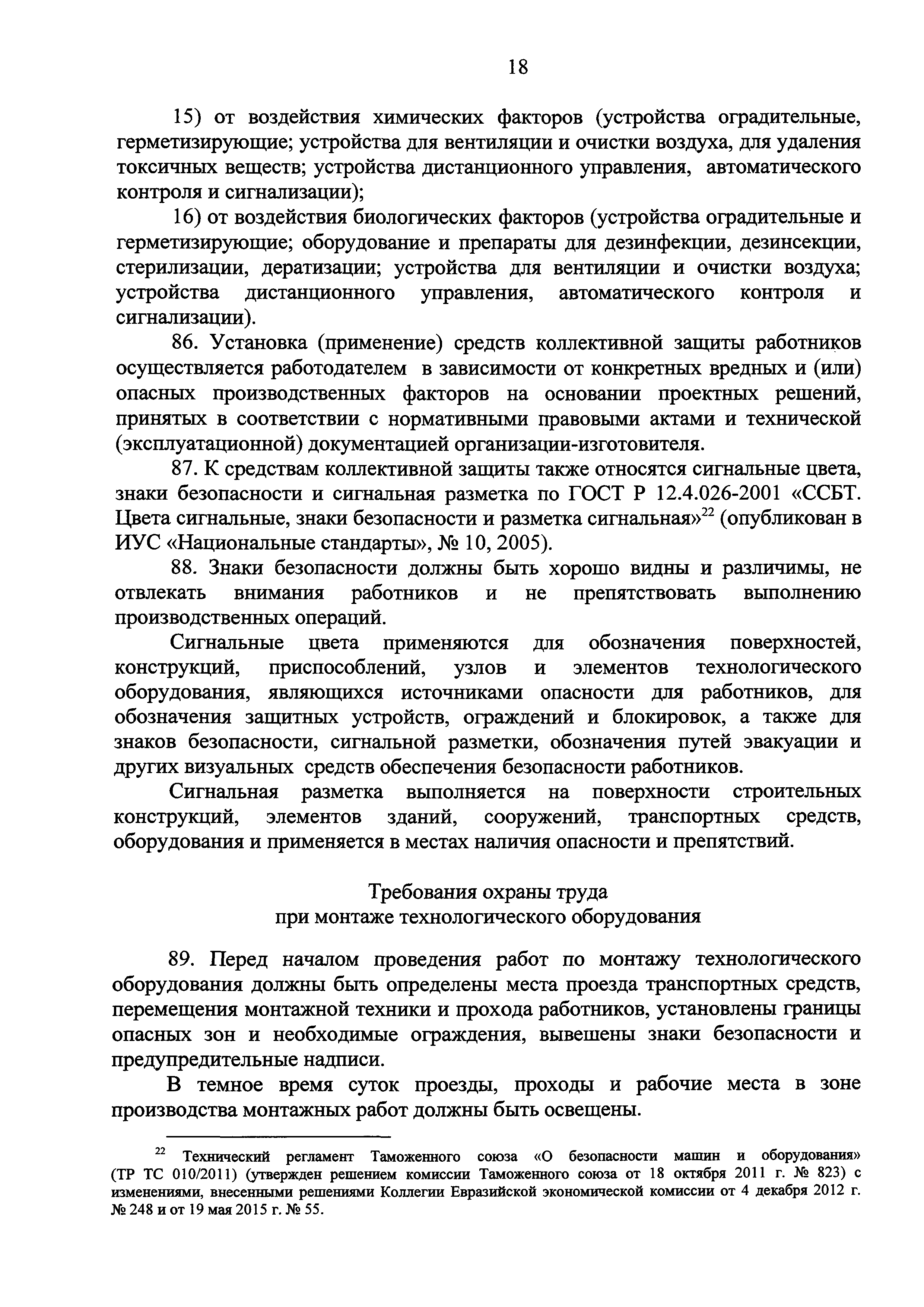 | Оглавление: | I Общие положения II Требования охраны труда, предъявляемые к организации выполнения работ III Требования охраны труда, предъявляемые к территории организации, к производственным зданиям (сооружениям), производственным помещениям (производственным площадкам) и организации рабочих мест Требования охраны труда, предъявляемые к территории организации, к производственным зданиям (сооружениям) и производственным помещениям (производственным площадкам) Требования охраны труда, предъявляемые к организации рабочих мест IV Требования охраны труда, предъявляемые к выполнению работ (осуществлению производственных процессов) Общие требования Требования охраны труда, предъявляемые к размещению технологического оборудования и обеспечению коллективной защиты работников Требования охраны труда при монтаже технологического оборудования Требования охраны труда при техническом обслуживании и ремонте технологического оборудования V Требования охраны труда при транспортировании (перемещении) и хранении технологического оборудования, комплектующих изделий и расходных материалов Требования охраны труда при транспортировании (перемещении) технологического оборудования, комплектующих изделий и расходных материалов Требования охраны труда при хранении технологического оборудования, комплектующих изделий и расходных материалов VI Заключительные положения Приложение 1 (рекомендуемый образец). Наряд-допуск на производство работ с повышенной опасностью Приложение 2 (рекомендуемый образец). Акт-допуск для производства работ на территории организации |