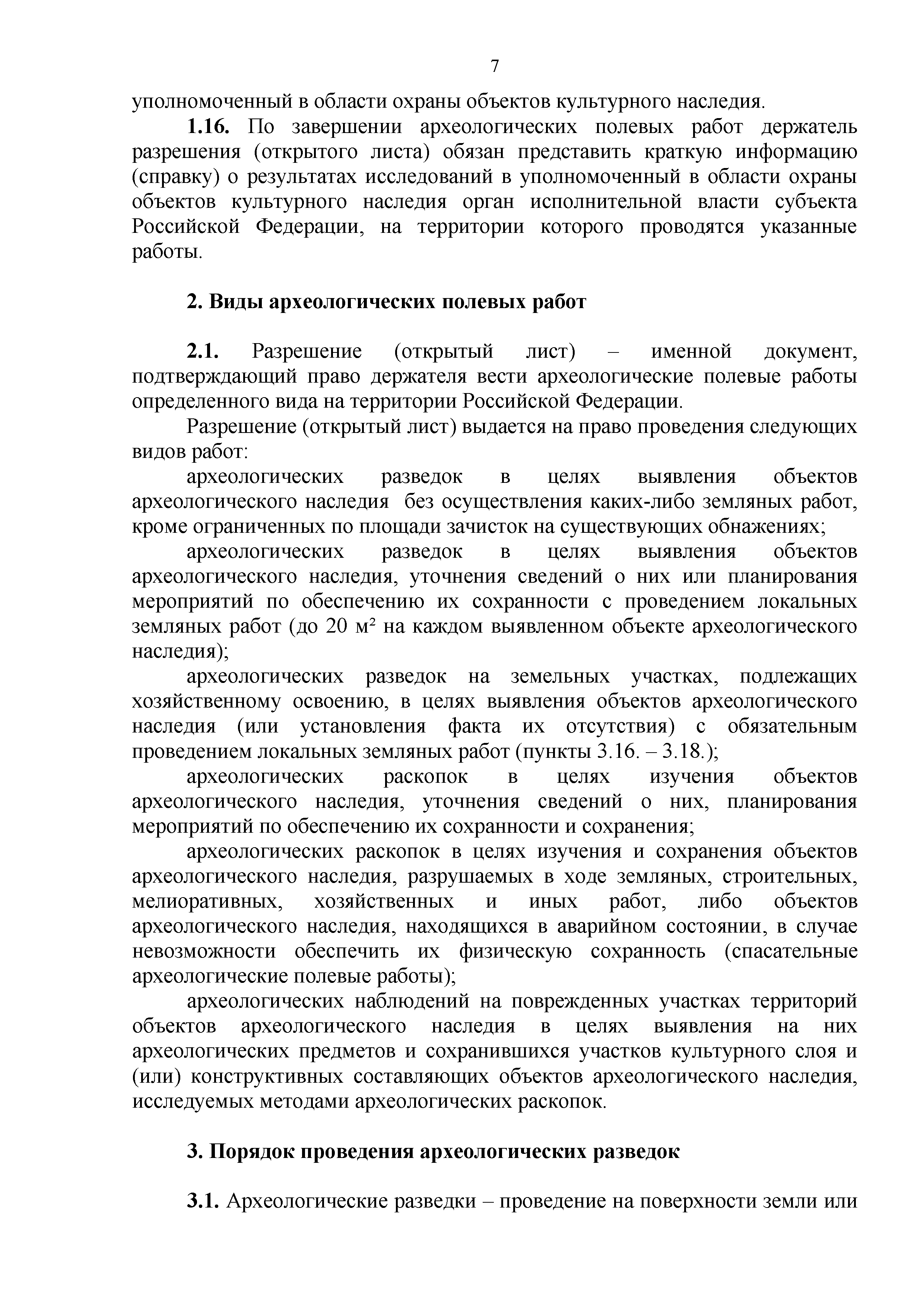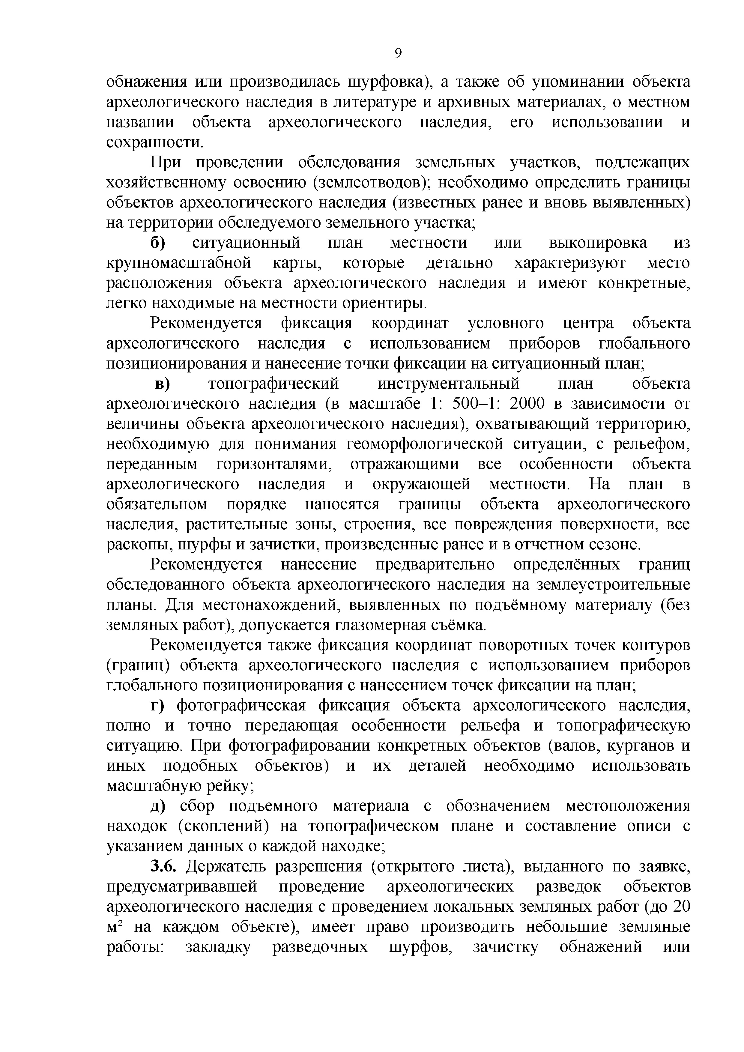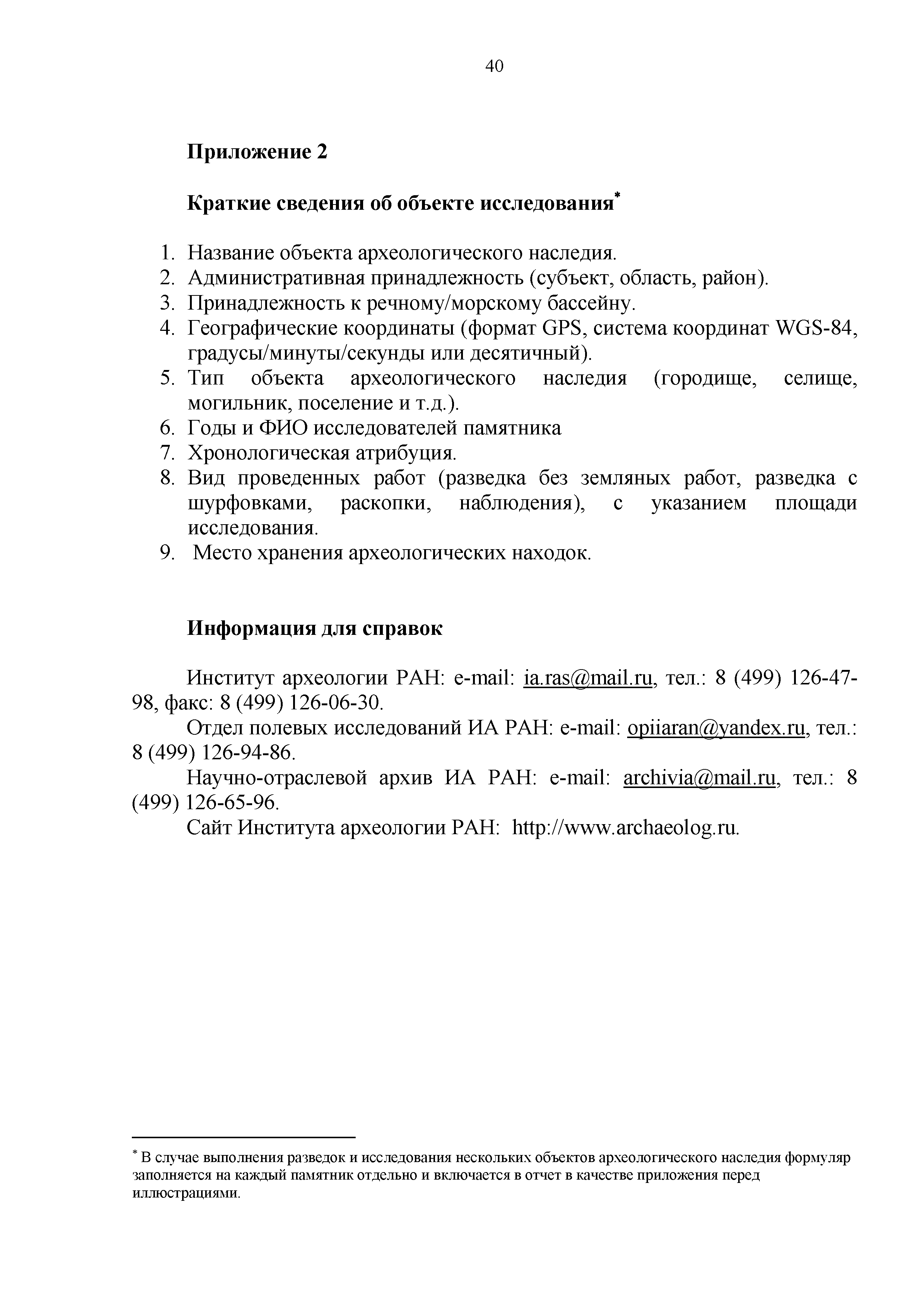 | Оглавление: | 1 Общие положения 2 Виды археологических полевых работ 3 Порядок проведения археологических разведок 4 Порядок проведения археологических раскопок 5 Порядок проведения археологических наблюдений 6 Отчетность о выполненных археологических полевых работах 7 Порядок рассмотрения научных отчетов (научная экспертиза) 8 Порядок использования научных отчетов о проведенных археологических полевых работах в научных целях 9 Требования к профессиональным знаниям и навыкам исследователя Приложение 1. Требования к оформлению научных отчетов о результатах проведения археологических полевых работ Приложение 2. Краткие сведения об объекте исследования |