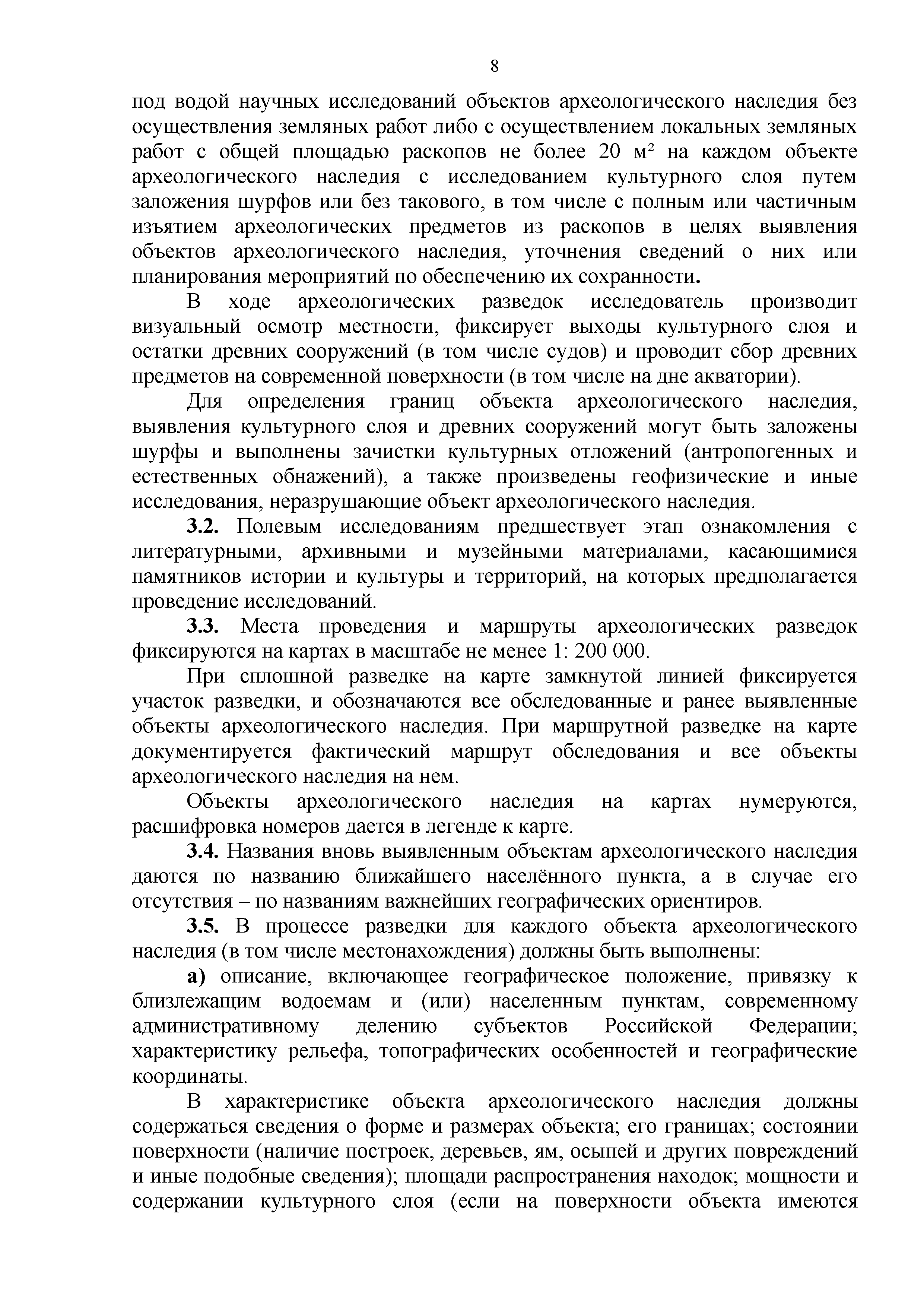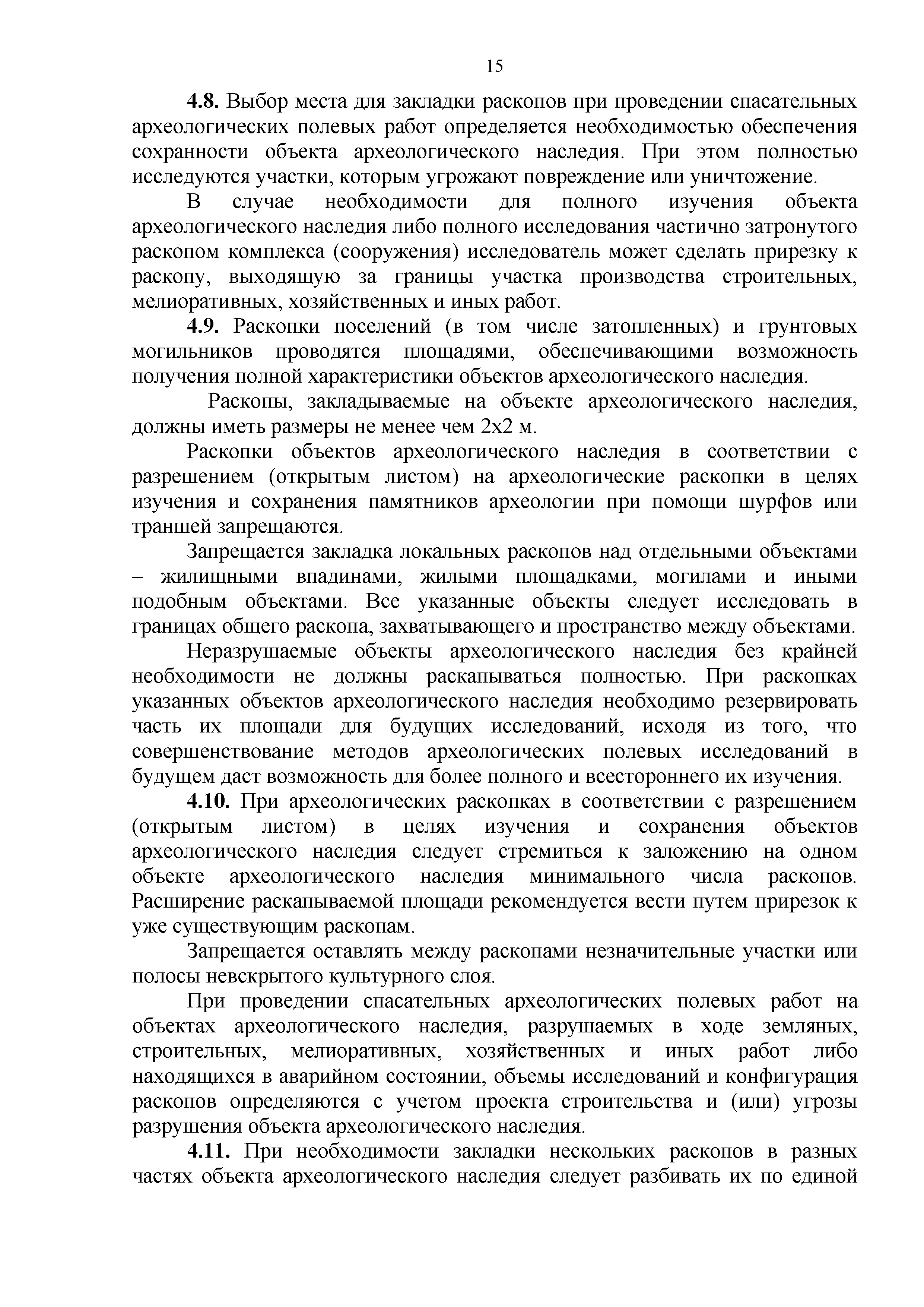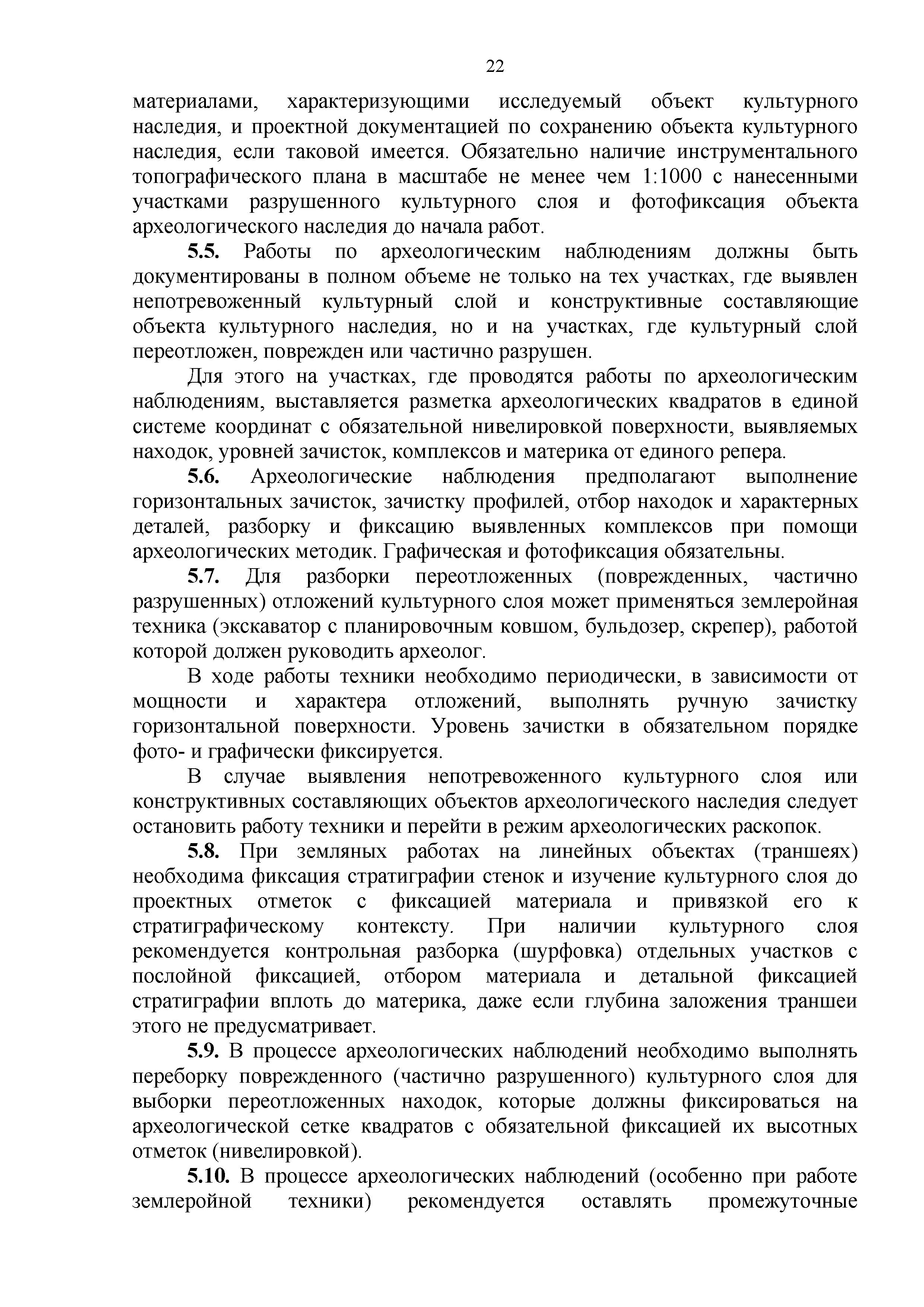 | Оглавление: | 1 Общие положения 2 Виды археологических полевых работ 3 Порядок проведения археологических разведок 4 Порядок проведения археологических раскопок 5 Порядок проведения археологических наблюдений 6 Отчетность о выполненных археологических полевых работах 7 Порядок рассмотрения научных отчетов (научная экспертиза) 8 Порядок использования научных отчетов о проведенных археологических полевых работах в научных целях 9 Требования к профессиональным знаниям и навыкам исследователя Приложение 1. Требования к оформлению научных отчетов о результатах проведения археологических полевых работ Приложение 2. Краткие сведения об объекте исследования |