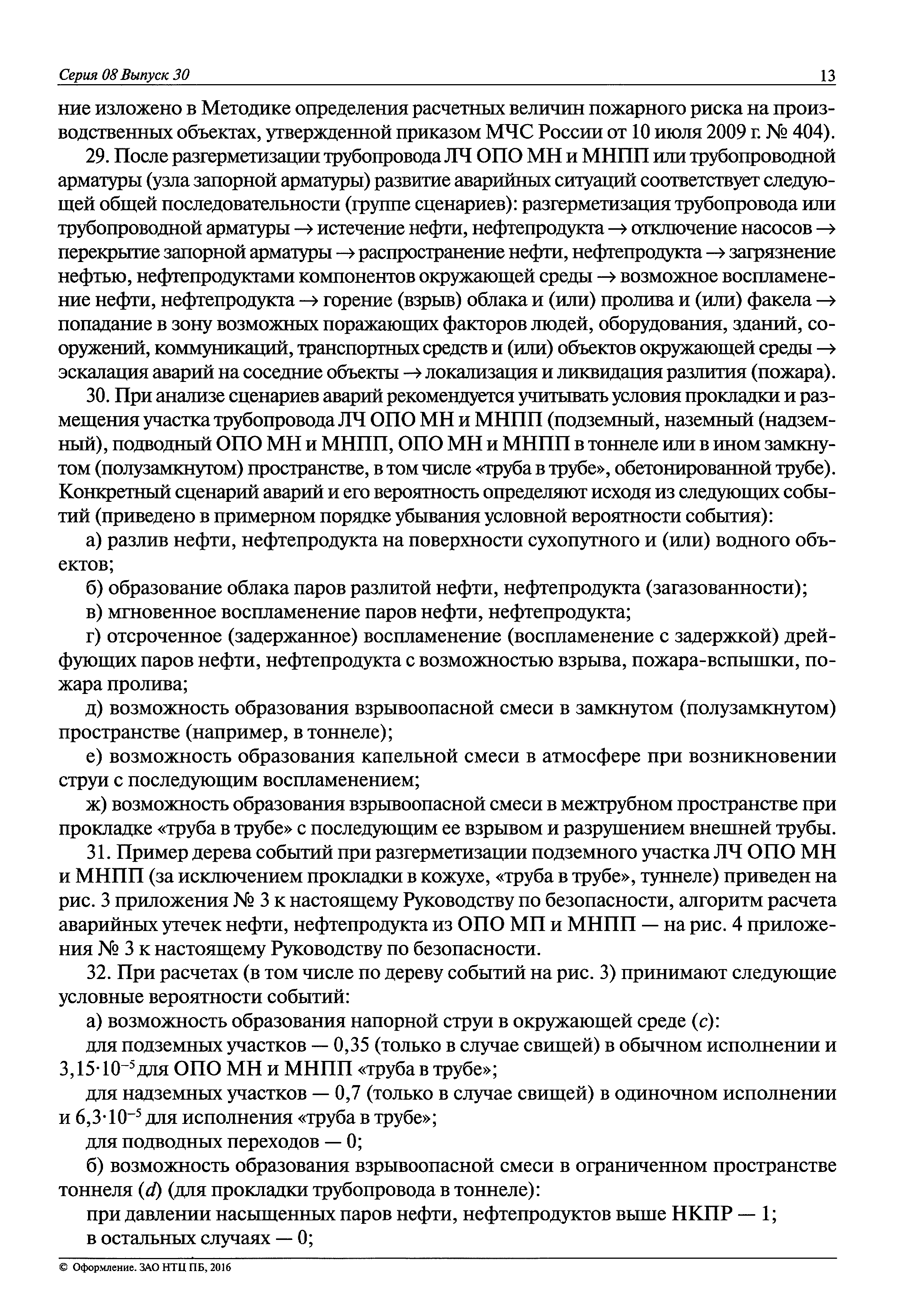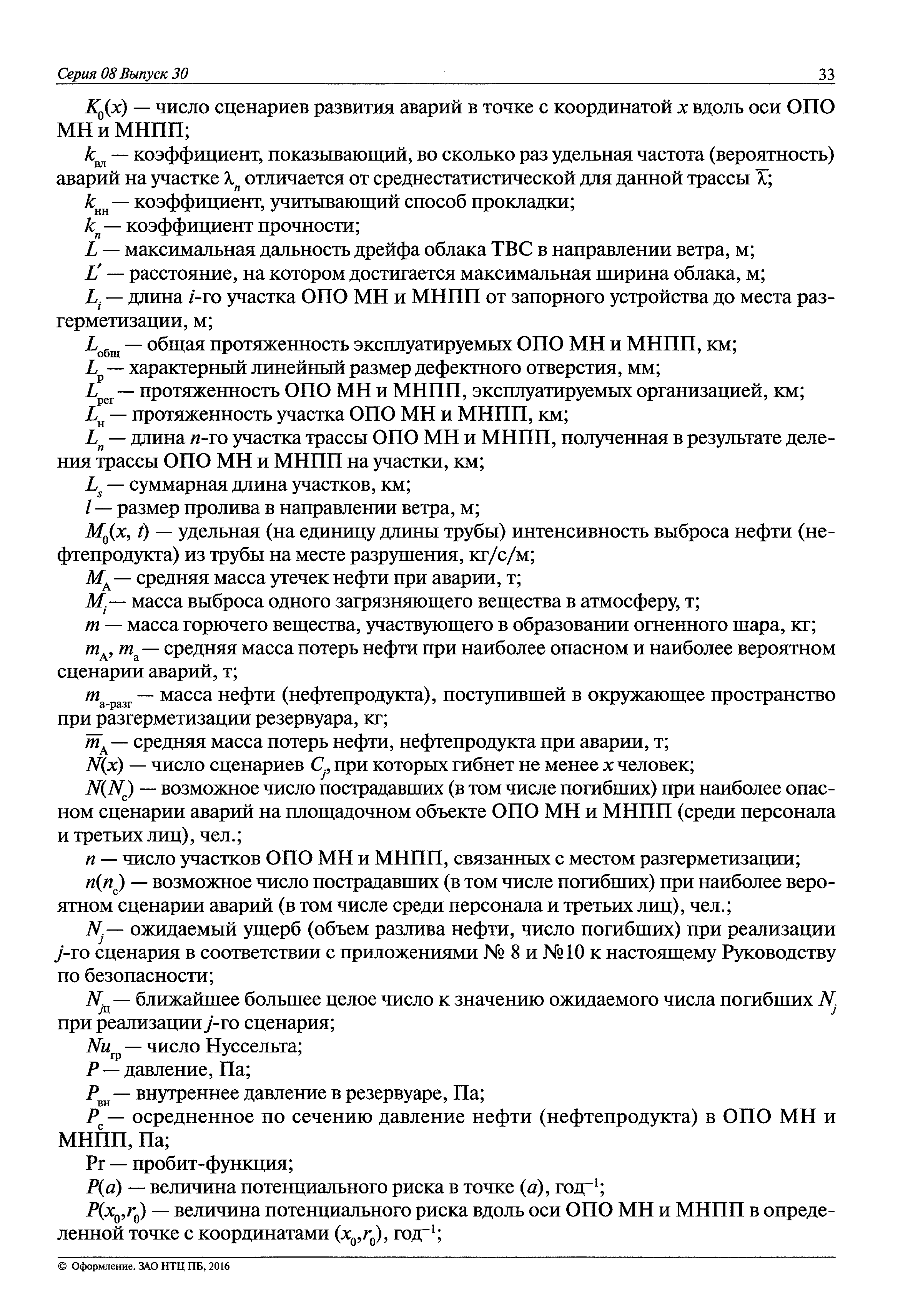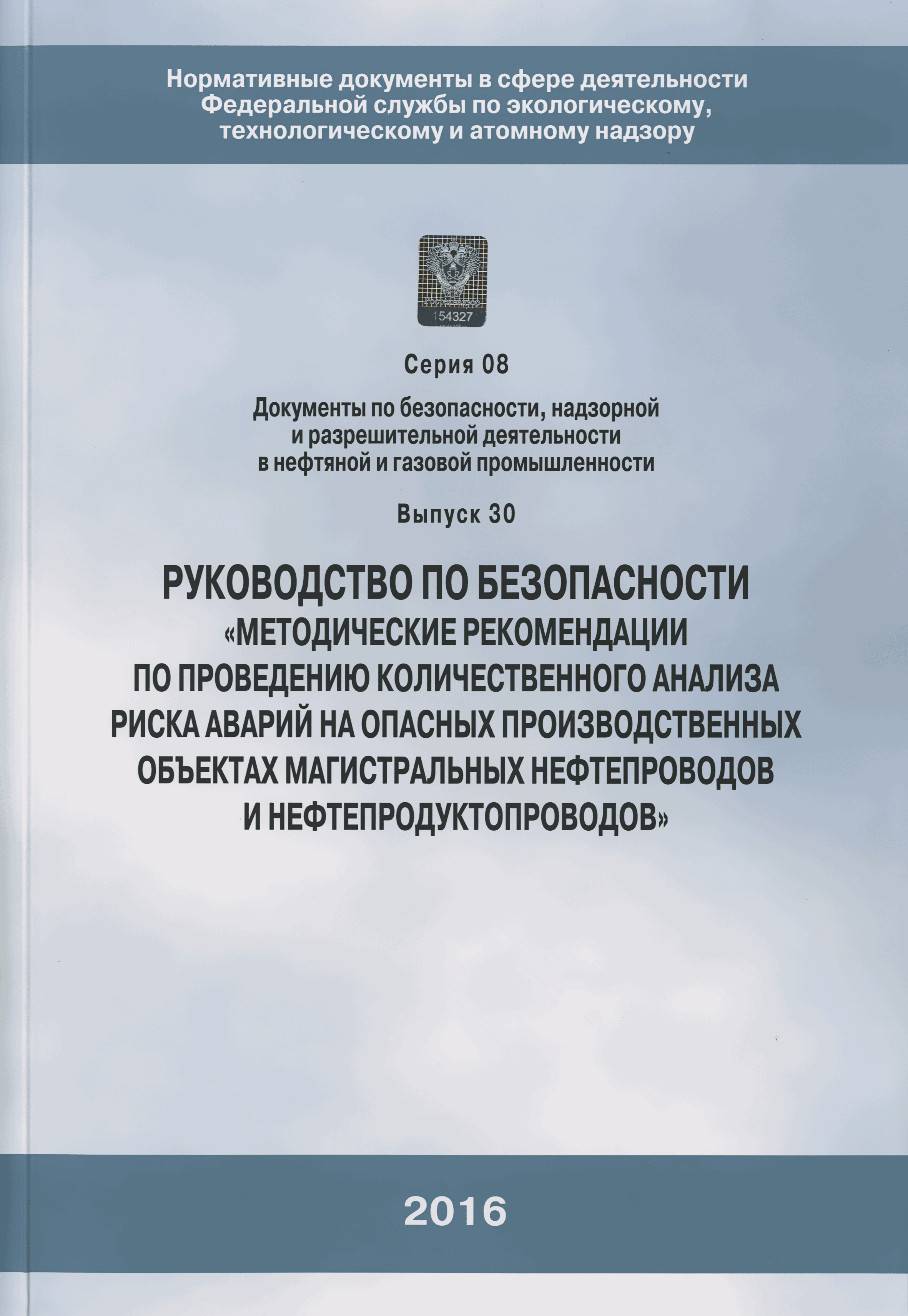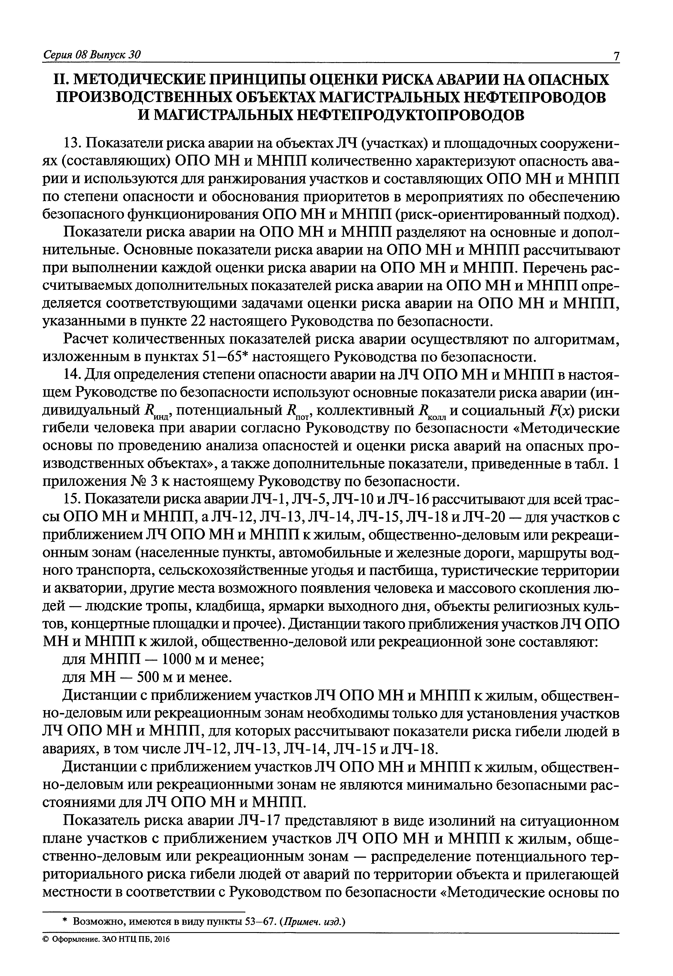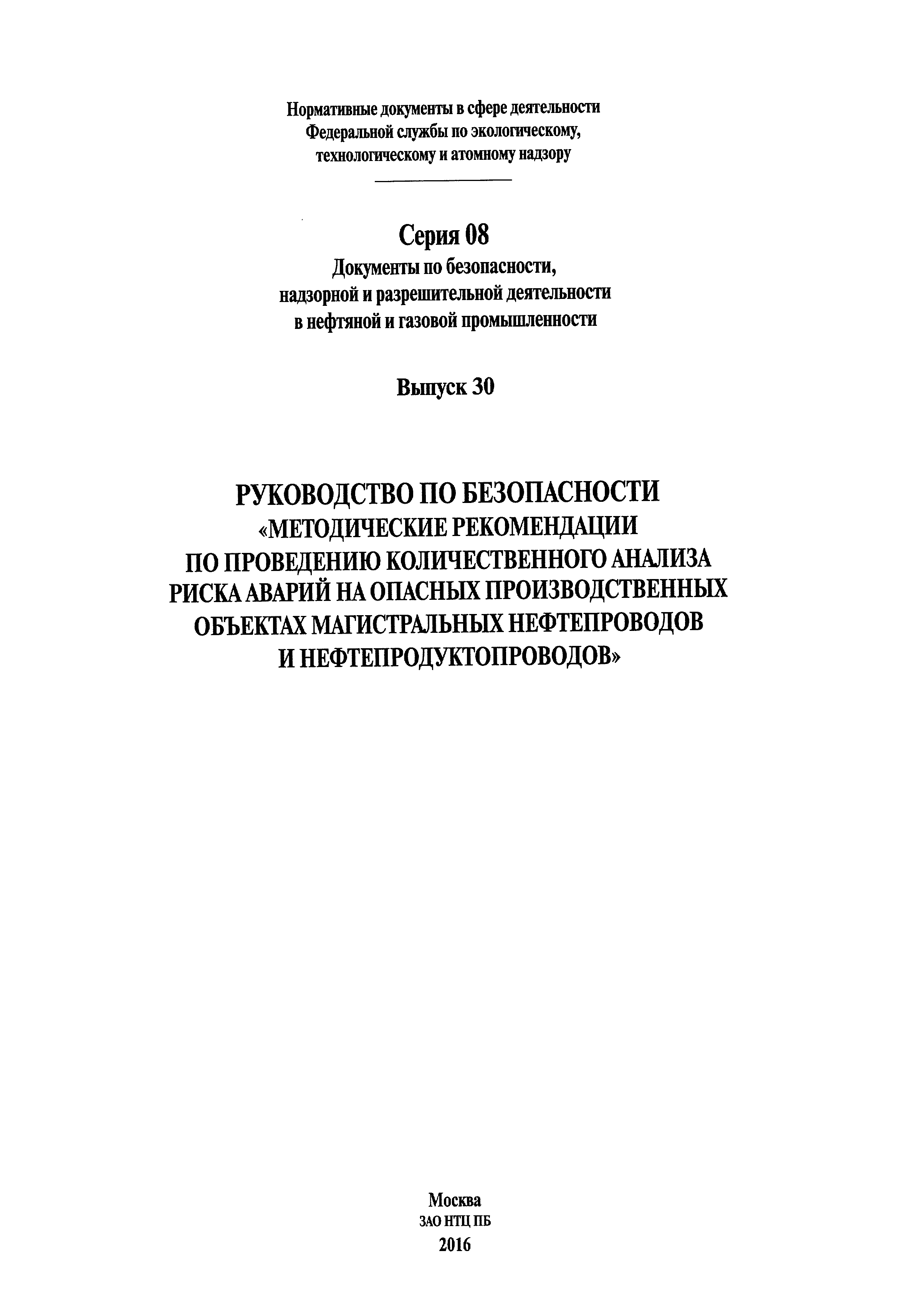 | Оглавление: | I Общие положения II Методические принципы оценки риска авария на опасных производственных объектах магистральных нефтепроводов и магистральных нефтепродуктопроводов III Этапы проведения количественного анализа риска аварий на опасных производственных объектах магистральных нефтепроводов и магистральных нефтепродуктопроводов IV Типовые сценарии аварий на площадочных сооружениях опасных производственных объектов магистральных нефтепроводов и магистральных нефтепродуктопроводов V Количественная оценка риска аварий на опасных производственных объектах магистральных нефтепроводов и магистральных нефтепродуктопроводов. Оценка частоты возможных сценариев аварий VI Оформление результатов количественного анализа риска аварий на опасных производственных объектах магистральных нефтепроводов и магистральных нефтепродуктопроводов Приложение 1. Перечень используемых сокращений и обозначений Приложение 2. Термины и их определения Приложение 3. Рисунки и таблицы Приложение 4. Перечень исходной информации, необходимой для проведения количественного анализа риска аварий на ОНО МН и МНПП Приложение 5. Балльная оценка факторов влияния состояния ОНО МН и МНПП на степень риска аварий Приложение 6. Оценка частоты аварий на линейной части ОНО МН и МНПП Приложение 7. Расчет вероятных зон действия поражающих факторов аварий Приложение 8. Расчет показателей риска аварий Приложение 9. Расчет объемов выброса нефти (нефтепродуктов) и площадей разлива при авариях на линейной части ОНО МН и МНПП и площадочных сооружениях ОНО МН и МНПП |