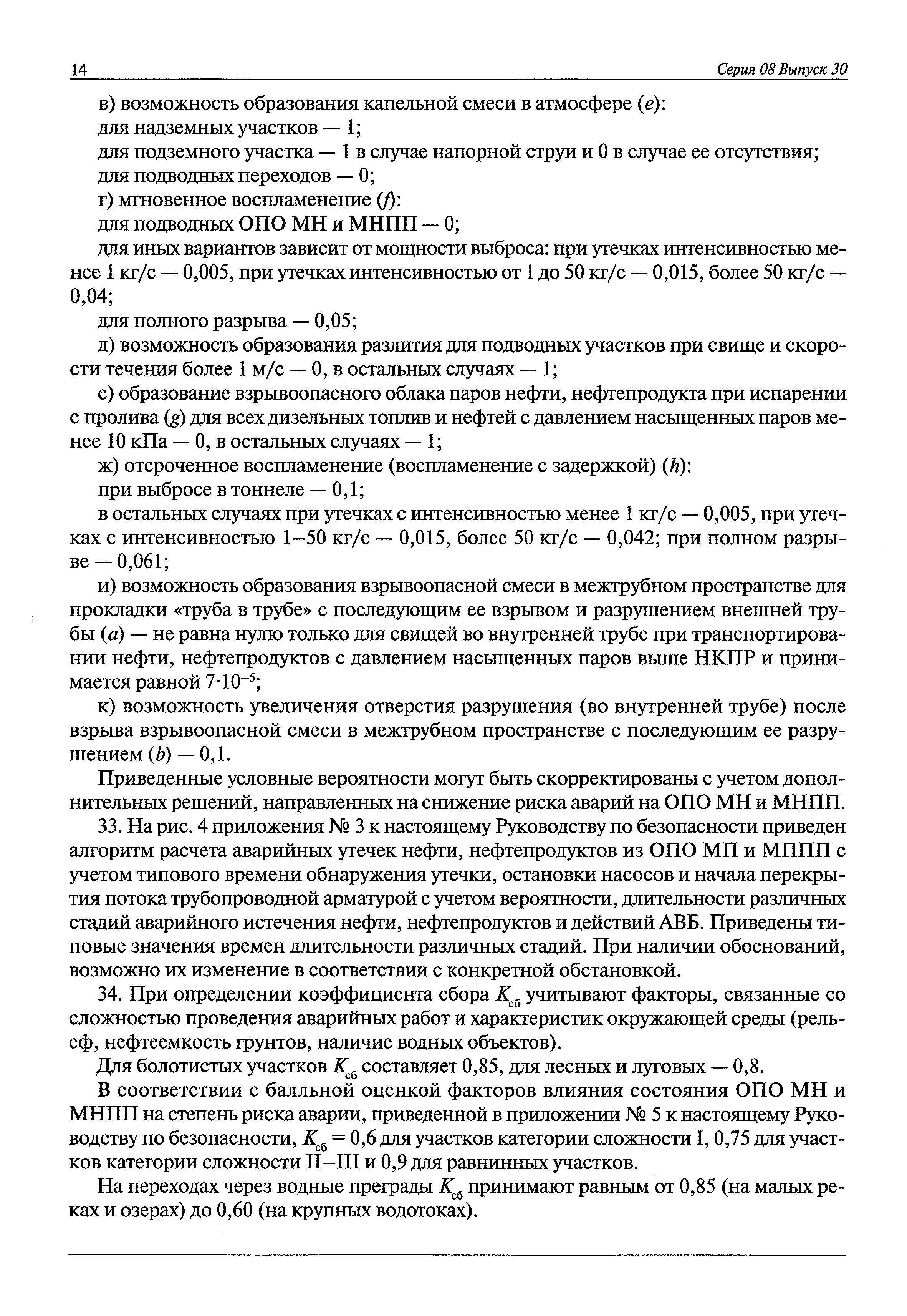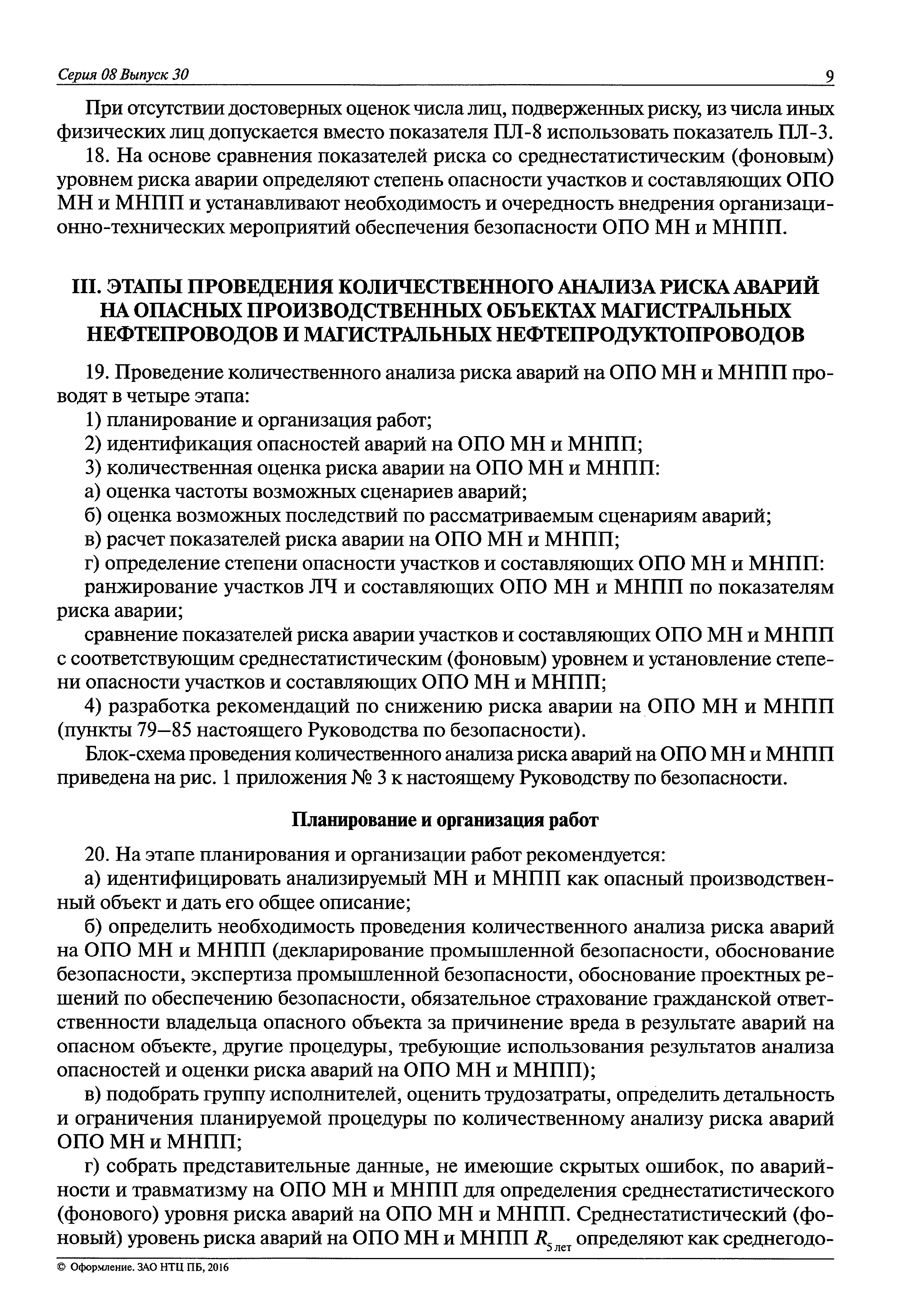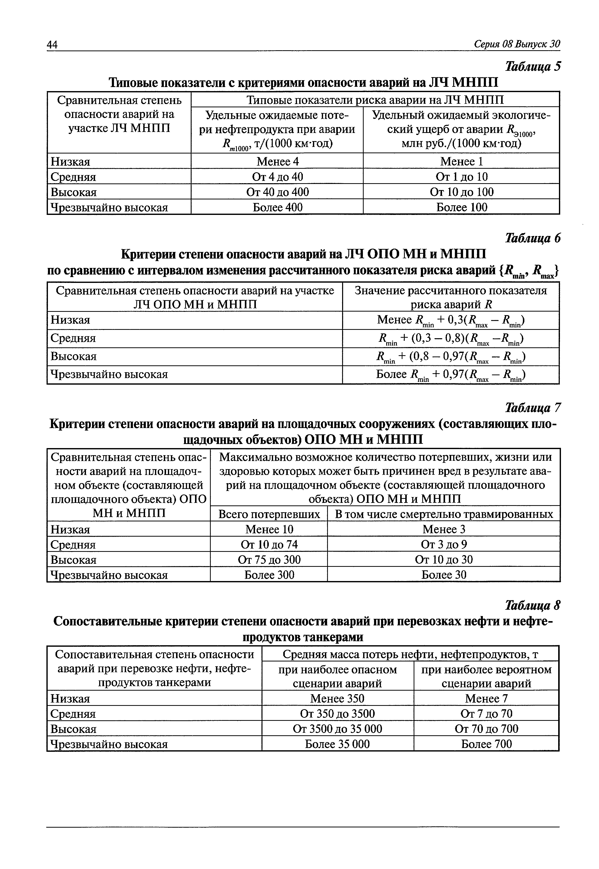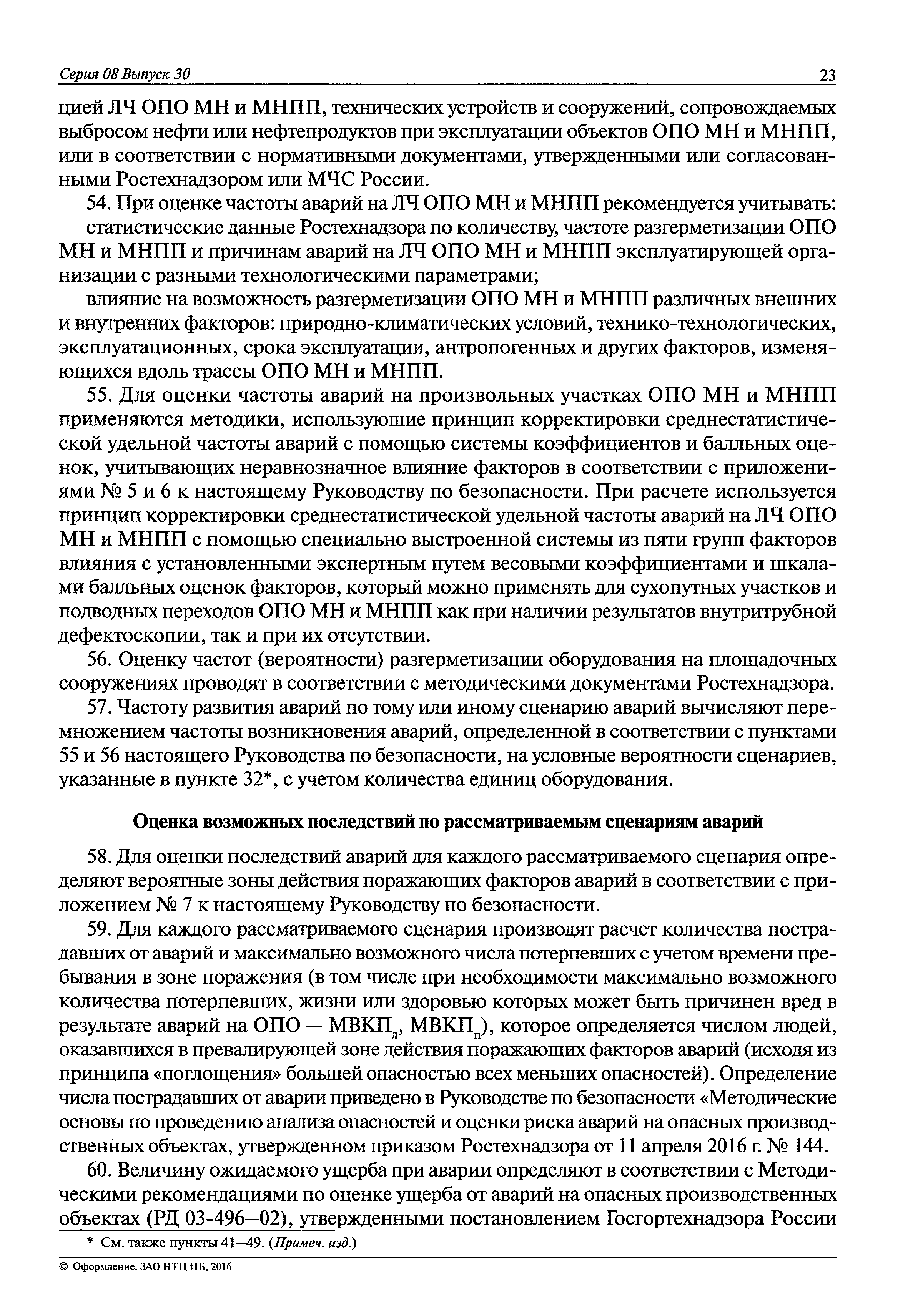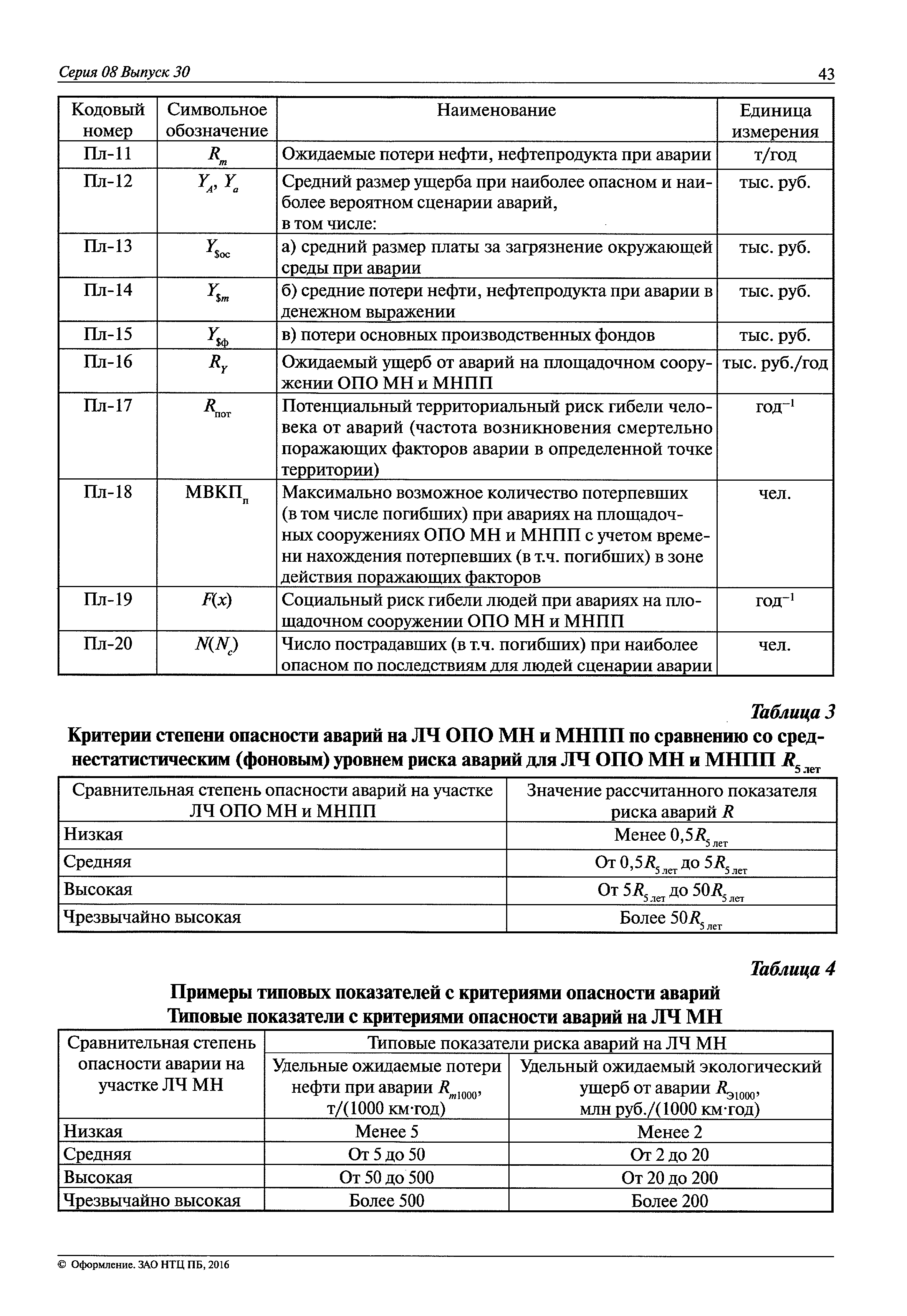 | Оглавление: | I Общие положения II Методические принципы оценки риска авария на опасных производственных объектах магистральных нефтепроводов и магистральных нефтепродуктопроводов III Этапы проведения количественного анализа риска аварий на опасных производственных объектах магистральных нефтепроводов и магистральных нефтепродуктопроводов IV Типовые сценарии аварий на площадочных сооружениях опасных производственных объектов магистральных нефтепроводов и магистральных нефтепродуктопроводов V Количественная оценка риска аварий на опасных производственных объектах магистральных нефтепроводов и магистральных нефтепродуктопроводов. Оценка частоты возможных сценариев аварий VI Оформление результатов количественного анализа риска аварий на опасных производственных объектах магистральных нефтепроводов и магистральных нефтепродуктопроводов Приложение 1. Перечень используемых сокращений и обозначений Приложение 2. Термины и их определения Приложение 3. Рисунки и таблицы Приложение 4. Перечень исходной информации, необходимой для проведения количественного анализа риска аварий на ОНО МН и МНПП Приложение 5. Балльная оценка факторов влияния состояния ОНО МН и МНПП на степень риска аварий Приложение 6. Оценка частоты аварий на линейной части ОНО МН и МНПП Приложение 7. Расчет вероятных зон действия поражающих факторов аварий Приложение 8. Расчет показателей риска аварий Приложение 9. Расчет объемов выброса нефти (нефтепродуктов) и площадей разлива при авариях на линейной части ОНО МН и МНПП и площадочных сооружениях ОНО МН и МНПП |