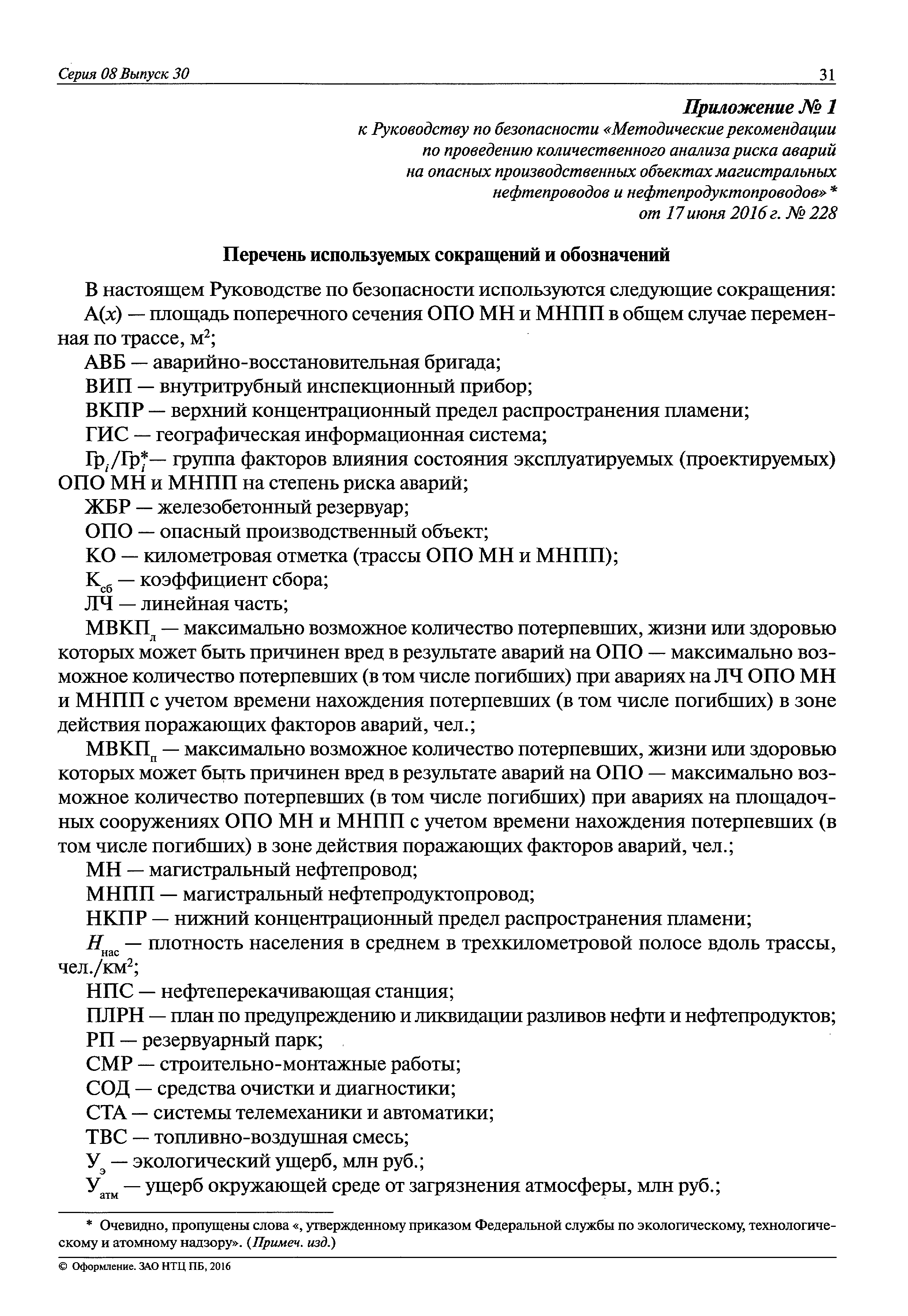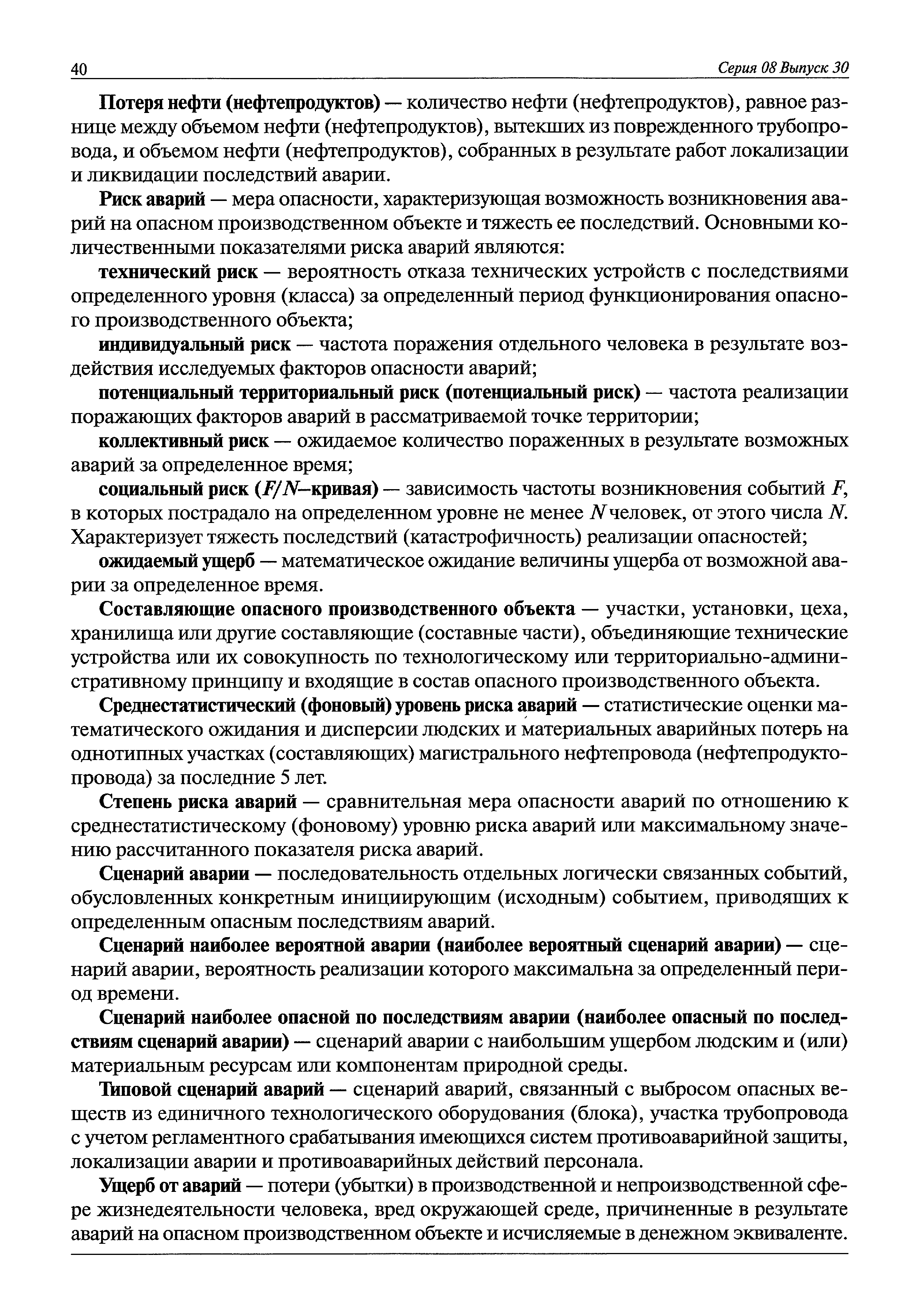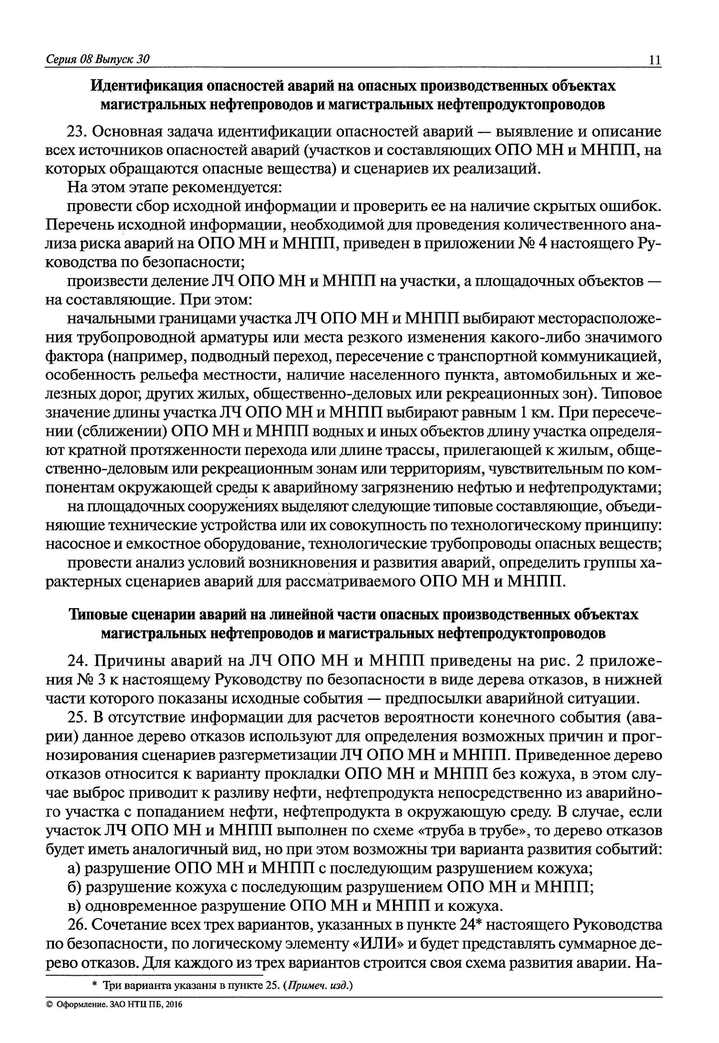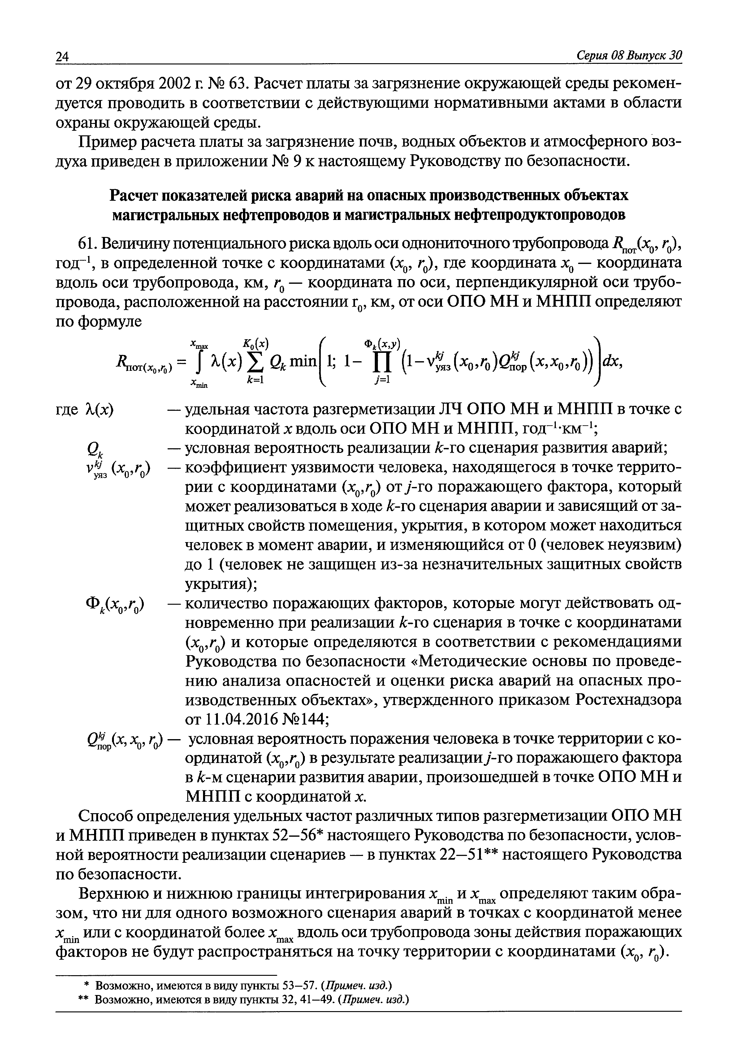 | Оглавление: | I Общие положения II Методические принципы оценки риска авария на опасных производственных объектах магистральных нефтепроводов и магистральных нефтепродуктопроводов III Этапы проведения количественного анализа риска аварий на опасных производственных объектах магистральных нефтепроводов и магистральных нефтепродуктопроводов IV Типовые сценарии аварий на площадочных сооружениях опасных производственных объектов магистральных нефтепроводов и магистральных нефтепродуктопроводов V Количественная оценка риска аварий на опасных производственных объектах магистральных нефтепроводов и магистральных нефтепродуктопроводов. Оценка частоты возможных сценариев аварий VI Оформление результатов количественного анализа риска аварий на опасных производственных объектах магистральных нефтепроводов и магистральных нефтепродуктопроводов Приложение 1. Перечень используемых сокращений и обозначений Приложение 2. Термины и их определения Приложение 3. Рисунки и таблицы Приложение 4. Перечень исходной информации, необходимой для проведения количественного анализа риска аварий на ОНО МН и МНПП Приложение 5. Балльная оценка факторов влияния состояния ОНО МН и МНПП на степень риска аварий Приложение 6. Оценка частоты аварий на линейной части ОНО МН и МНПП Приложение 7. Расчет вероятных зон действия поражающих факторов аварий Приложение 8. Расчет показателей риска аварий Приложение 9. Расчет объемов выброса нефти (нефтепродуктов) и площадей разлива при авариях на линейной части ОНО МН и МНПП и площадочных сооружениях ОНО МН и МНПП |