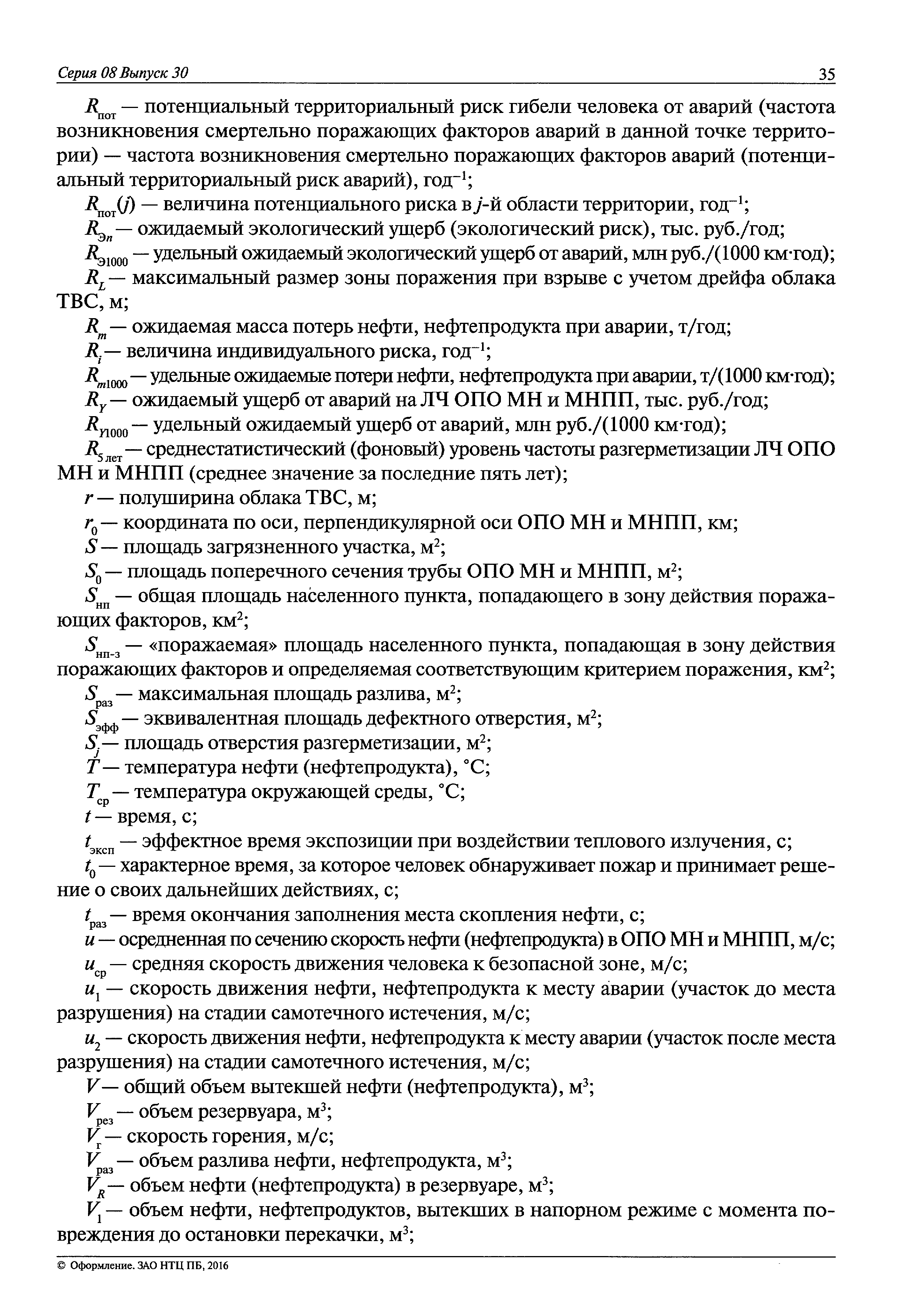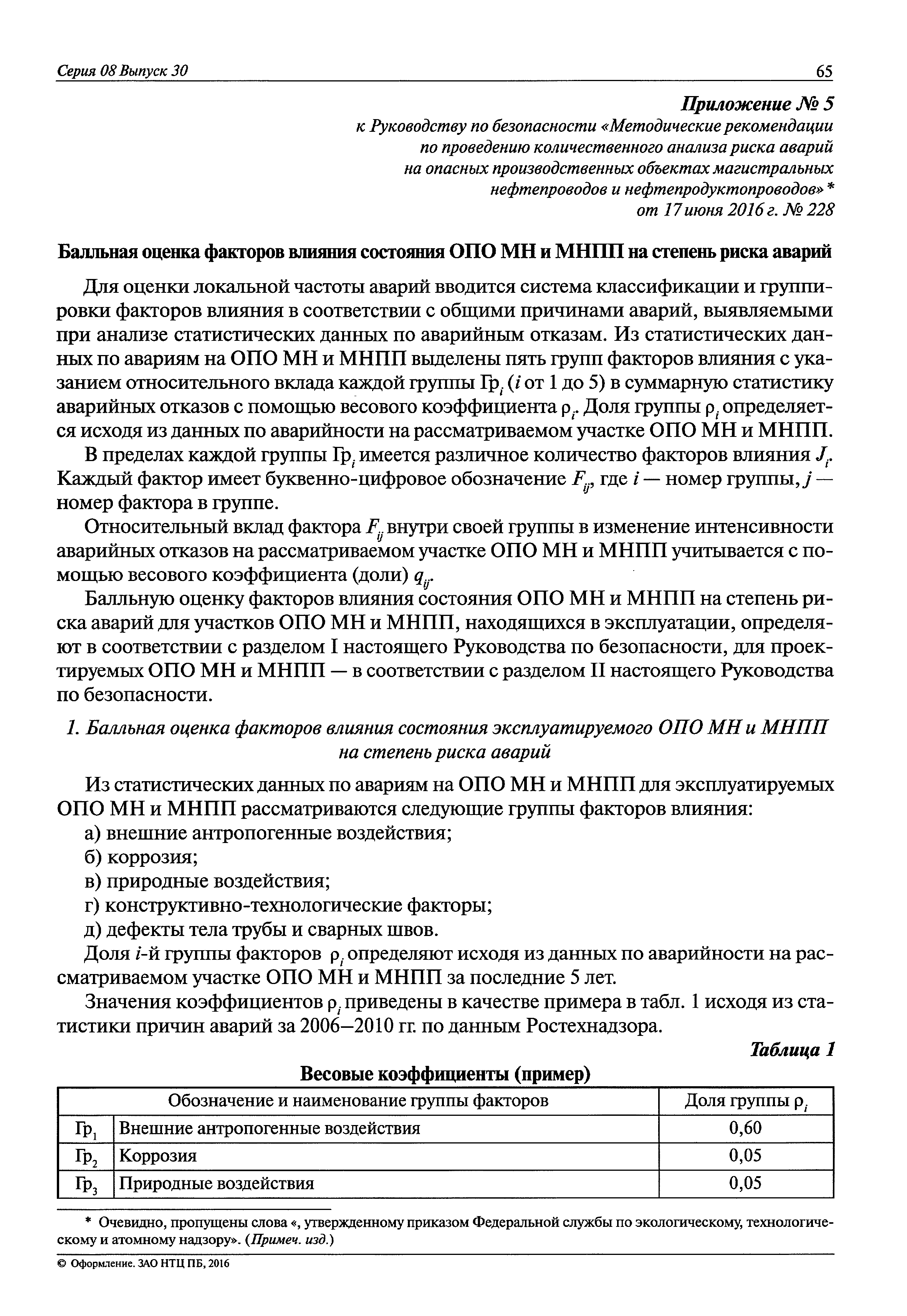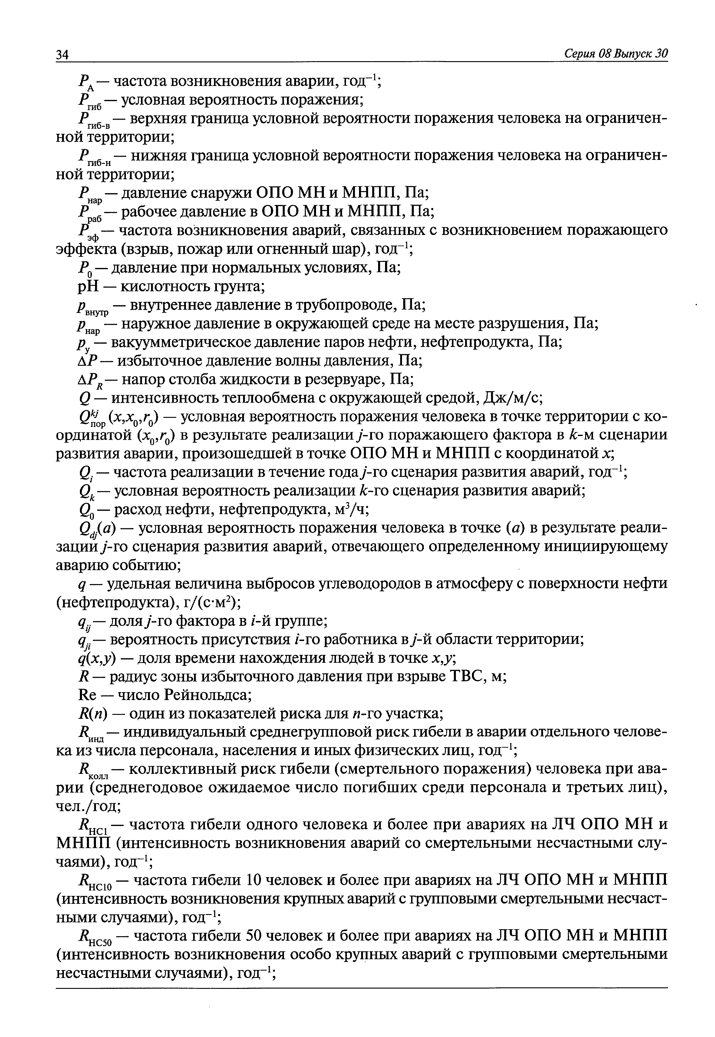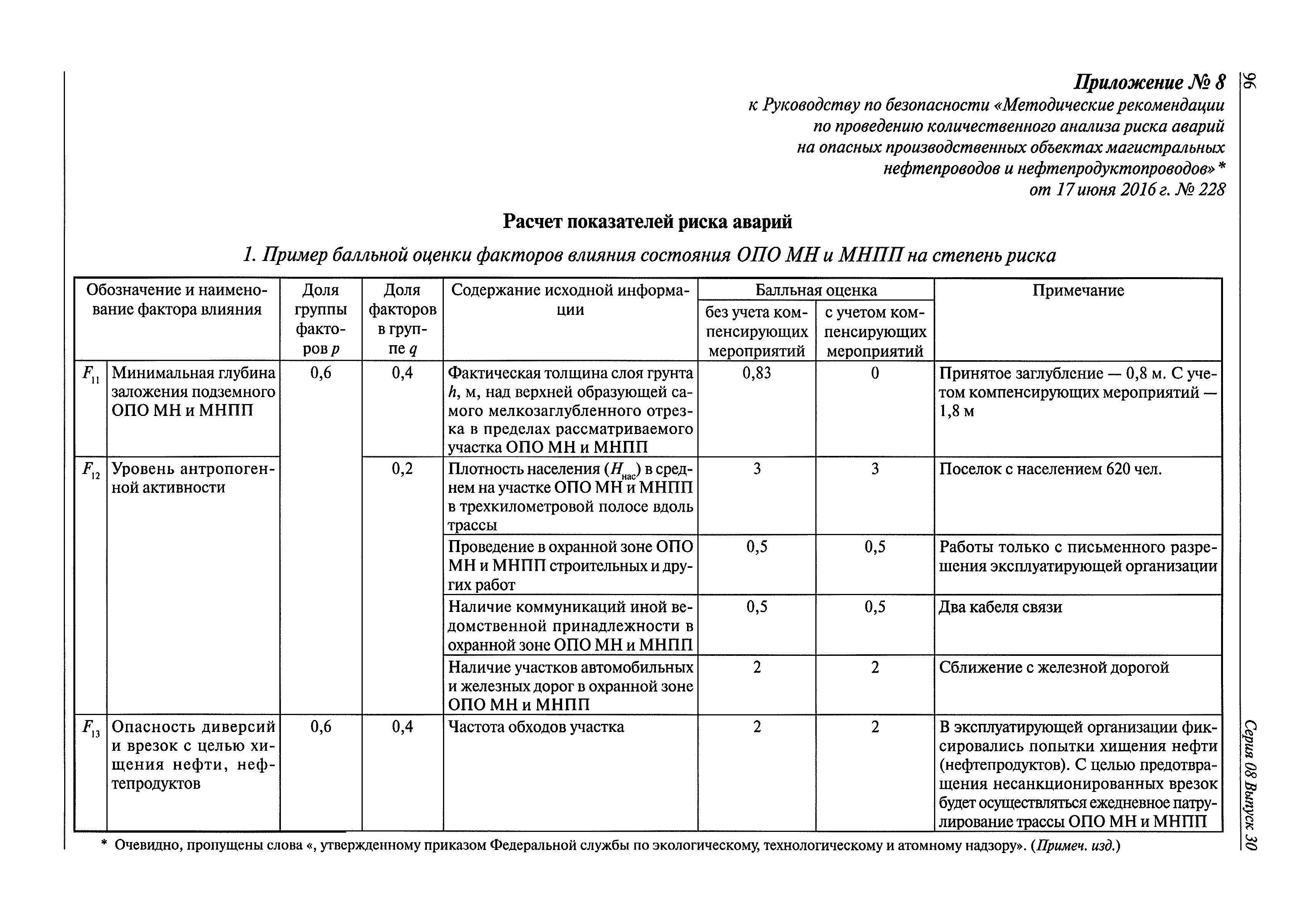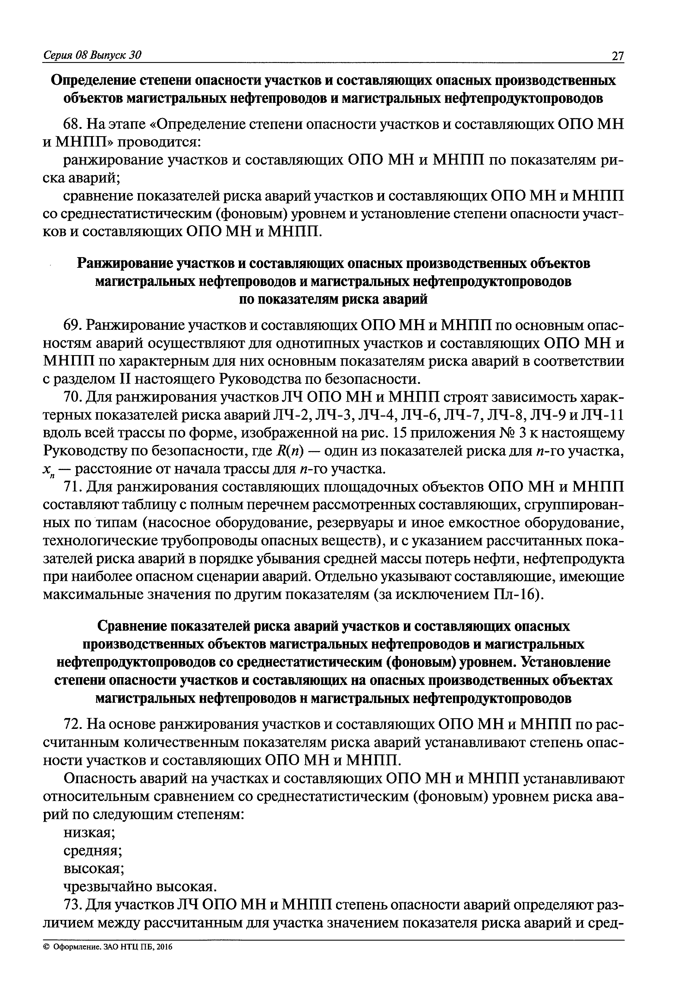 | Оглавление: | I Общие положения II Методические принципы оценки риска авария на опасных производственных объектах магистральных нефтепроводов и магистральных нефтепродуктопроводов III Этапы проведения количественного анализа риска аварий на опасных производственных объектах магистральных нефтепроводов и магистральных нефтепродуктопроводов IV Типовые сценарии аварий на площадочных сооружениях опасных производственных объектов магистральных нефтепроводов и магистральных нефтепродуктопроводов V Количественная оценка риска аварий на опасных производственных объектах магистральных нефтепроводов и магистральных нефтепродуктопроводов. Оценка частоты возможных сценариев аварий VI Оформление результатов количественного анализа риска аварий на опасных производственных объектах магистральных нефтепроводов и магистральных нефтепродуктопроводов Приложение 1. Перечень используемых сокращений и обозначений Приложение 2. Термины и их определения Приложение 3. Рисунки и таблицы Приложение 4. Перечень исходной информации, необходимой для проведения количественного анализа риска аварий на ОНО МН и МНПП Приложение 5. Балльная оценка факторов влияния состояния ОНО МН и МНПП на степень риска аварий Приложение 6. Оценка частоты аварий на линейной части ОНО МН и МНПП Приложение 7. Расчет вероятных зон действия поражающих факторов аварий Приложение 8. Расчет показателей риска аварий Приложение 9. Расчет объемов выброса нефти (нефтепродуктов) и площадей разлива при авариях на линейной части ОНО МН и МНПП и площадочных сооружениях ОНО МН и МНПП |