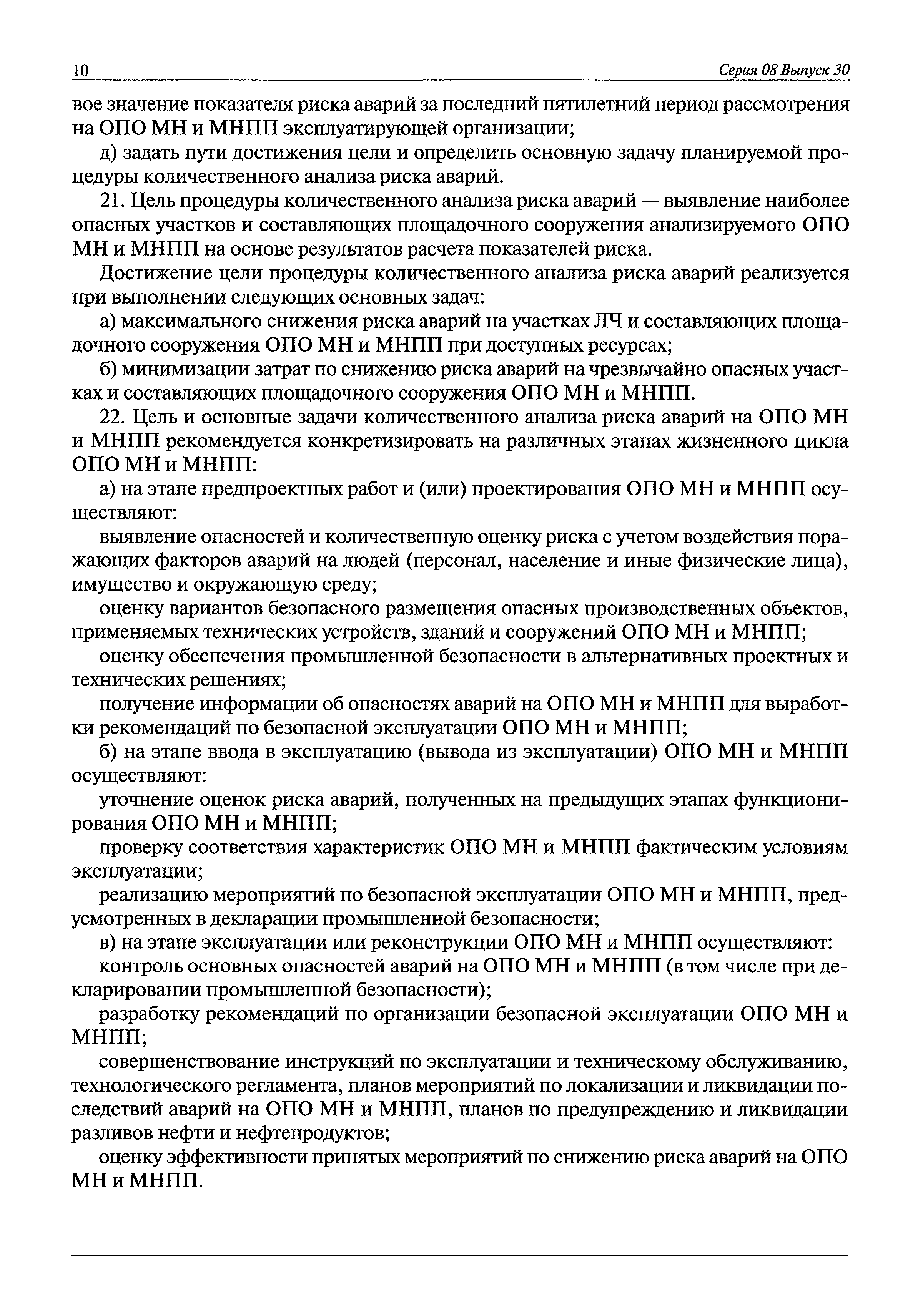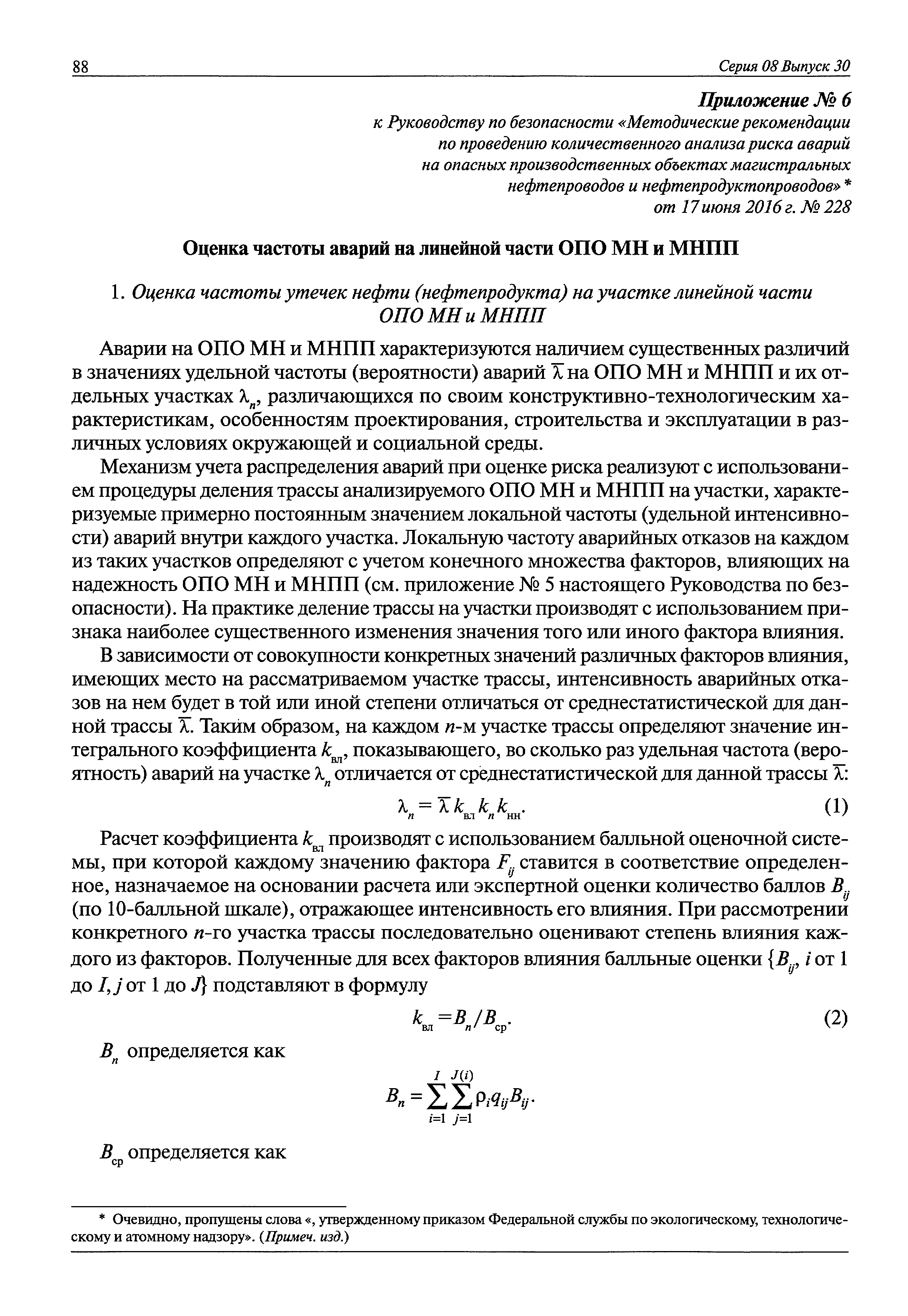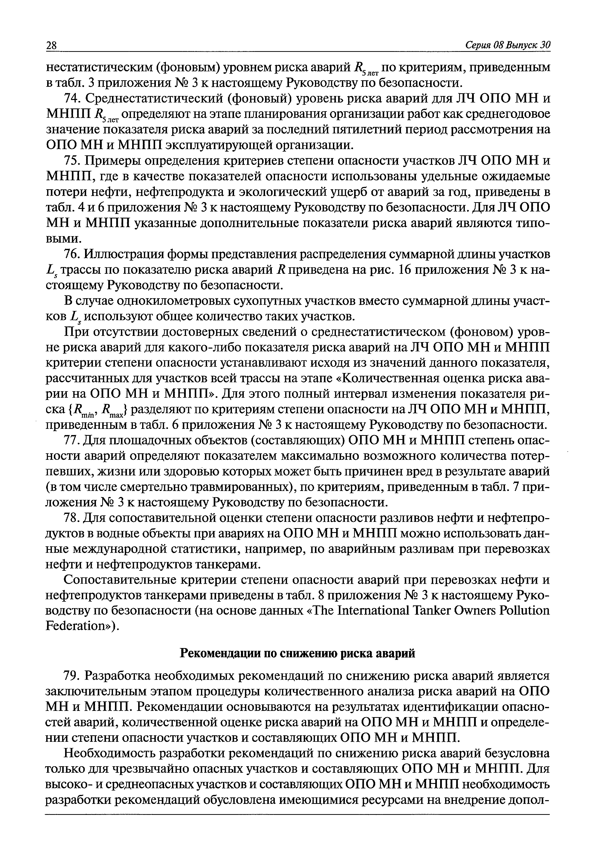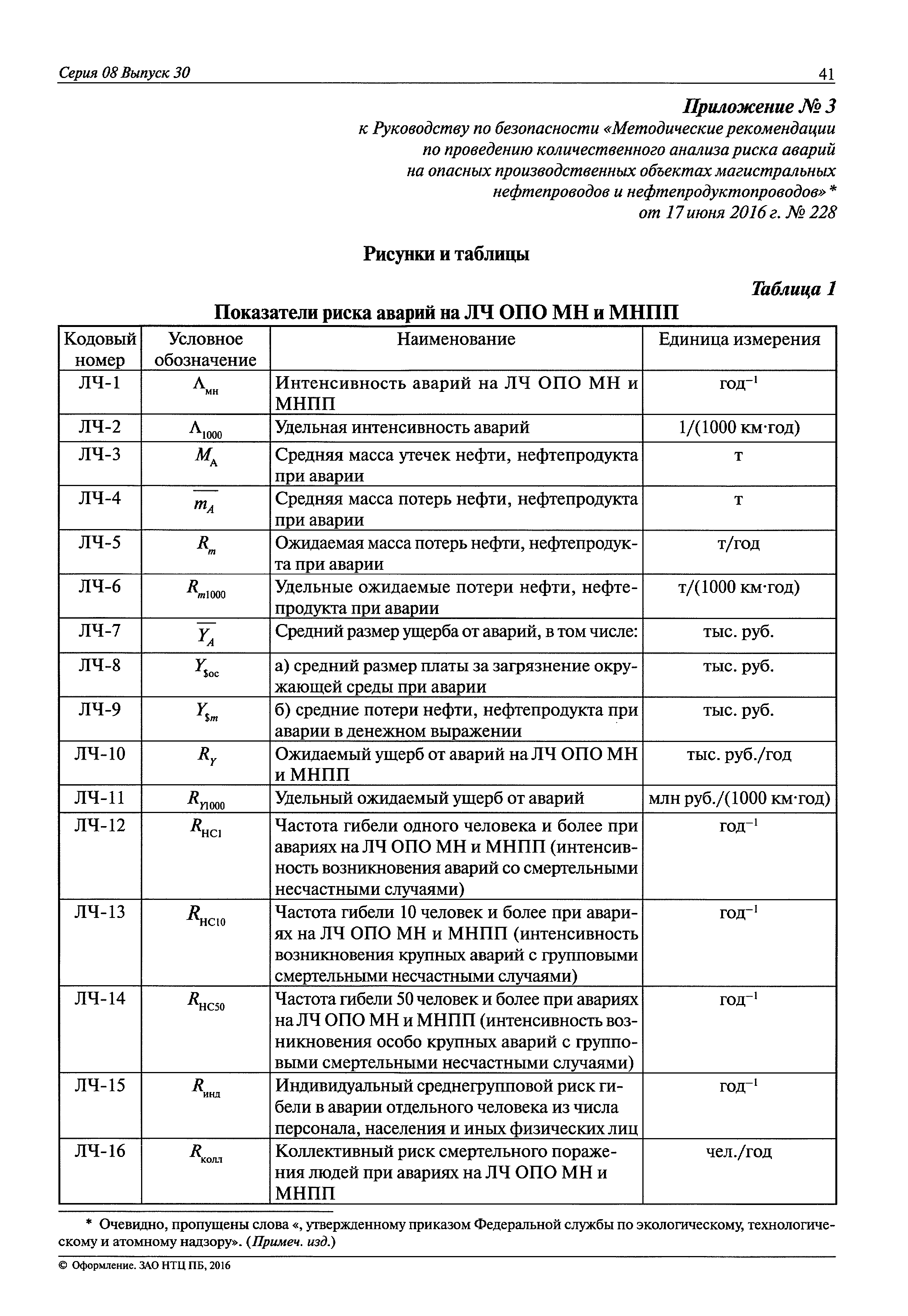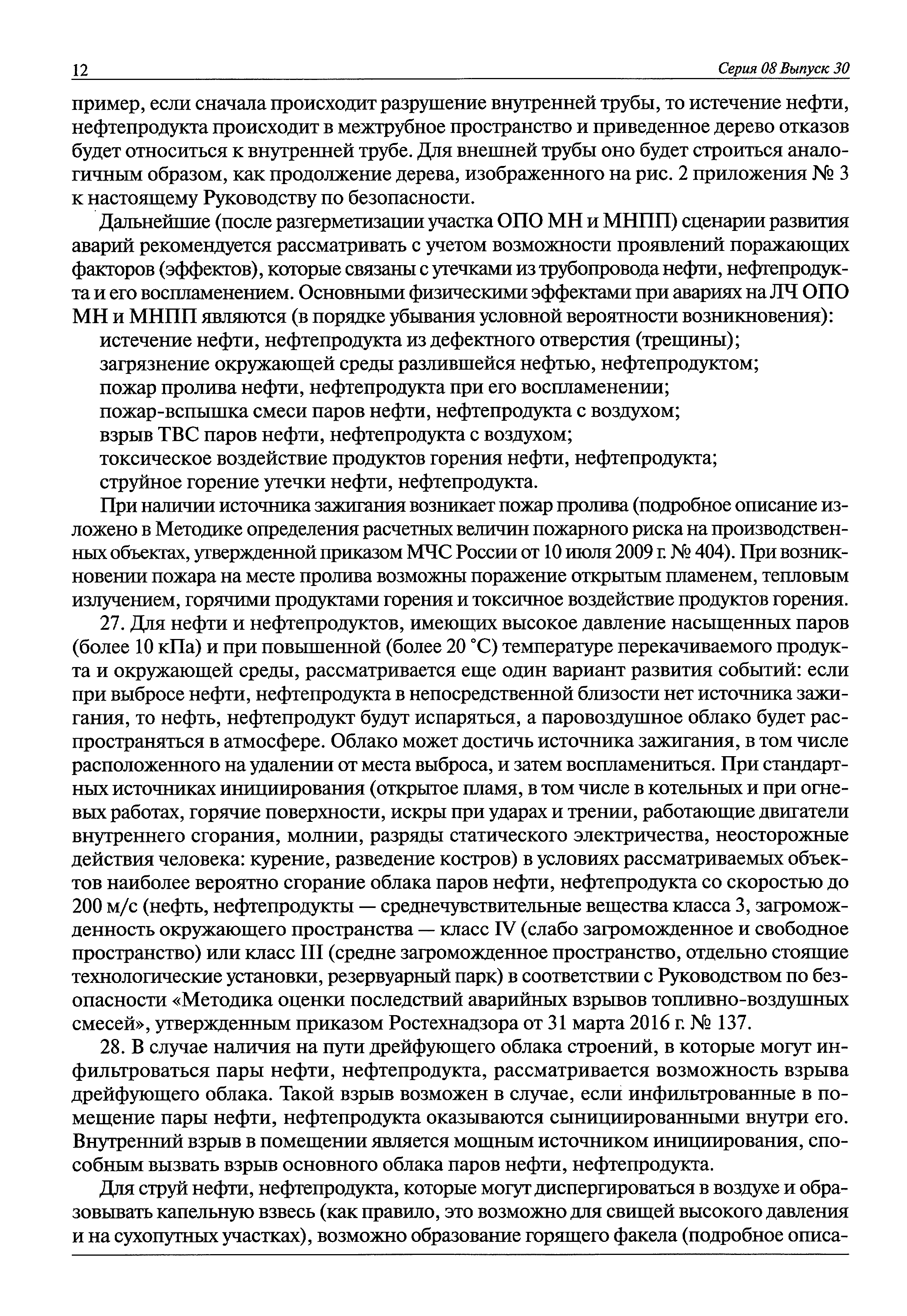 | Оглавление: | I Общие положения II Методические принципы оценки риска авария на опасных производственных объектах магистральных нефтепроводов и магистральных нефтепродуктопроводов III Этапы проведения количественного анализа риска аварий на опасных производственных объектах магистральных нефтепроводов и магистральных нефтепродуктопроводов IV Типовые сценарии аварий на площадочных сооружениях опасных производственных объектов магистральных нефтепроводов и магистральных нефтепродуктопроводов V Количественная оценка риска аварий на опасных производственных объектах магистральных нефтепроводов и магистральных нефтепродуктопроводов. Оценка частоты возможных сценариев аварий VI Оформление результатов количественного анализа риска аварий на опасных производственных объектах магистральных нефтепроводов и магистральных нефтепродуктопроводов Приложение 1. Перечень используемых сокращений и обозначений Приложение 2. Термины и их определения Приложение 3. Рисунки и таблицы Приложение 4. Перечень исходной информации, необходимой для проведения количественного анализа риска аварий на ОНО МН и МНПП Приложение 5. Балльная оценка факторов влияния состояния ОНО МН и МНПП на степень риска аварий Приложение 6. Оценка частоты аварий на линейной части ОНО МН и МНПП Приложение 7. Расчет вероятных зон действия поражающих факторов аварий Приложение 8. Расчет показателей риска аварий Приложение 9. Расчет объемов выброса нефти (нефтепродуктов) и площадей разлива при авариях на линейной части ОНО МН и МНПП и площадочных сооружениях ОНО МН и МНПП |