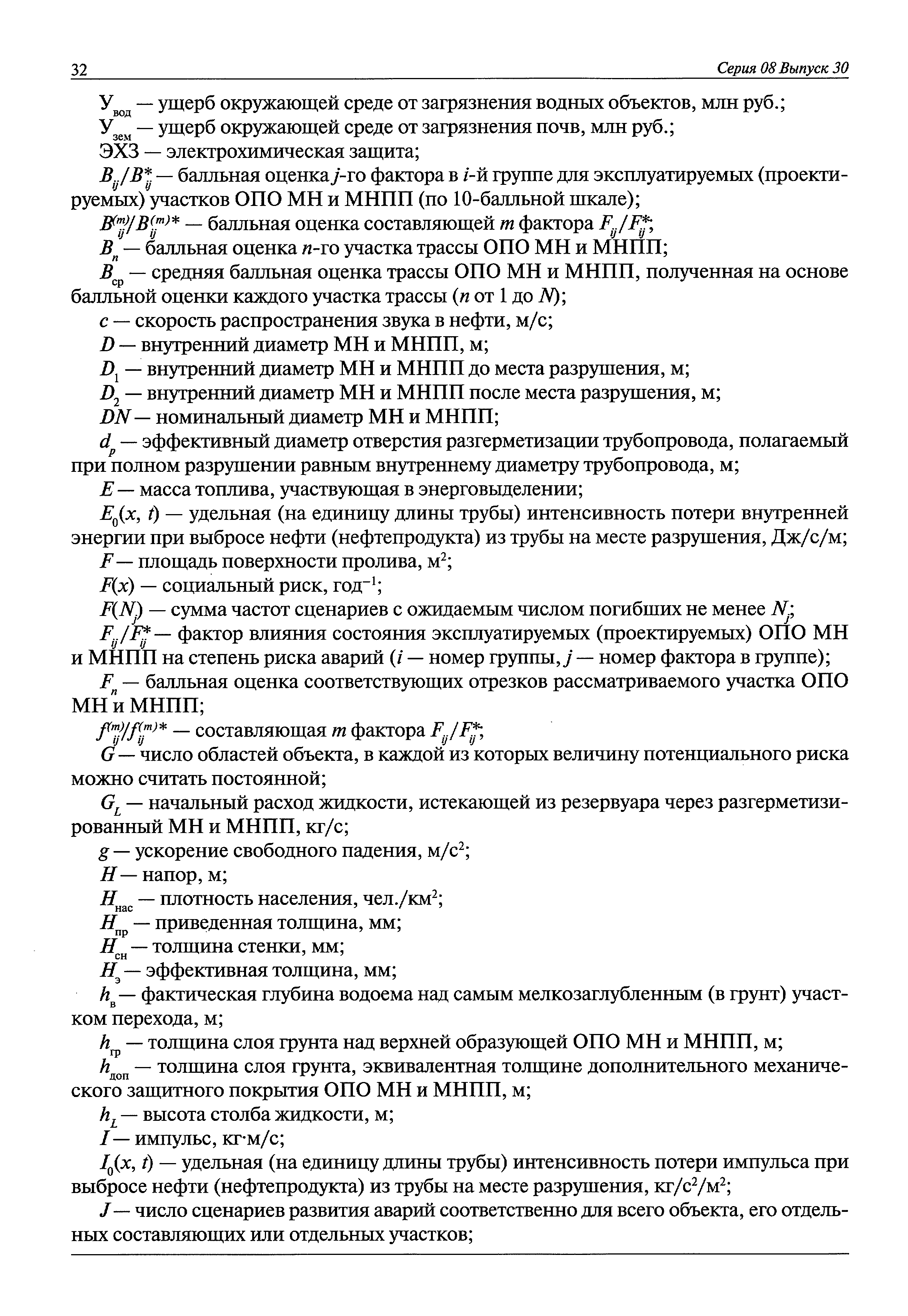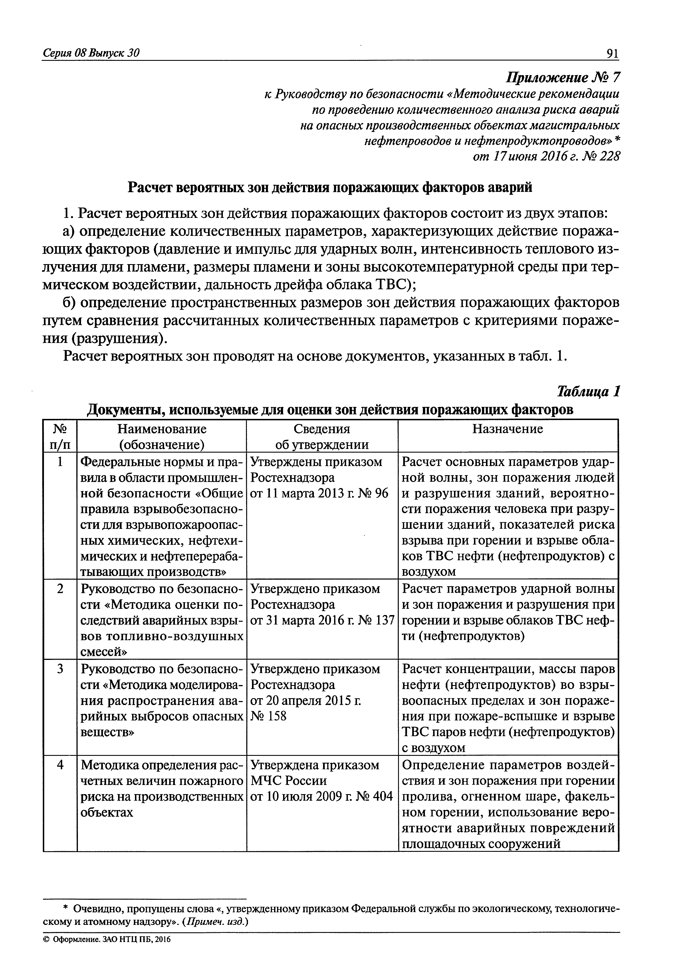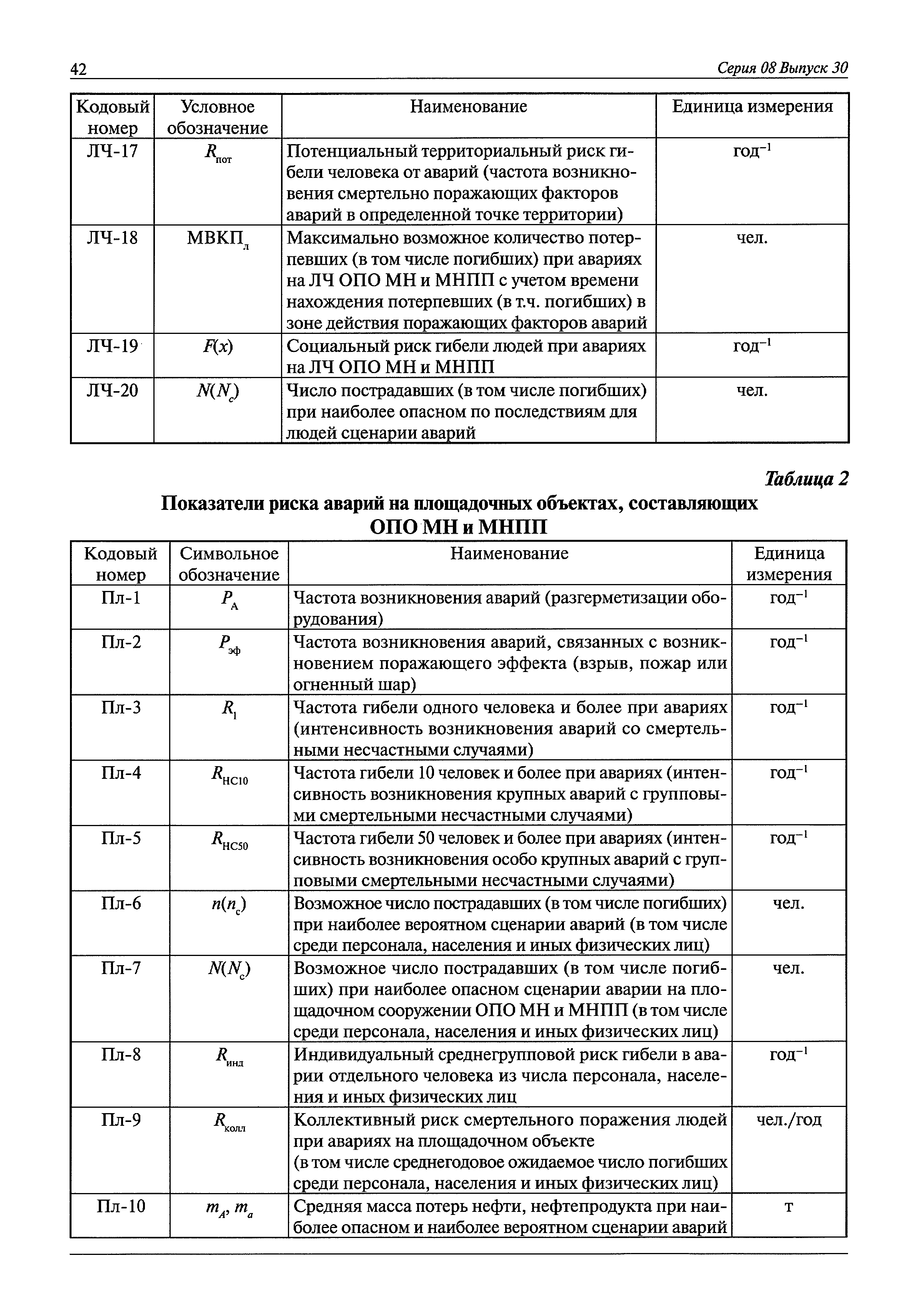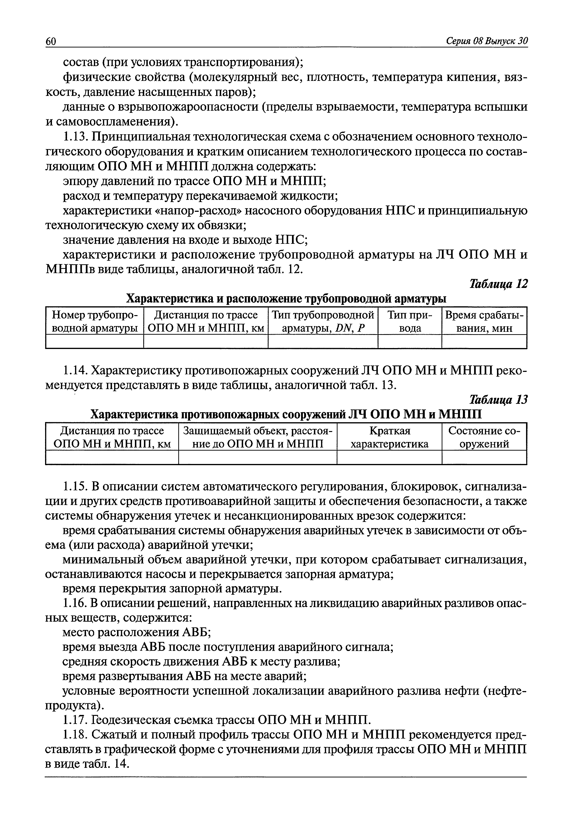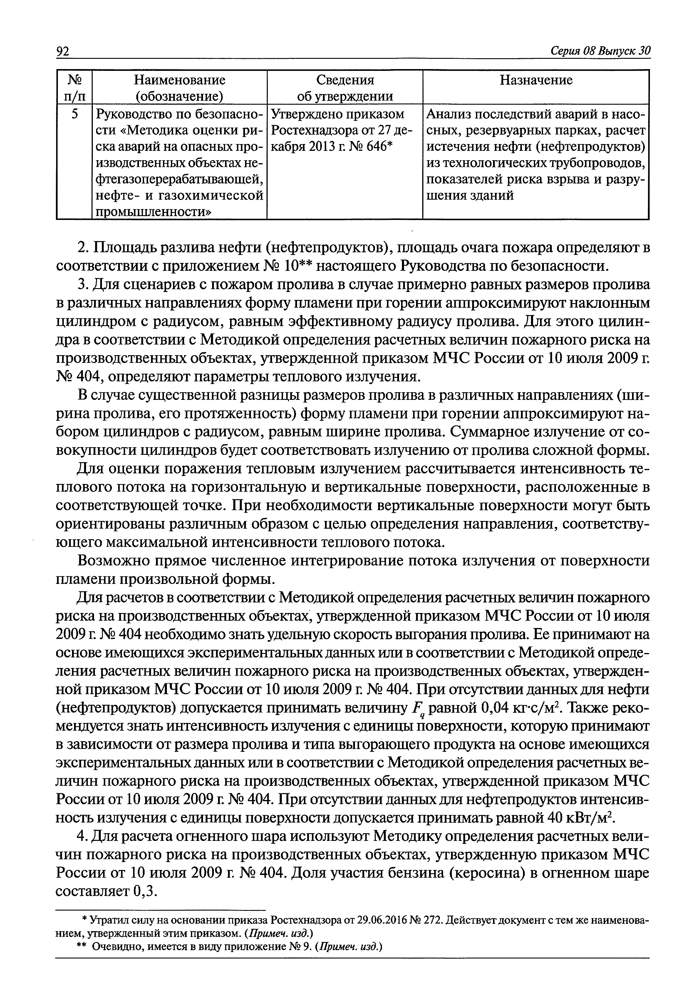 | Оглавление: | I Общие положения II Методические принципы оценки риска авария на опасных производственных объектах магистральных нефтепроводов и магистральных нефтепродуктопроводов III Этапы проведения количественного анализа риска аварий на опасных производственных объектах магистральных нефтепроводов и магистральных нефтепродуктопроводов IV Типовые сценарии аварий на площадочных сооружениях опасных производственных объектов магистральных нефтепроводов и магистральных нефтепродуктопроводов V Количественная оценка риска аварий на опасных производственных объектах магистральных нефтепроводов и магистральных нефтепродуктопроводов. Оценка частоты возможных сценариев аварий VI Оформление результатов количественного анализа риска аварий на опасных производственных объектах магистральных нефтепроводов и магистральных нефтепродуктопроводов Приложение 1. Перечень используемых сокращений и обозначений Приложение 2. Термины и их определения Приложение 3. Рисунки и таблицы Приложение 4. Перечень исходной информации, необходимой для проведения количественного анализа риска аварий на ОНО МН и МНПП Приложение 5. Балльная оценка факторов влияния состояния ОНО МН и МНПП на степень риска аварий Приложение 6. Оценка частоты аварий на линейной части ОНО МН и МНПП Приложение 7. Расчет вероятных зон действия поражающих факторов аварий Приложение 8. Расчет показателей риска аварий Приложение 9. Расчет объемов выброса нефти (нефтепродуктов) и площадей разлива при авариях на линейной части ОНО МН и МНПП и площадочных сооружениях ОНО МН и МНПП |