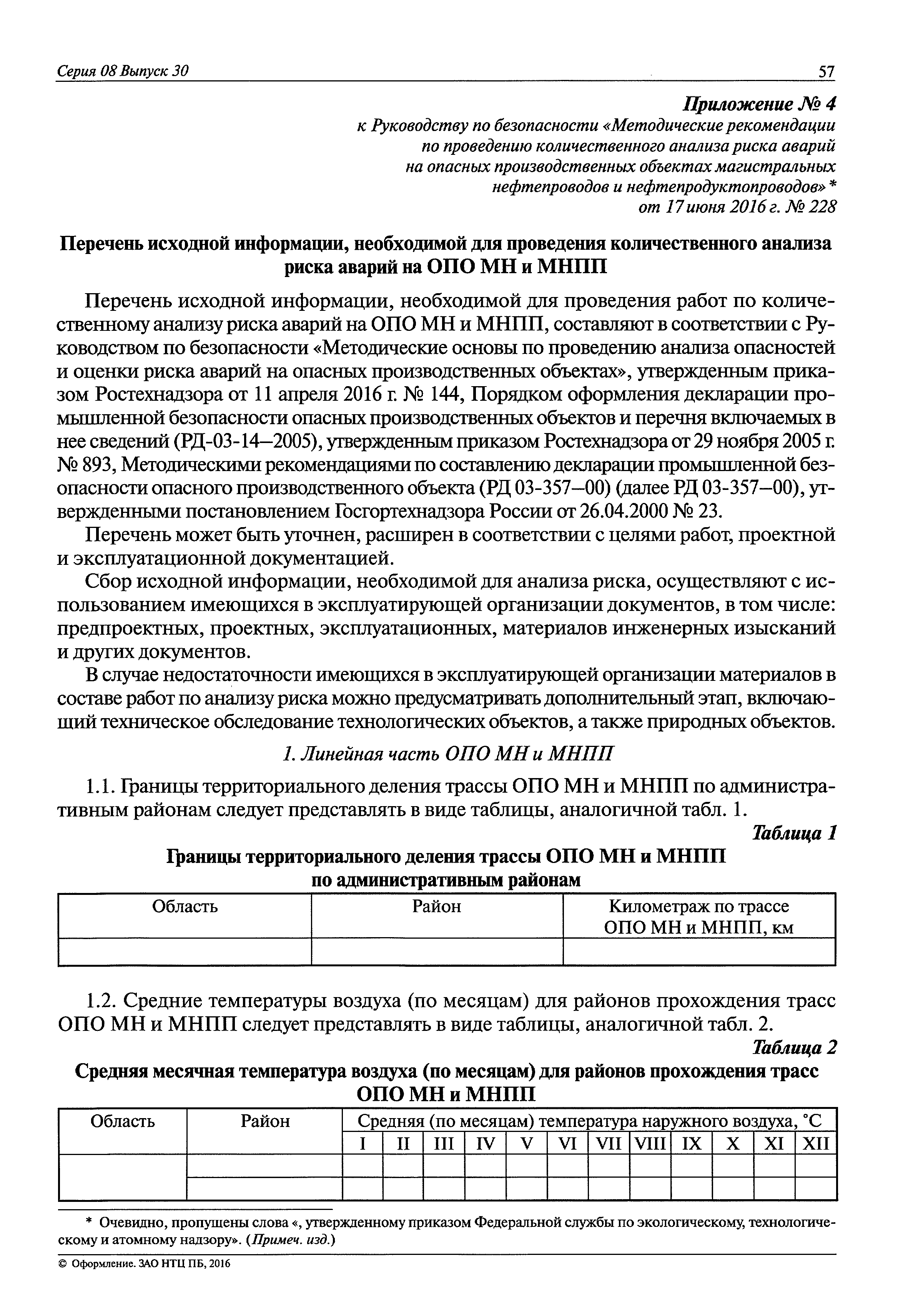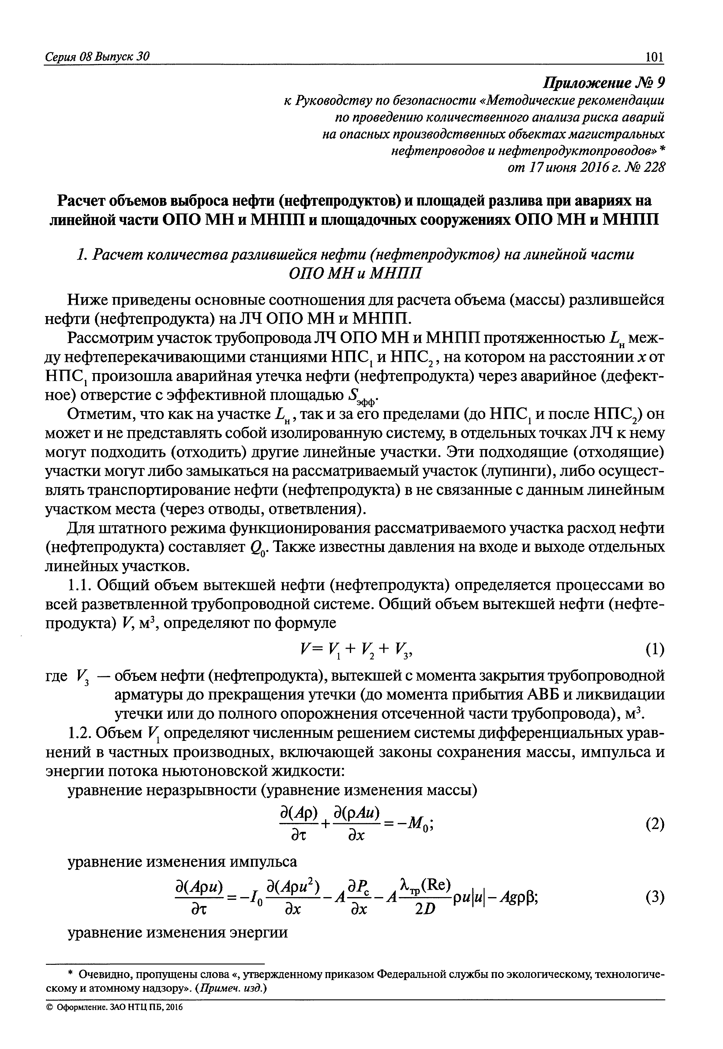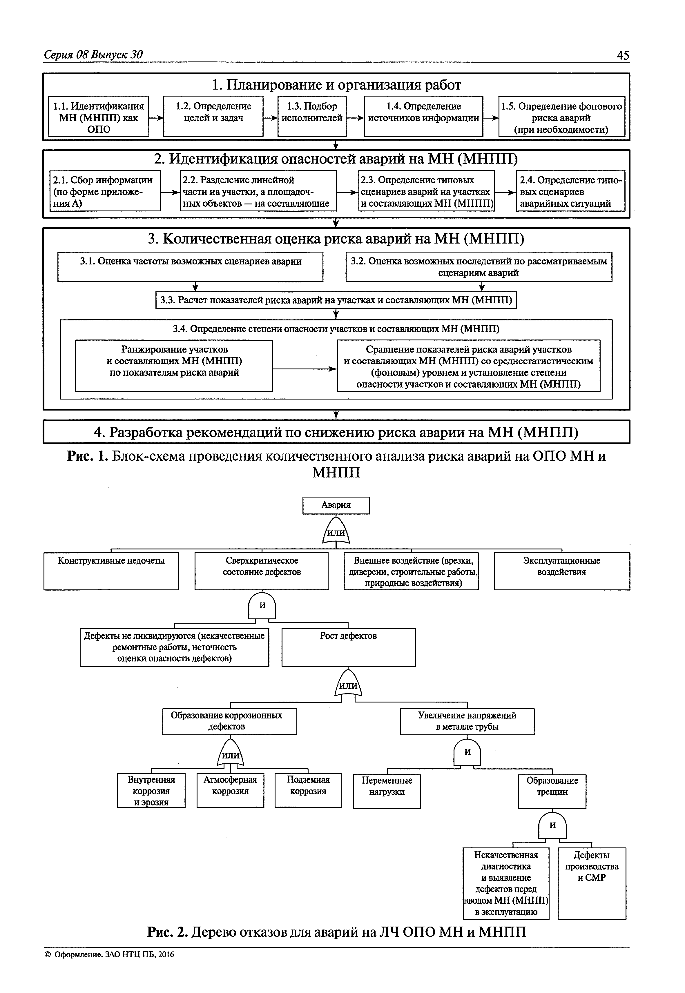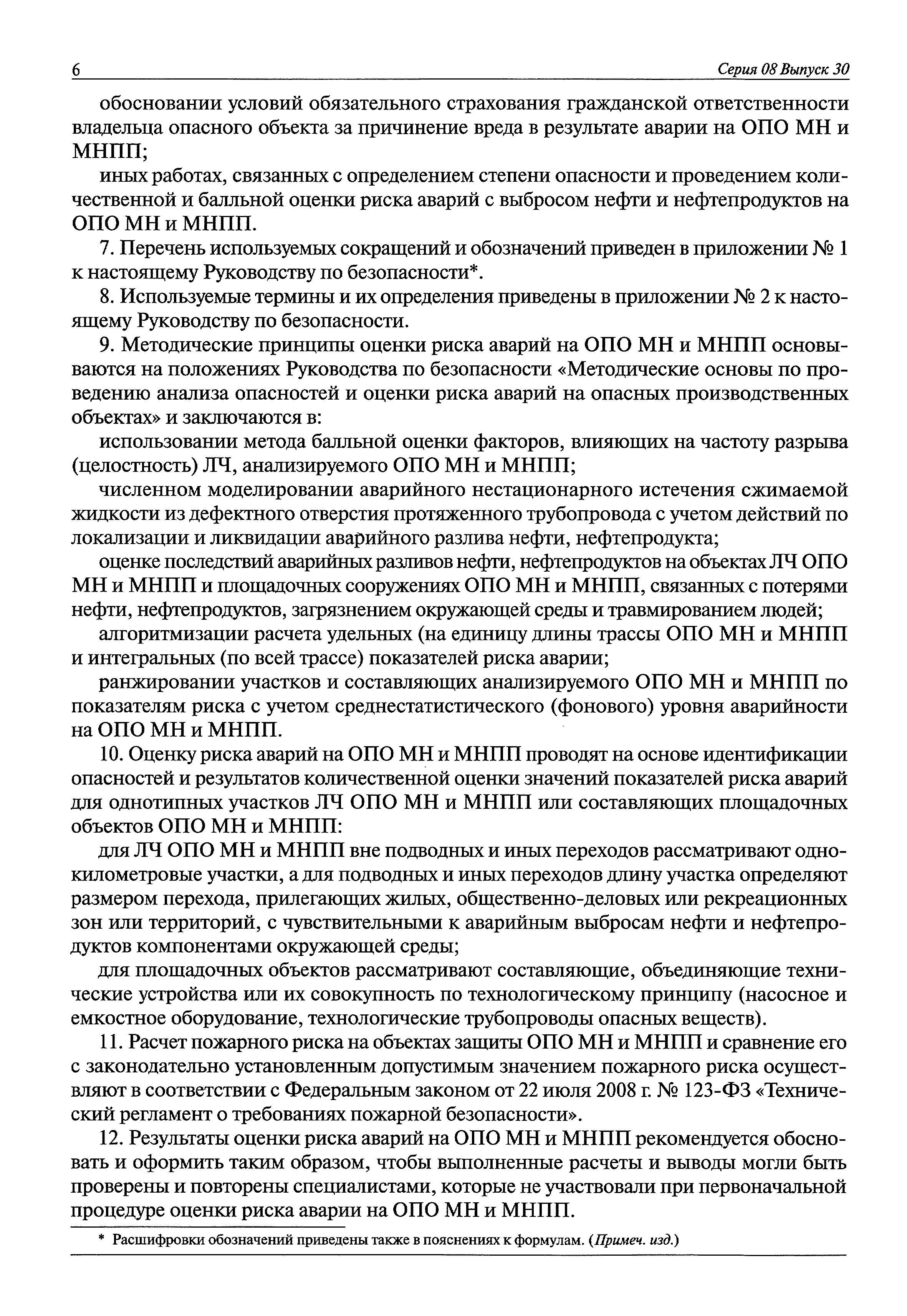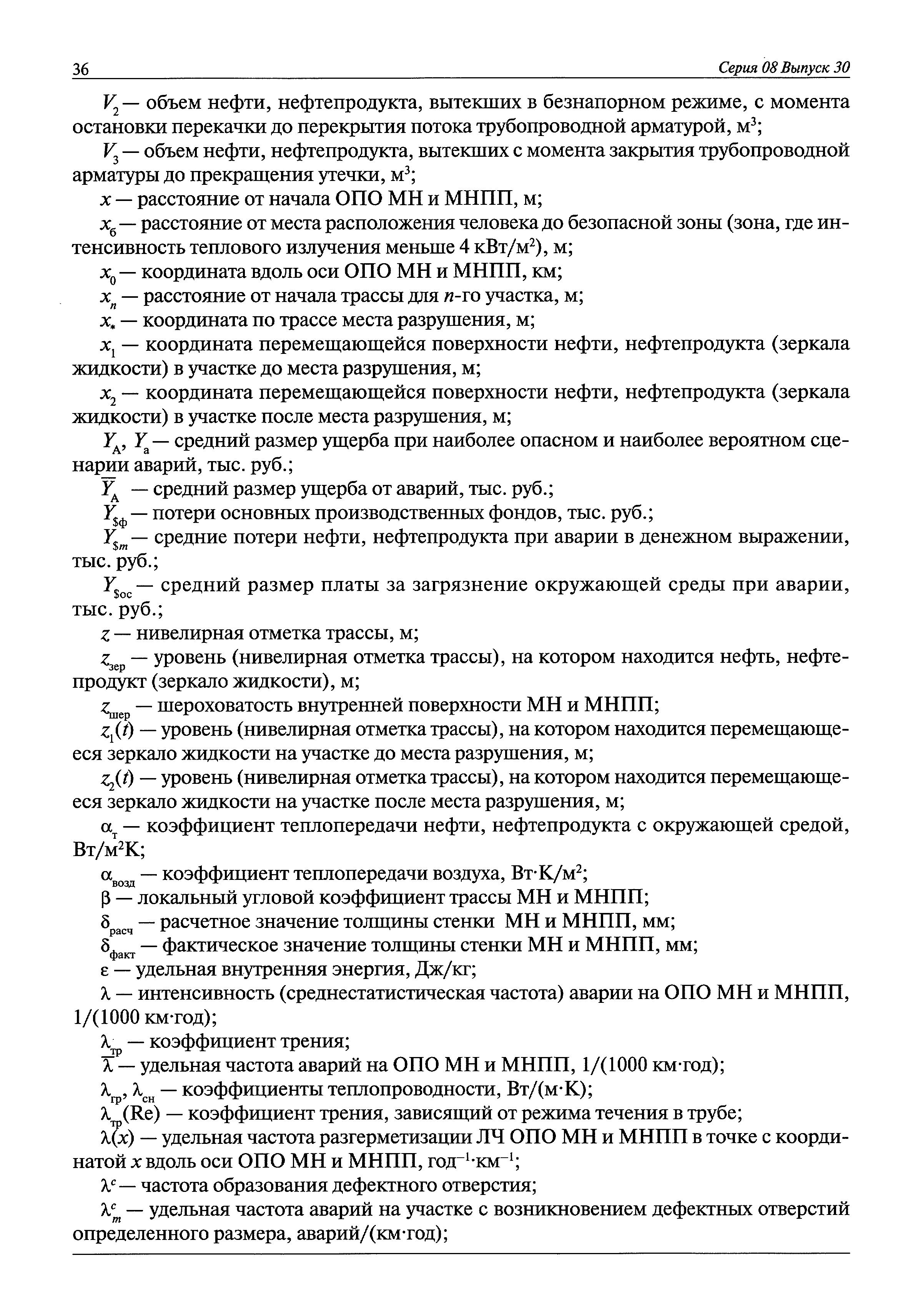 | Оглавление: | I Общие положения II Методические принципы оценки риска авария на опасных производственных объектах магистральных нефтепроводов и магистральных нефтепродуктопроводов III Этапы проведения количественного анализа риска аварий на опасных производственных объектах магистральных нефтепроводов и магистральных нефтепродуктопроводов IV Типовые сценарии аварий на площадочных сооружениях опасных производственных объектов магистральных нефтепроводов и магистральных нефтепродуктопроводов V Количественная оценка риска аварий на опасных производственных объектах магистральных нефтепроводов и магистральных нефтепродуктопроводов. Оценка частоты возможных сценариев аварий VI Оформление результатов количественного анализа риска аварий на опасных производственных объектах магистральных нефтепроводов и магистральных нефтепродуктопроводов Приложение 1. Перечень используемых сокращений и обозначений Приложение 2. Термины и их определения Приложение 3. Рисунки и таблицы Приложение 4. Перечень исходной информации, необходимой для проведения количественного анализа риска аварий на ОНО МН и МНПП Приложение 5. Балльная оценка факторов влияния состояния ОНО МН и МНПП на степень риска аварий Приложение 6. Оценка частоты аварий на линейной части ОНО МН и МНПП Приложение 7. Расчет вероятных зон действия поражающих факторов аварий Приложение 8. Расчет показателей риска аварий Приложение 9. Расчет объемов выброса нефти (нефтепродуктов) и площадей разлива при авариях на линейной части ОНО МН и МНПП и площадочных сооружениях ОНО МН и МНПП |