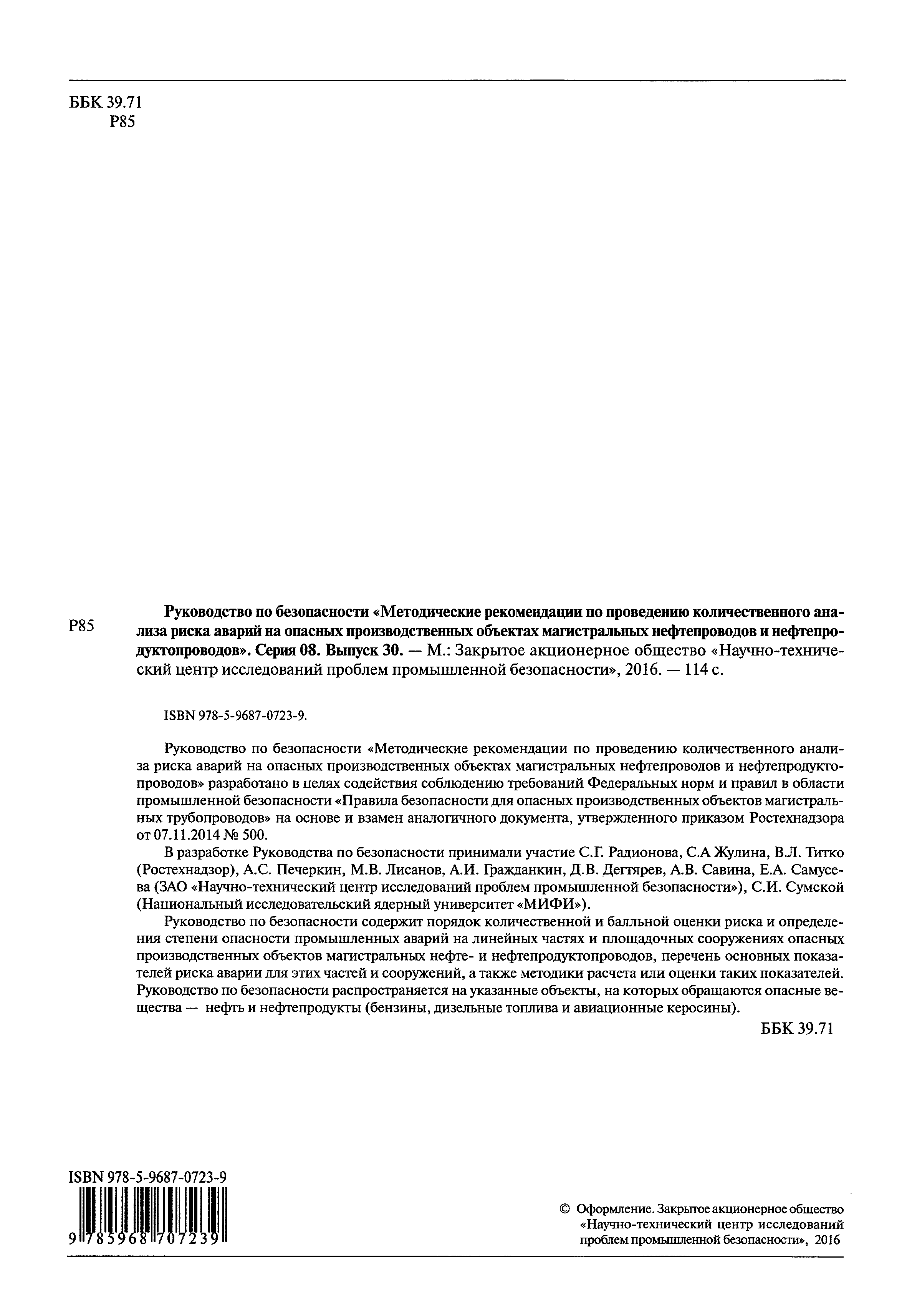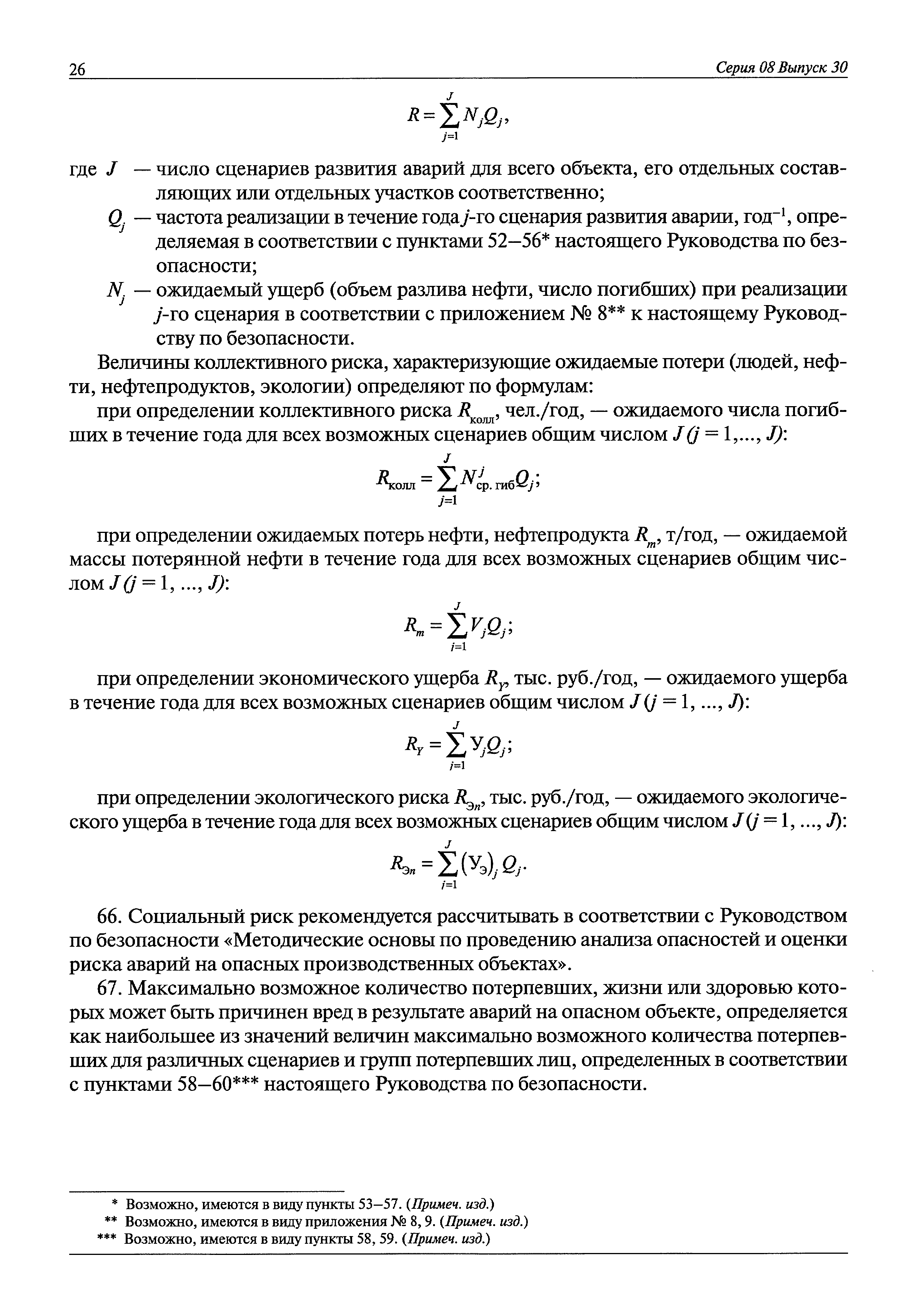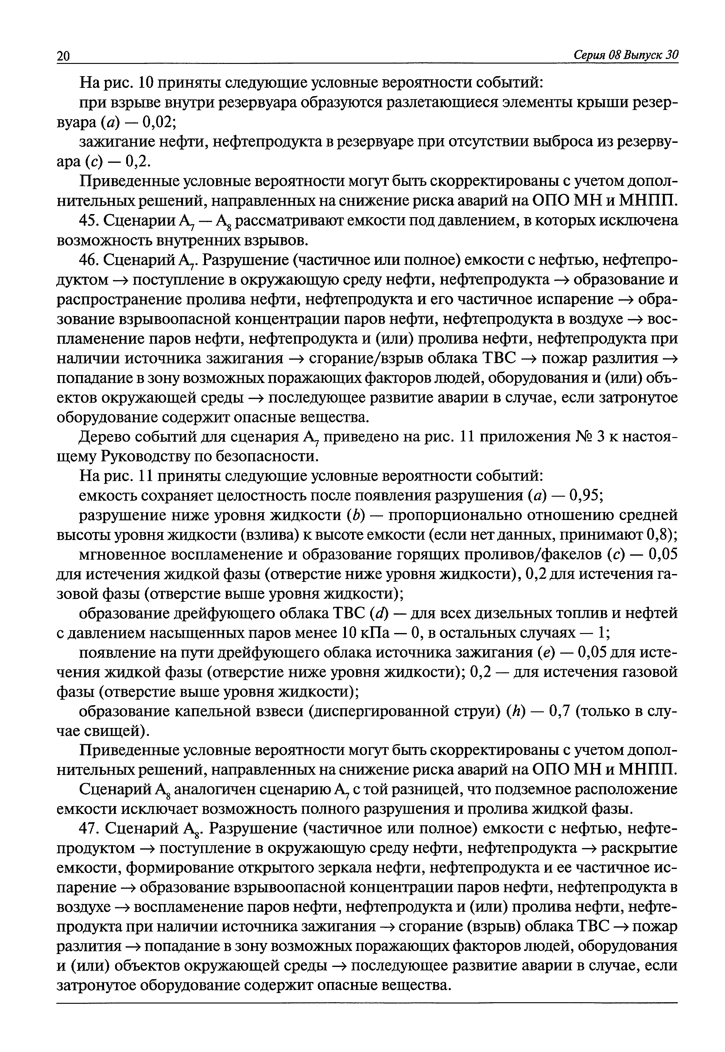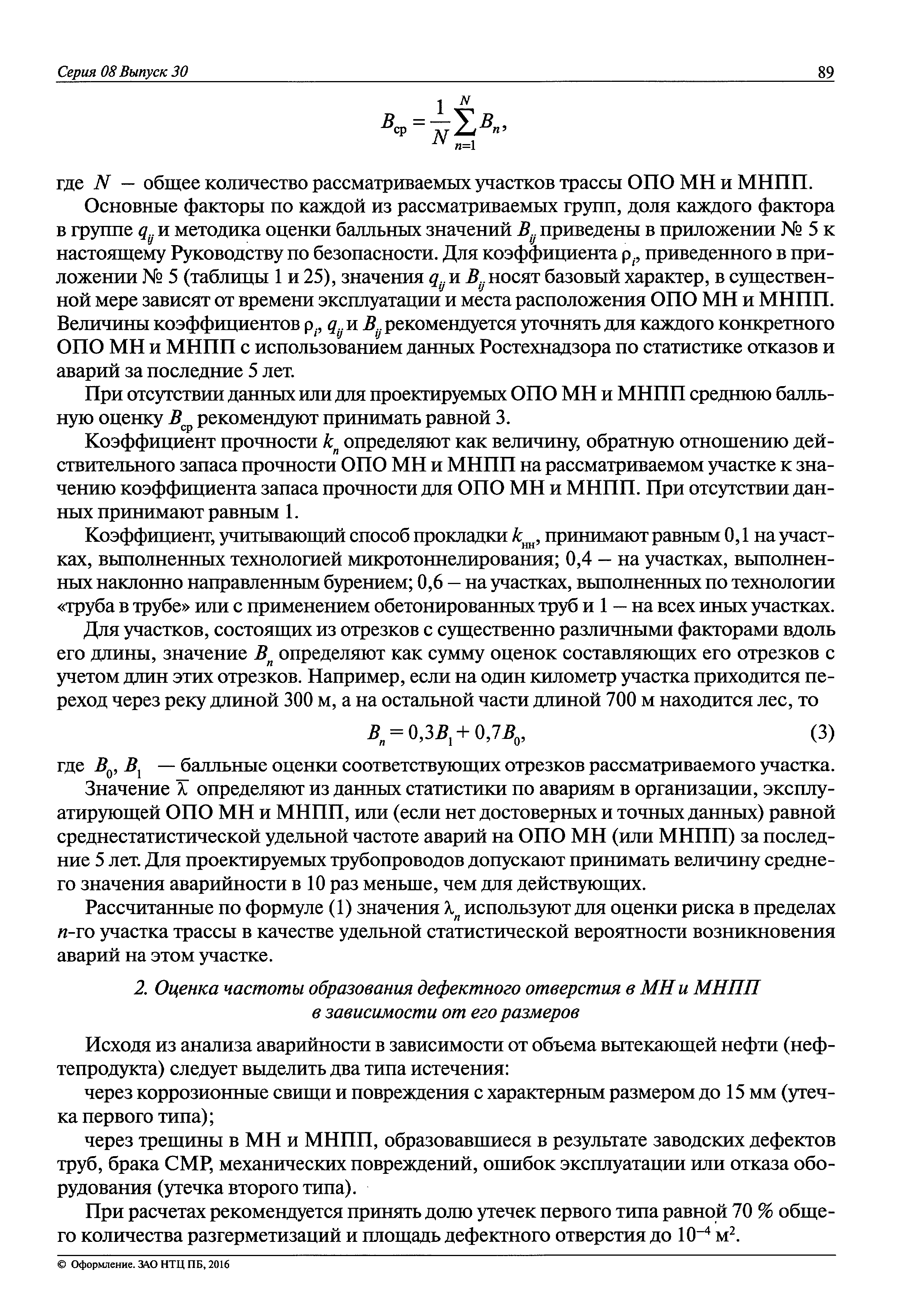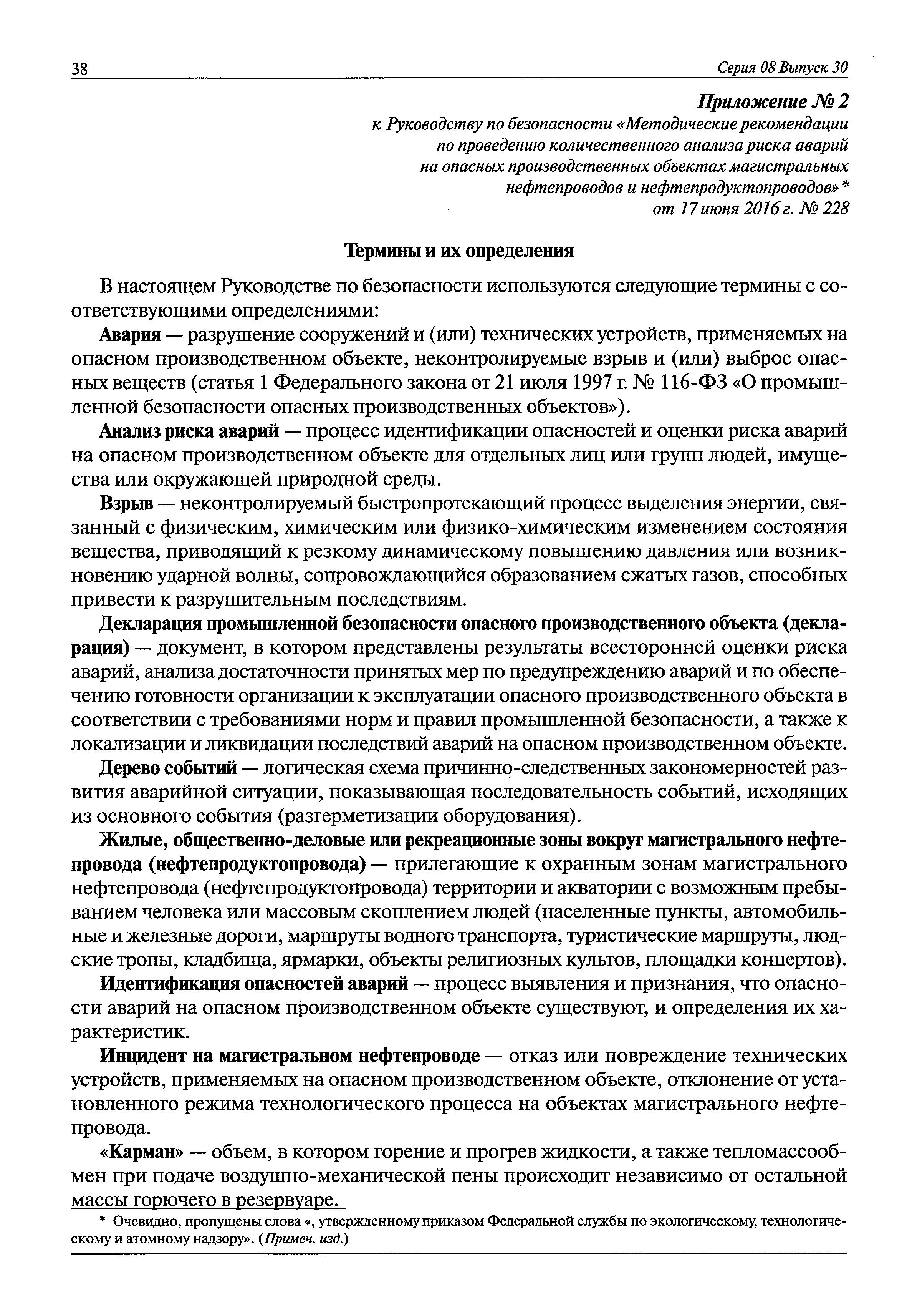 | Оглавление: | I Общие положения II Методические принципы оценки риска авария на опасных производственных объектах магистральных нефтепроводов и магистральных нефтепродуктопроводов III Этапы проведения количественного анализа риска аварий на опасных производственных объектах магистральных нефтепроводов и магистральных нефтепродуктопроводов IV Типовые сценарии аварий на площадочных сооружениях опасных производственных объектов магистральных нефтепроводов и магистральных нефтепродуктопроводов V Количественная оценка риска аварий на опасных производственных объектах магистральных нефтепроводов и магистральных нефтепродуктопроводов. Оценка частоты возможных сценариев аварий VI Оформление результатов количественного анализа риска аварий на опасных производственных объектах магистральных нефтепроводов и магистральных нефтепродуктопроводов Приложение 1. Перечень используемых сокращений и обозначений Приложение 2. Термины и их определения Приложение 3. Рисунки и таблицы Приложение 4. Перечень исходной информации, необходимой для проведения количественного анализа риска аварий на ОНО МН и МНПП Приложение 5. Балльная оценка факторов влияния состояния ОНО МН и МНПП на степень риска аварий Приложение 6. Оценка частоты аварий на линейной части ОНО МН и МНПП Приложение 7. Расчет вероятных зон действия поражающих факторов аварий Приложение 8. Расчет показателей риска аварий Приложение 9. Расчет объемов выброса нефти (нефтепродуктов) и площадей разлива при авариях на линейной части ОНО МН и МНПП и площадочных сооружениях ОНО МН и МНПП |